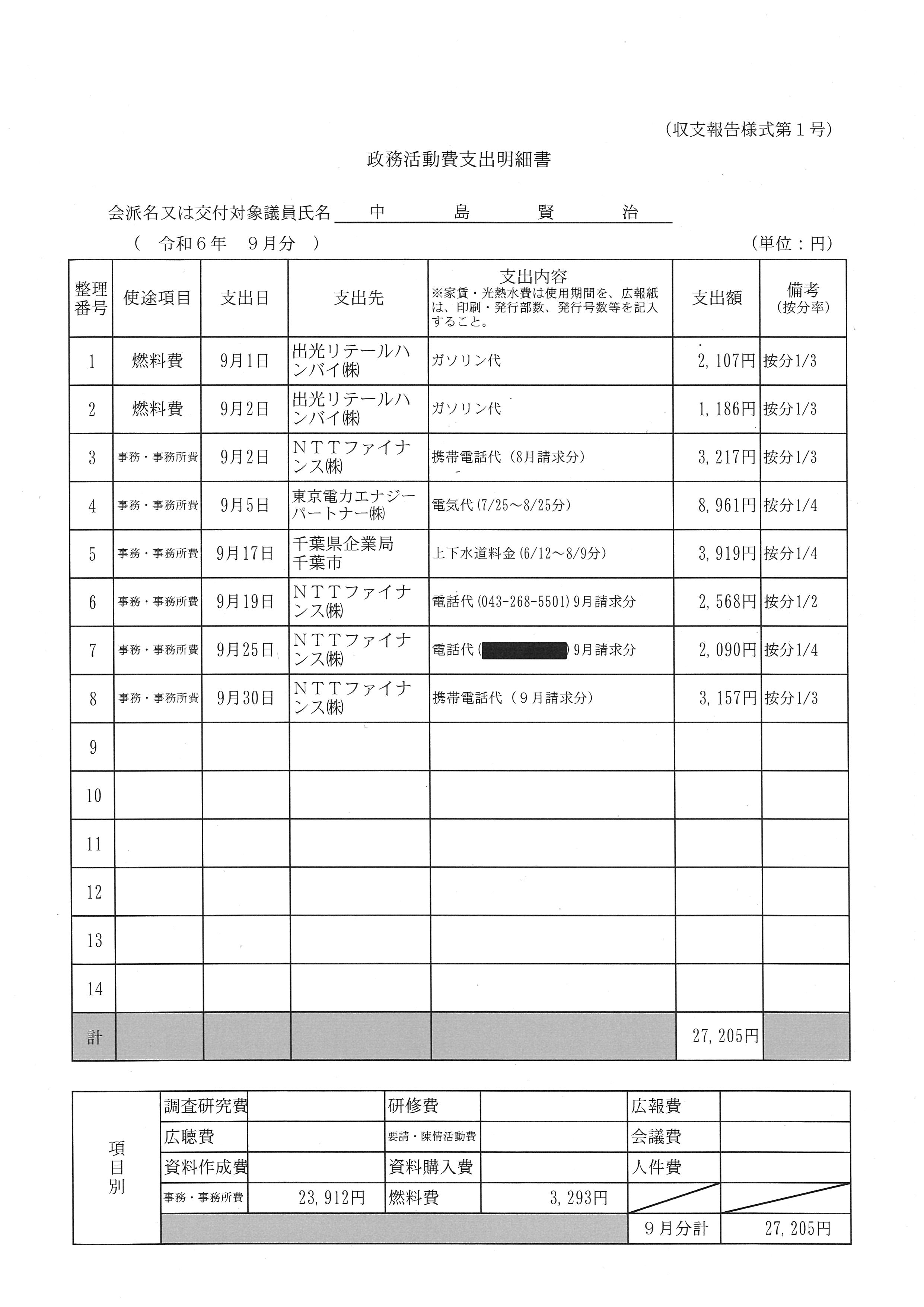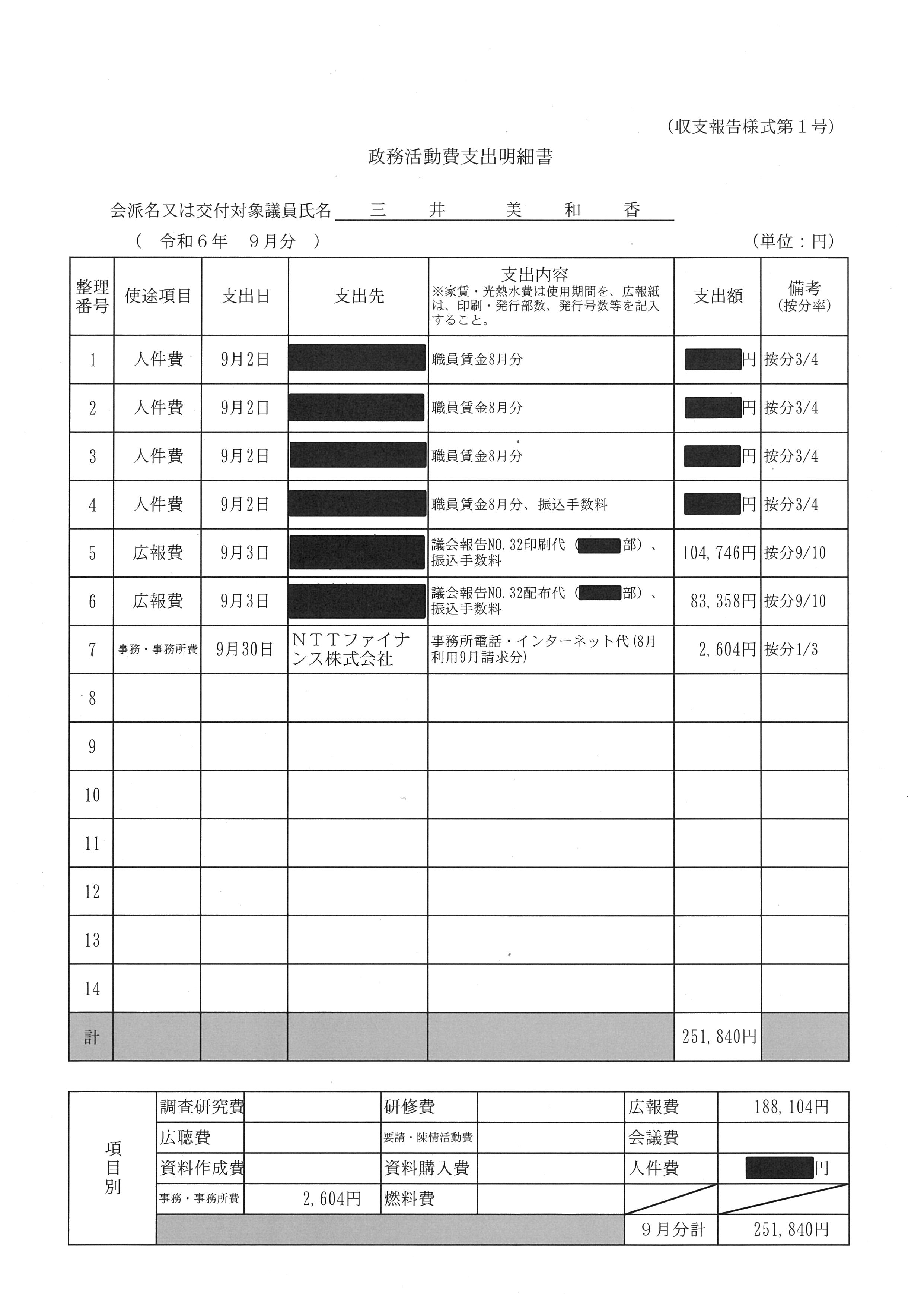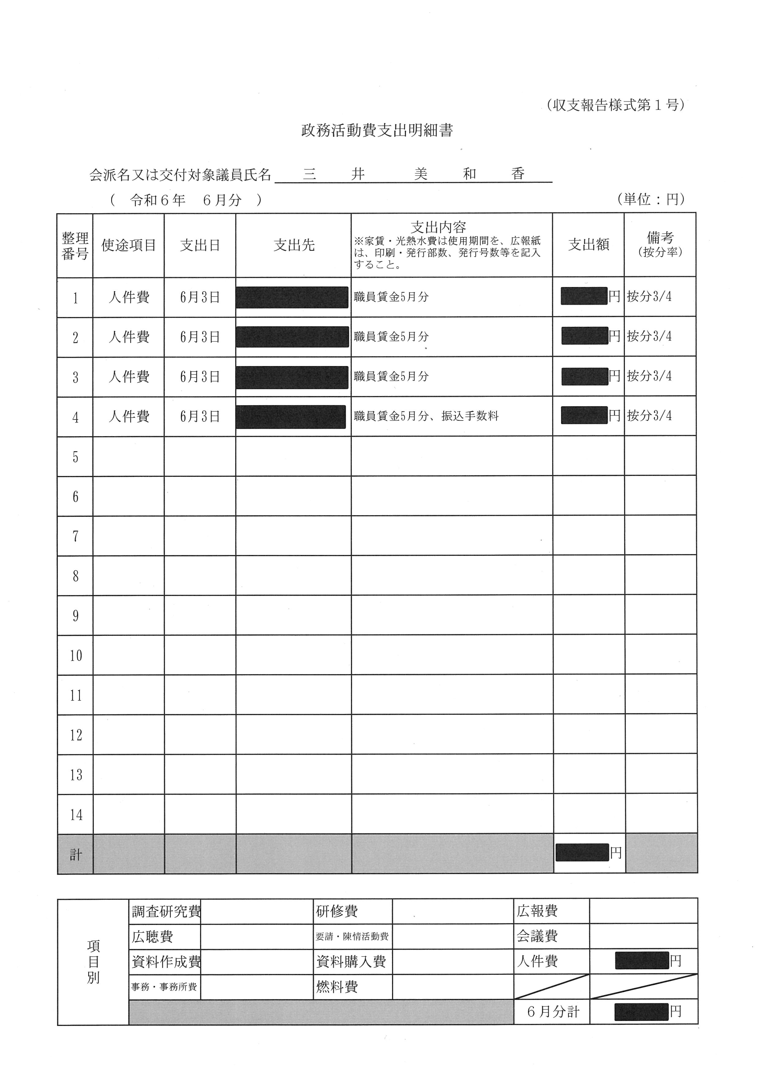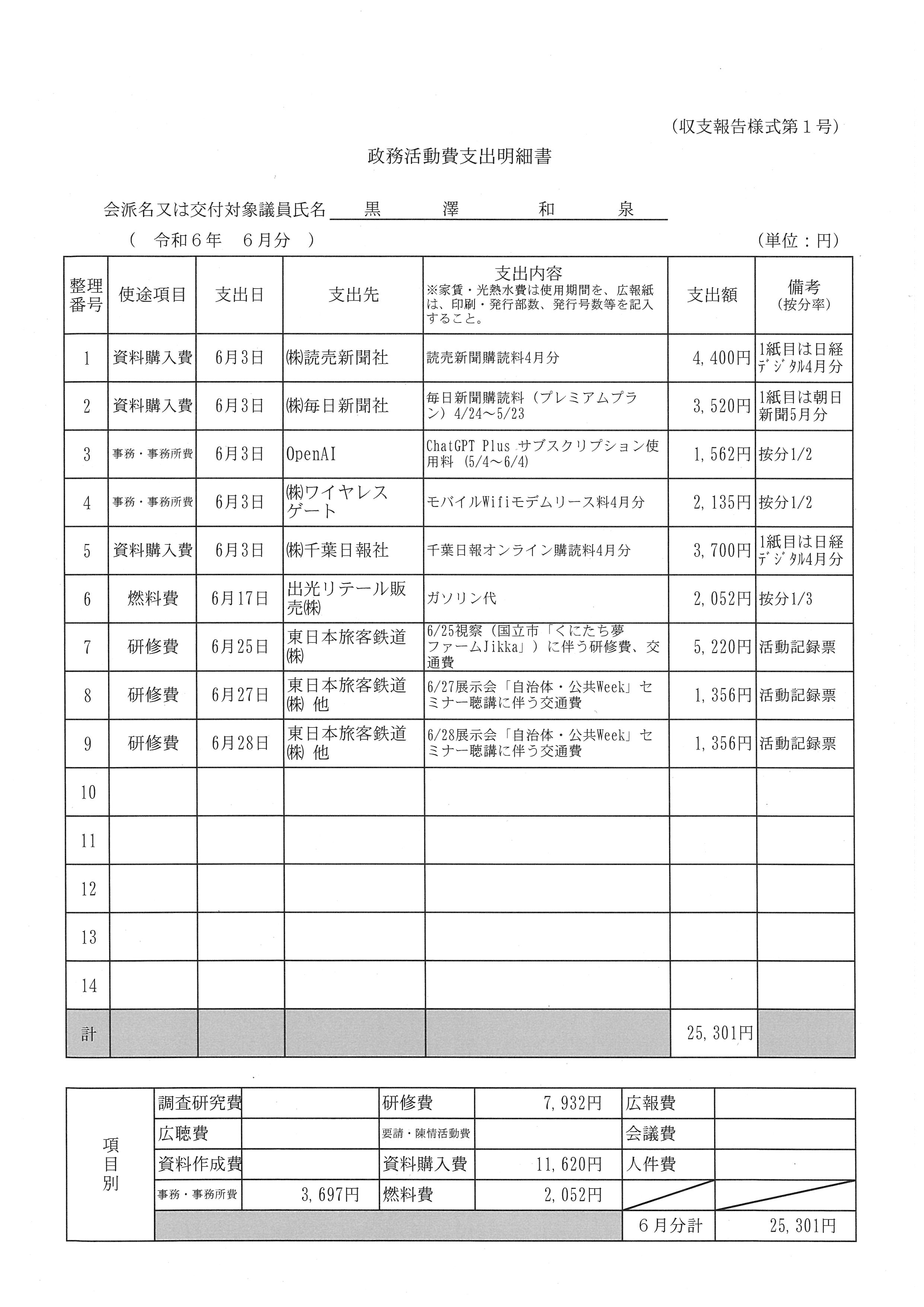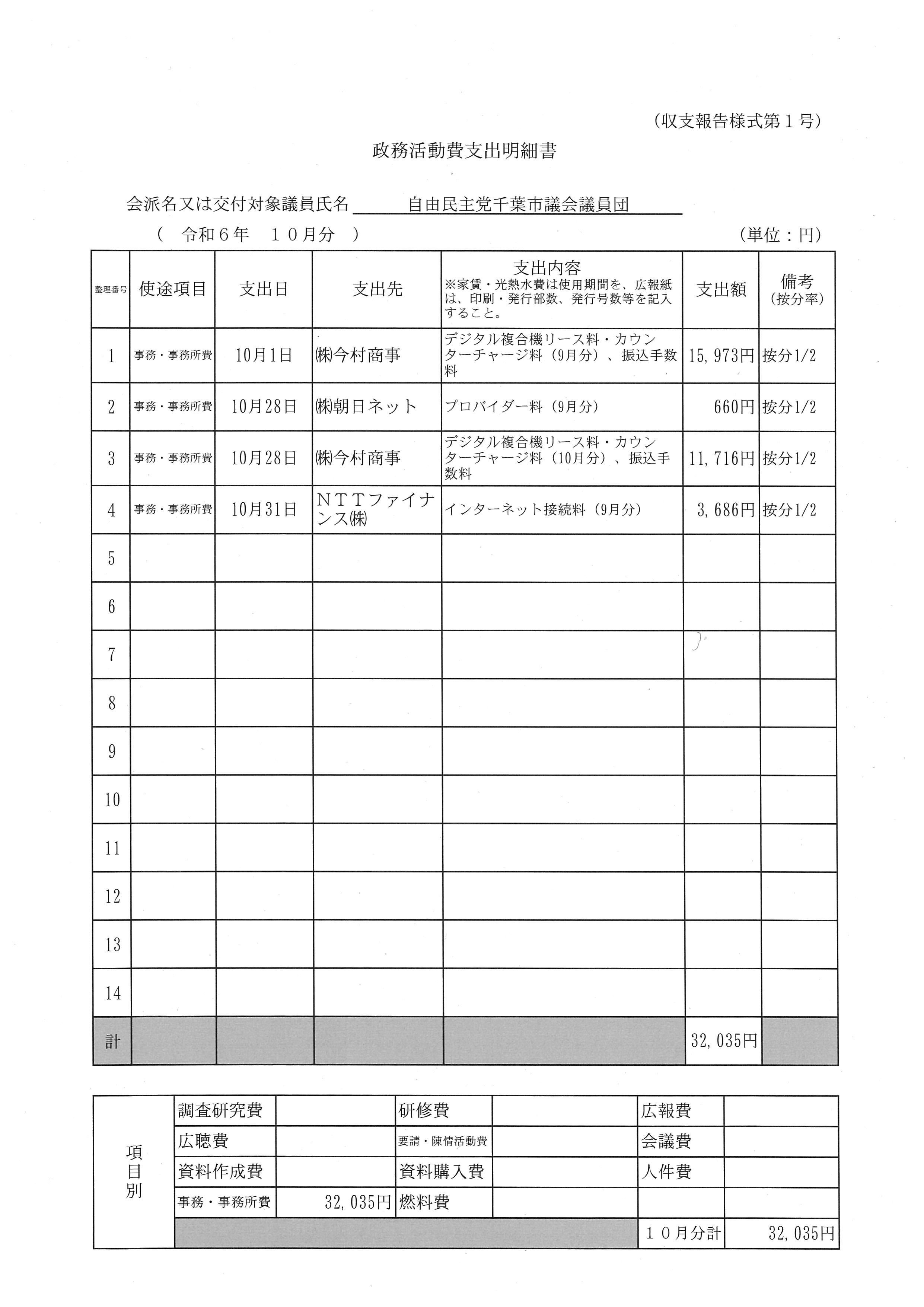 千葉市議会トップページ > 広報・情報公開 > 政務活動費 > 令和6年度交付分(政務活動費収支報告書)