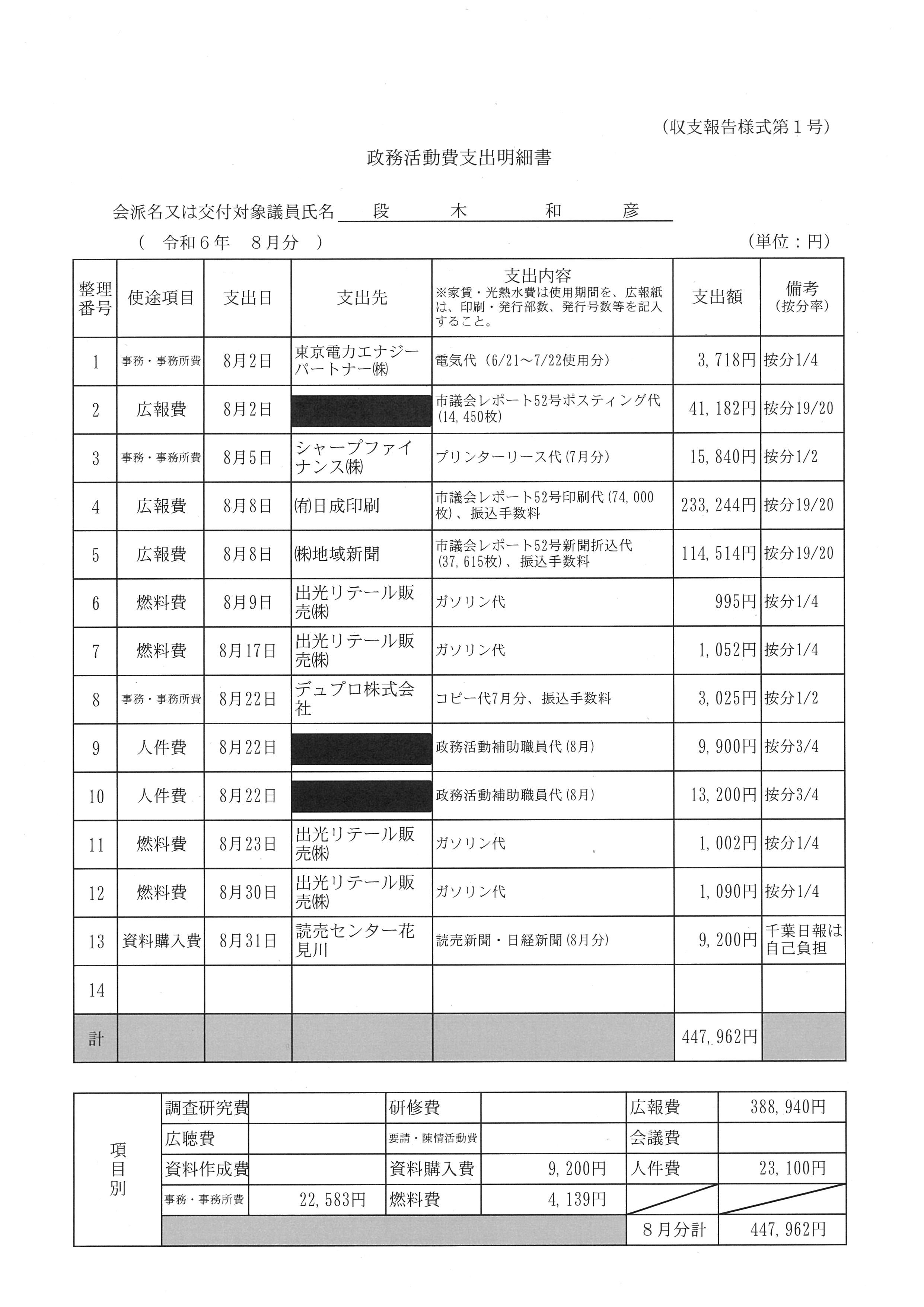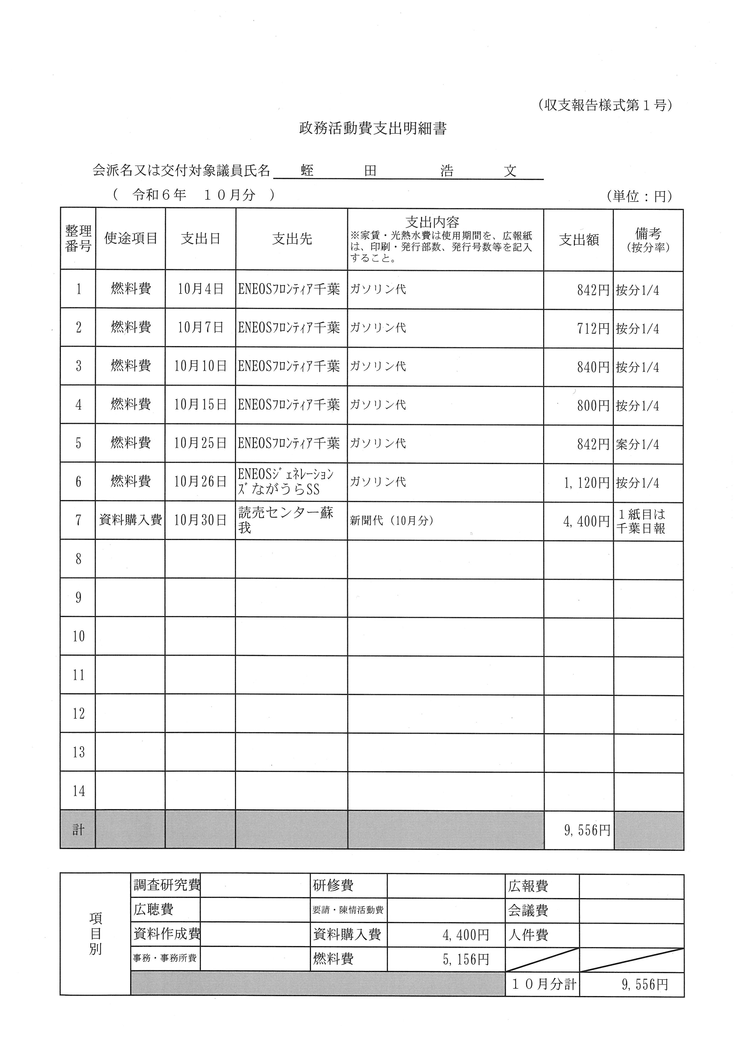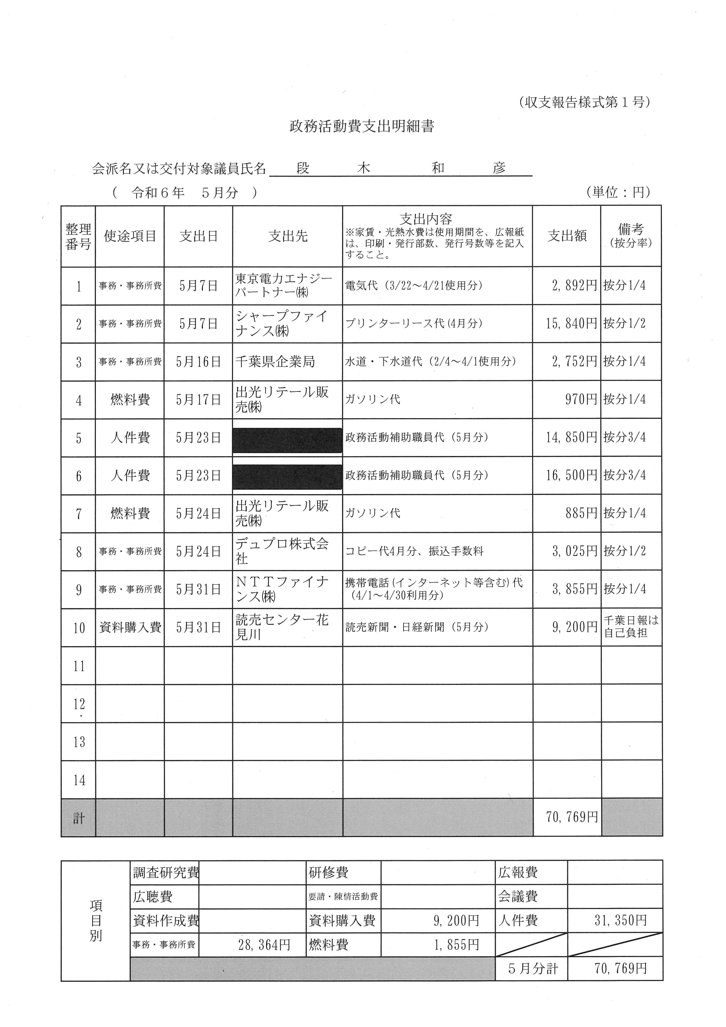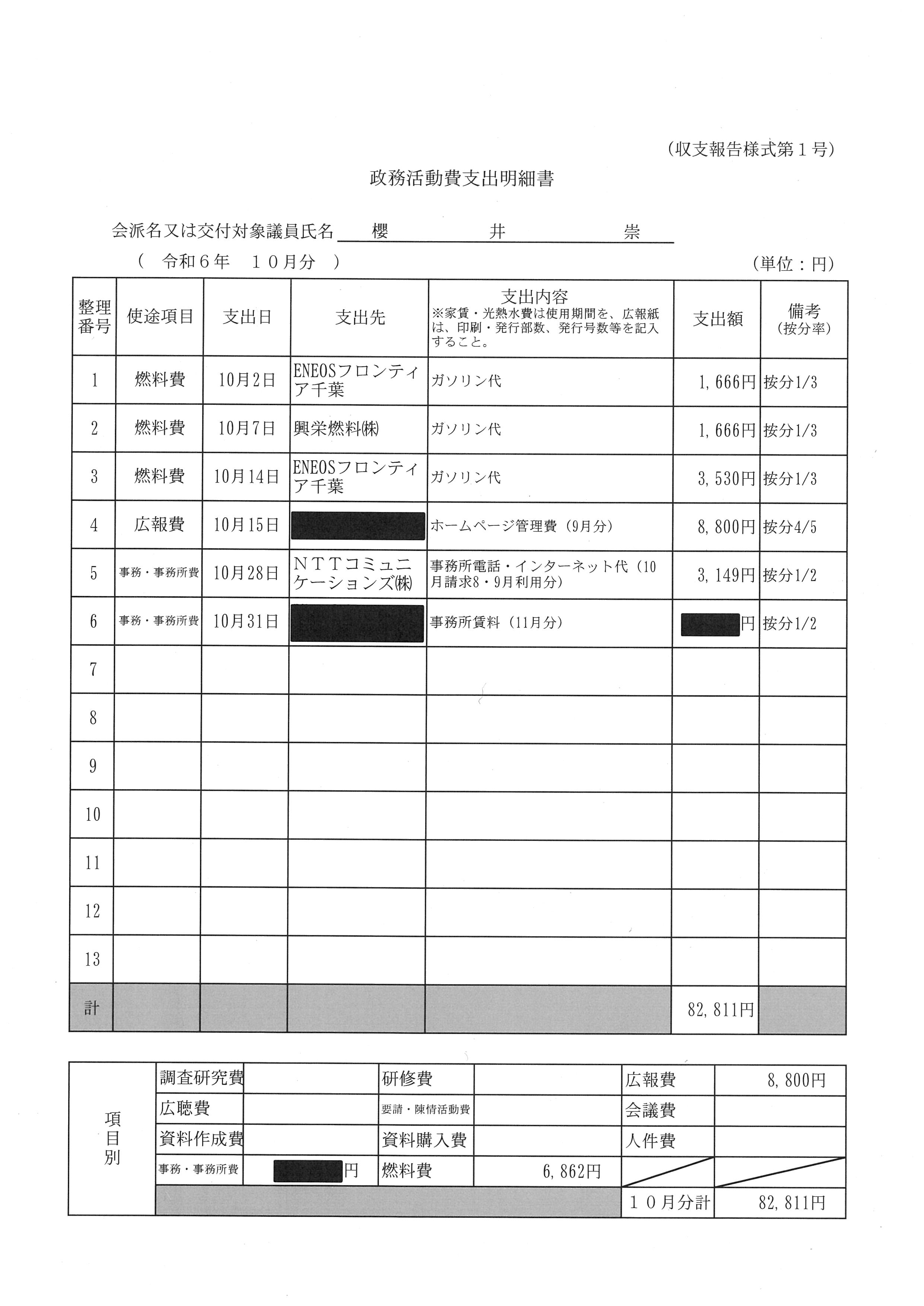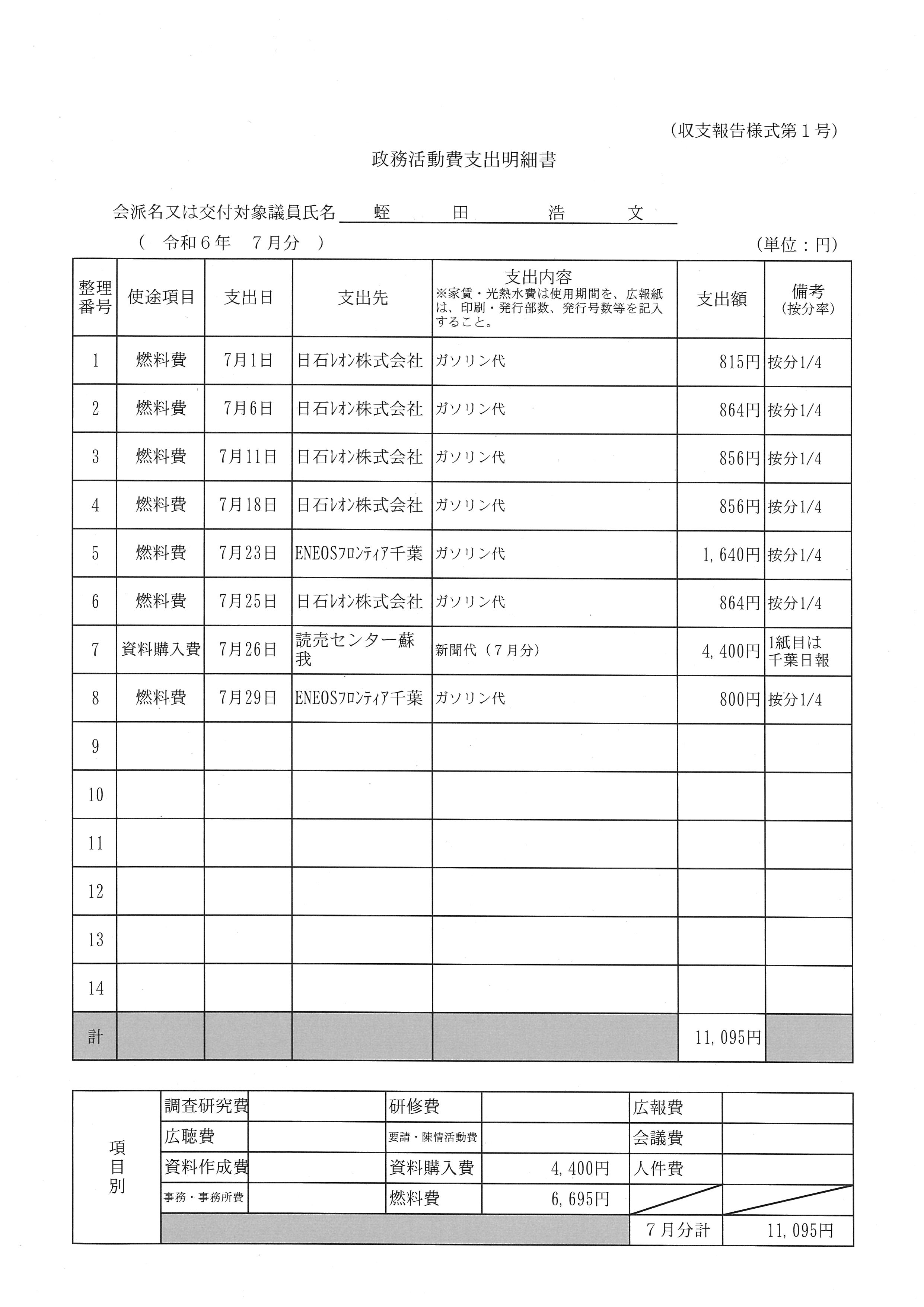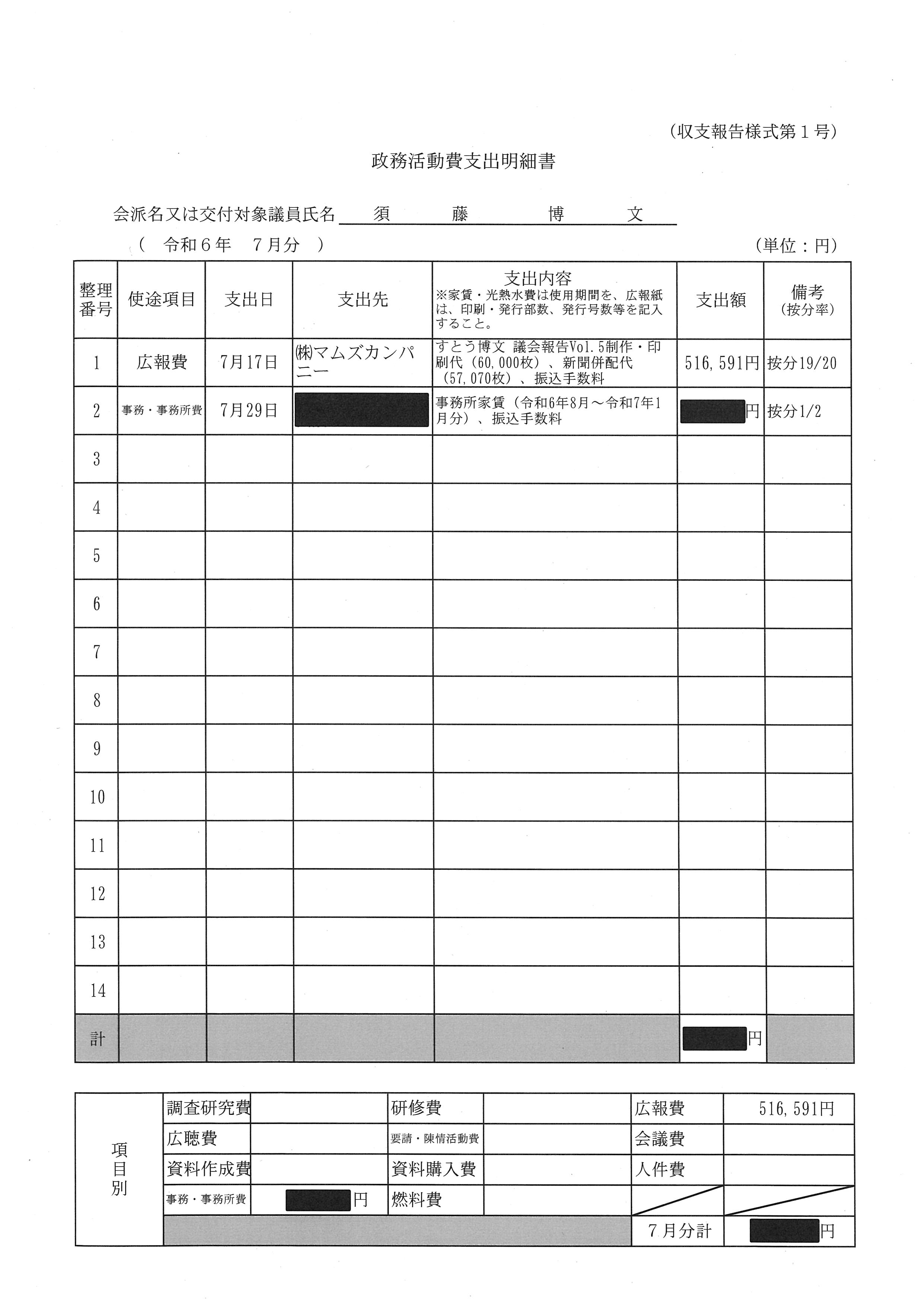 千葉市議会トップページ > 広報・情報公開 > 政務活動費 > 令和6年度交付分(政務活動費収支報告書)