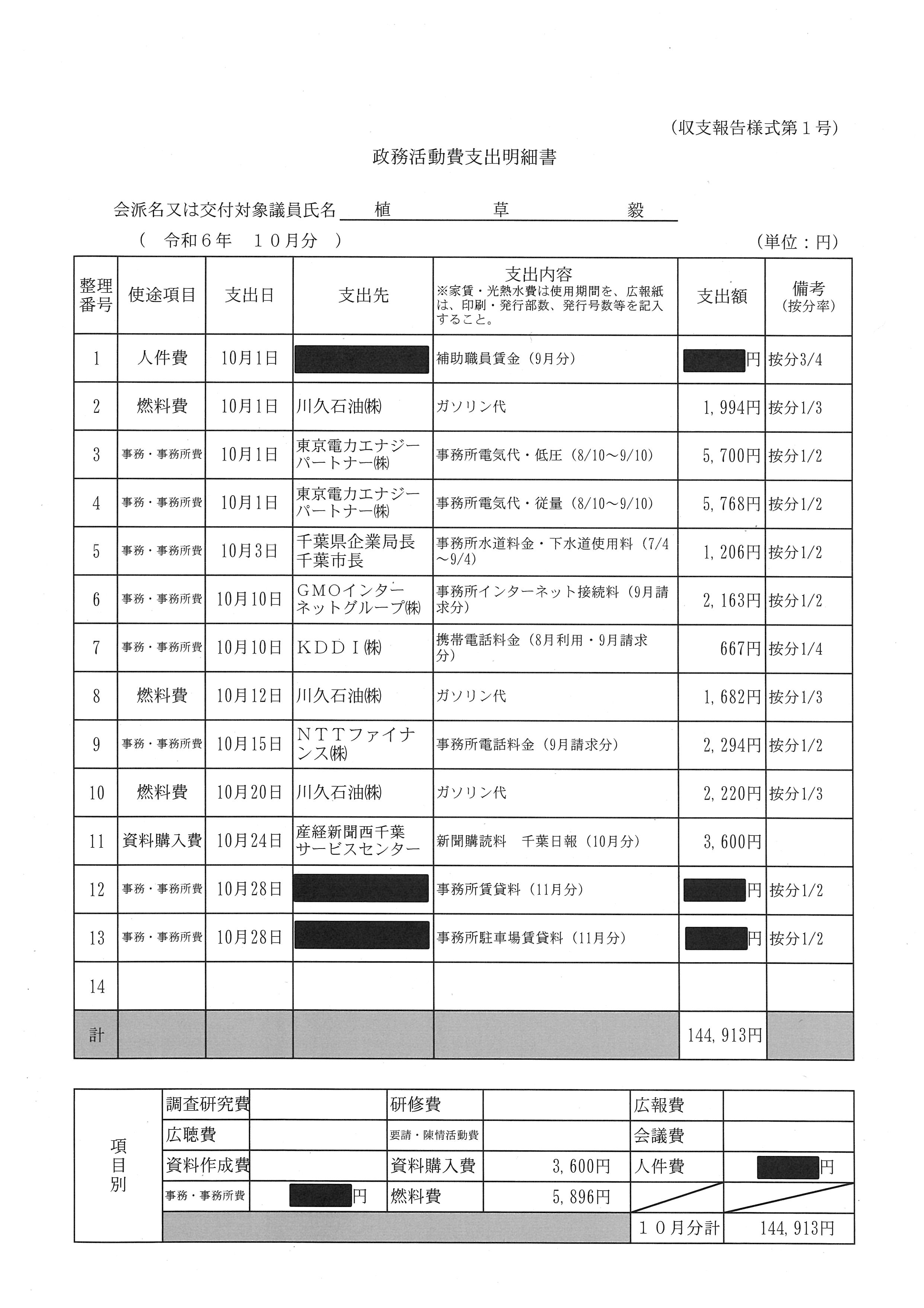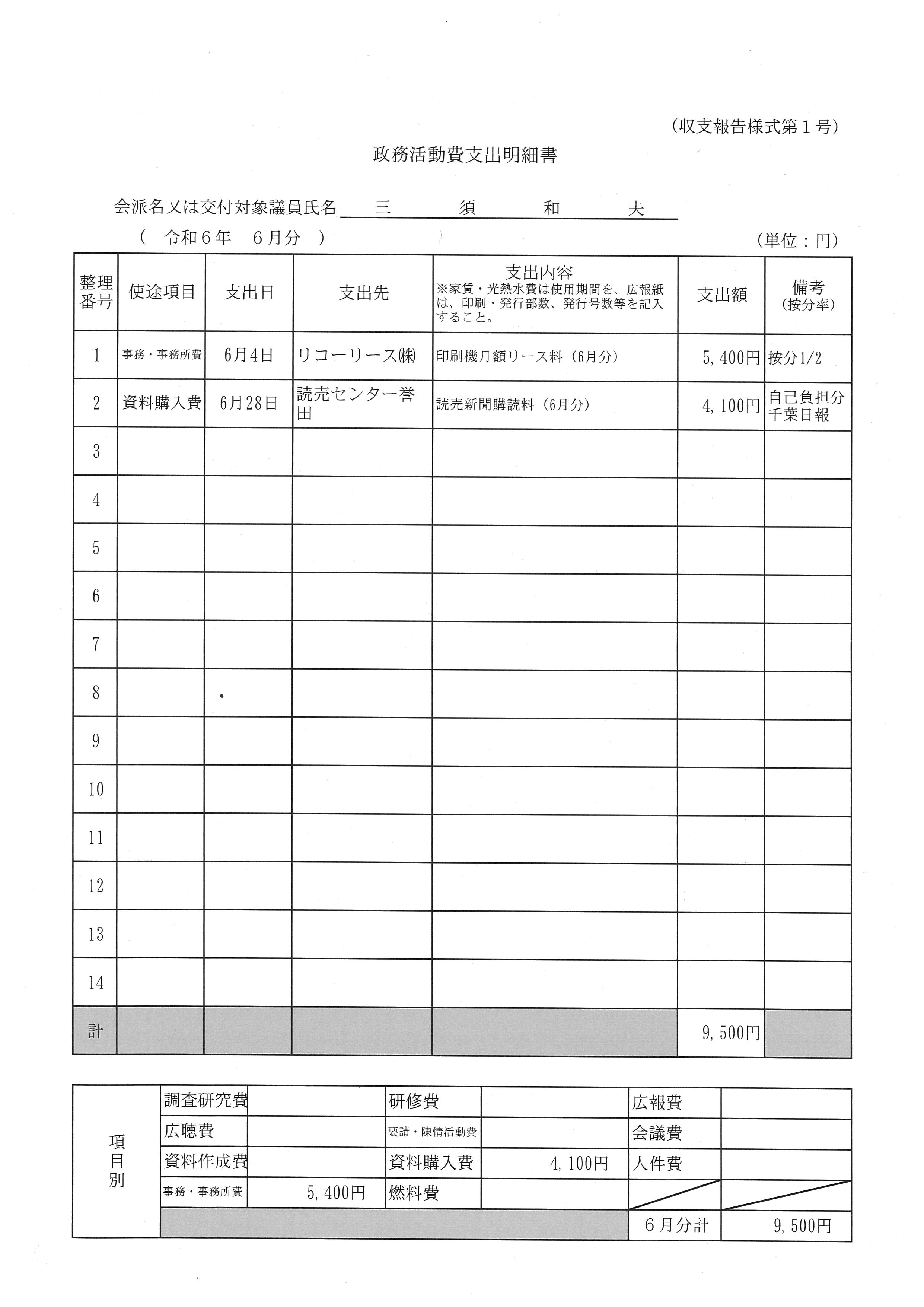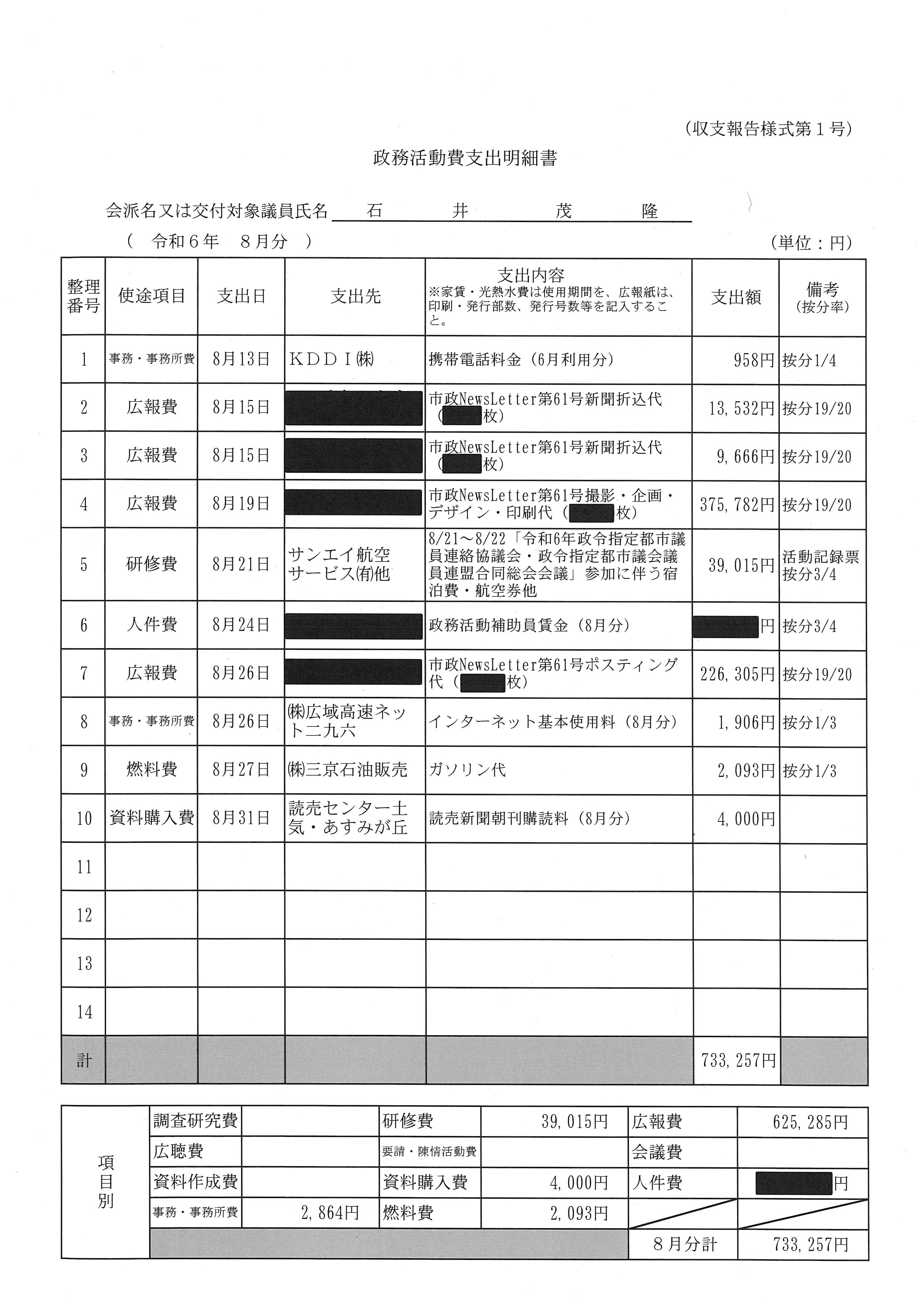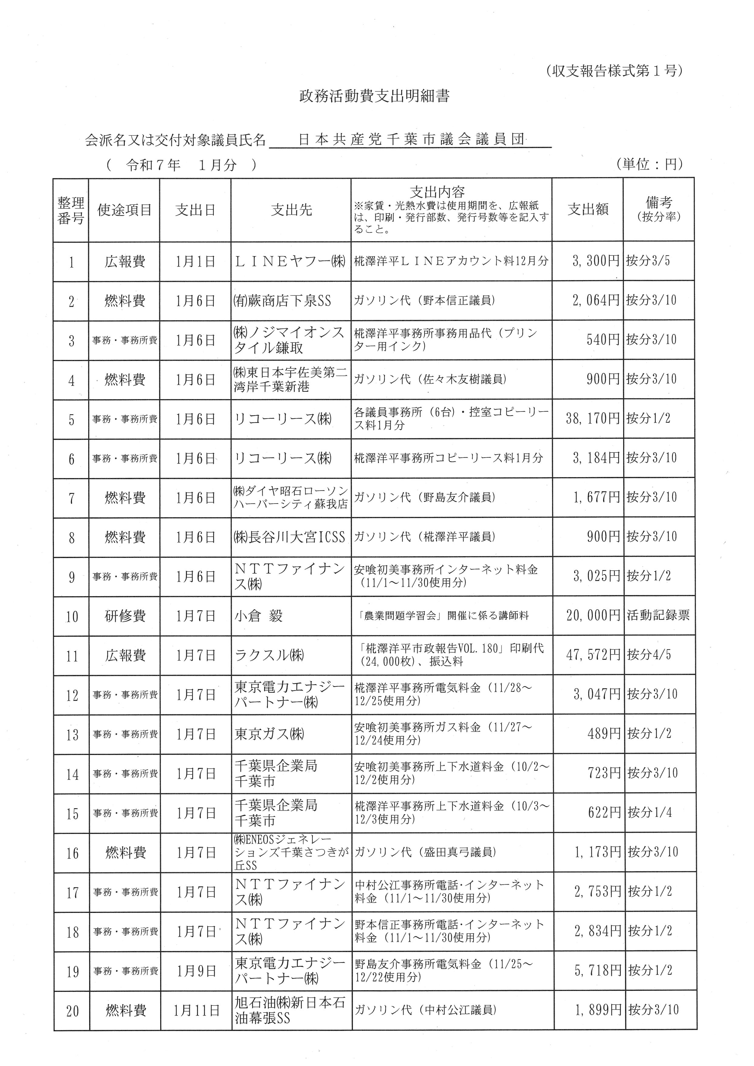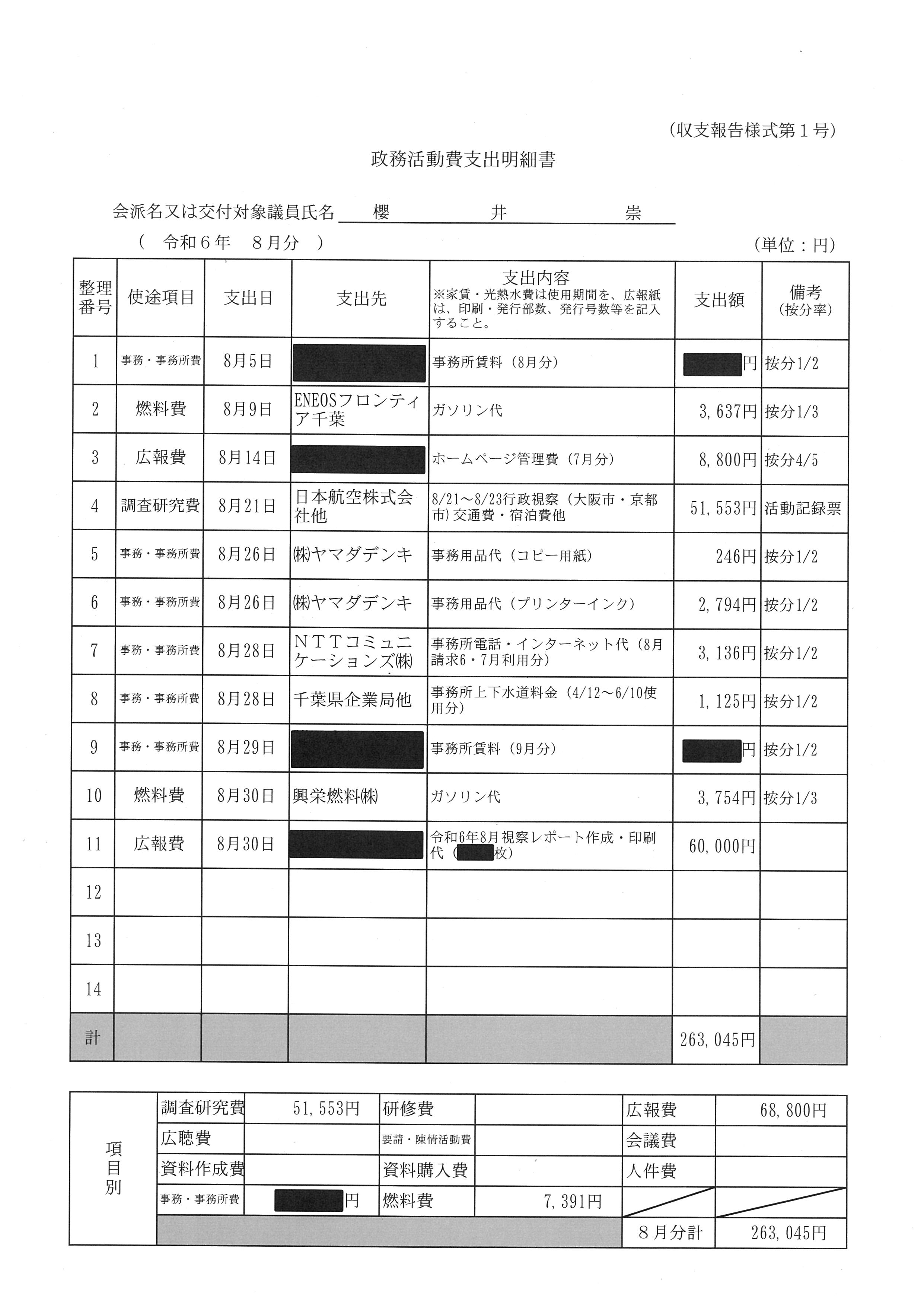 千葉市議会トップページ > 広報・情報公開 > 政務活動費 > 令和6年度交付分(政務活動費収支報告書)