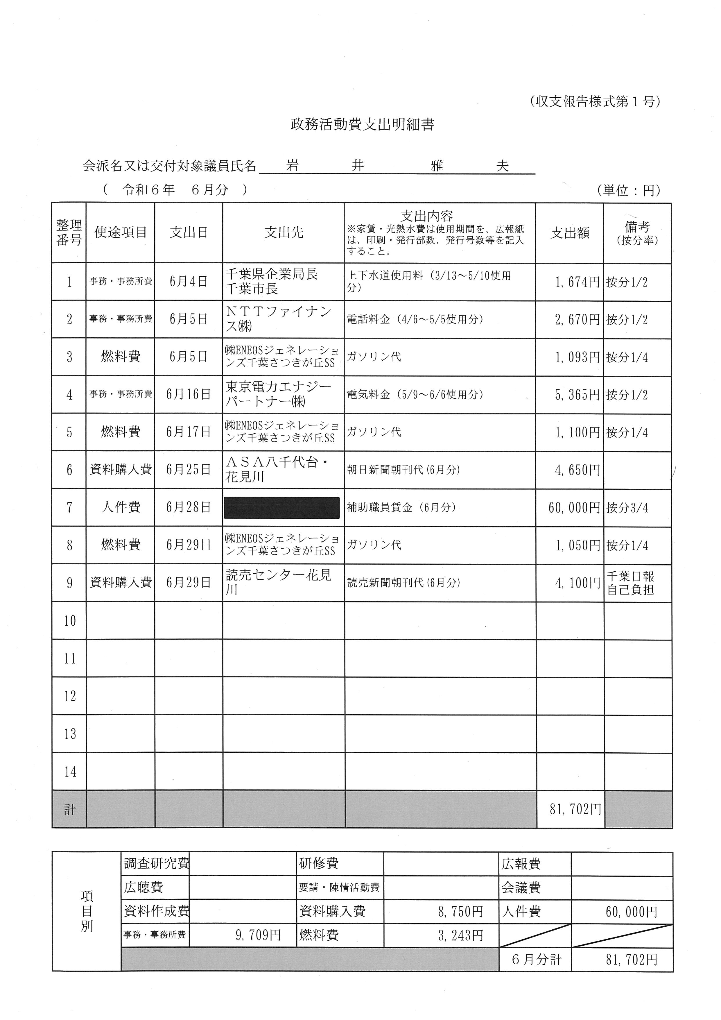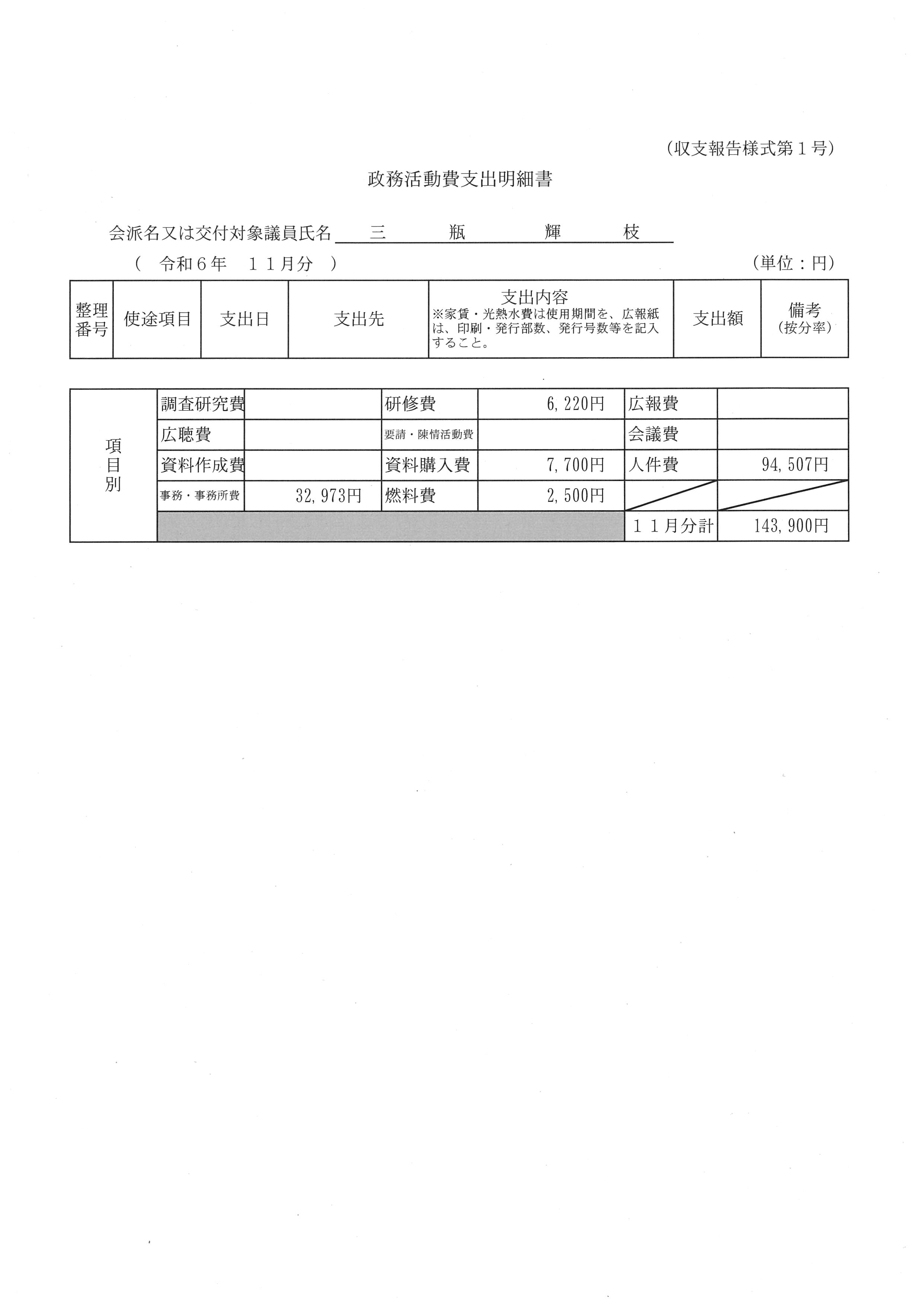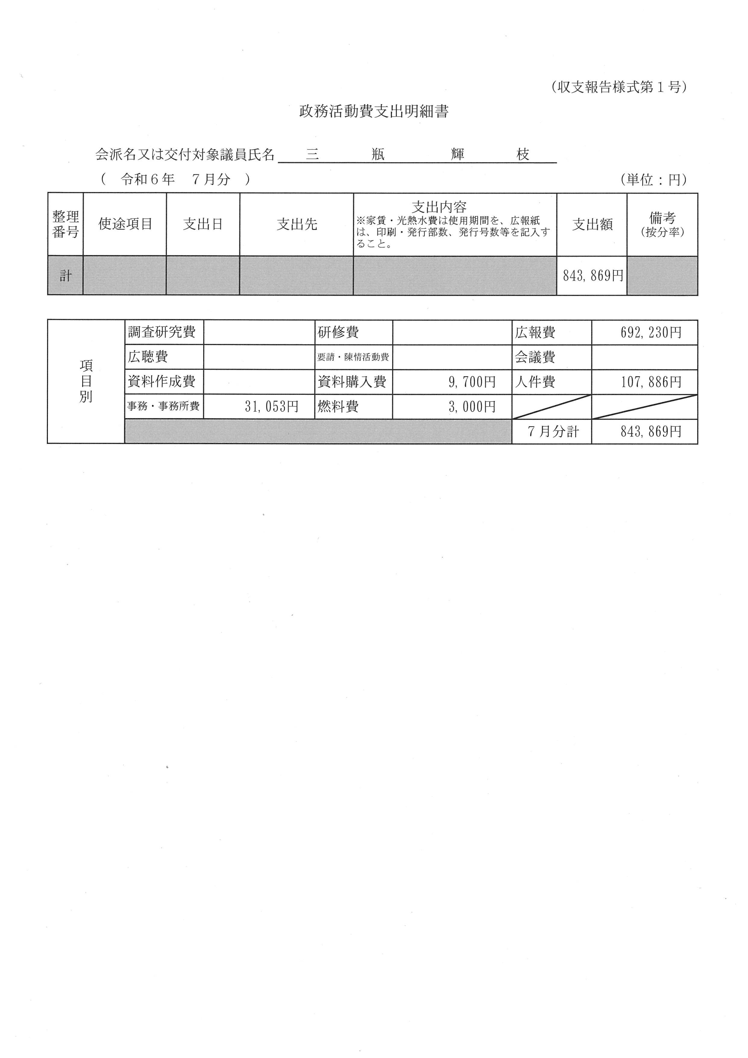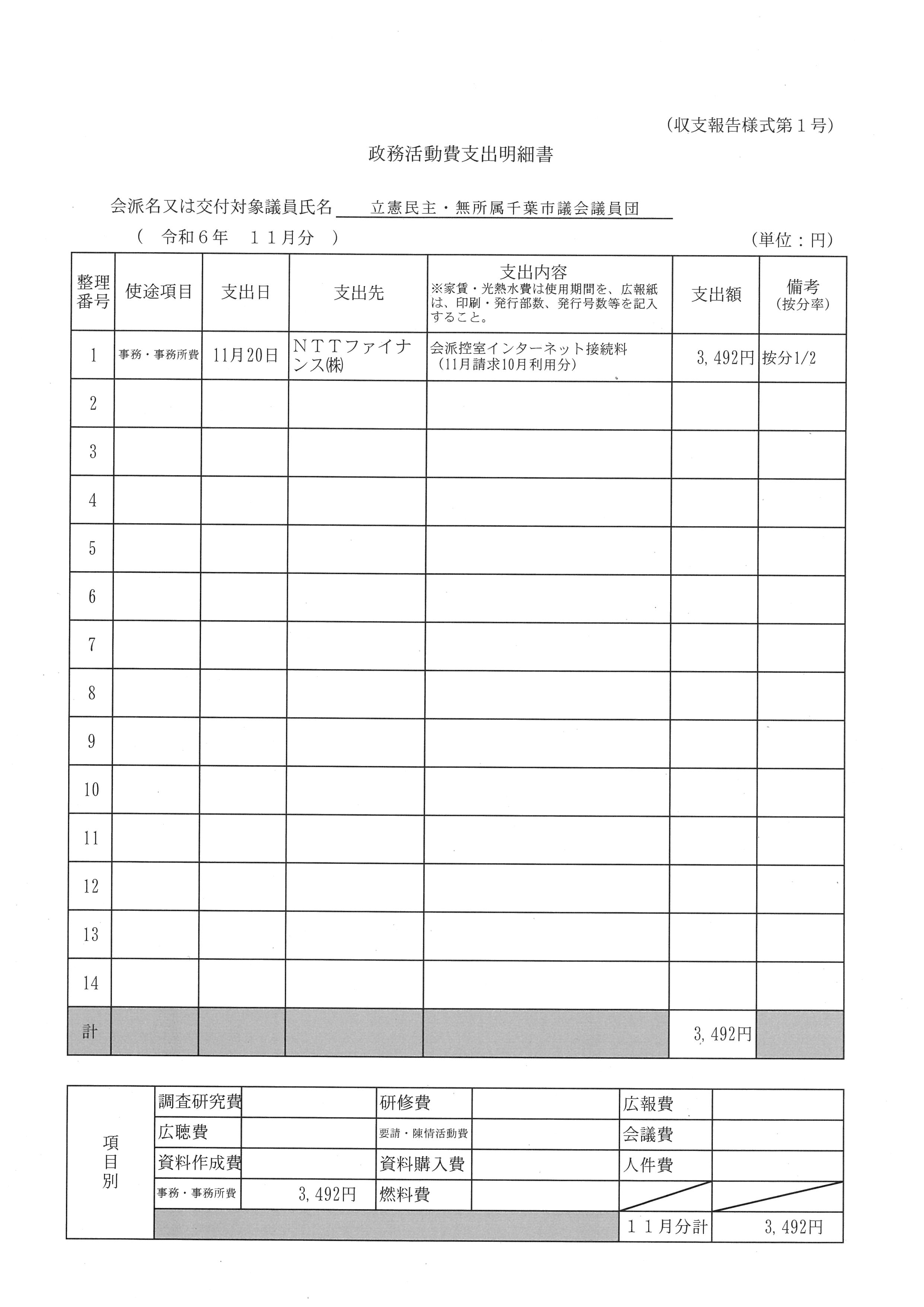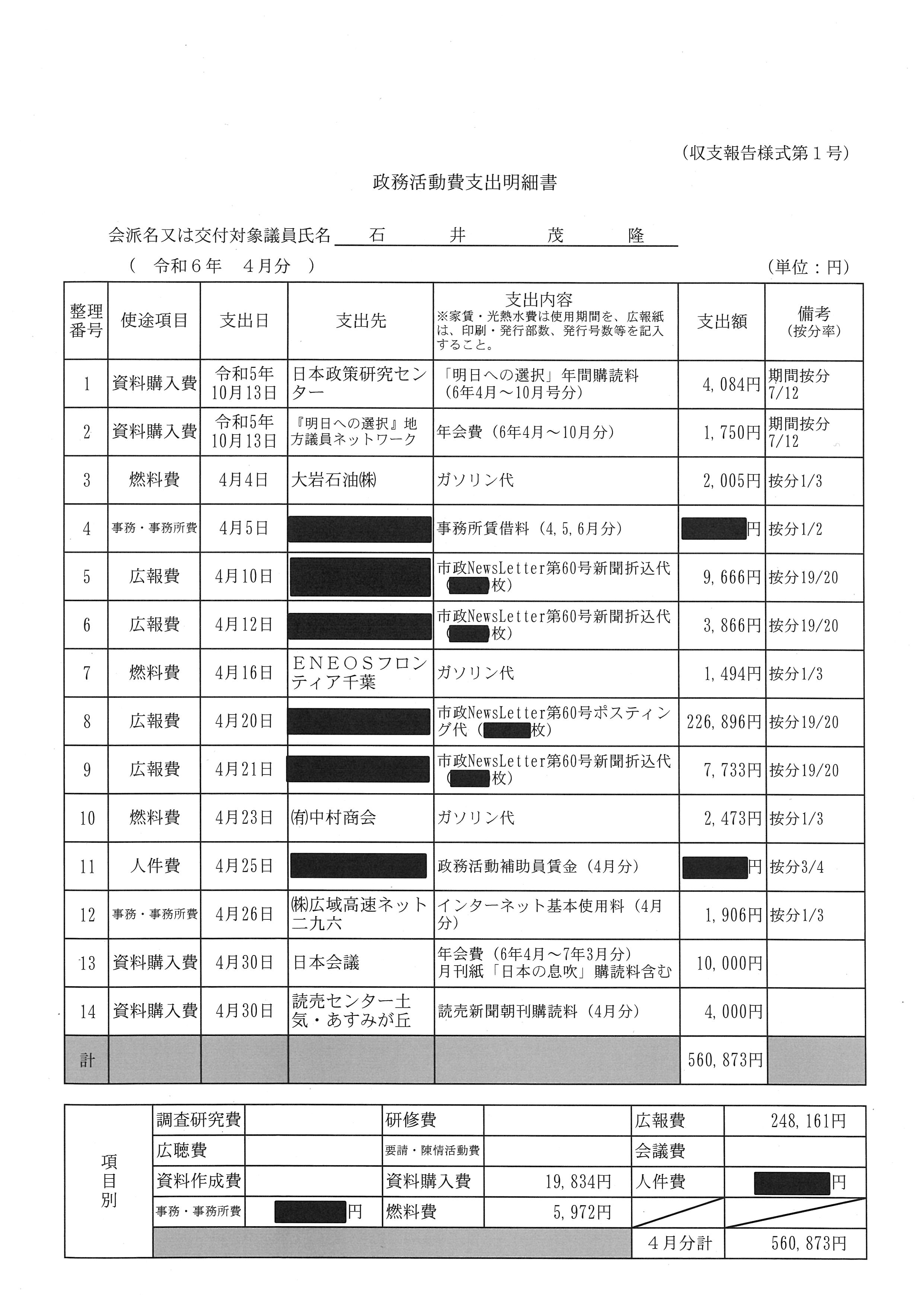 千葉市議会トップページ > 広報・情報公開 > 政務活動費 > 令和6年度交付分(政務活動費収支報告書)