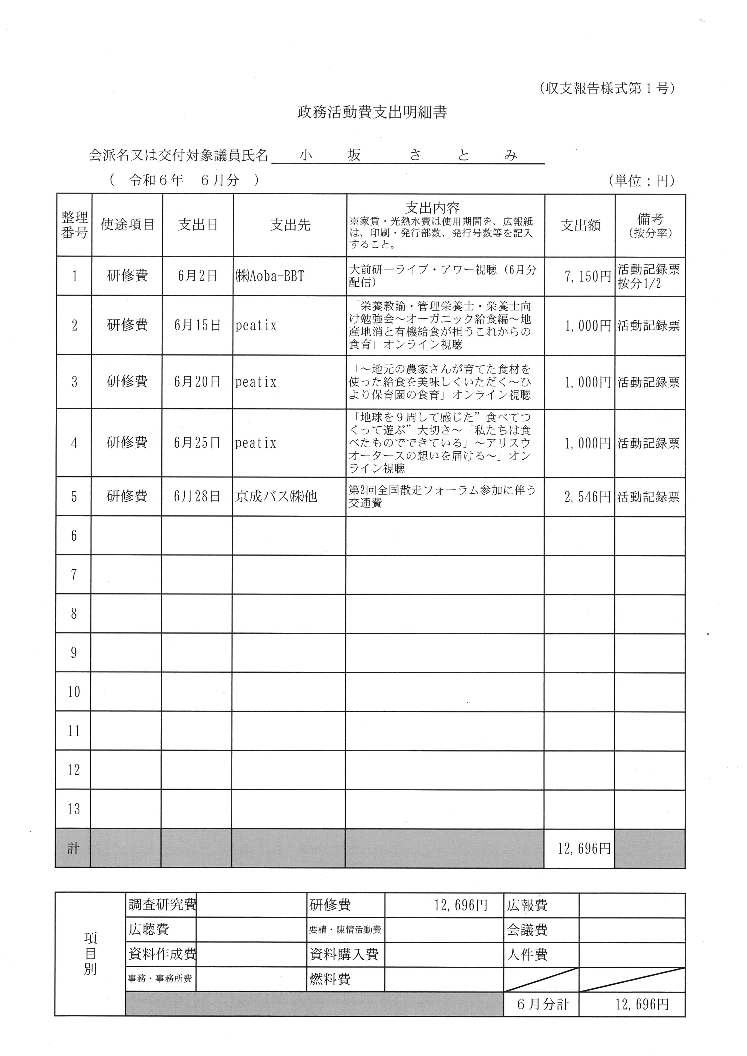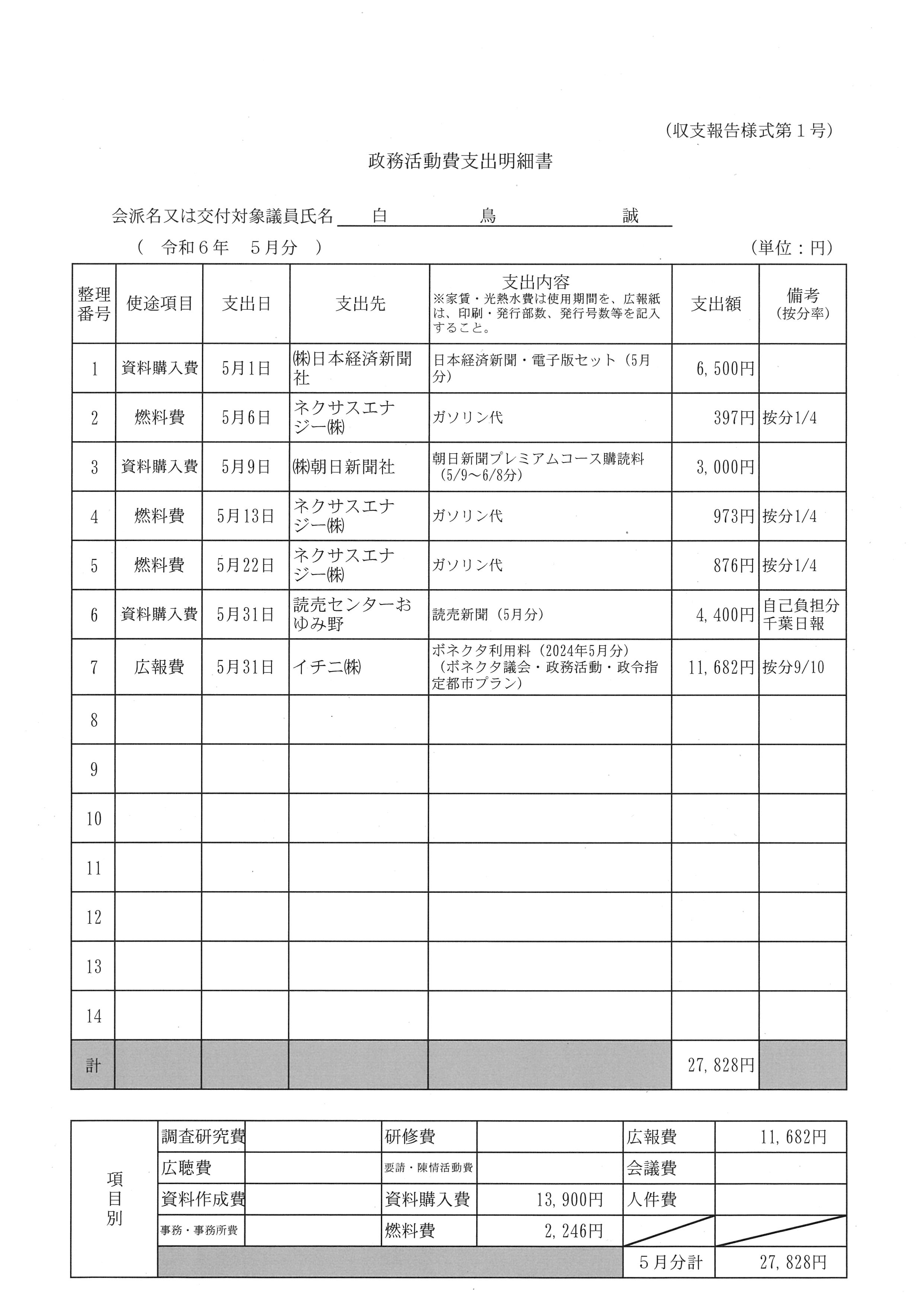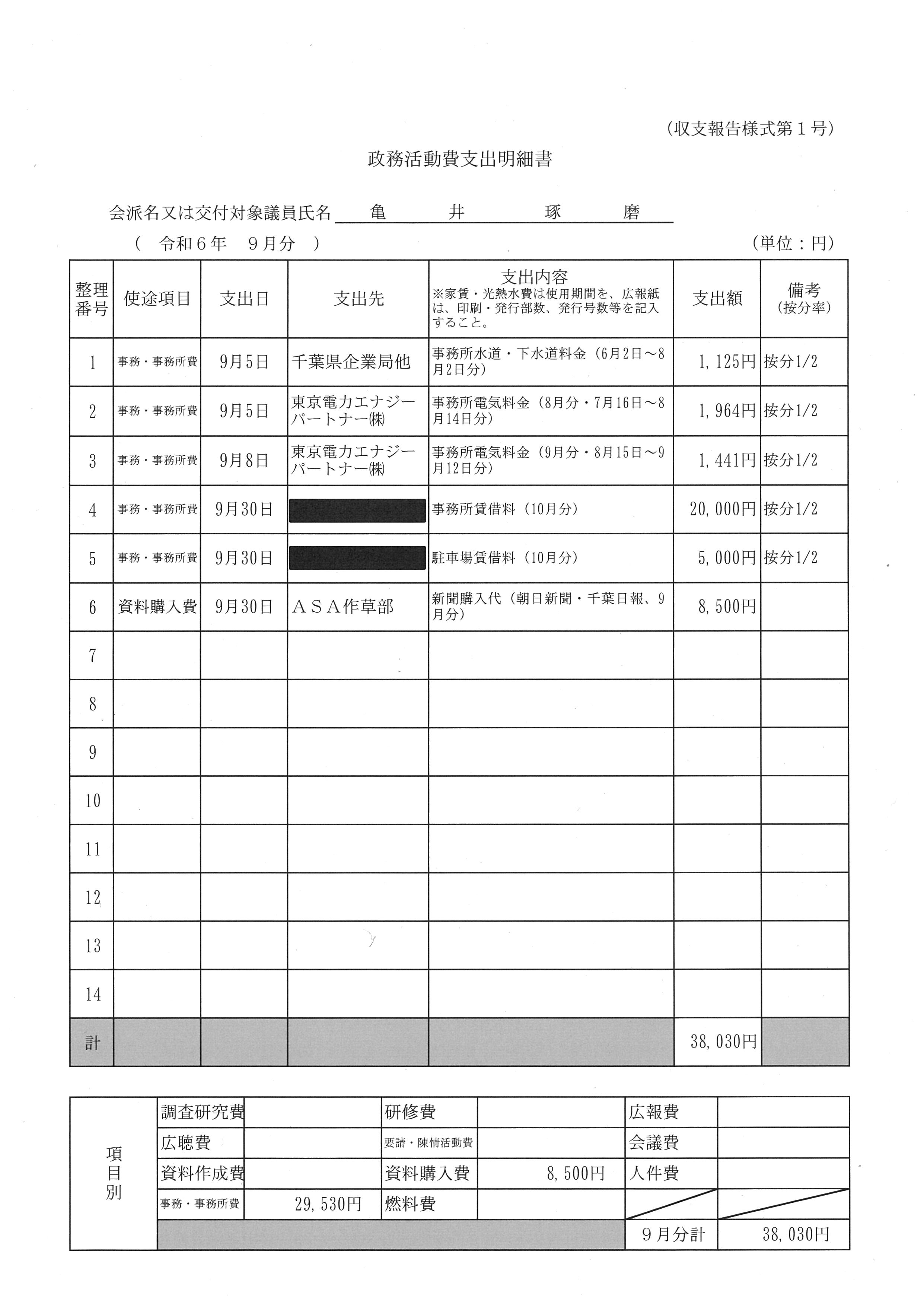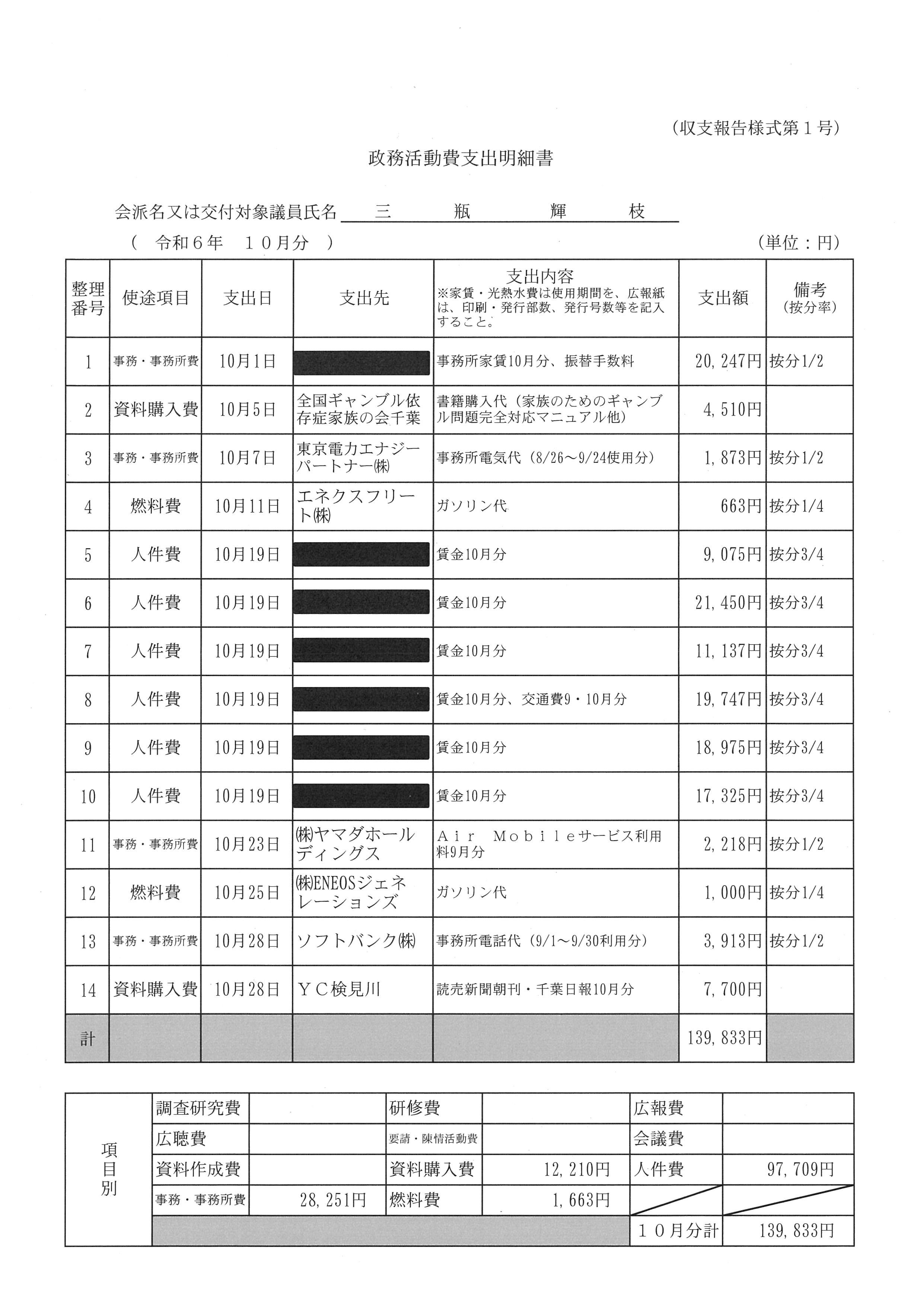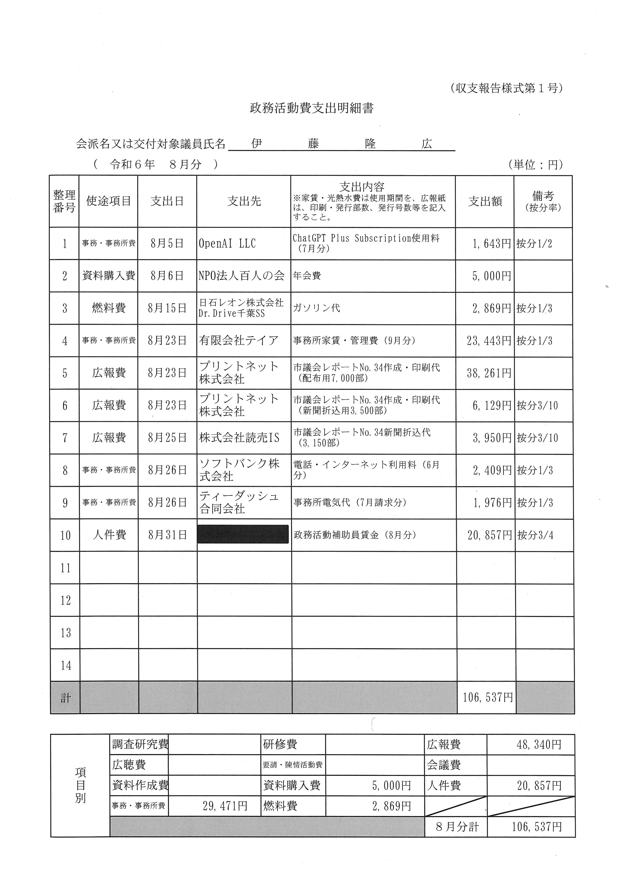 千葉市議会トップページ > 広報・情報公開 > 政務活動費 > 令和6年度交付分(政務活動費収支報告書)