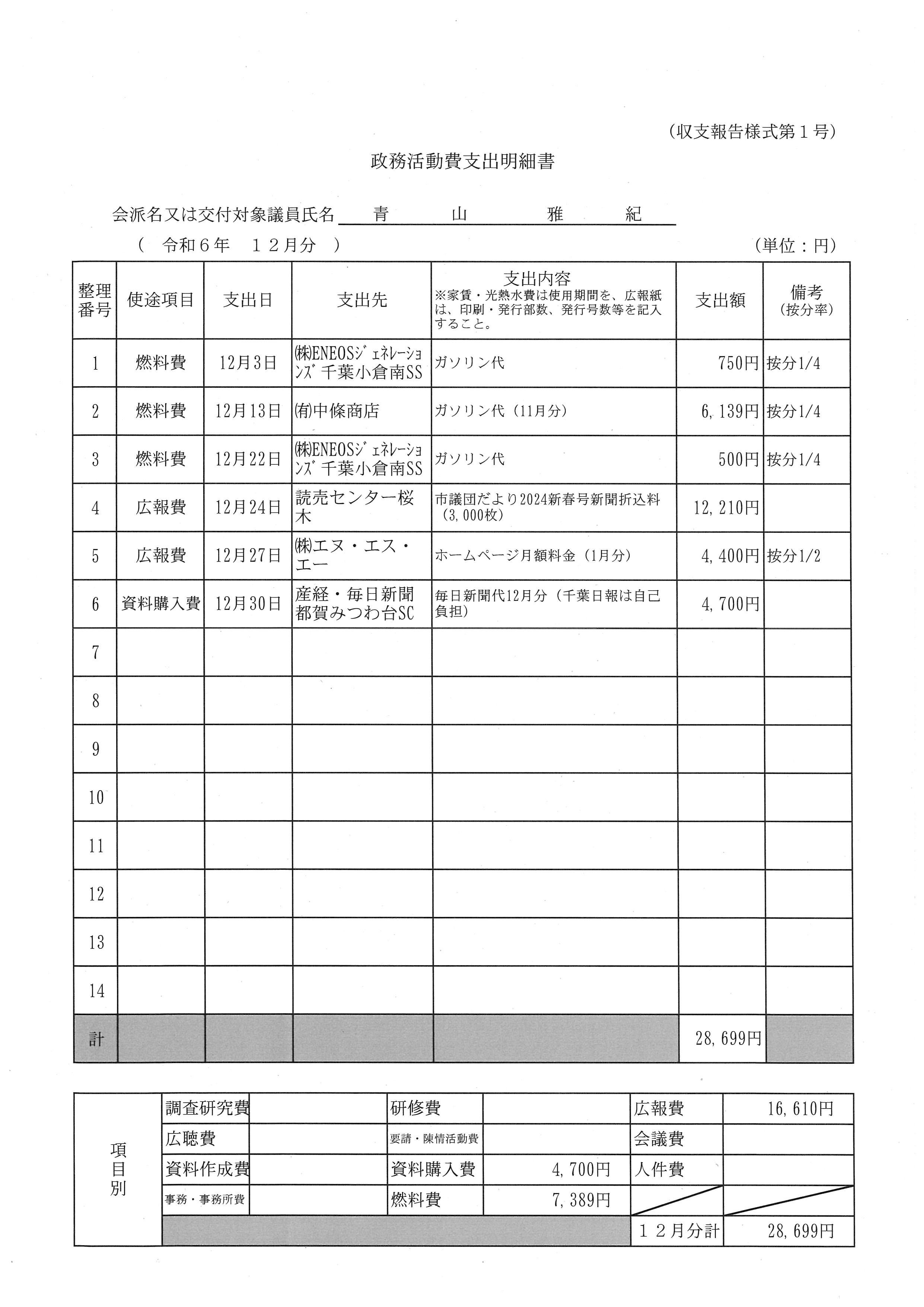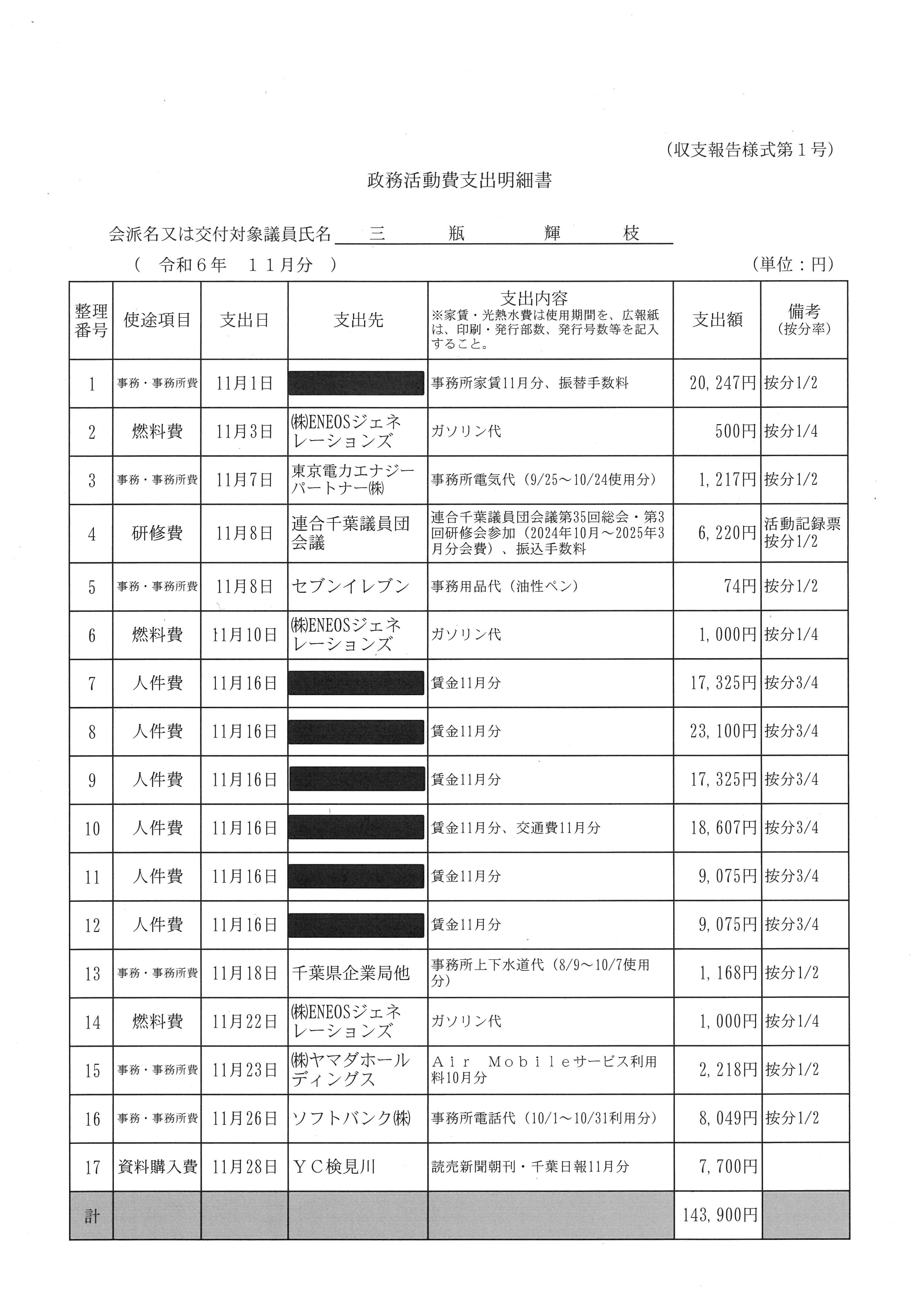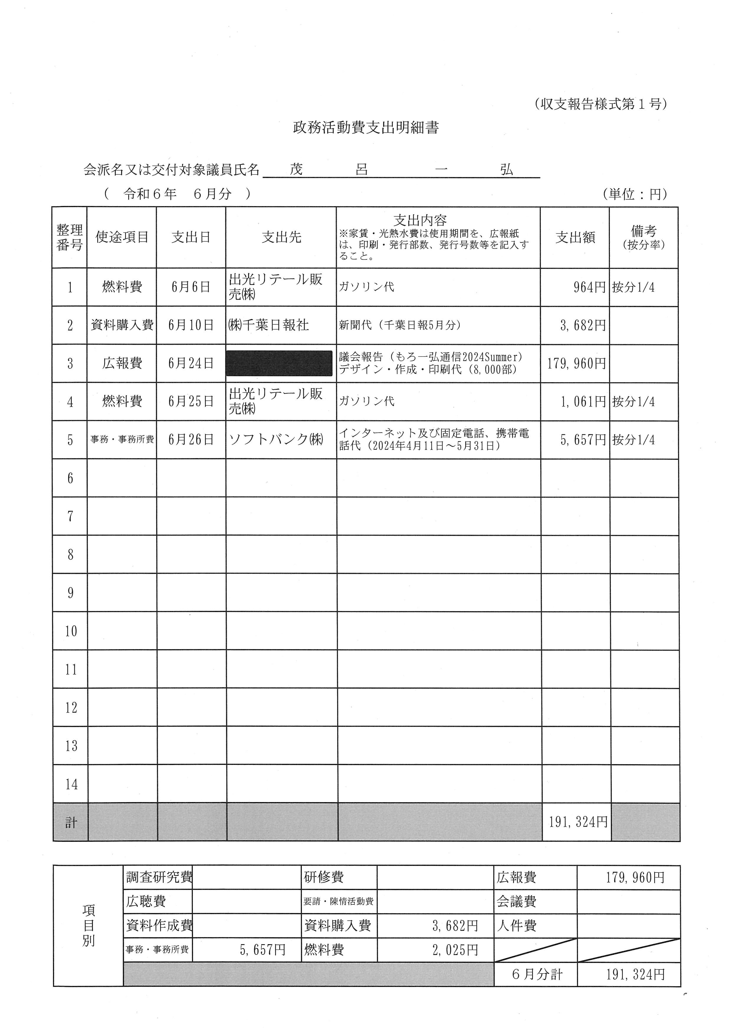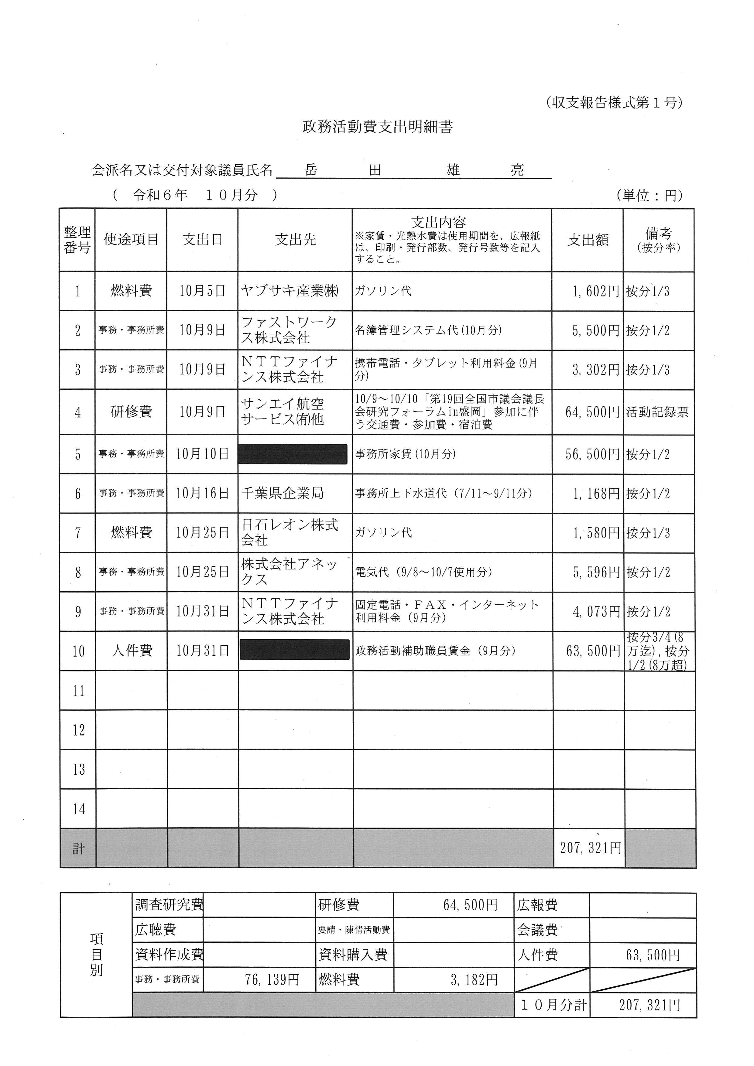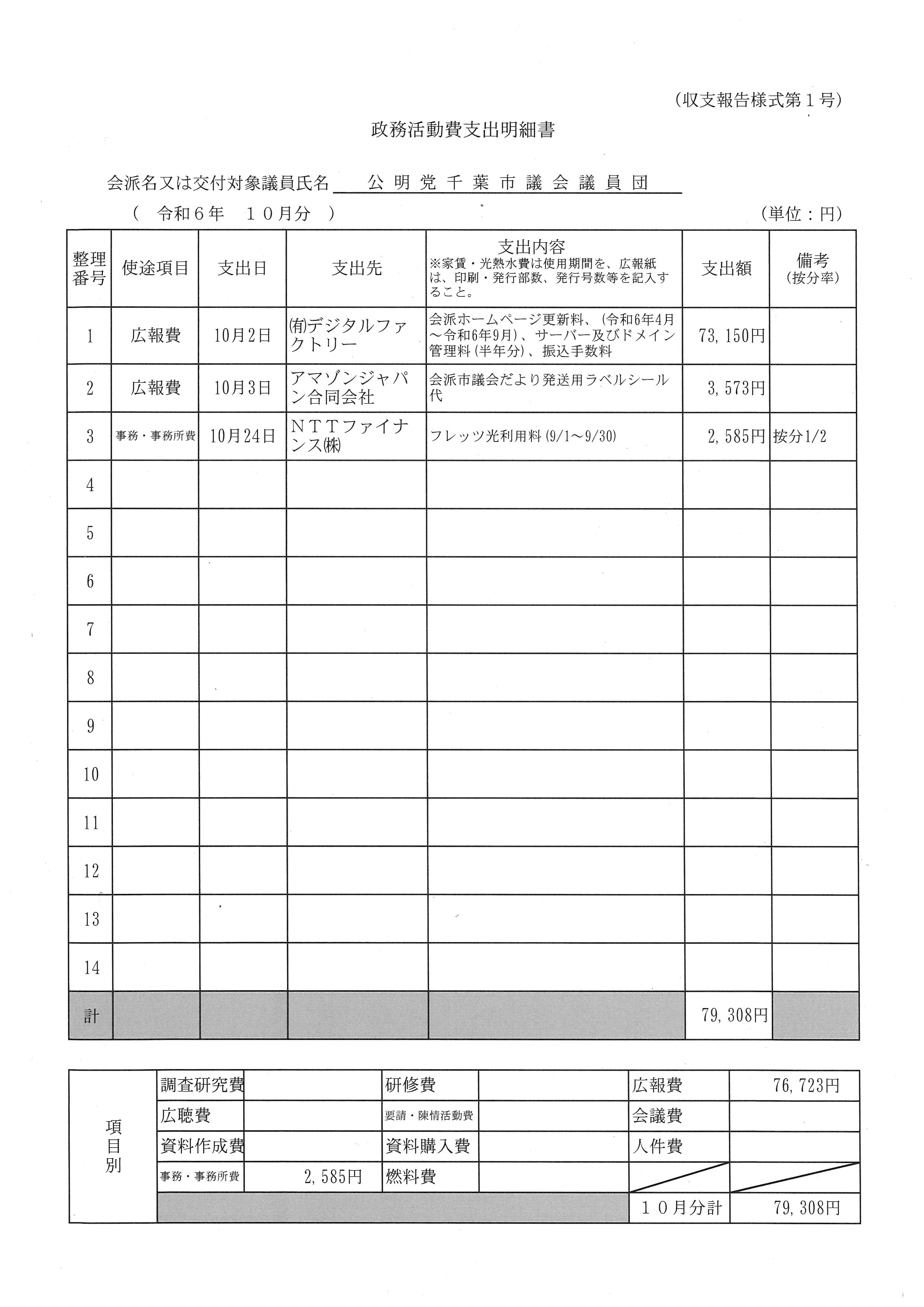 千葉市議会トップページ > 広報・情報公開 > 政務活動費 > 令和6年度交付分(政務活動費収支報告書)