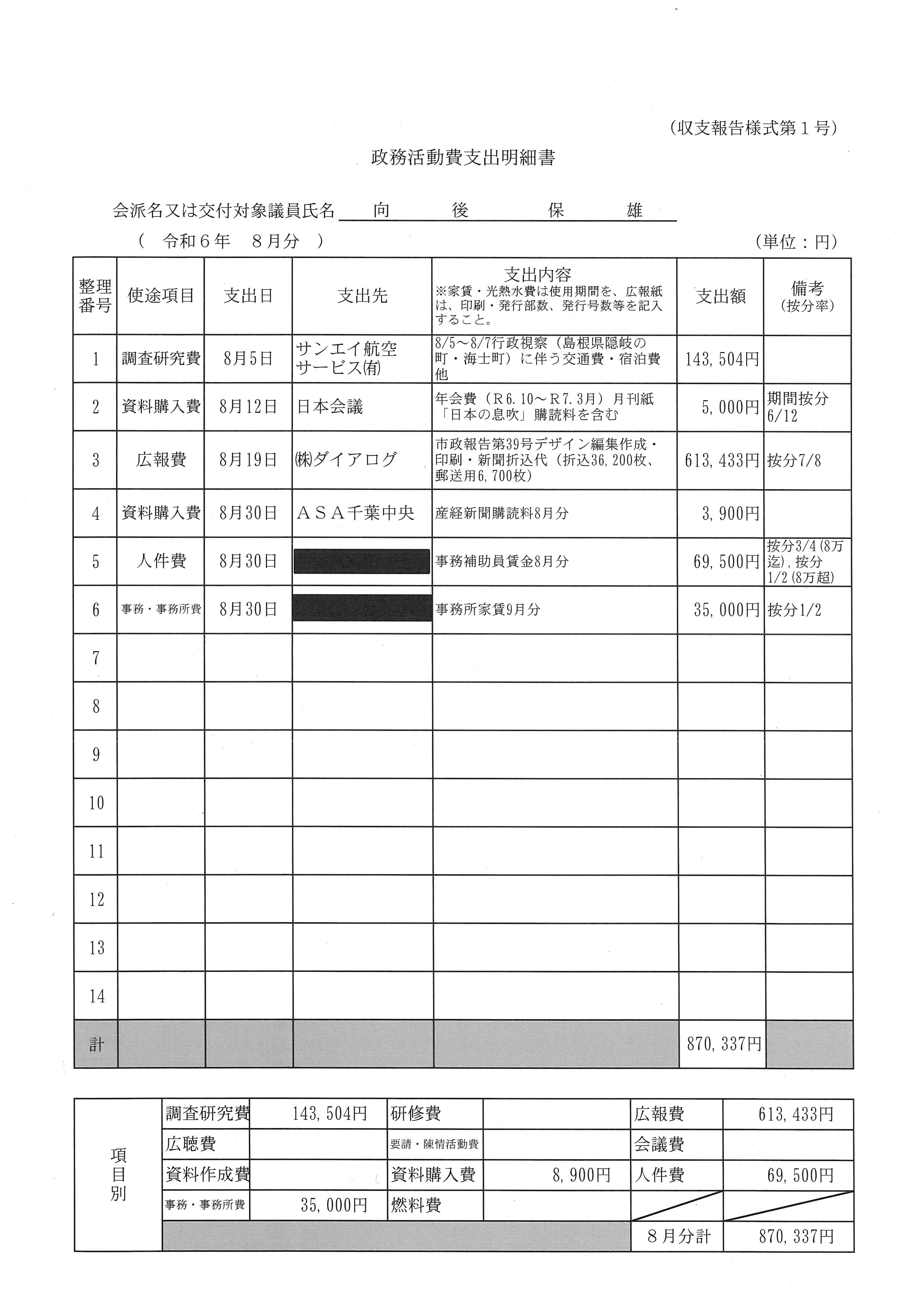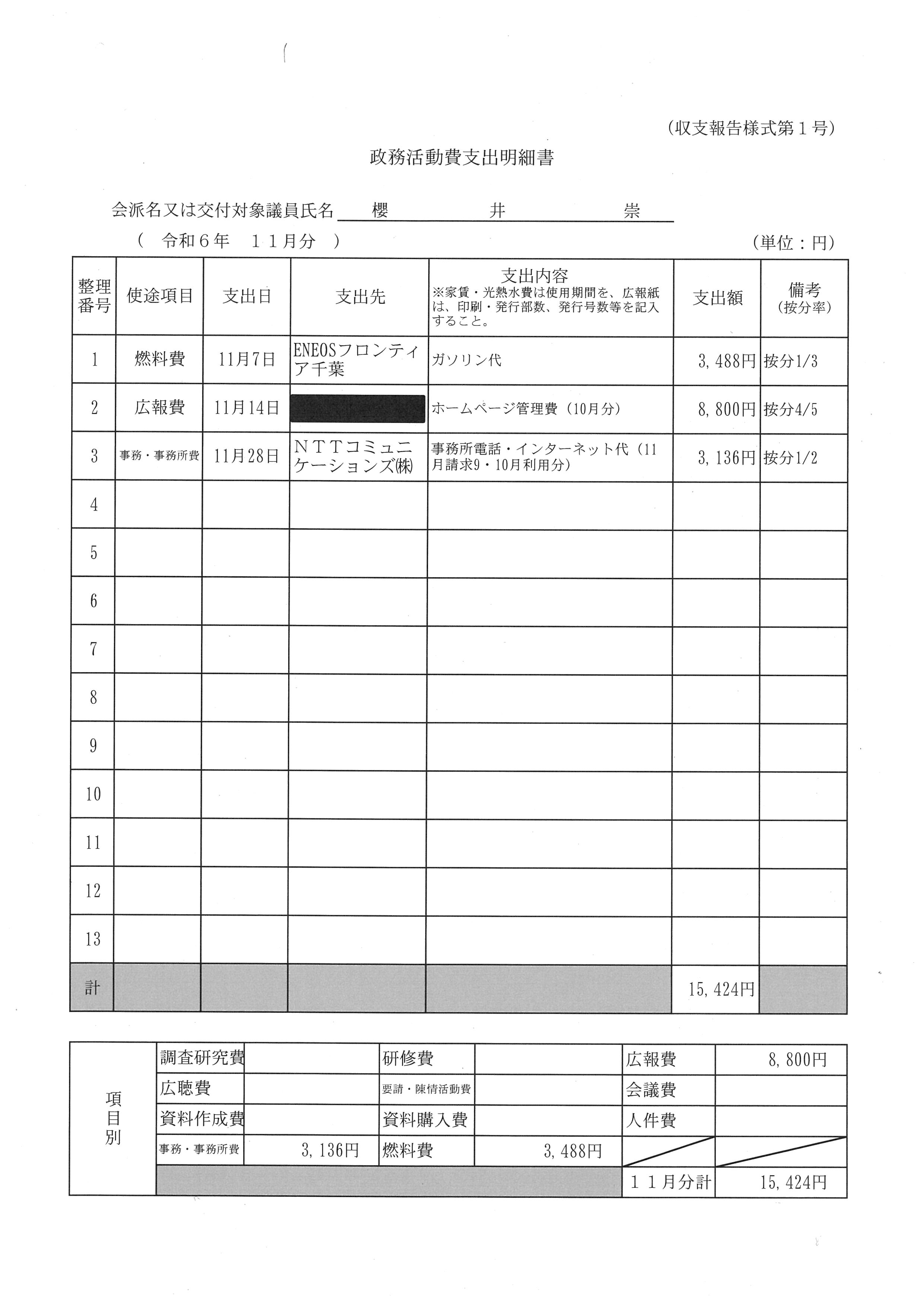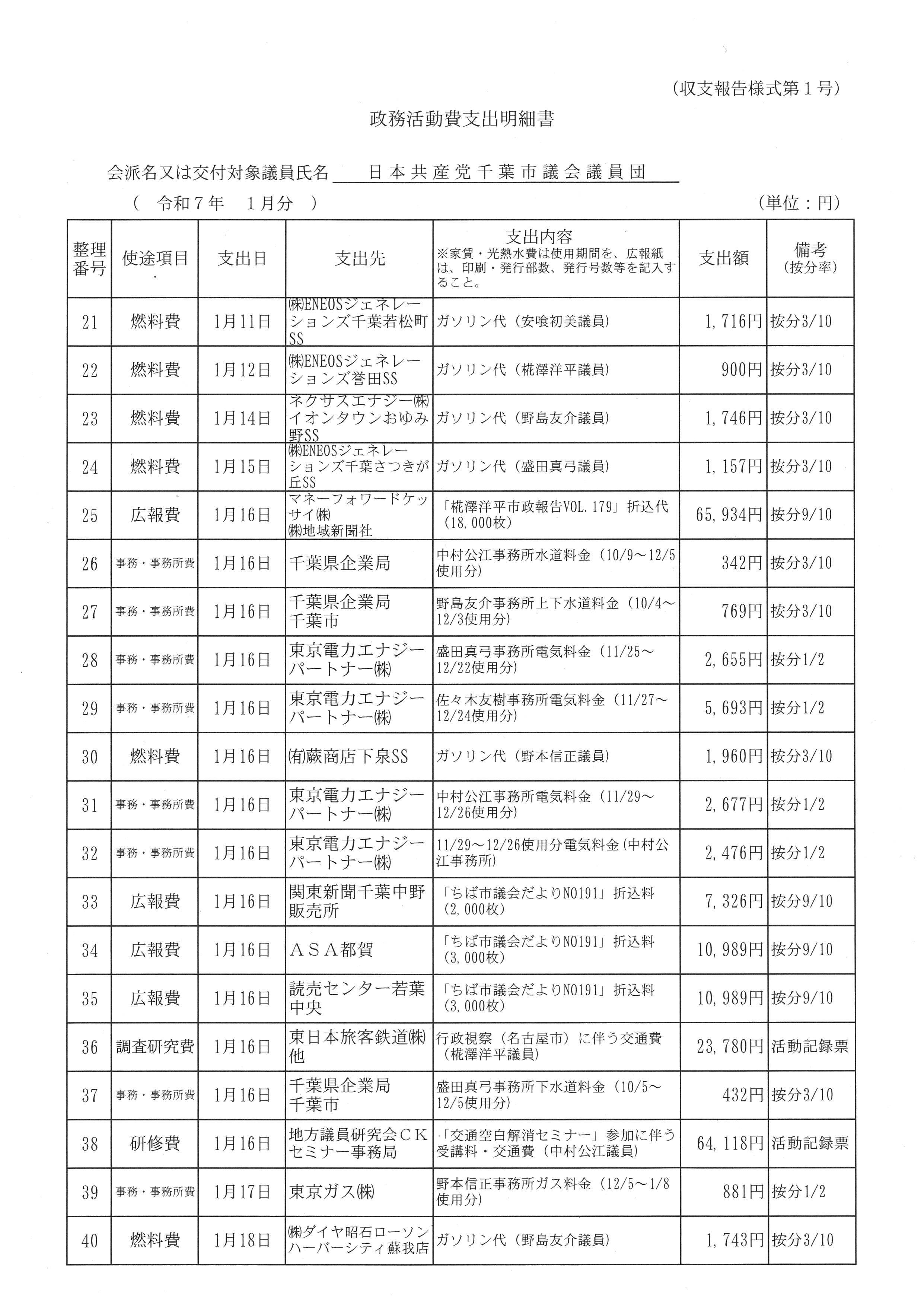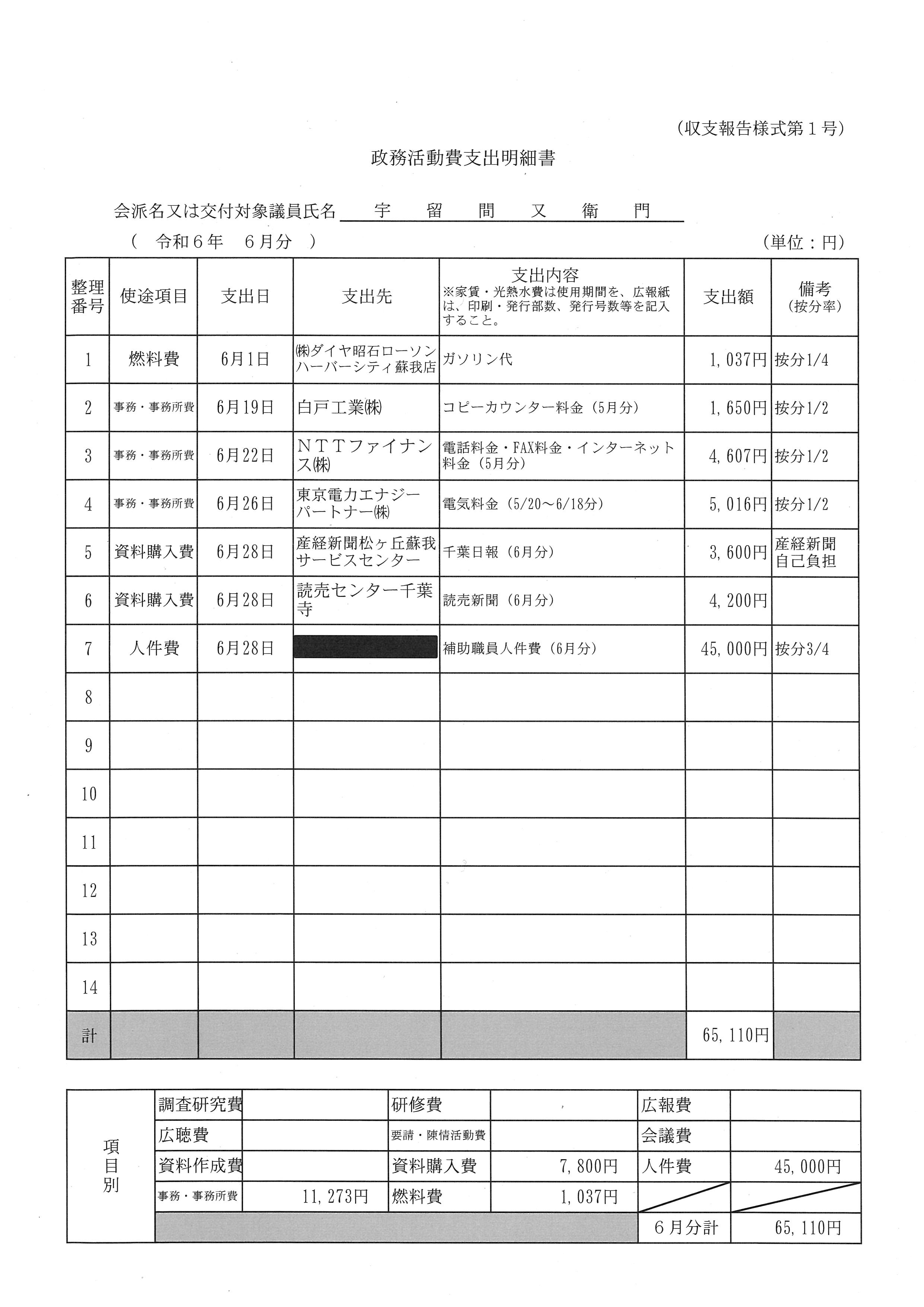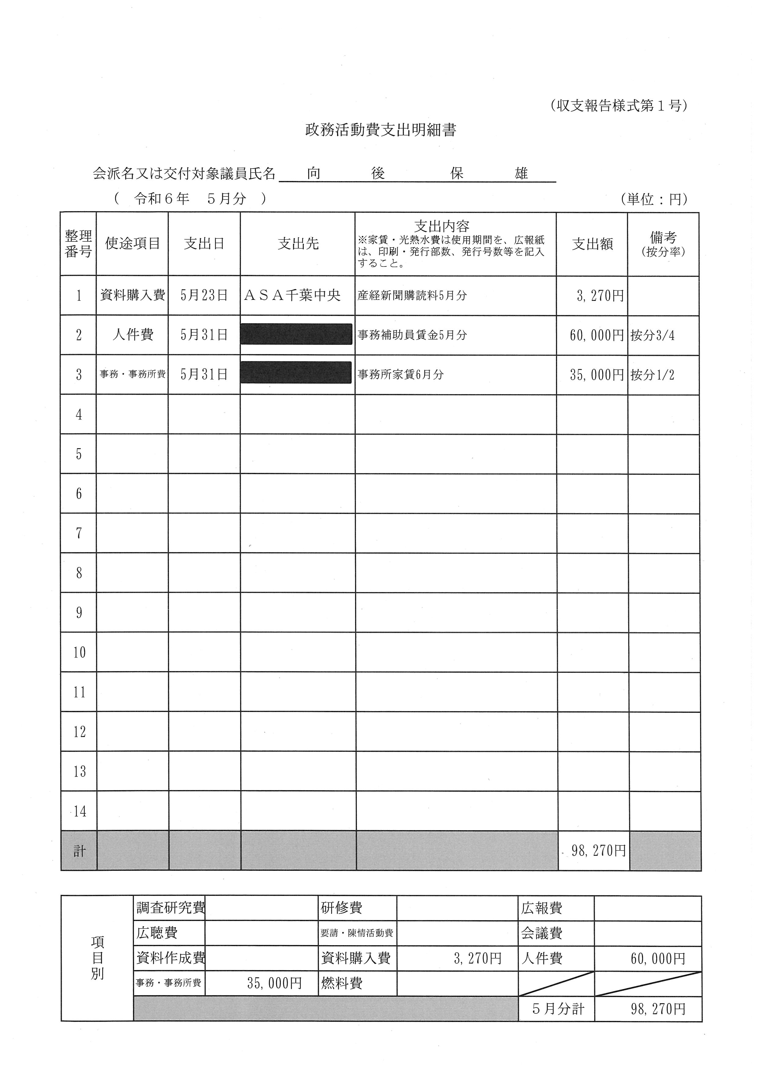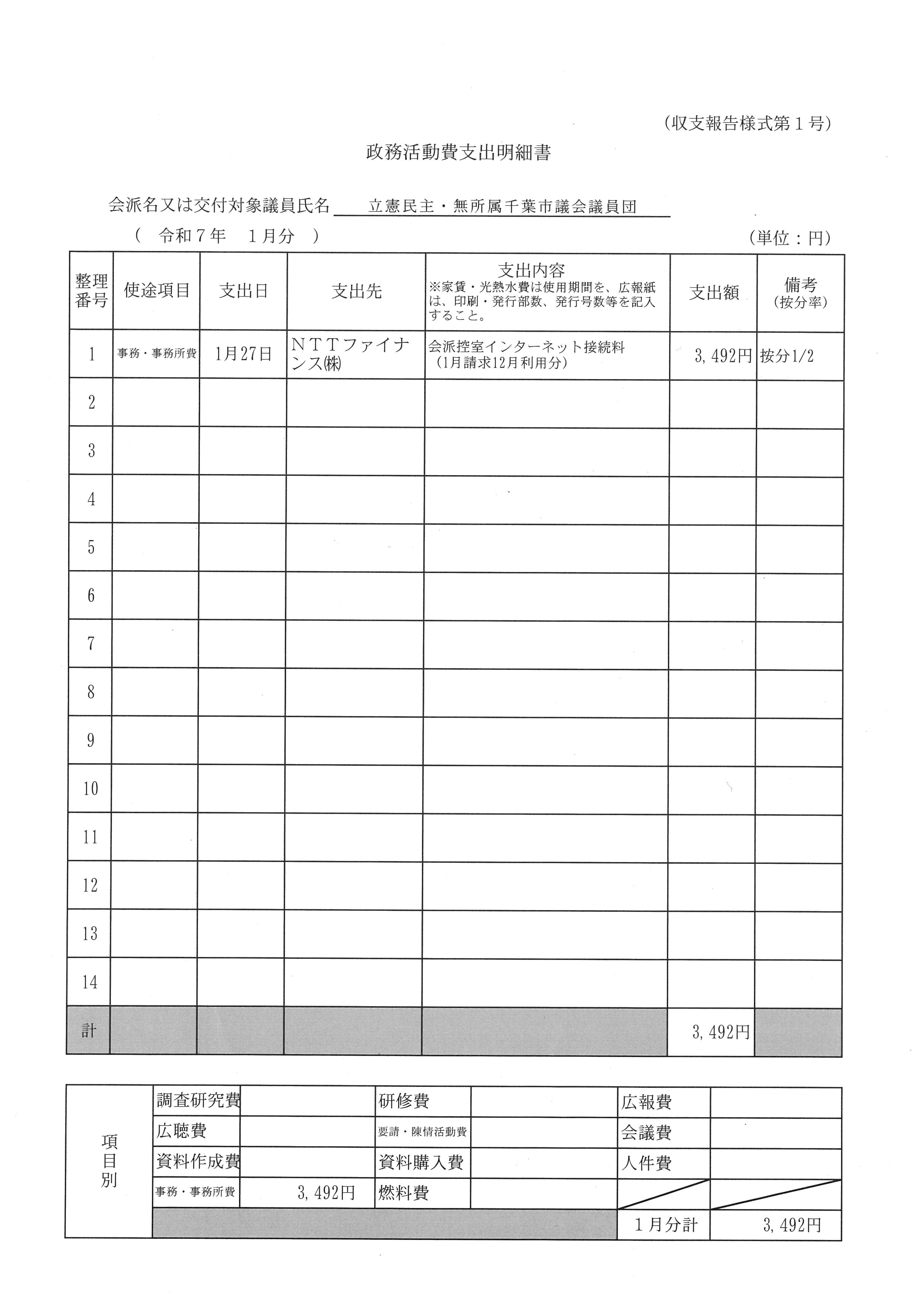 千葉市議会トップページ > 広報・情報公開 > 政務活動費 > 令和6年度交付分(政務活動費収支報告書)