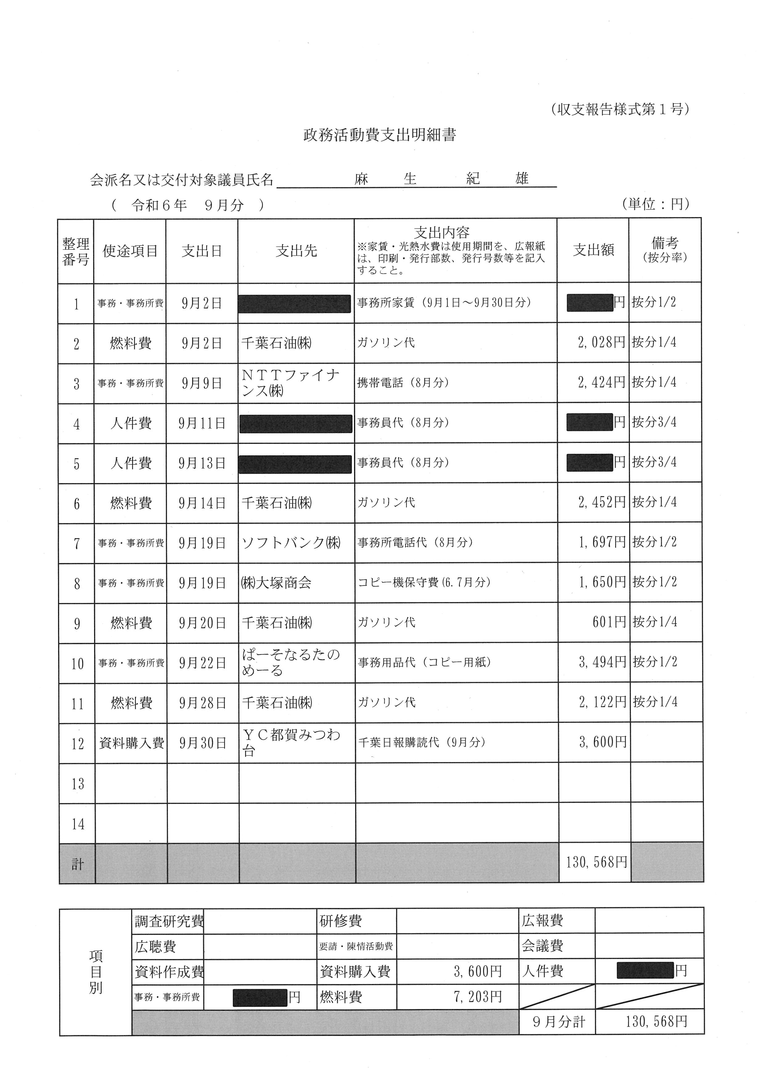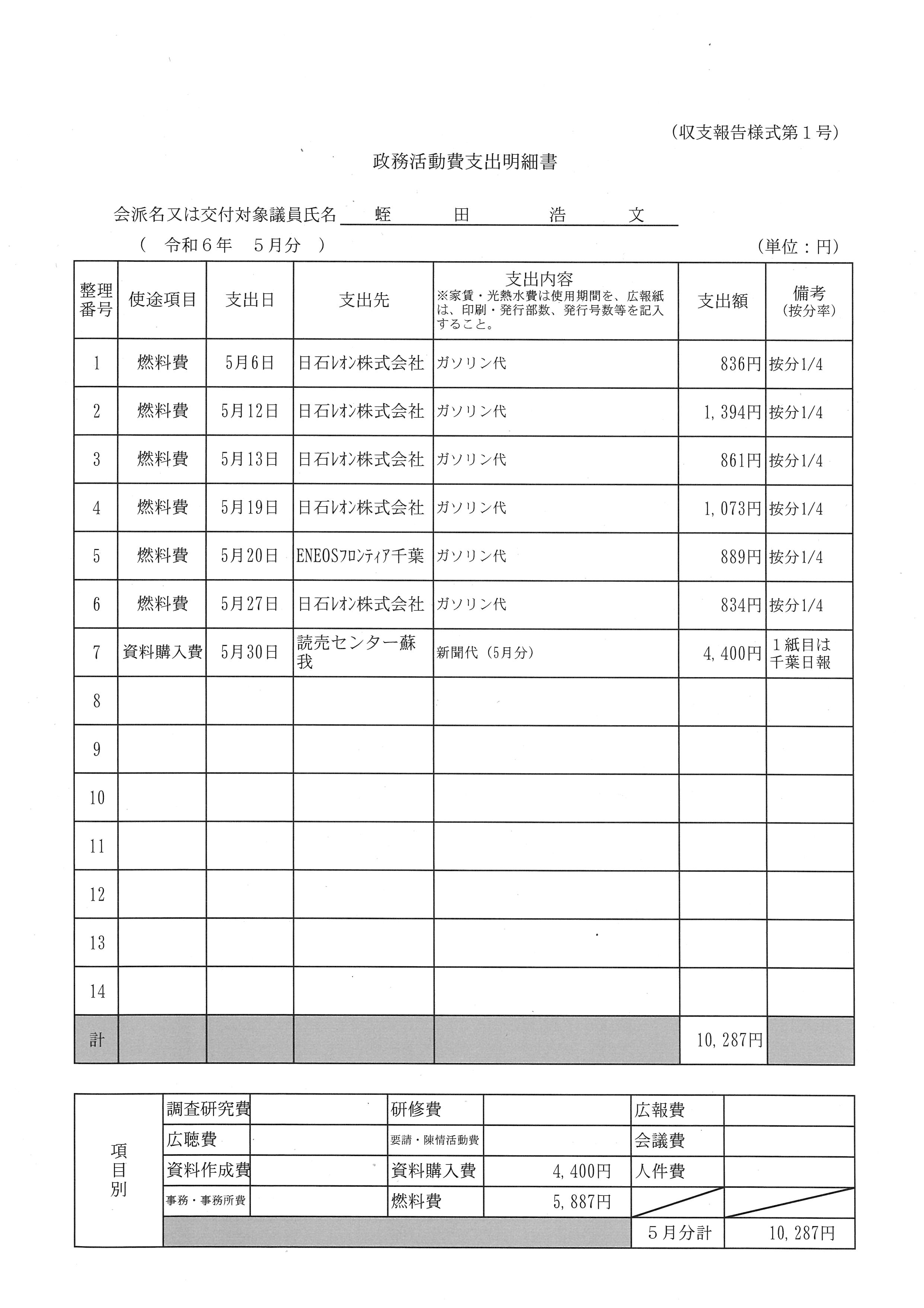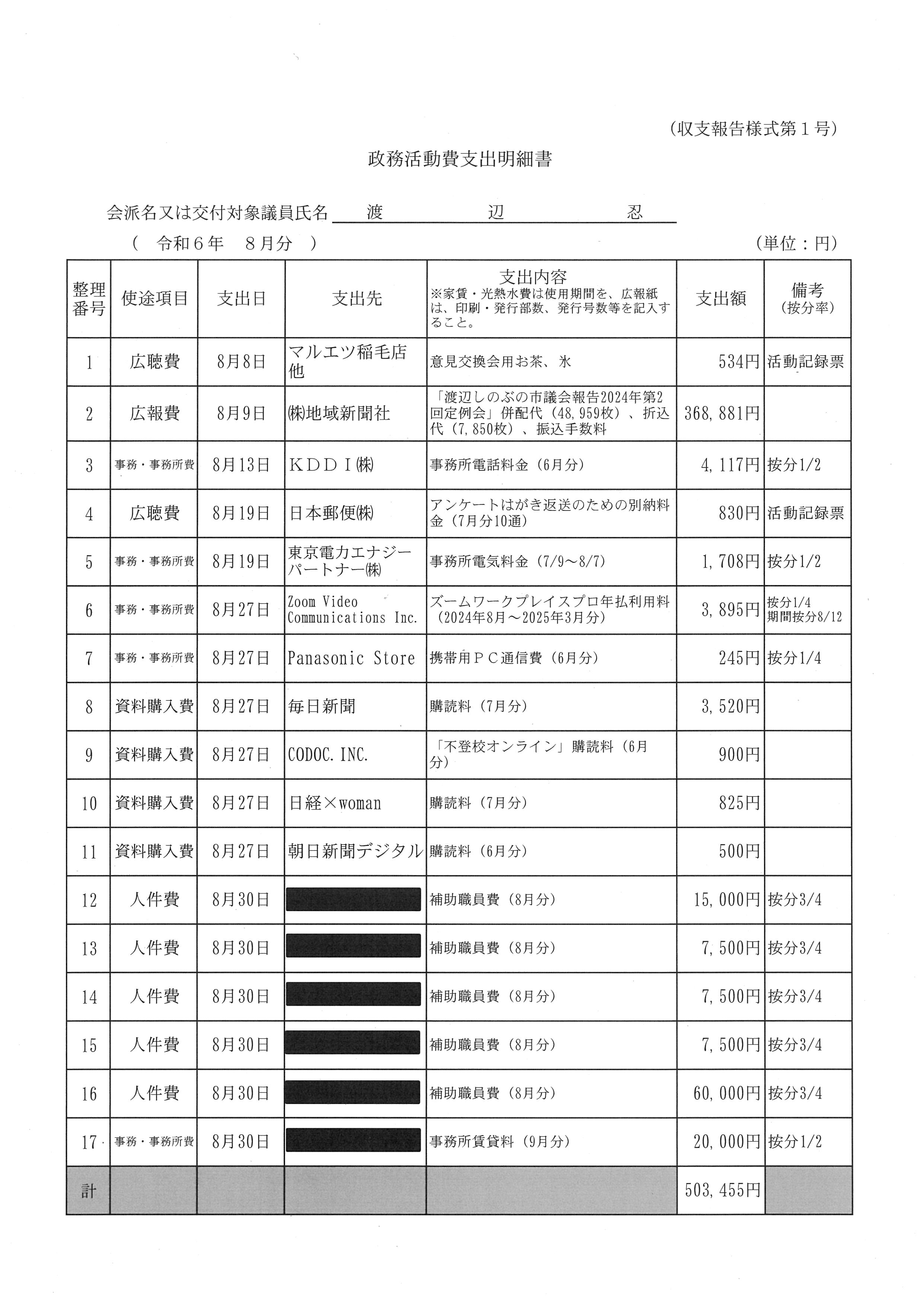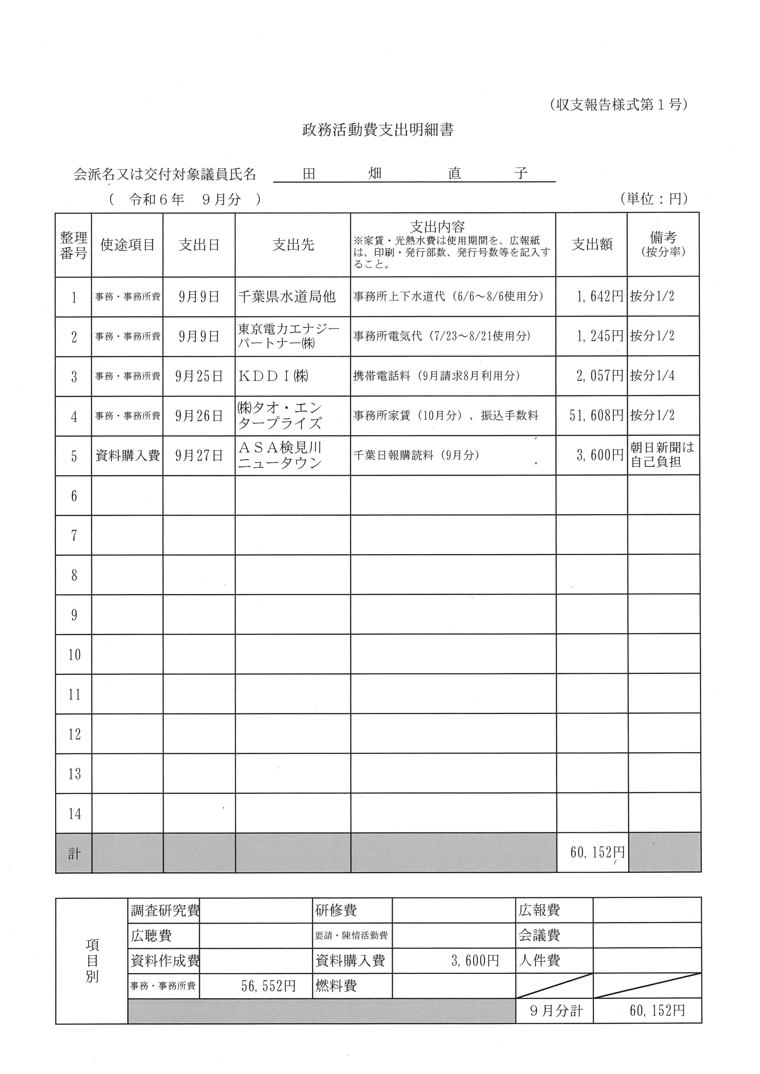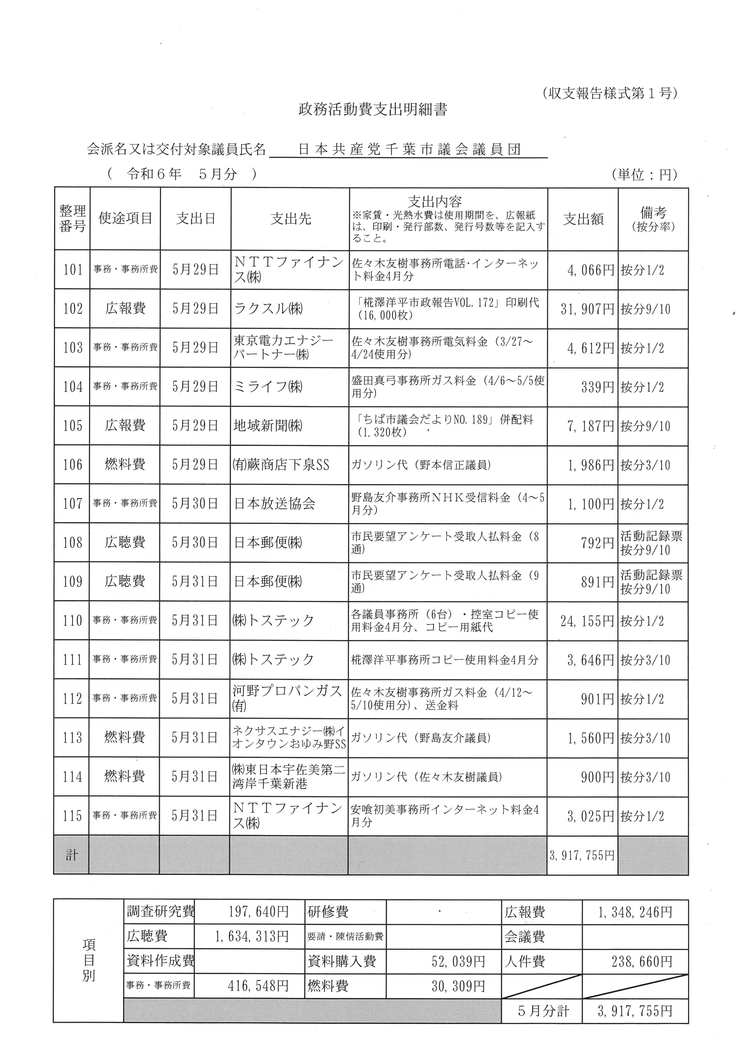 千葉市議会トップページ > 広報・情報公開 > 政務活動費 > 令和6年度交付分(政務活動費収支報告書)