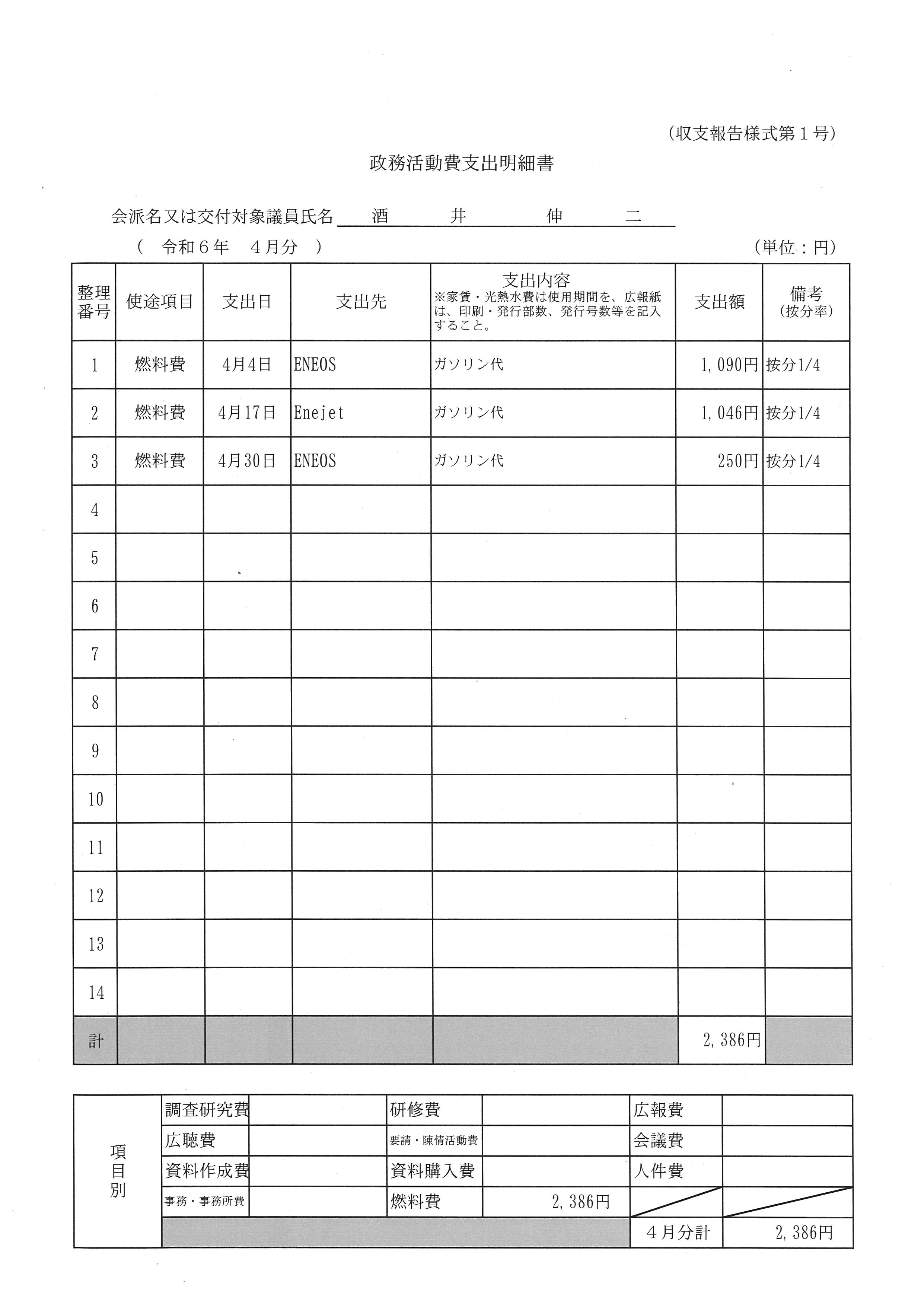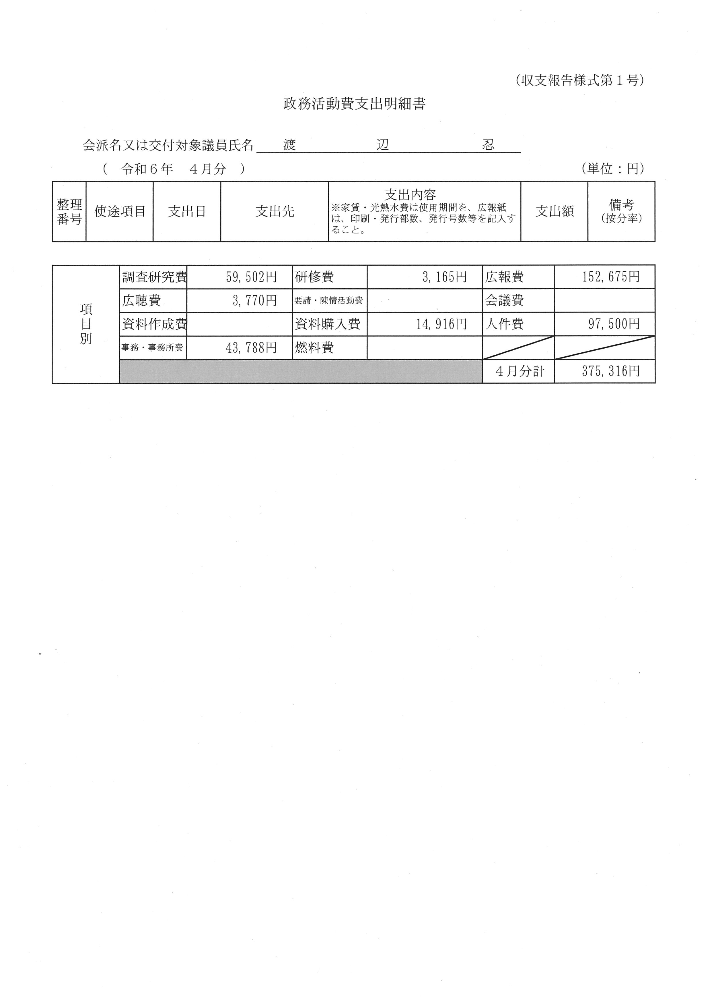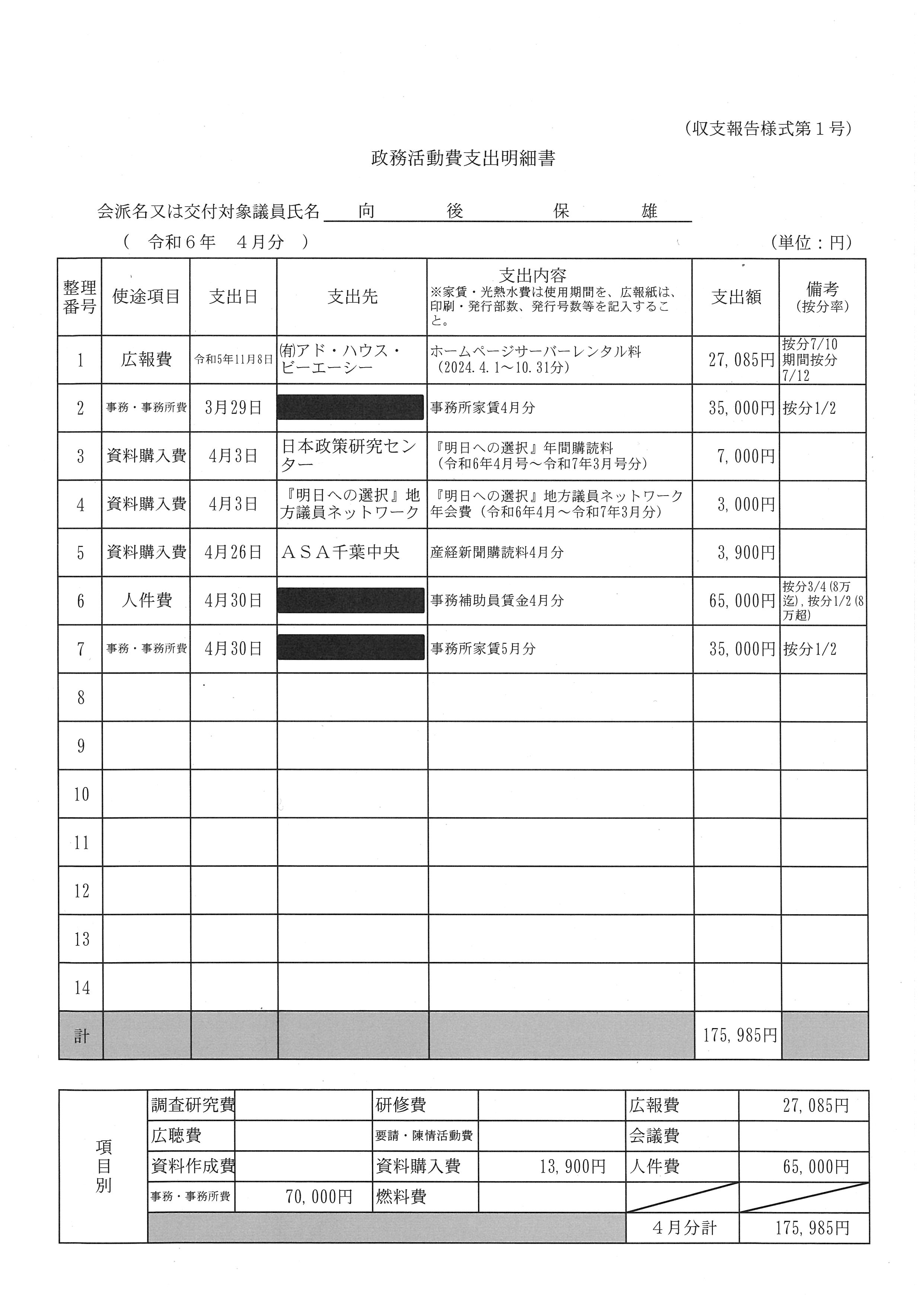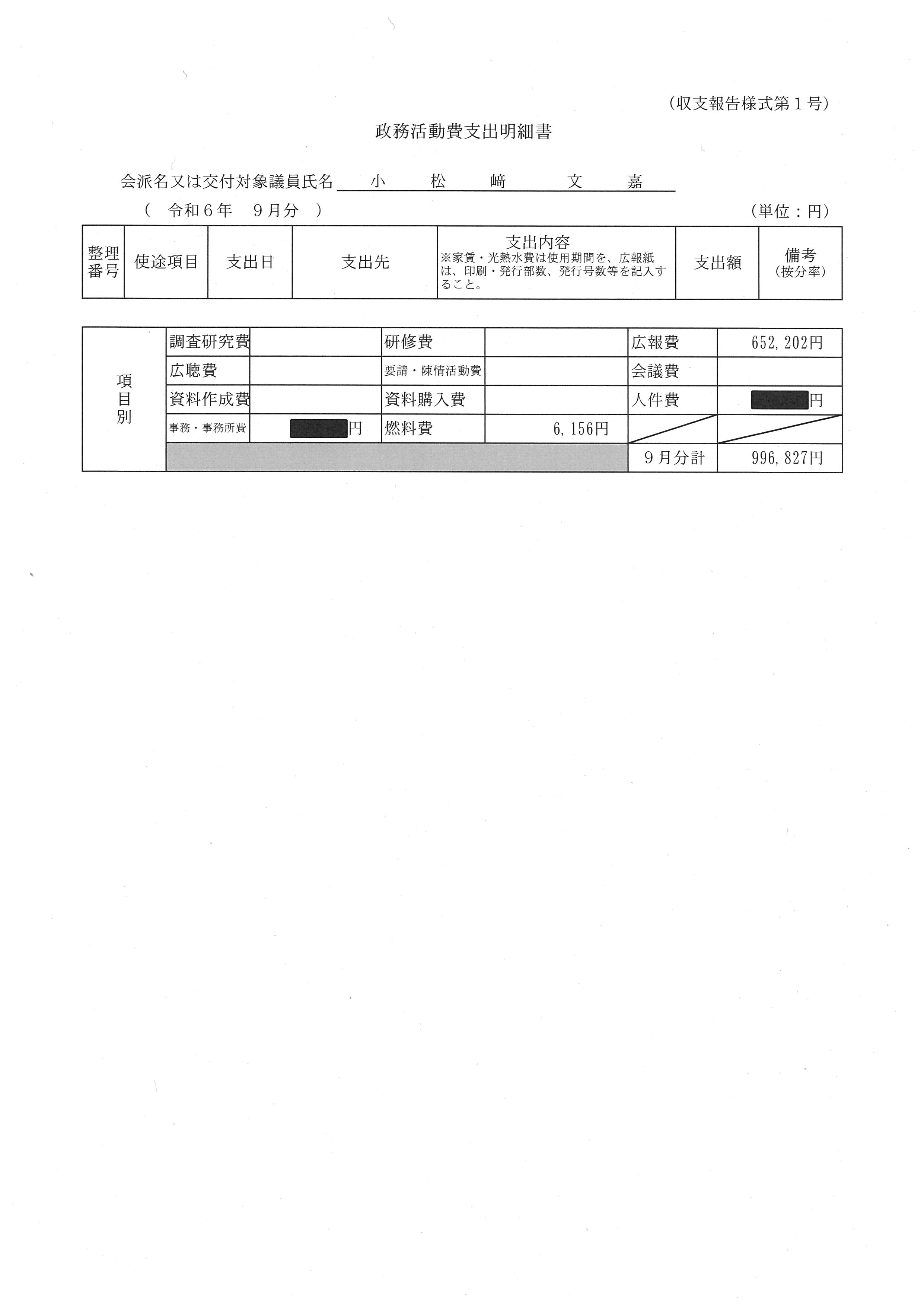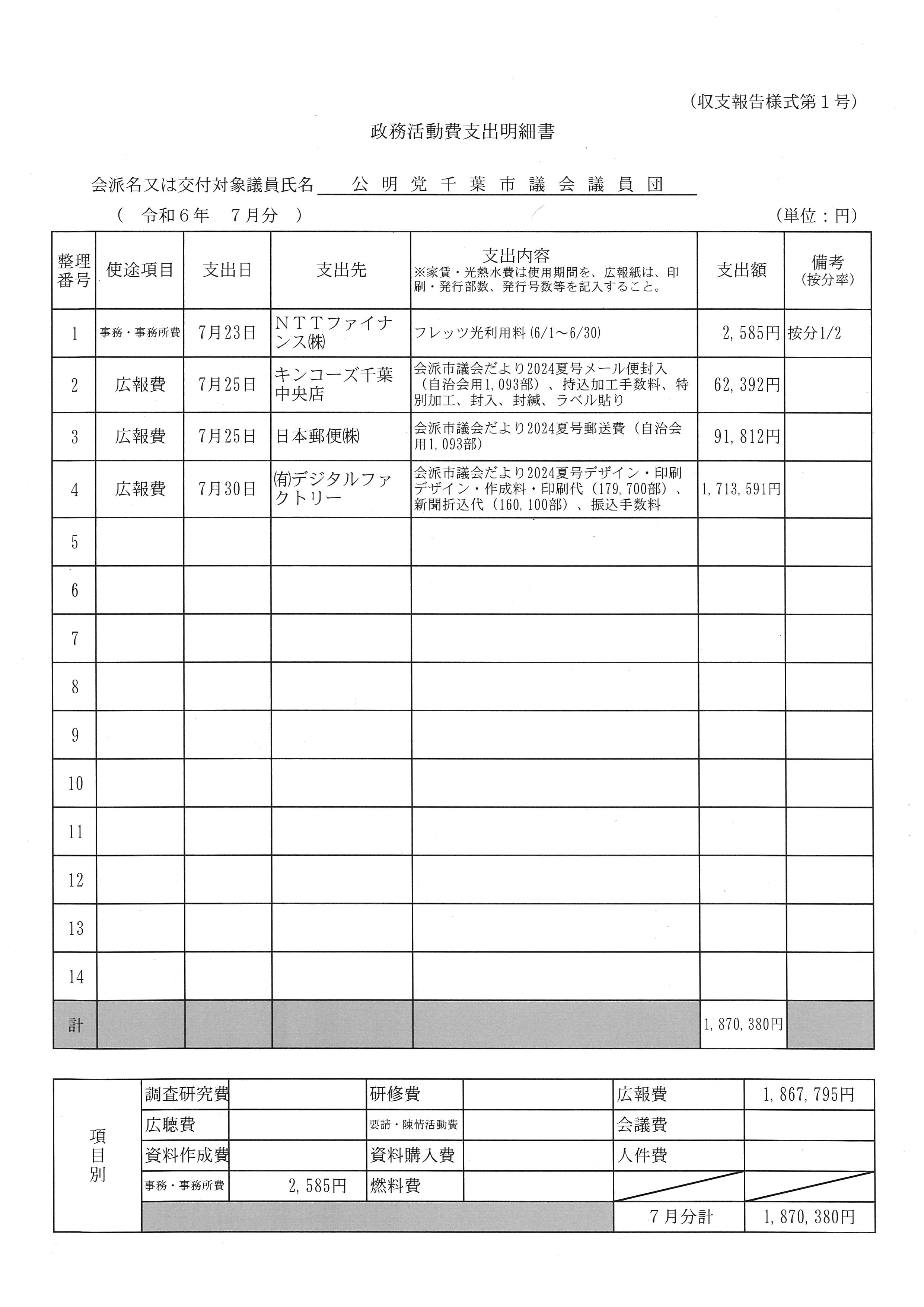 千葉市議会トップページ > 広報・情報公開 > 政務活動費 > 令和6年度交付分(政務活動費収支報告書)