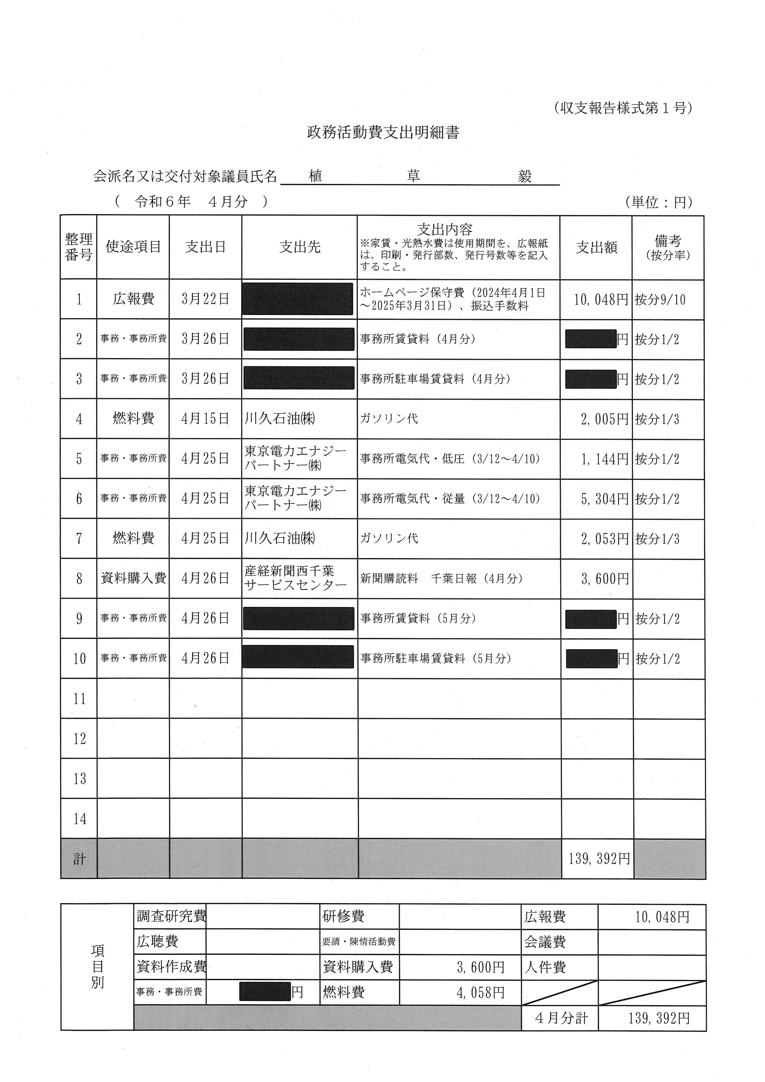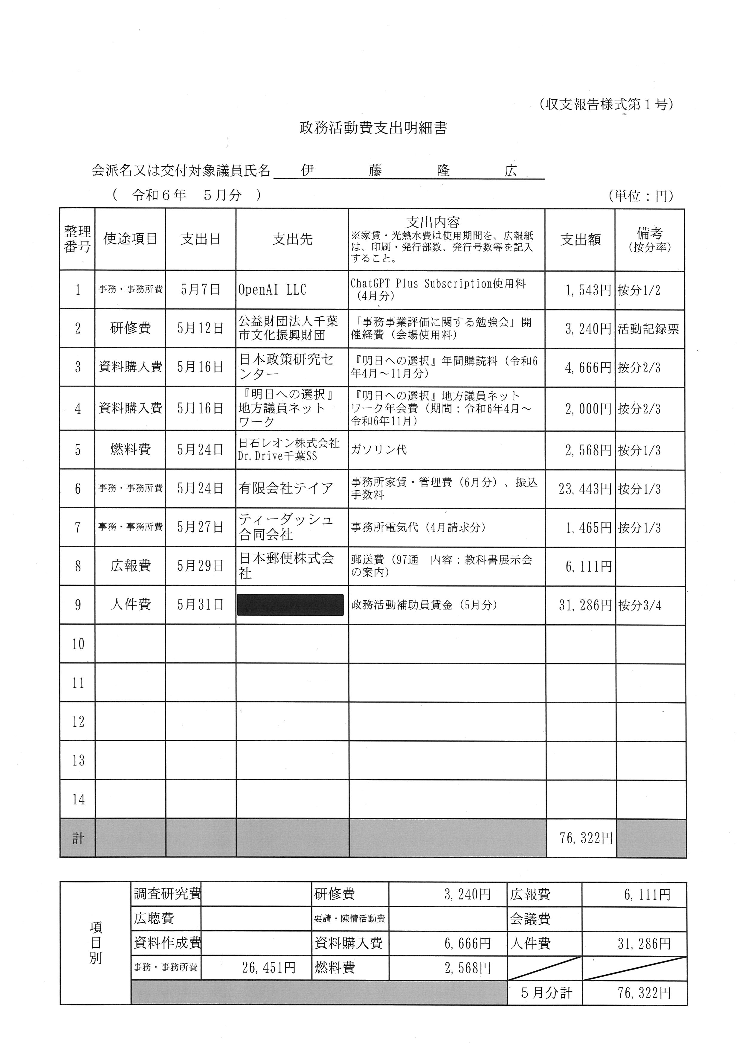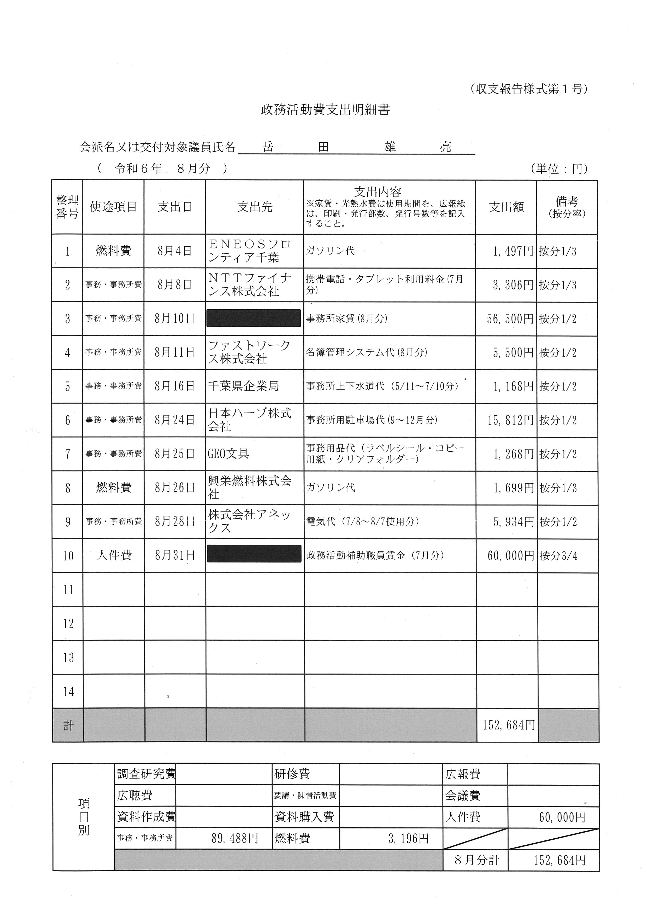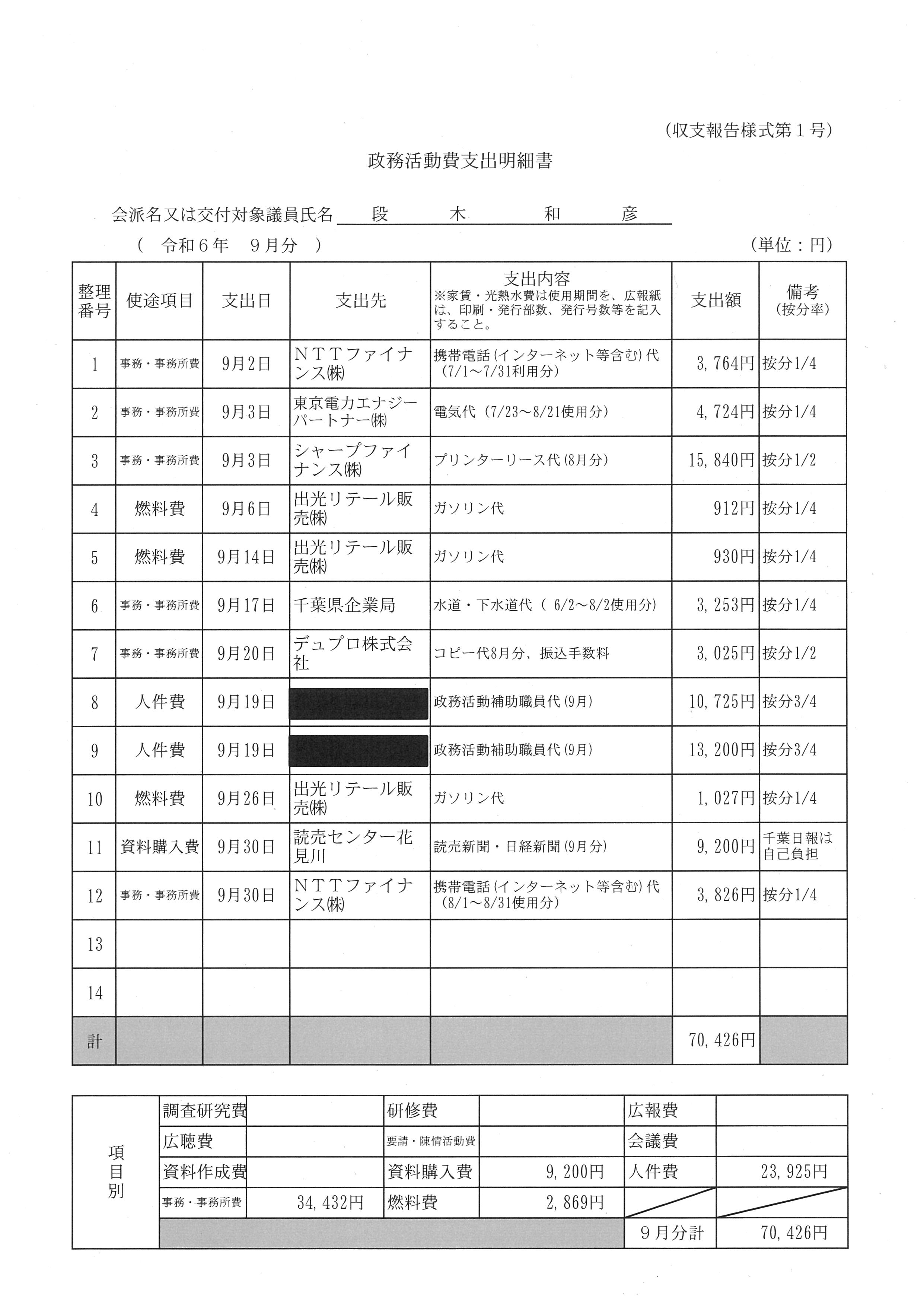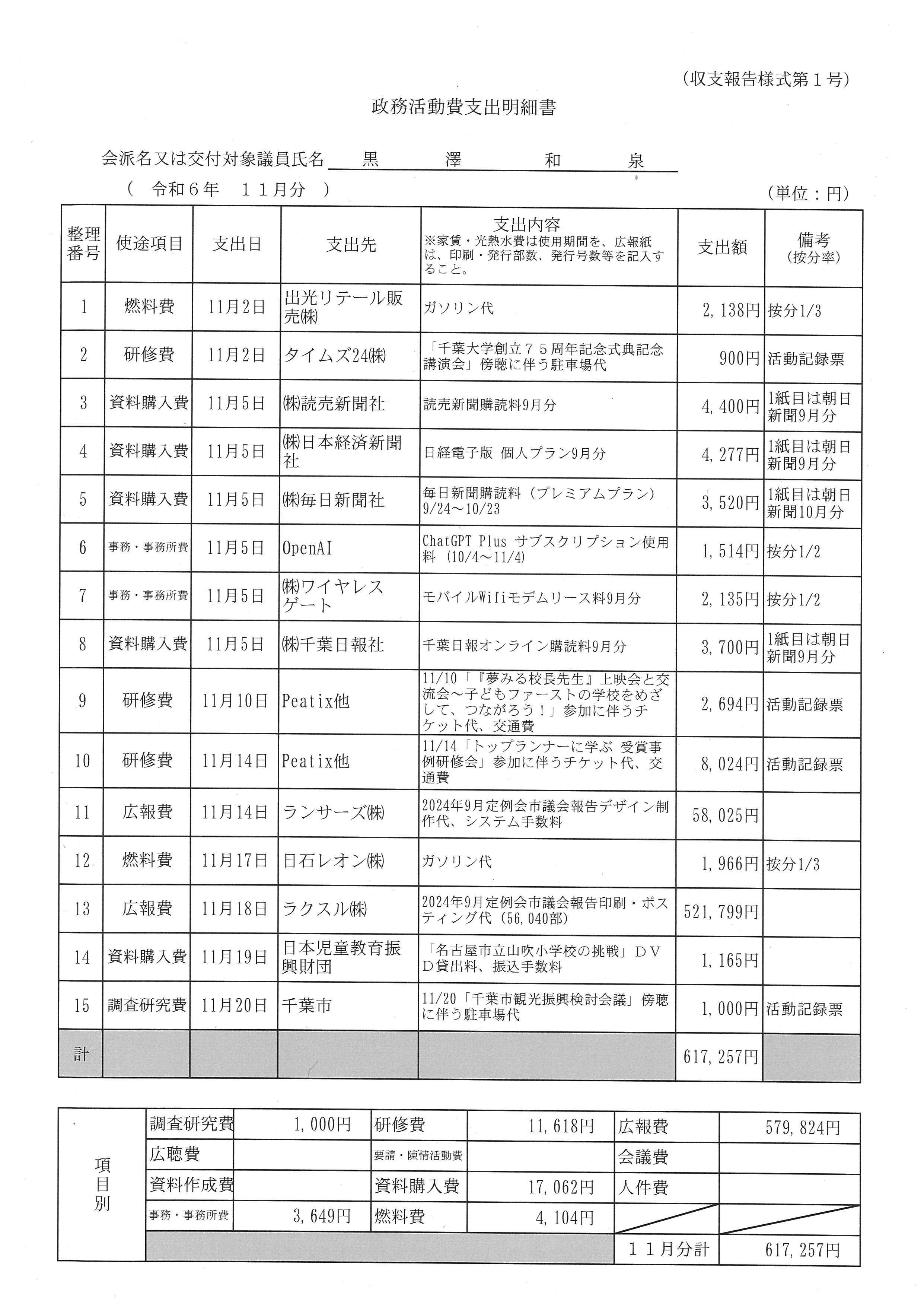 千葉市議会トップページ > 広報・情報公開 > 政務活動費 > 令和6年度交付分(政務活動費収支報告書)