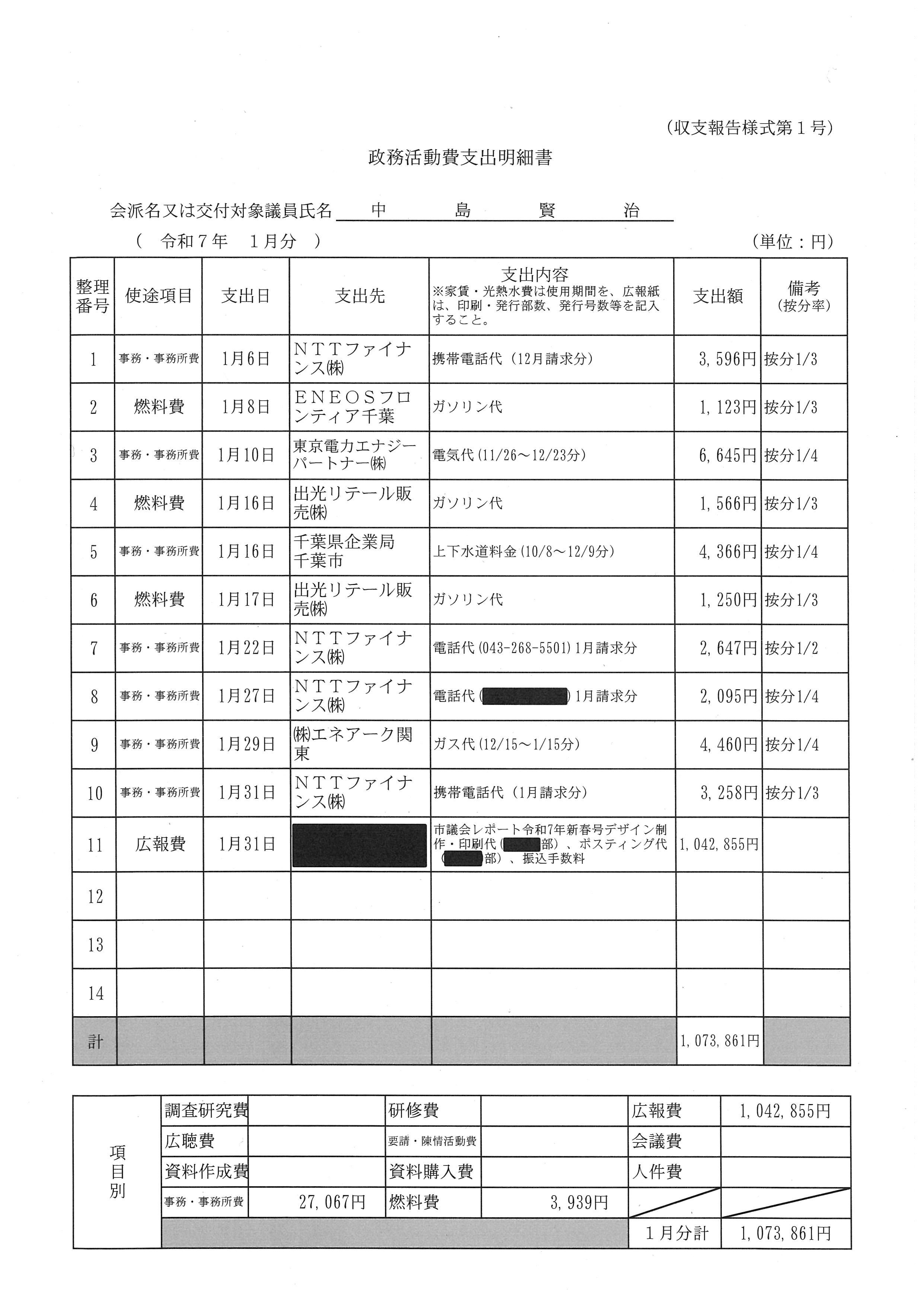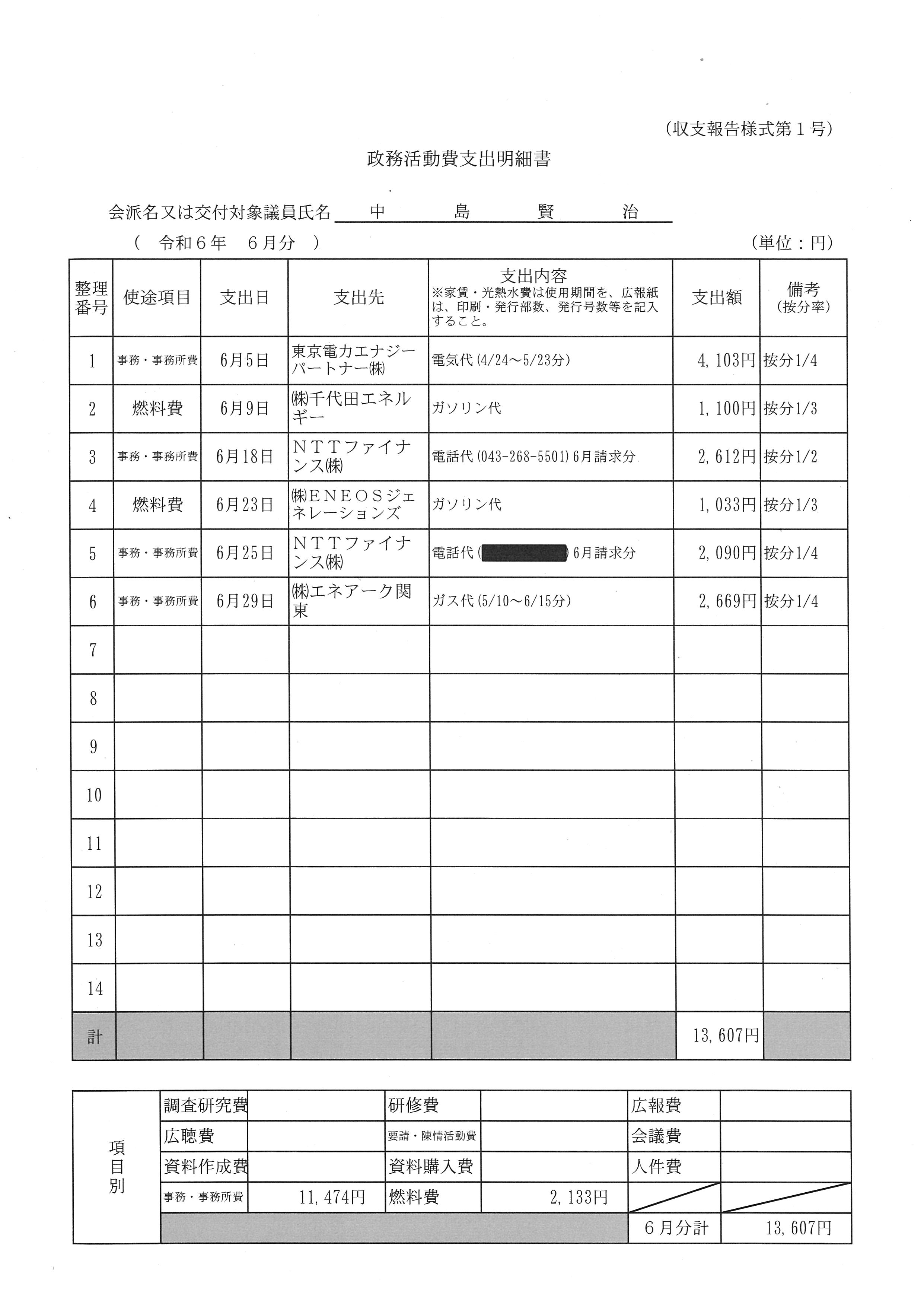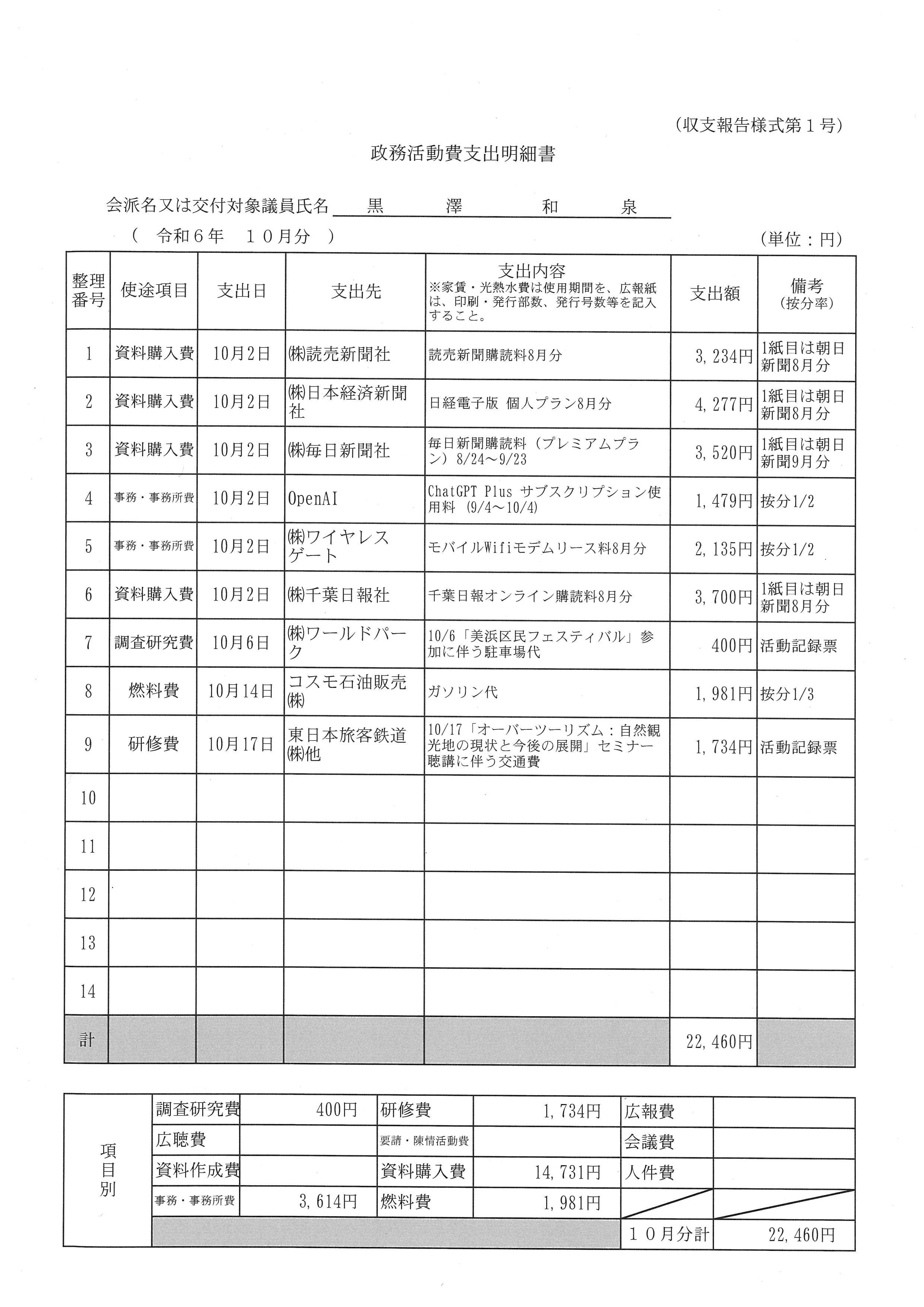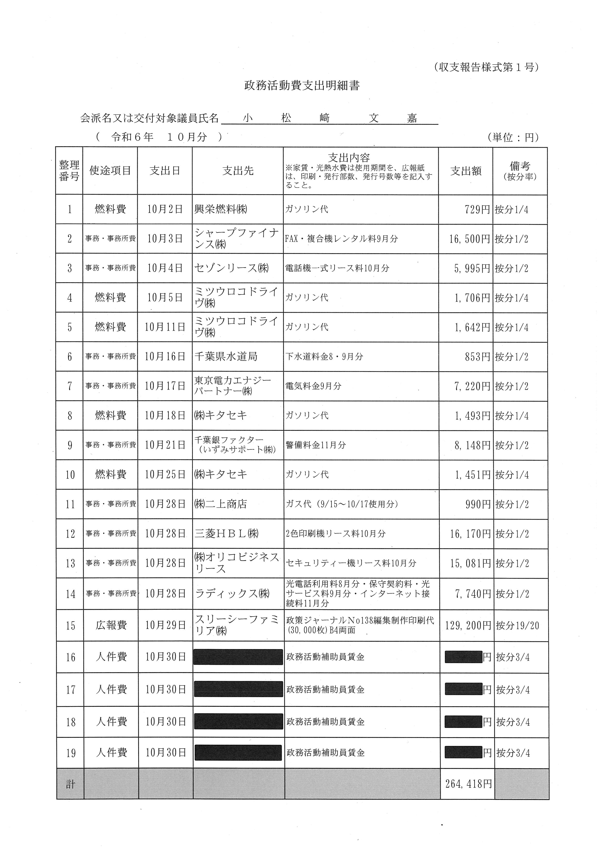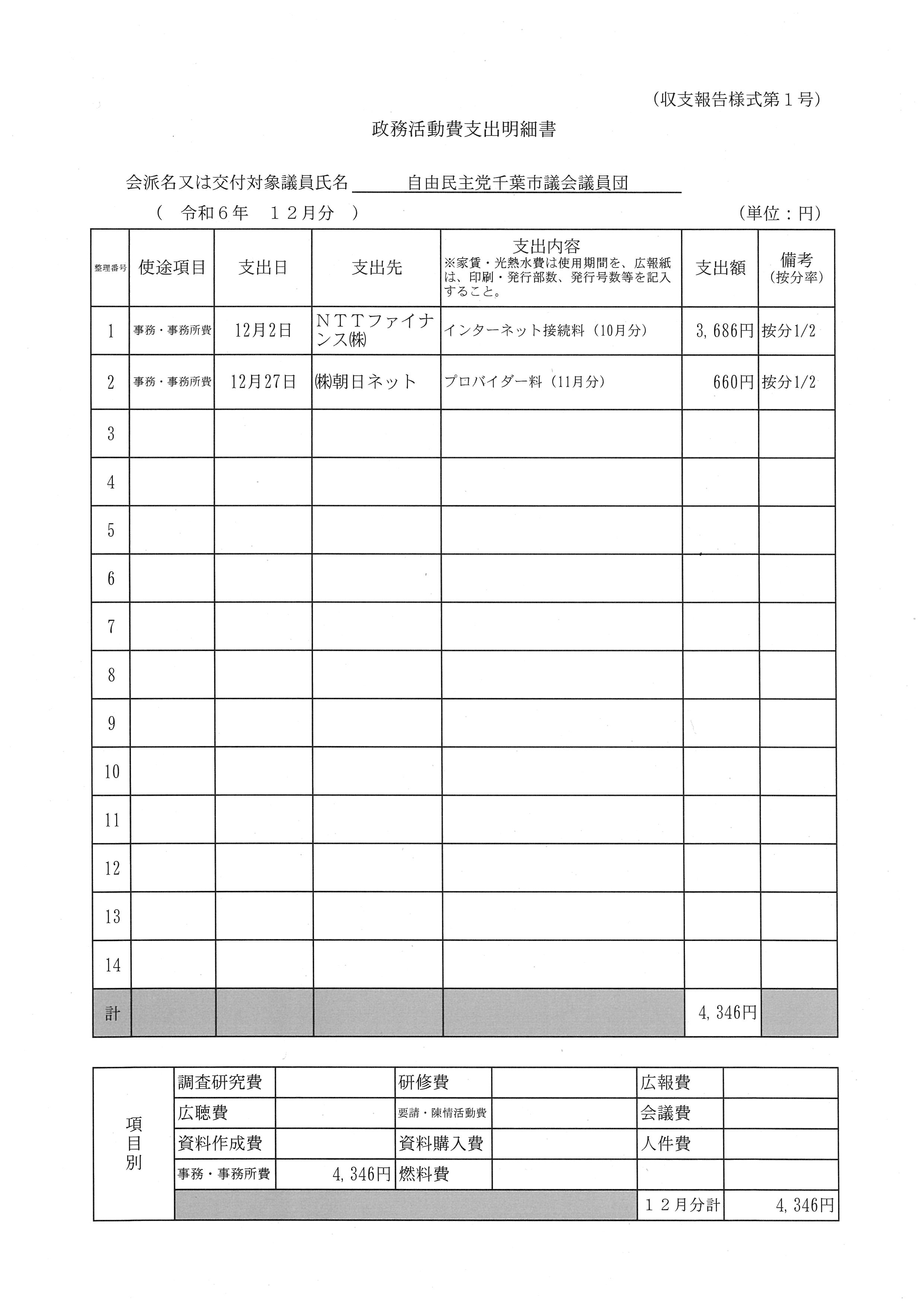 千葉市議会トップページ > 広報・情報公開 > 政務活動費 > 令和6年度交付分(政務活動費収支報告書)