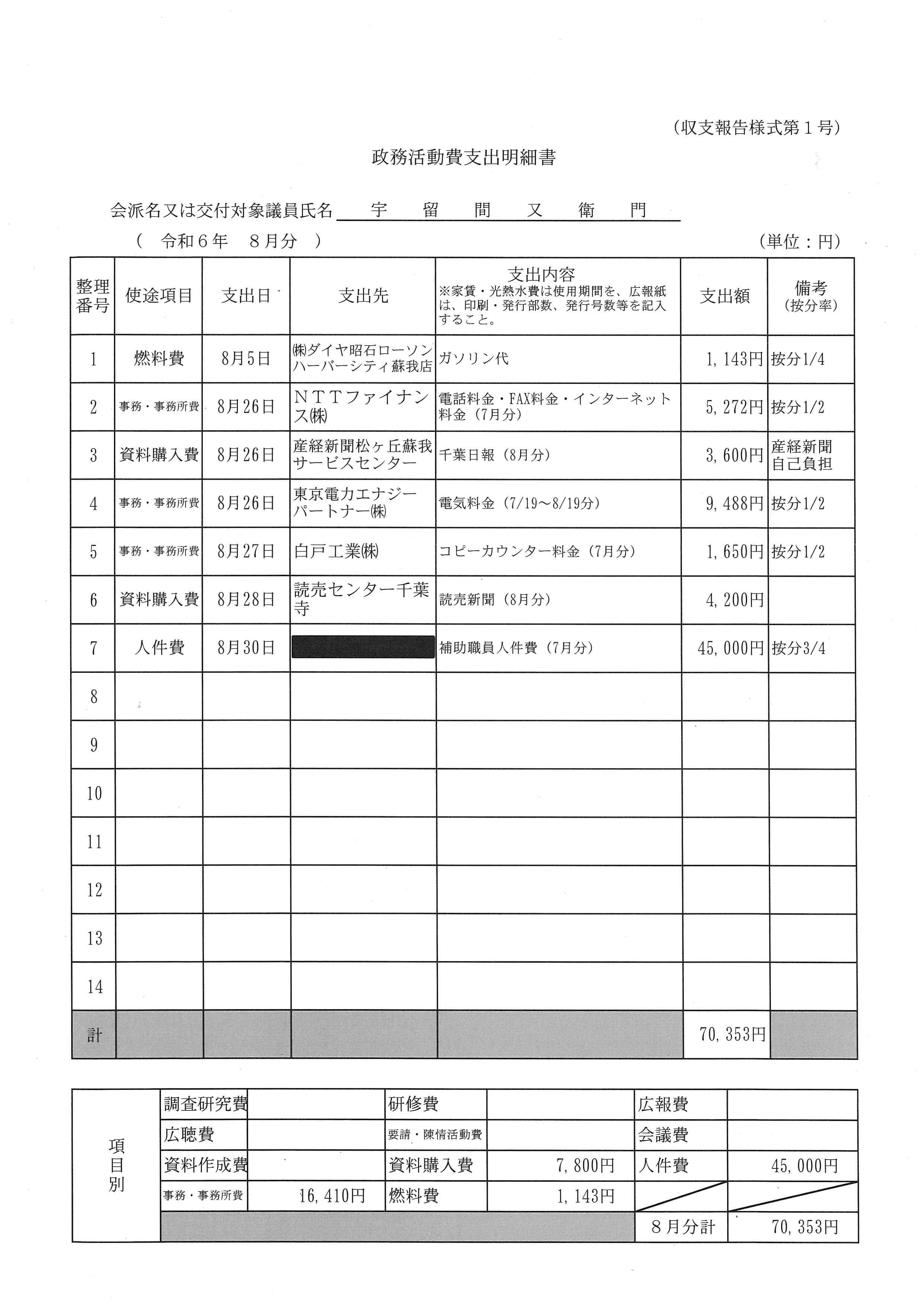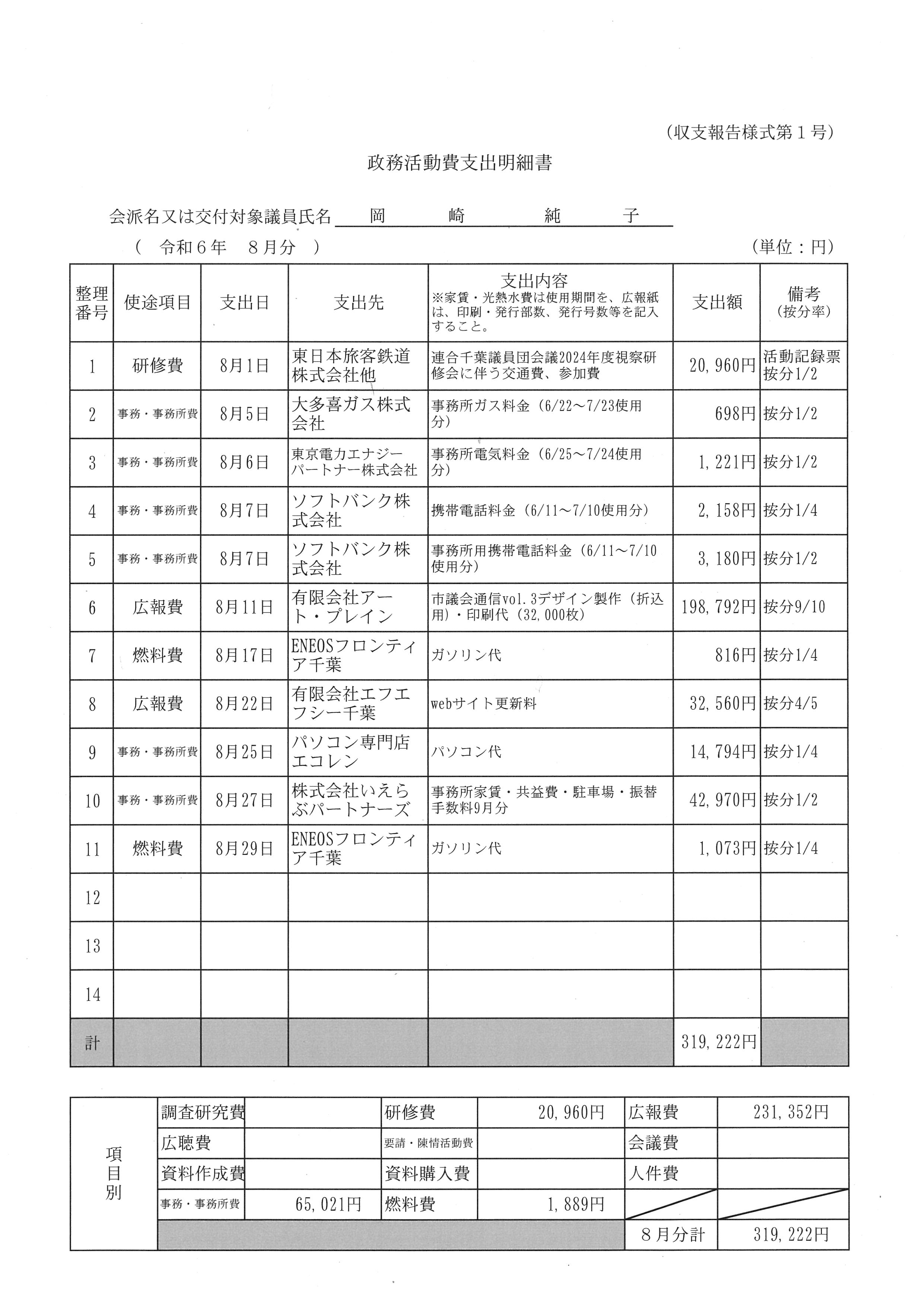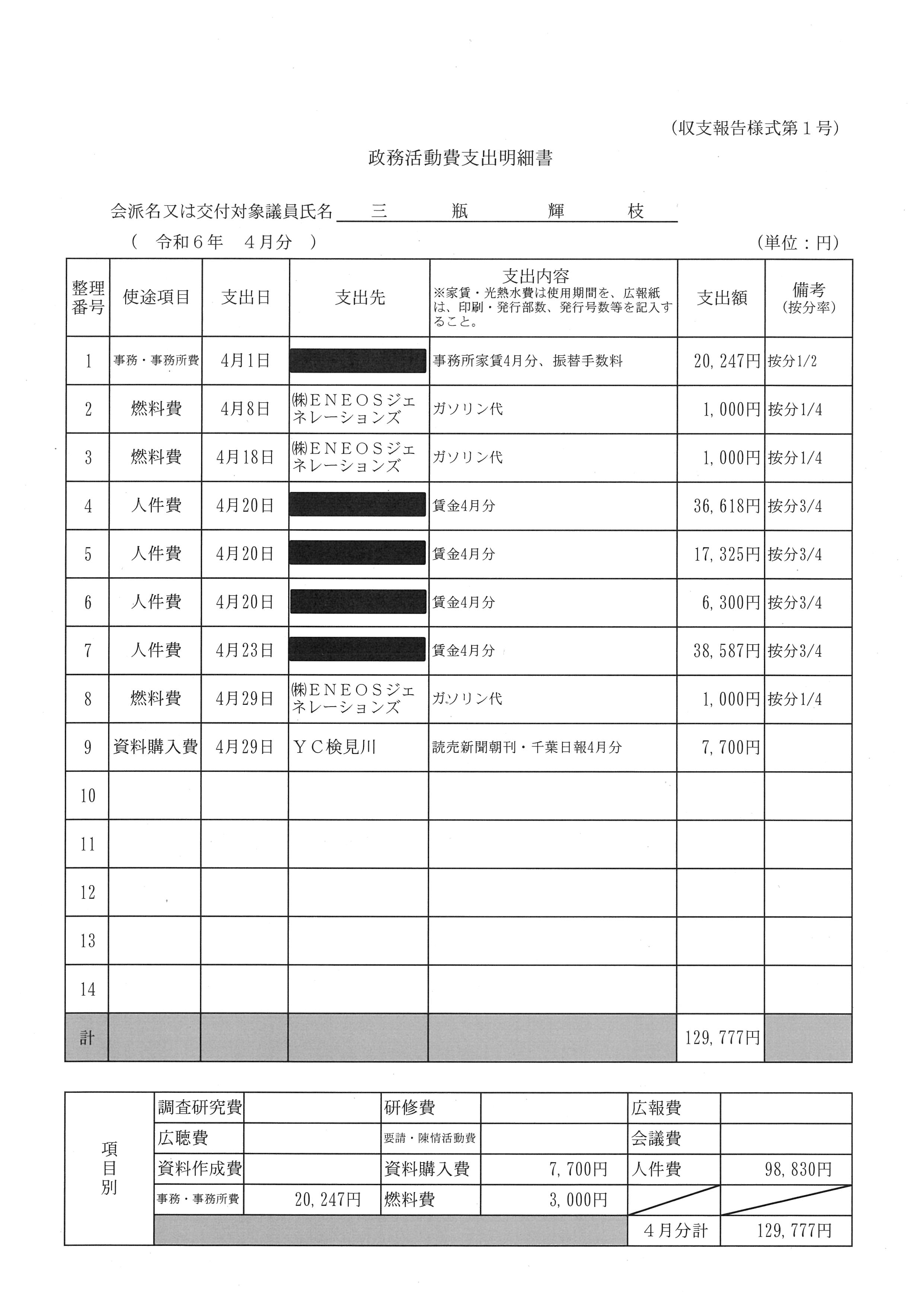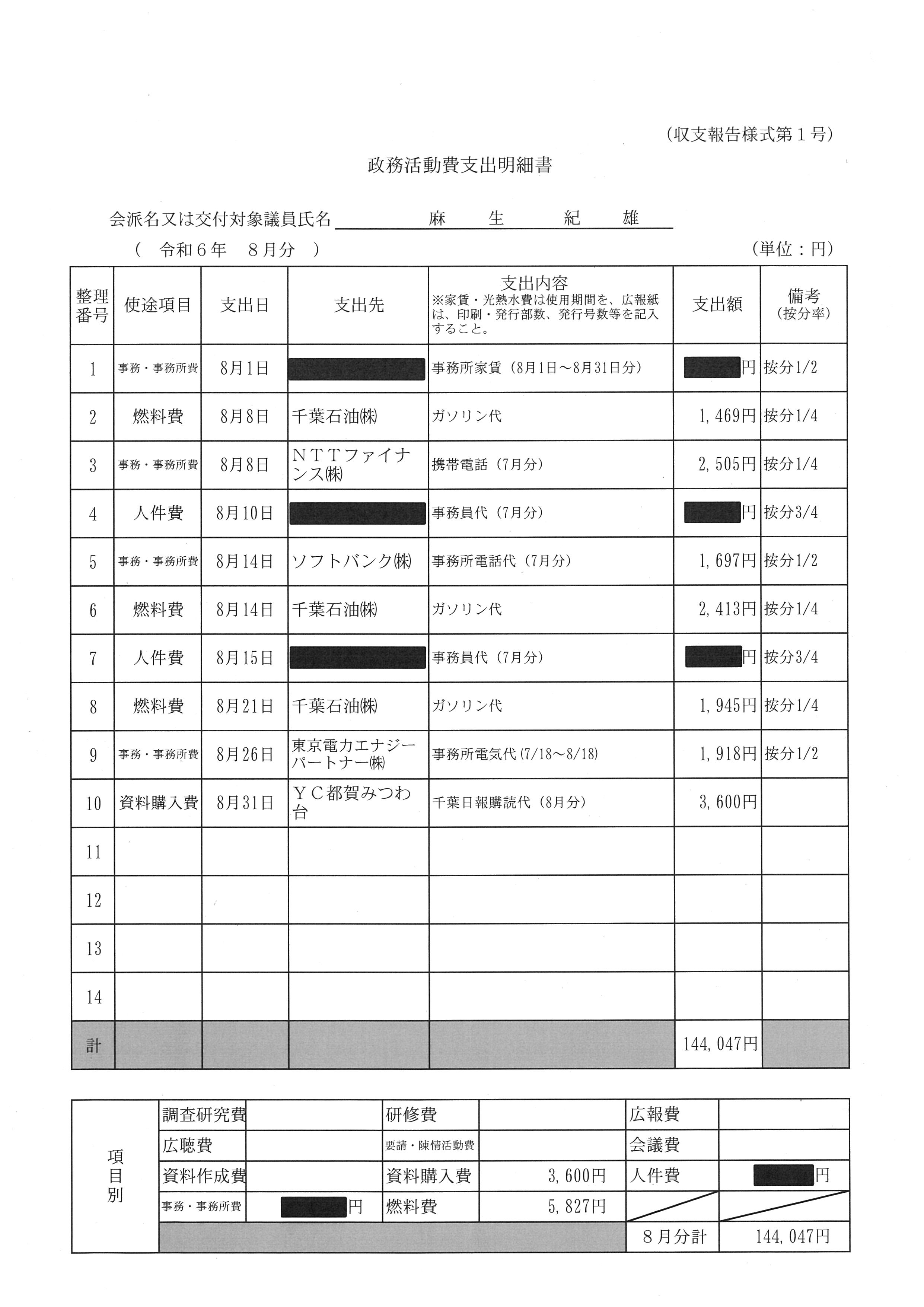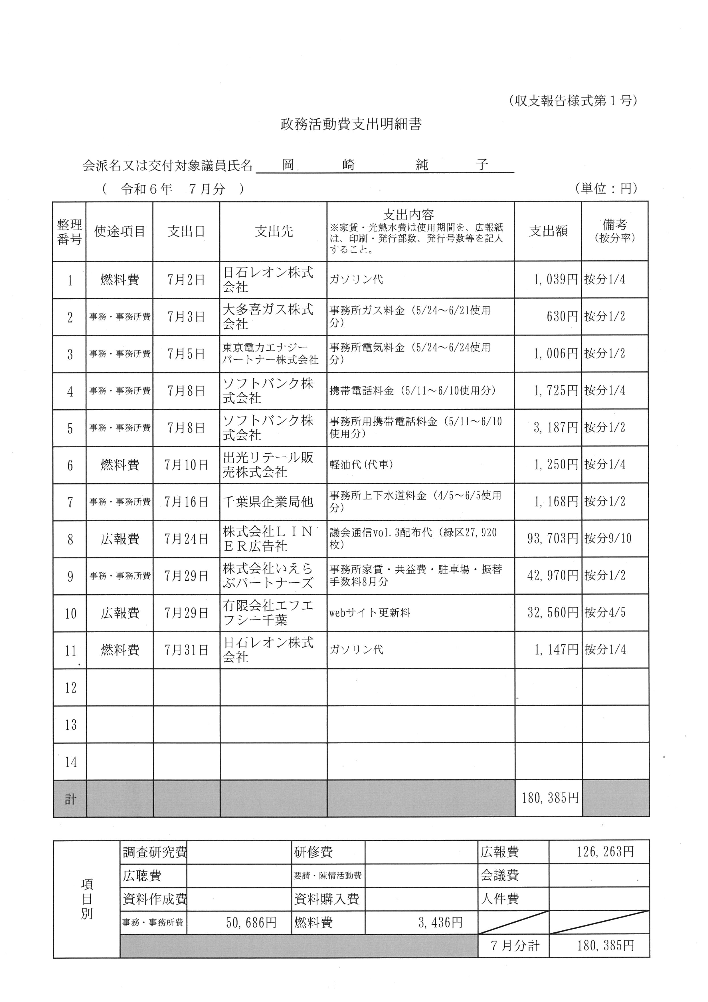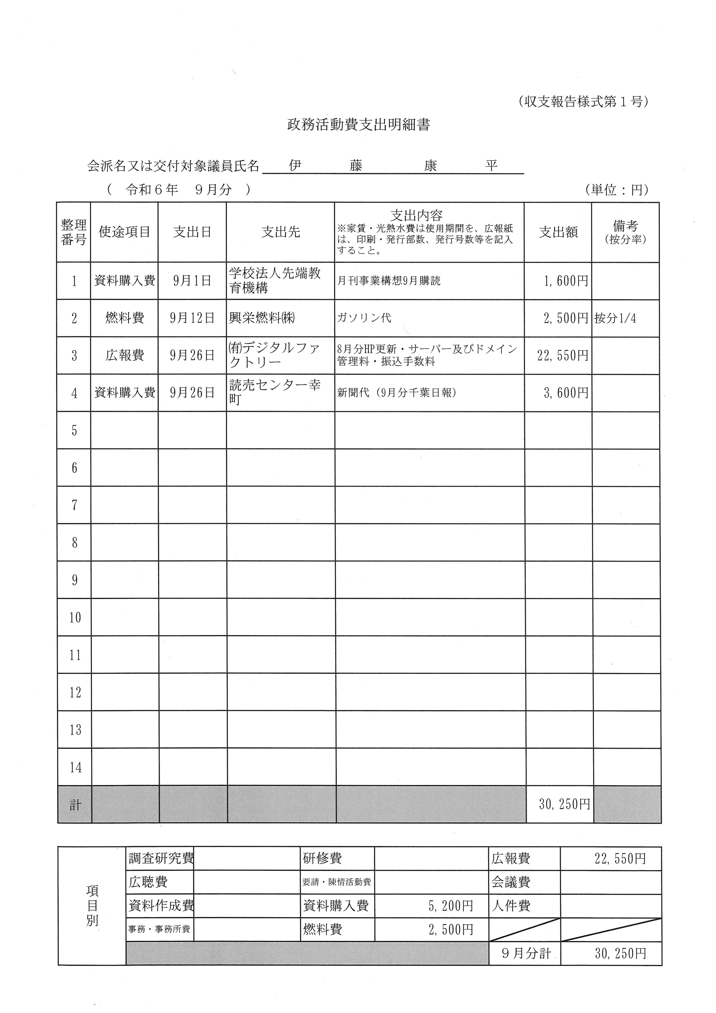 千葉市議会トップページ > 広報・情報公開 > 政務活動費 > 令和6年度交付分(政務活動費収支報告書)