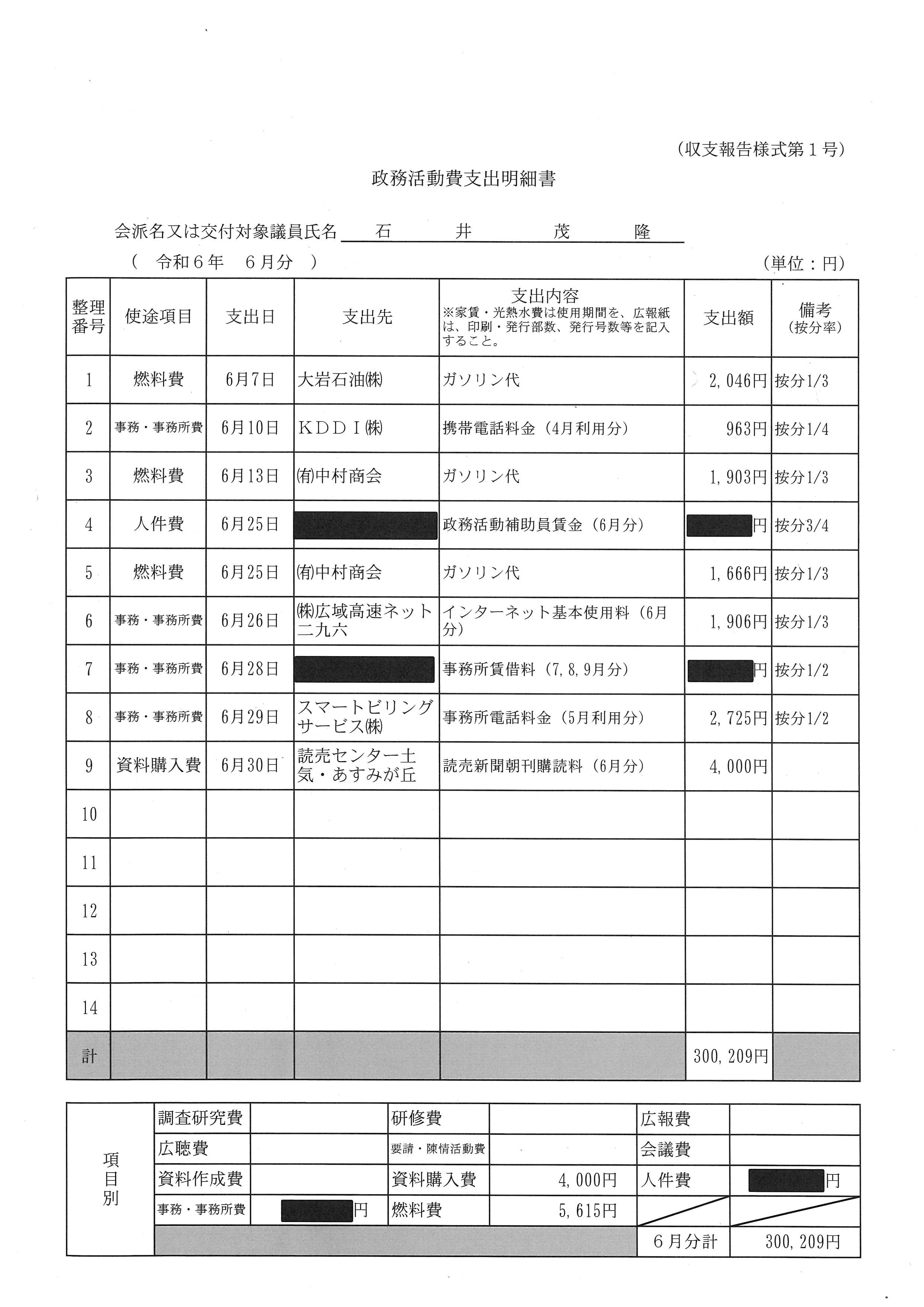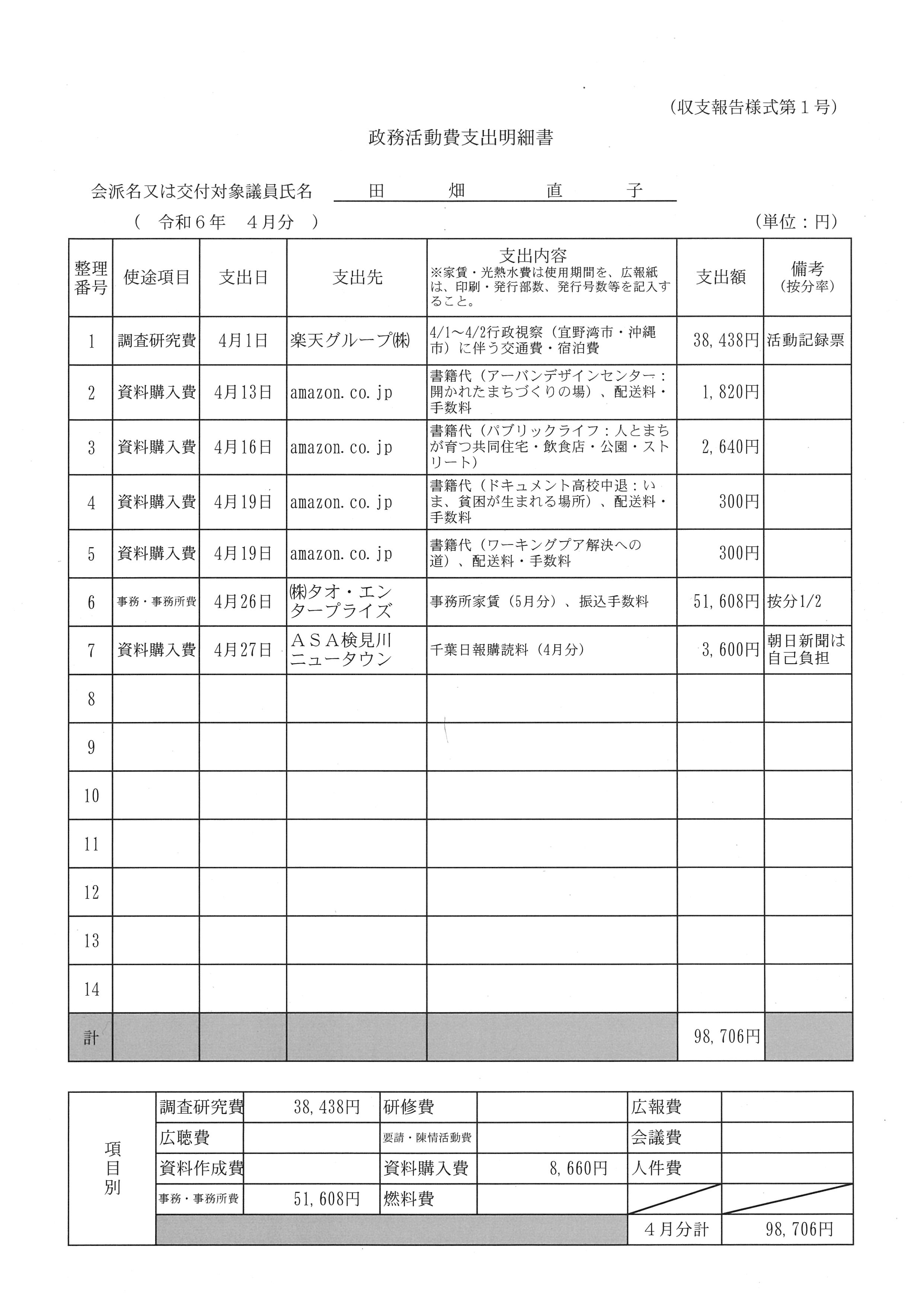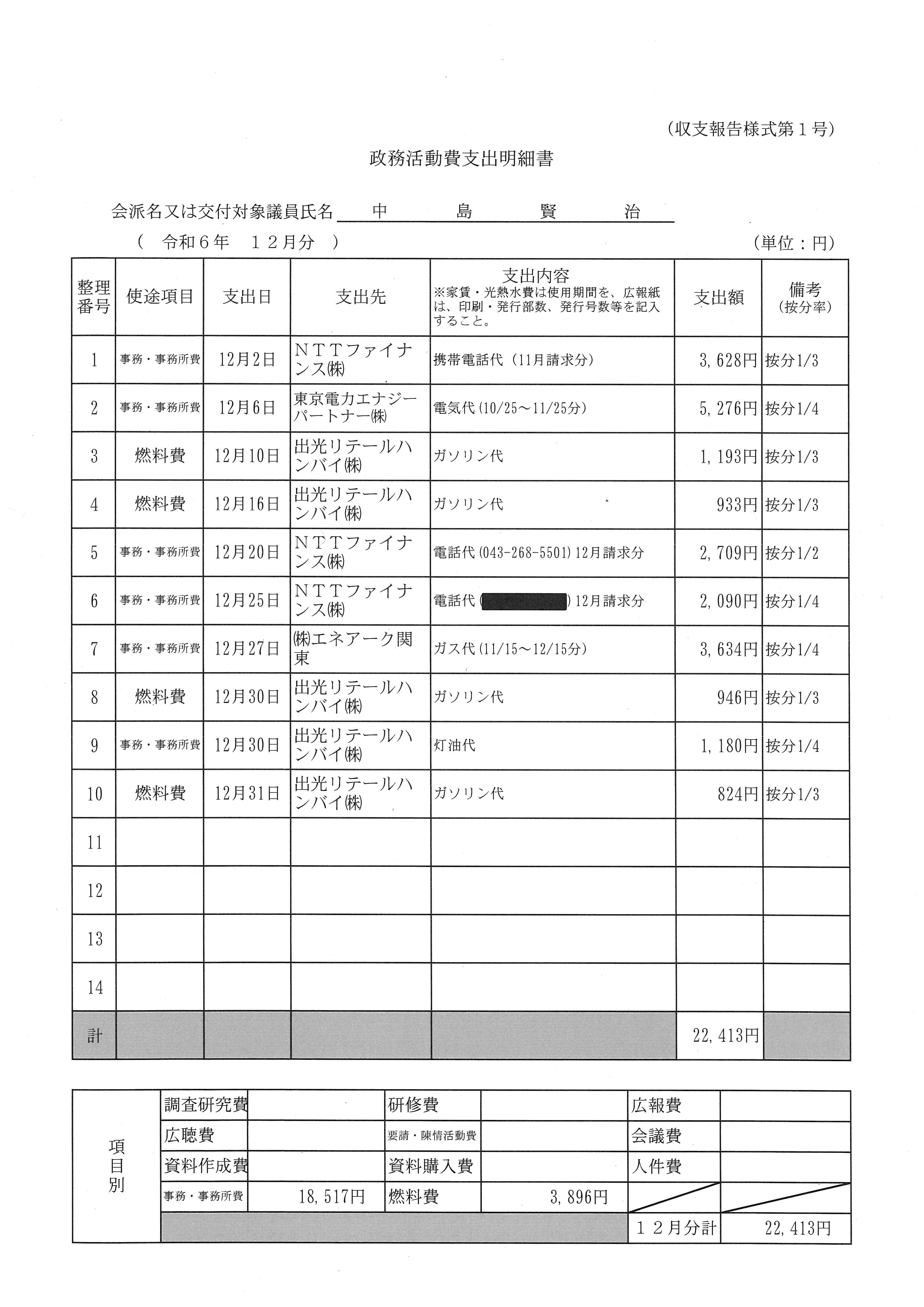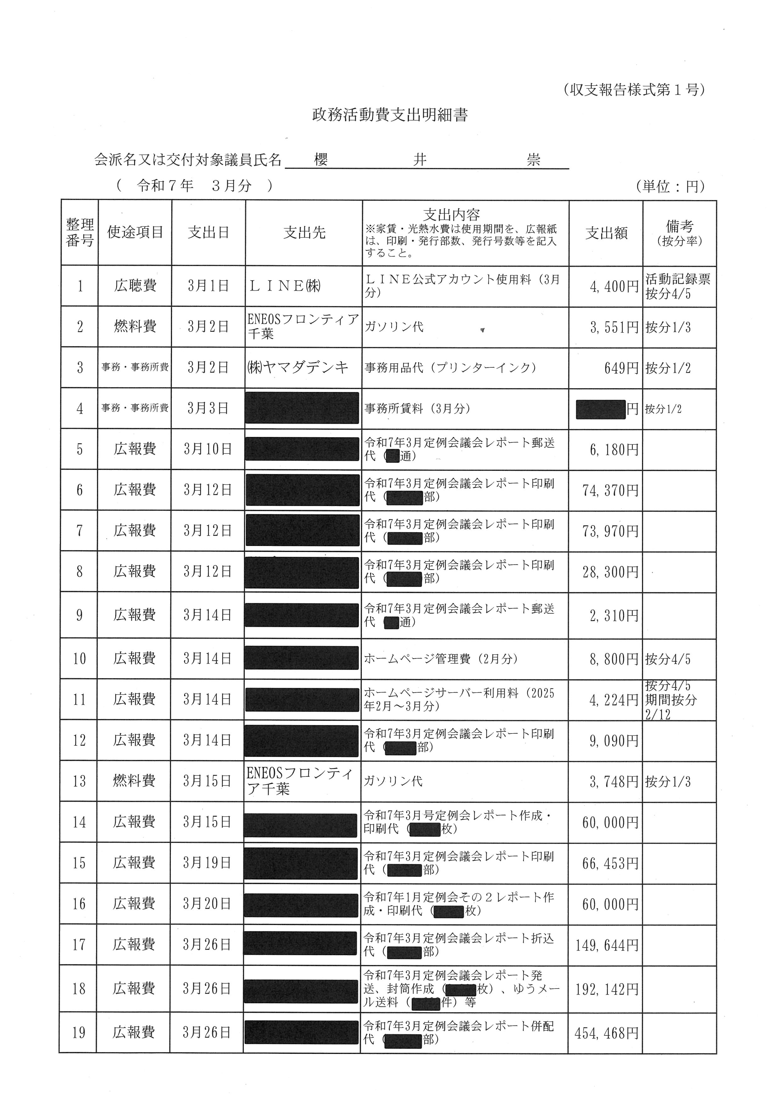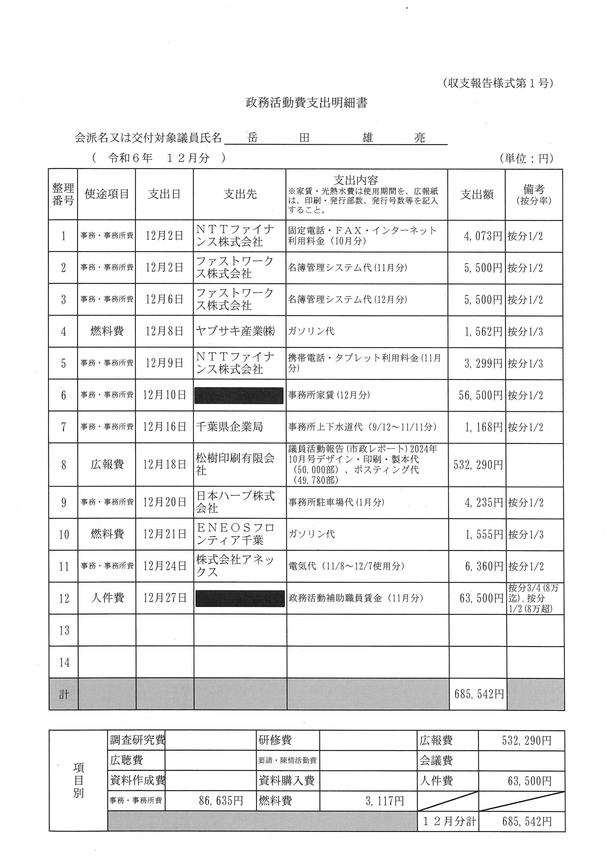 千葉市議会トップページ > 広報・情報公開 > 政務活動費 > 令和6年度交付分(政務活動費収支報告書)