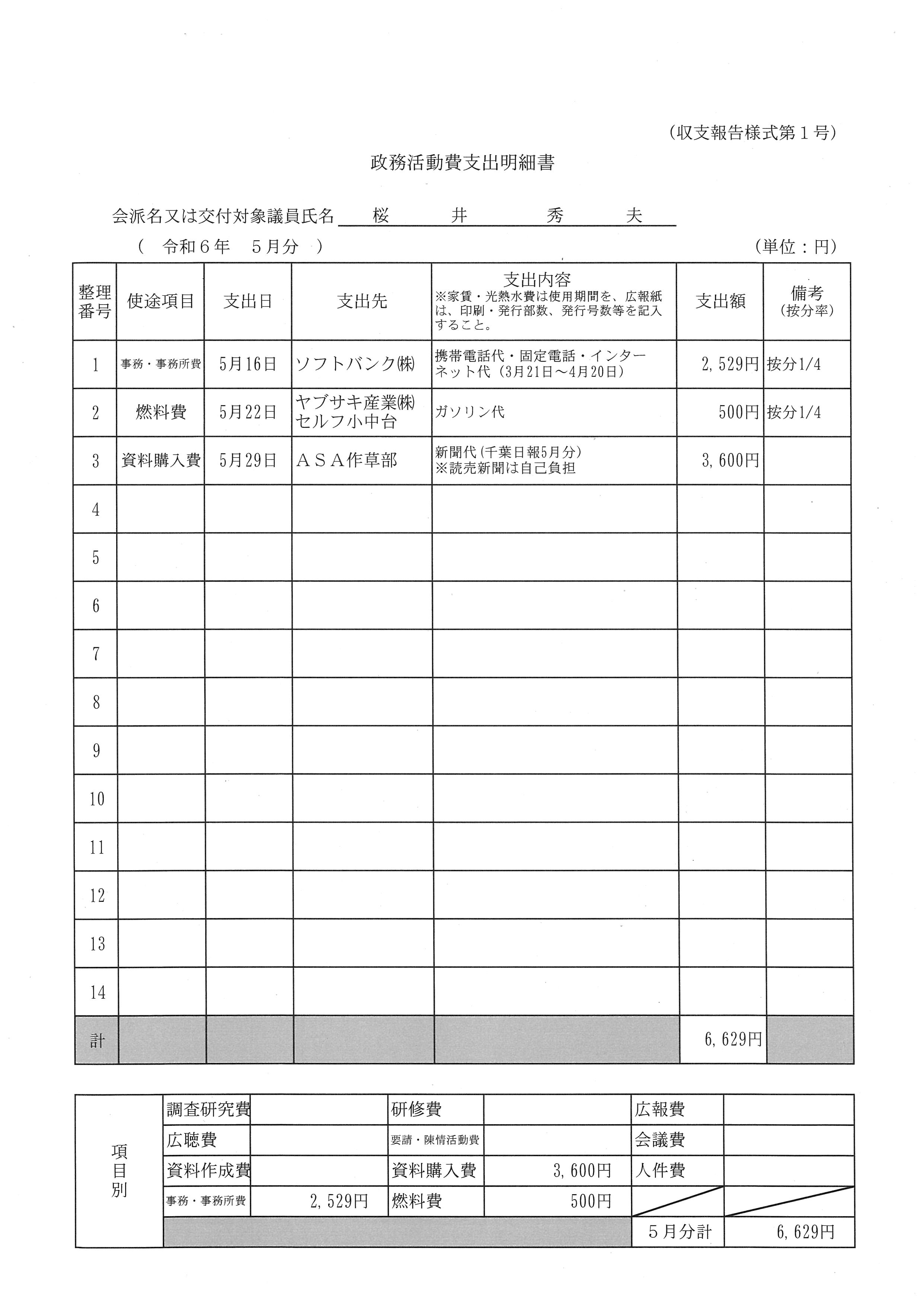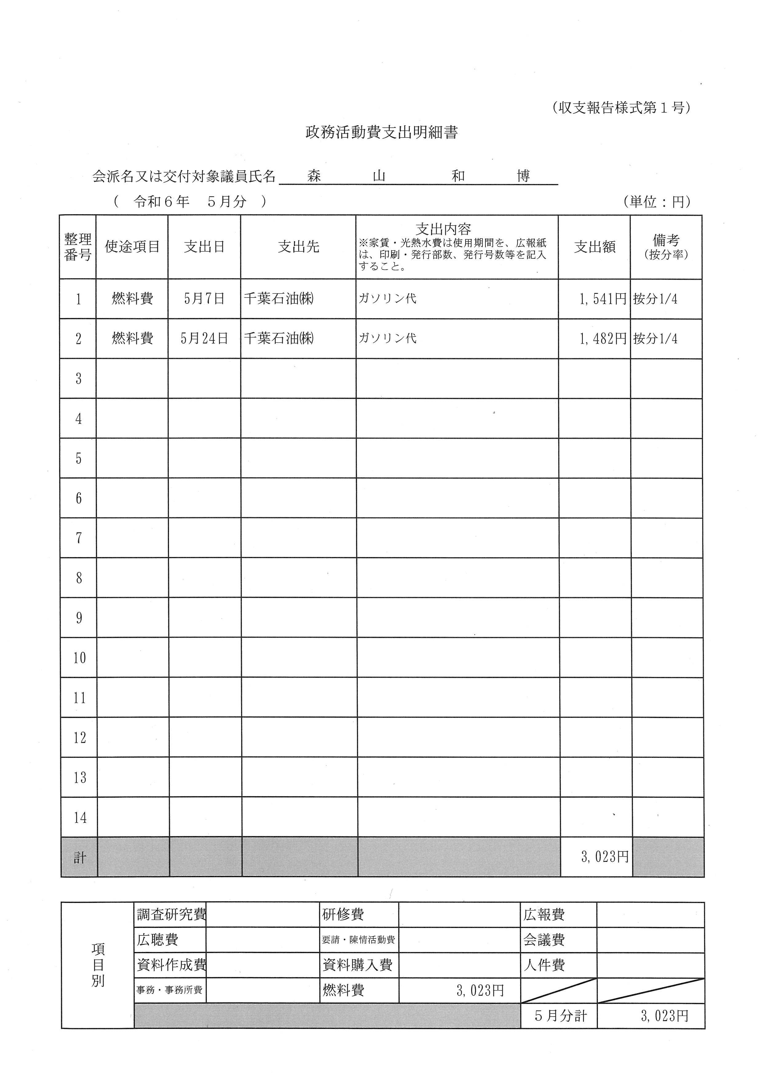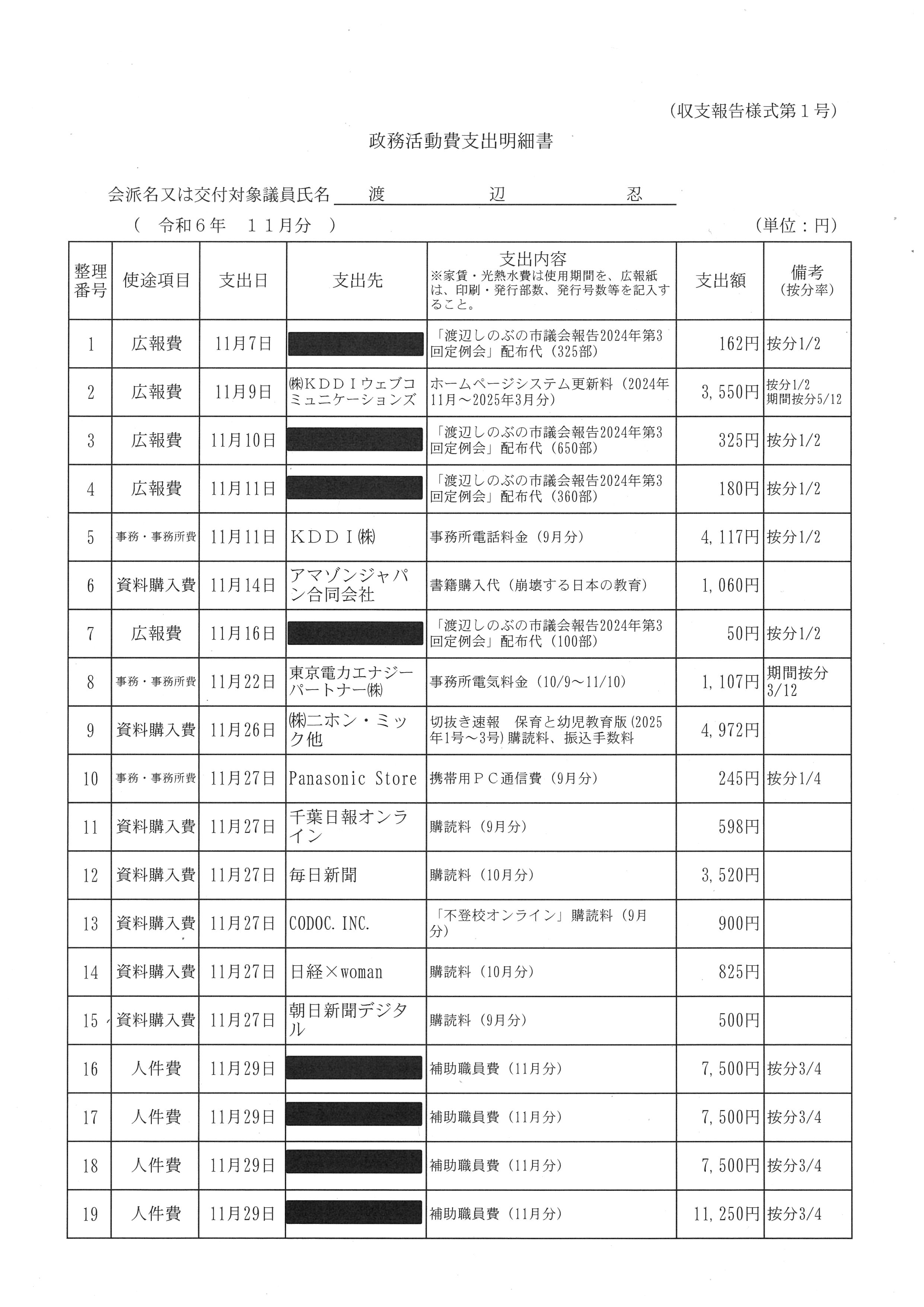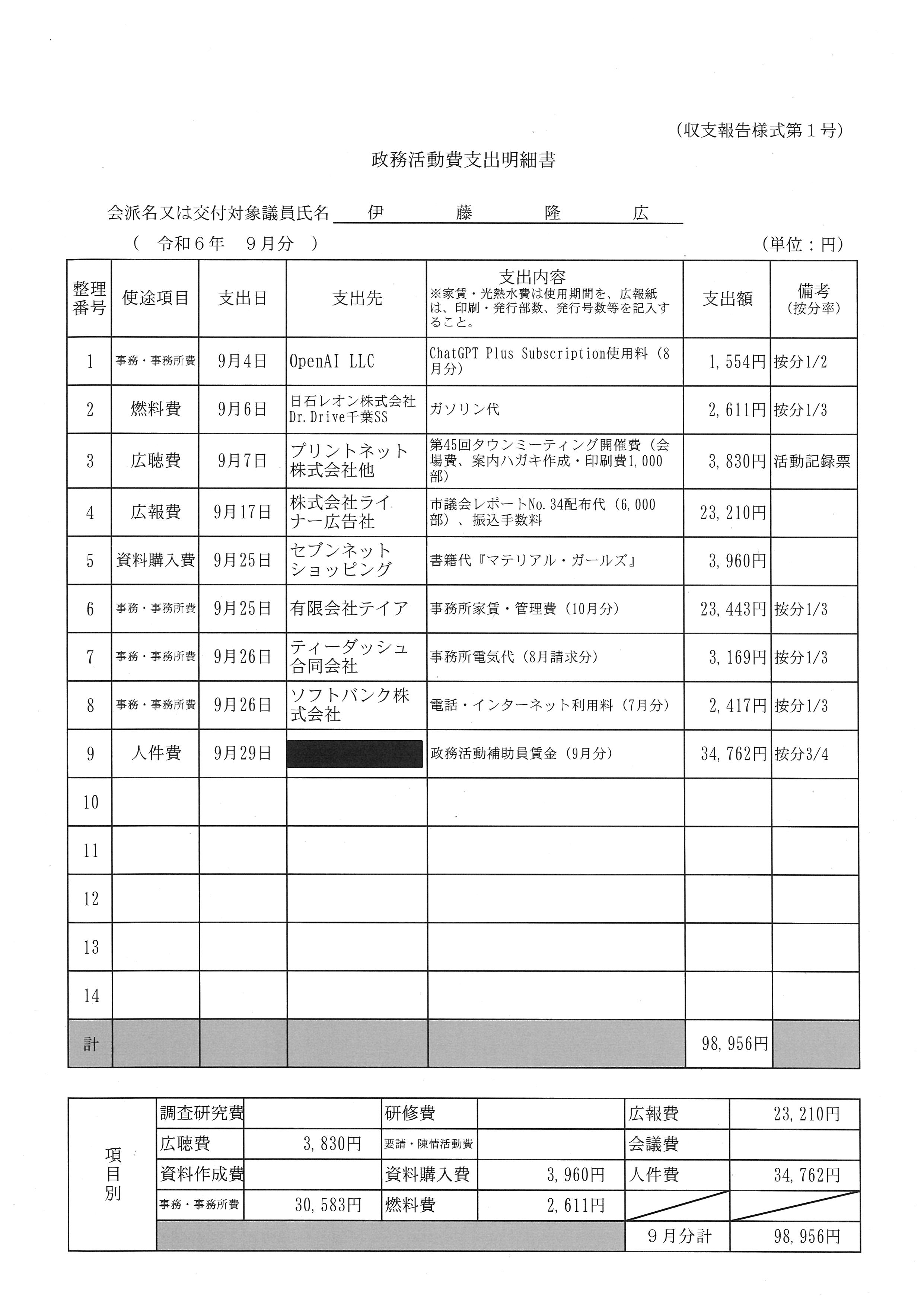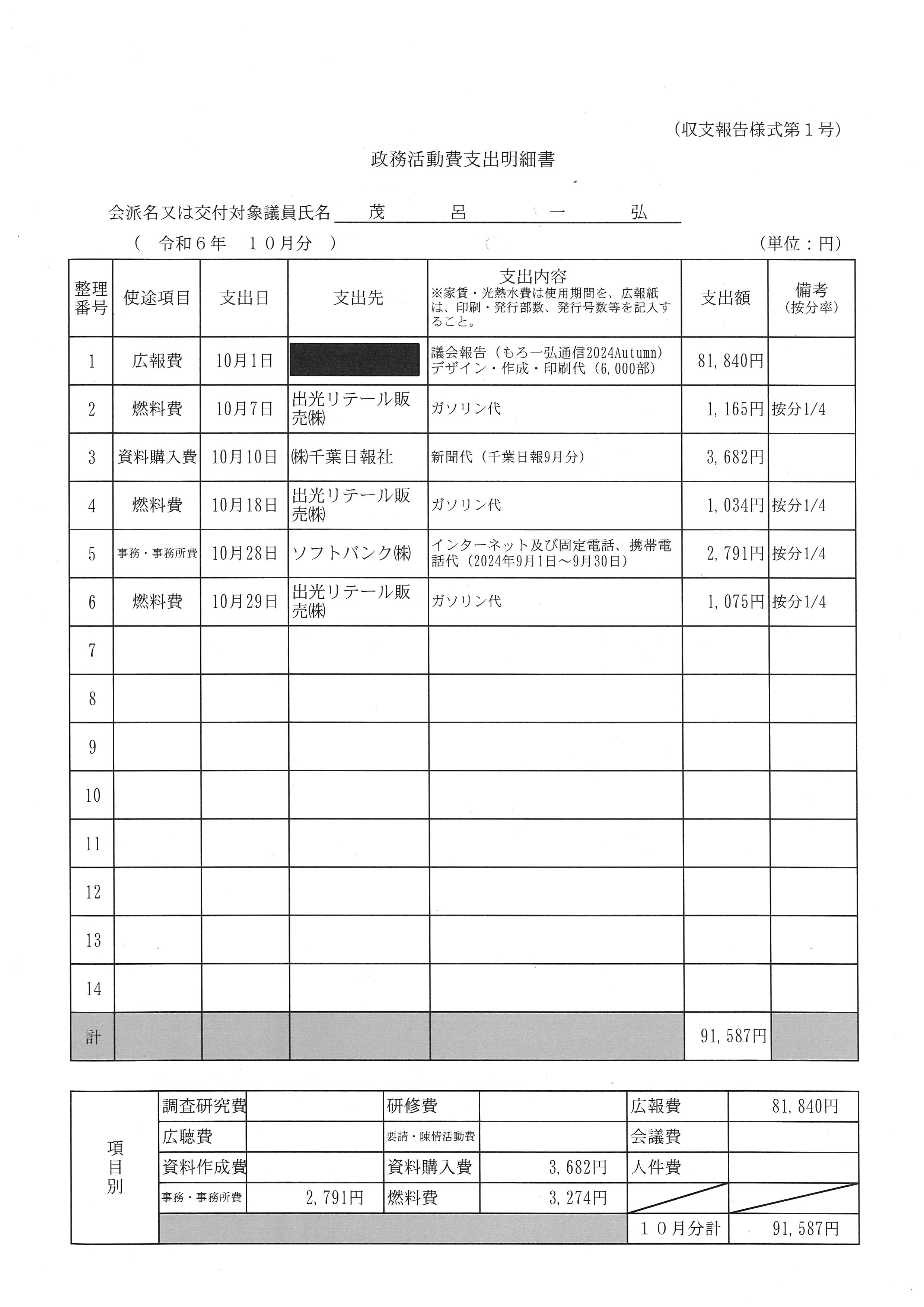 千葉市議会トップページ > 広報・情報公開 > 政務活動費 > 令和6年度交付分(政務活動費収支報告書)