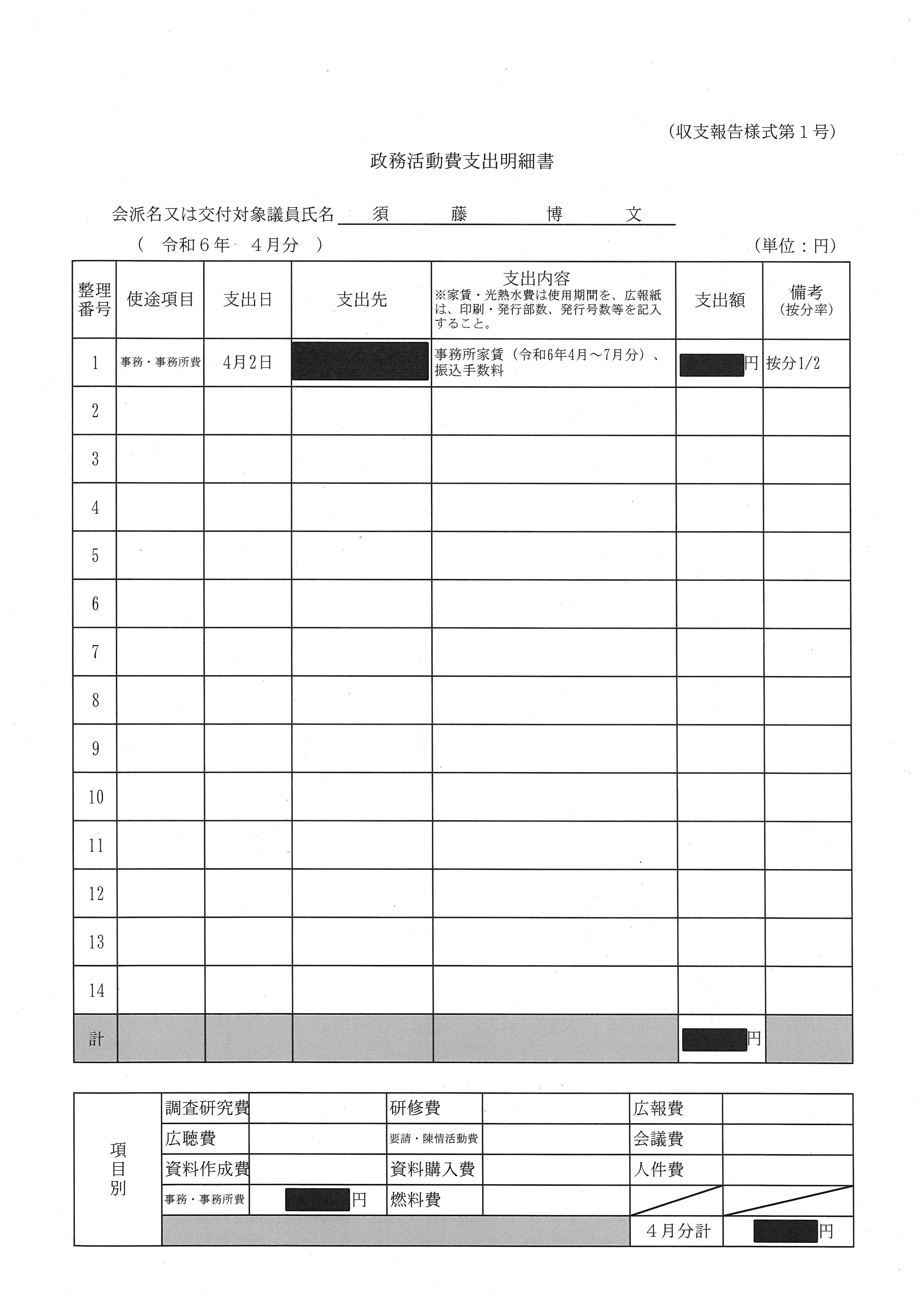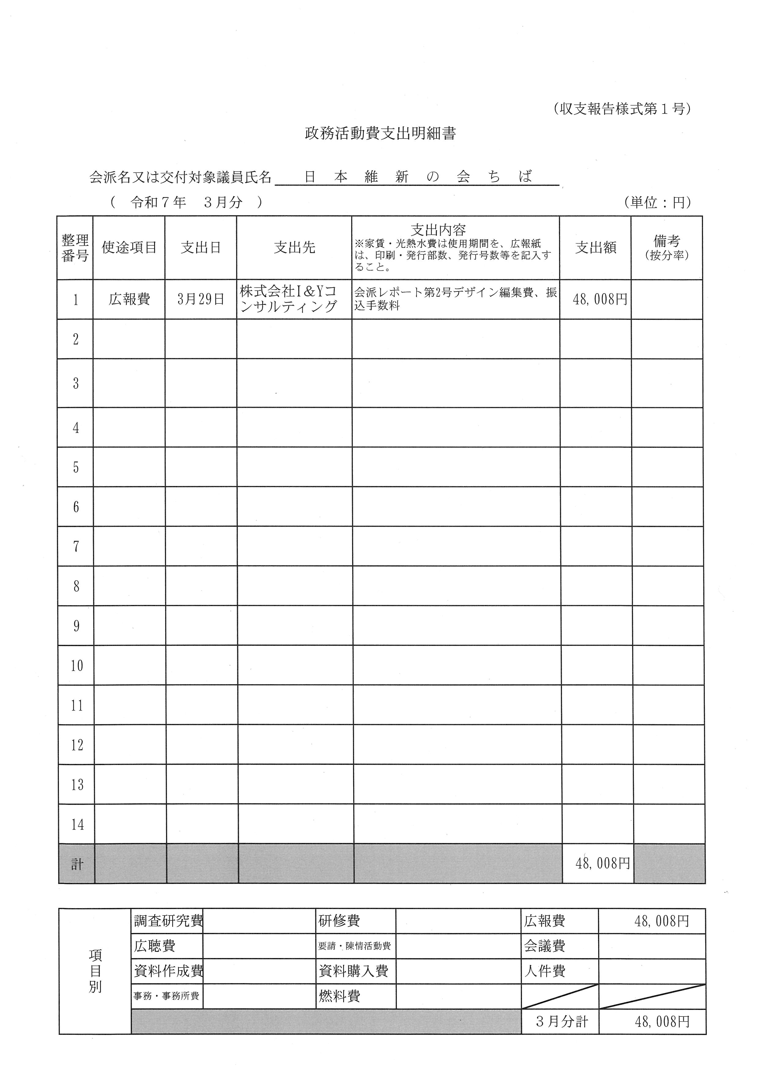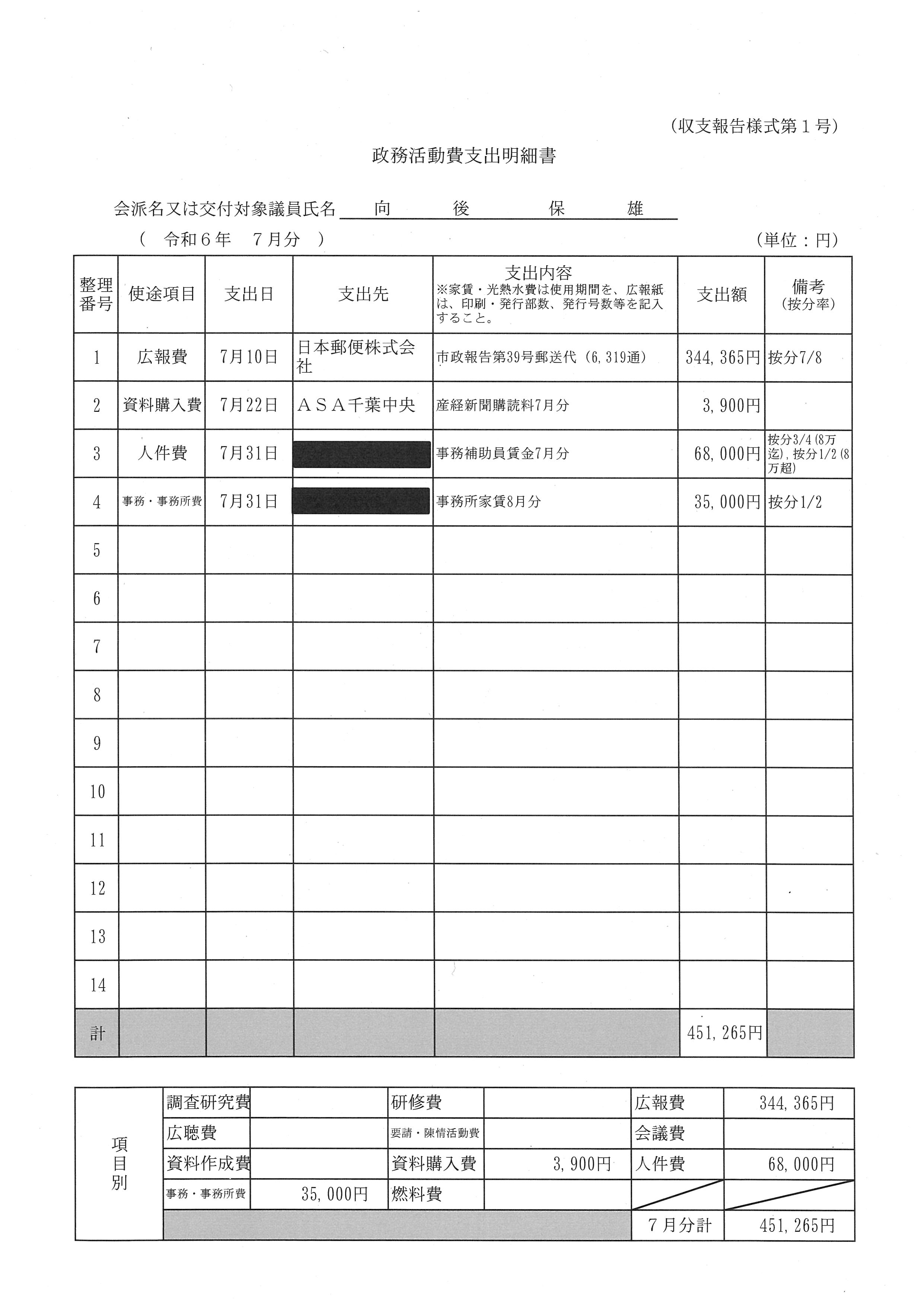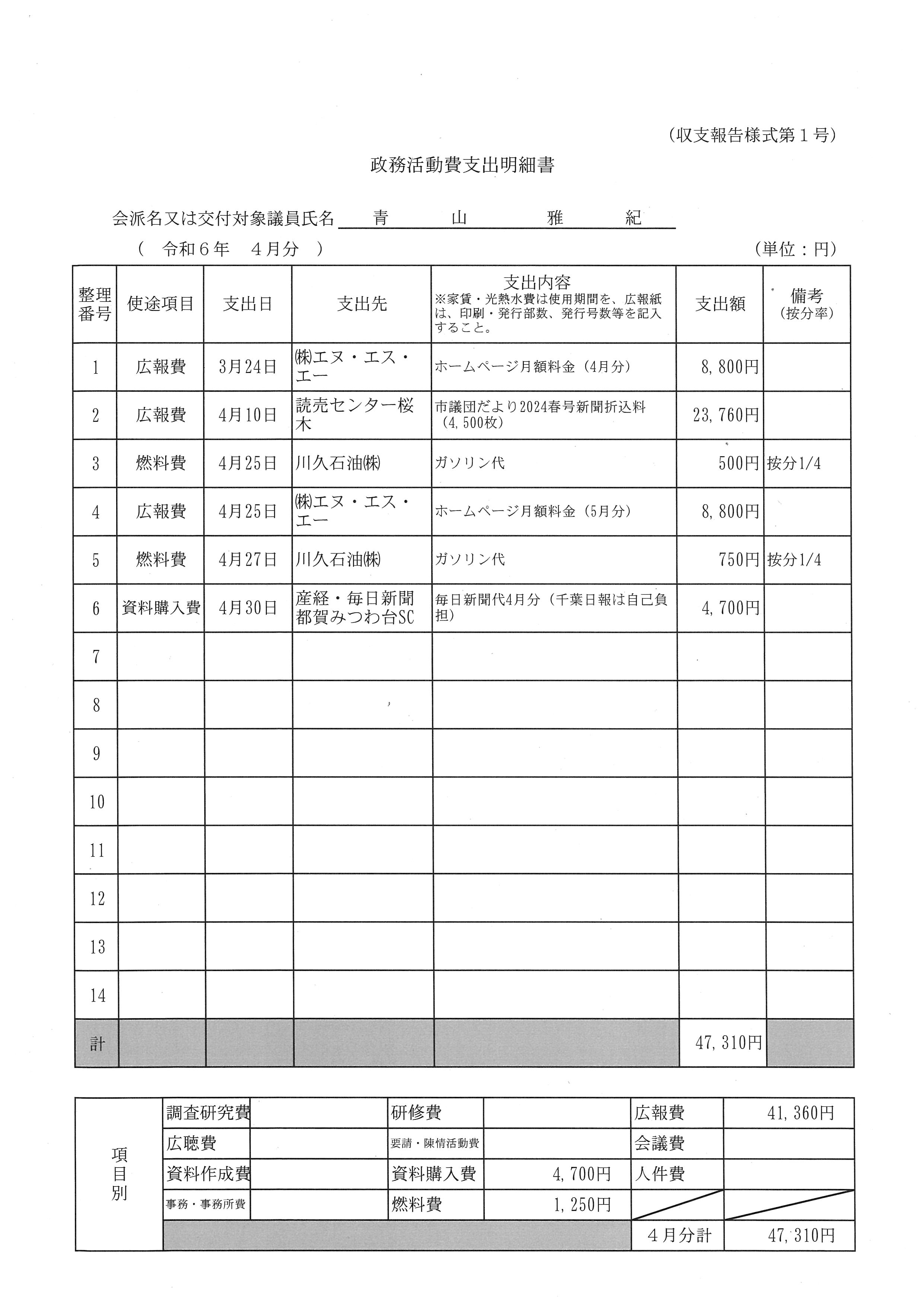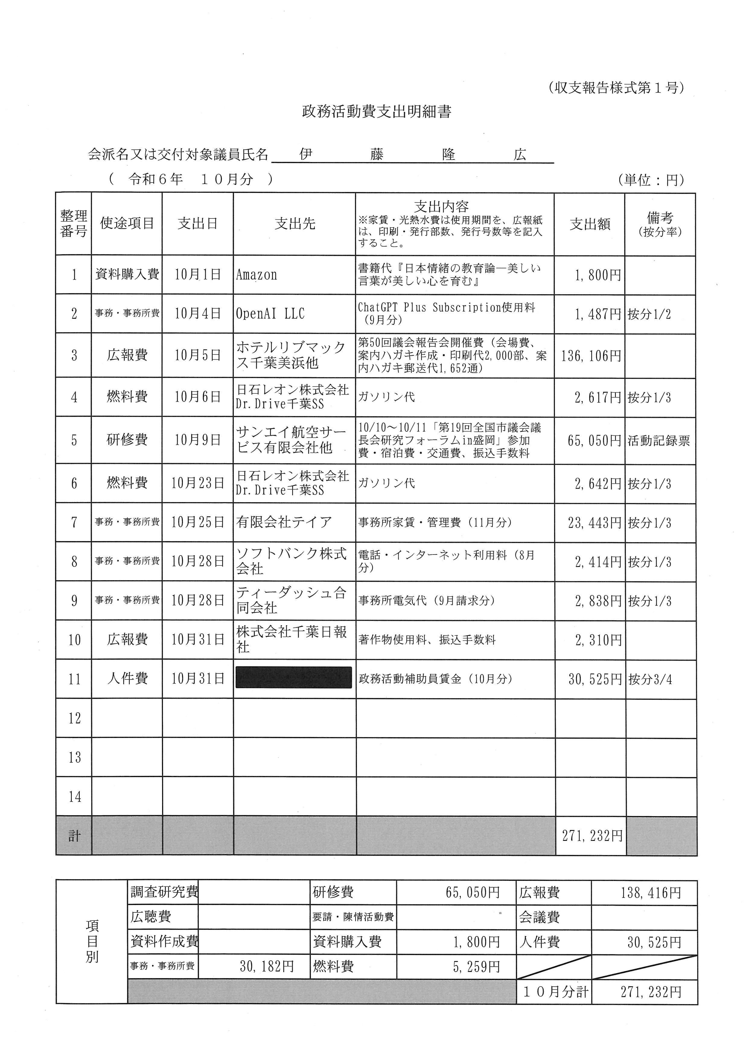 千葉市議会トップページ > 広報・情報公開 > 政務活動費 > 令和6年度交付分(政務活動費収支報告書)