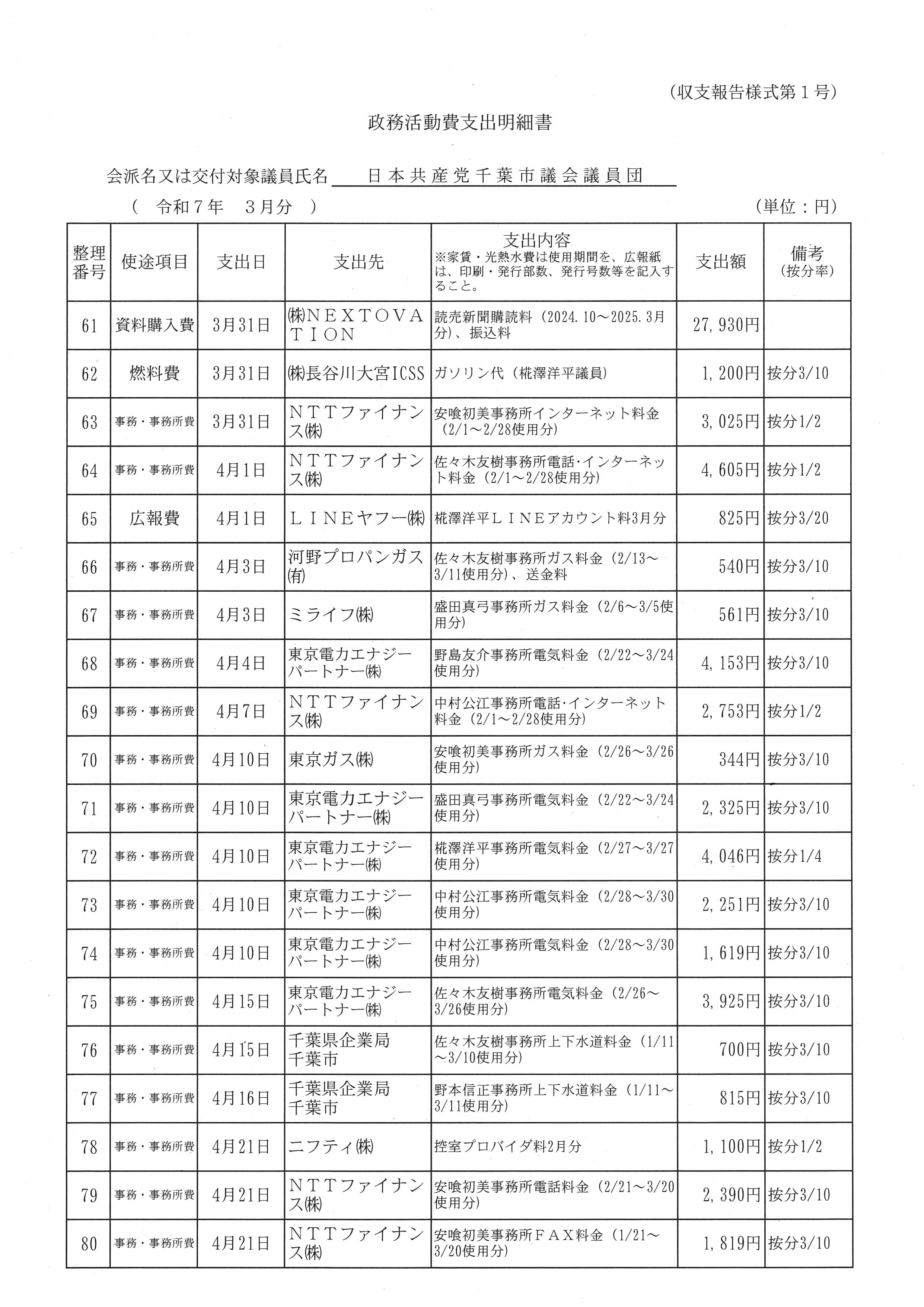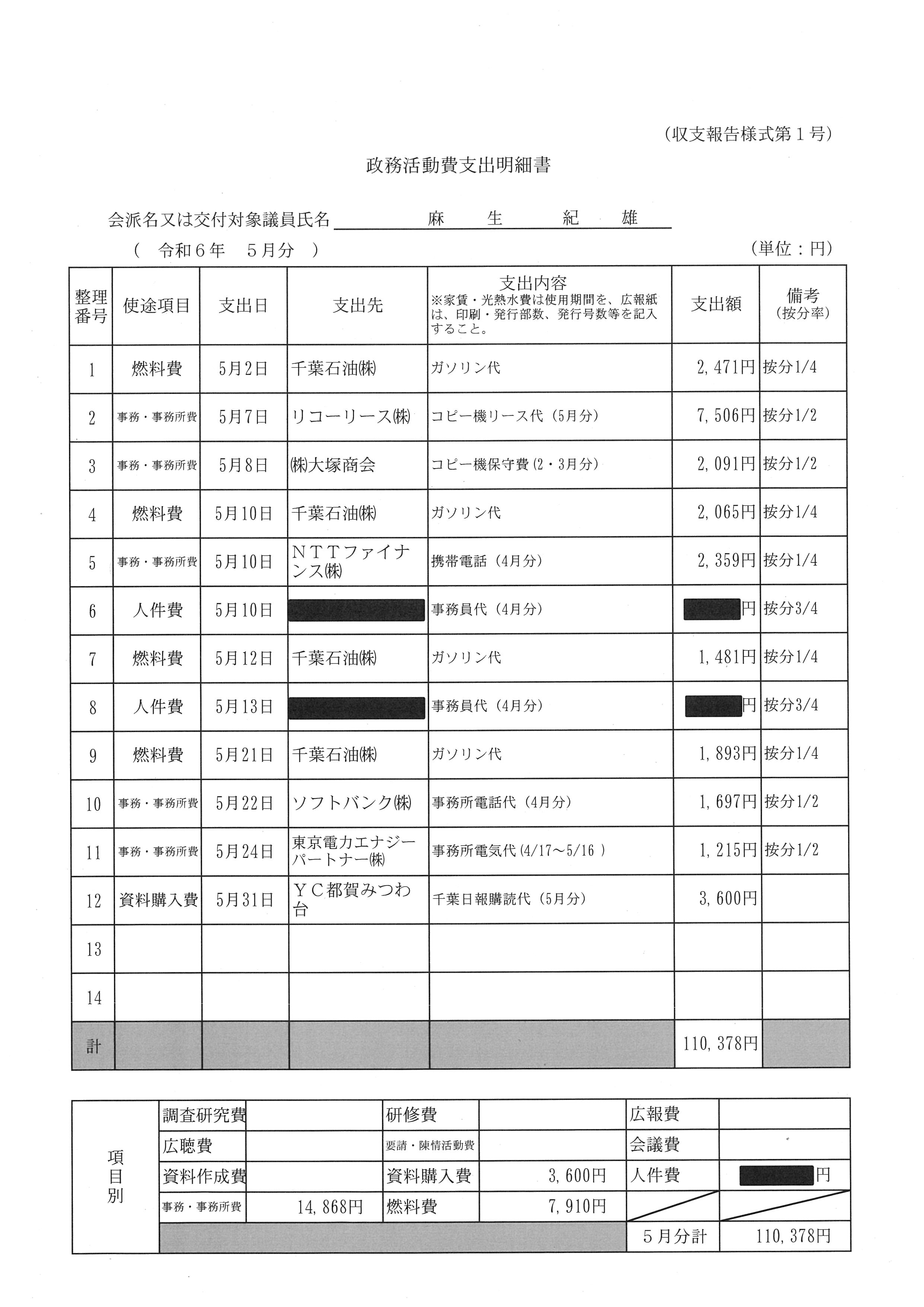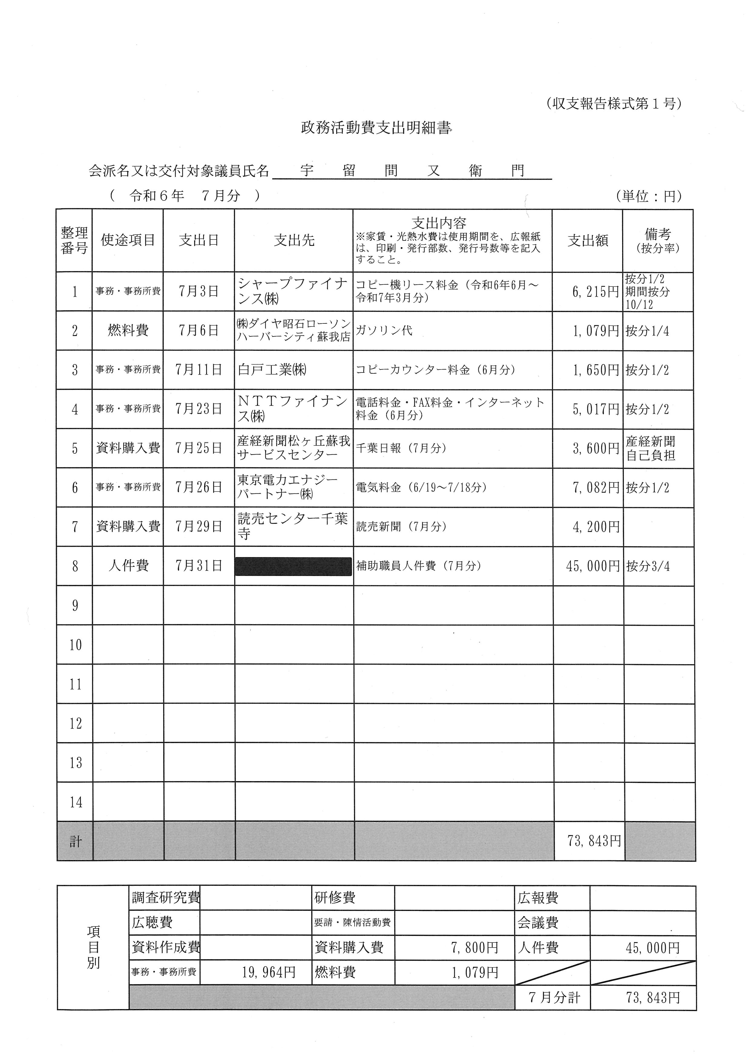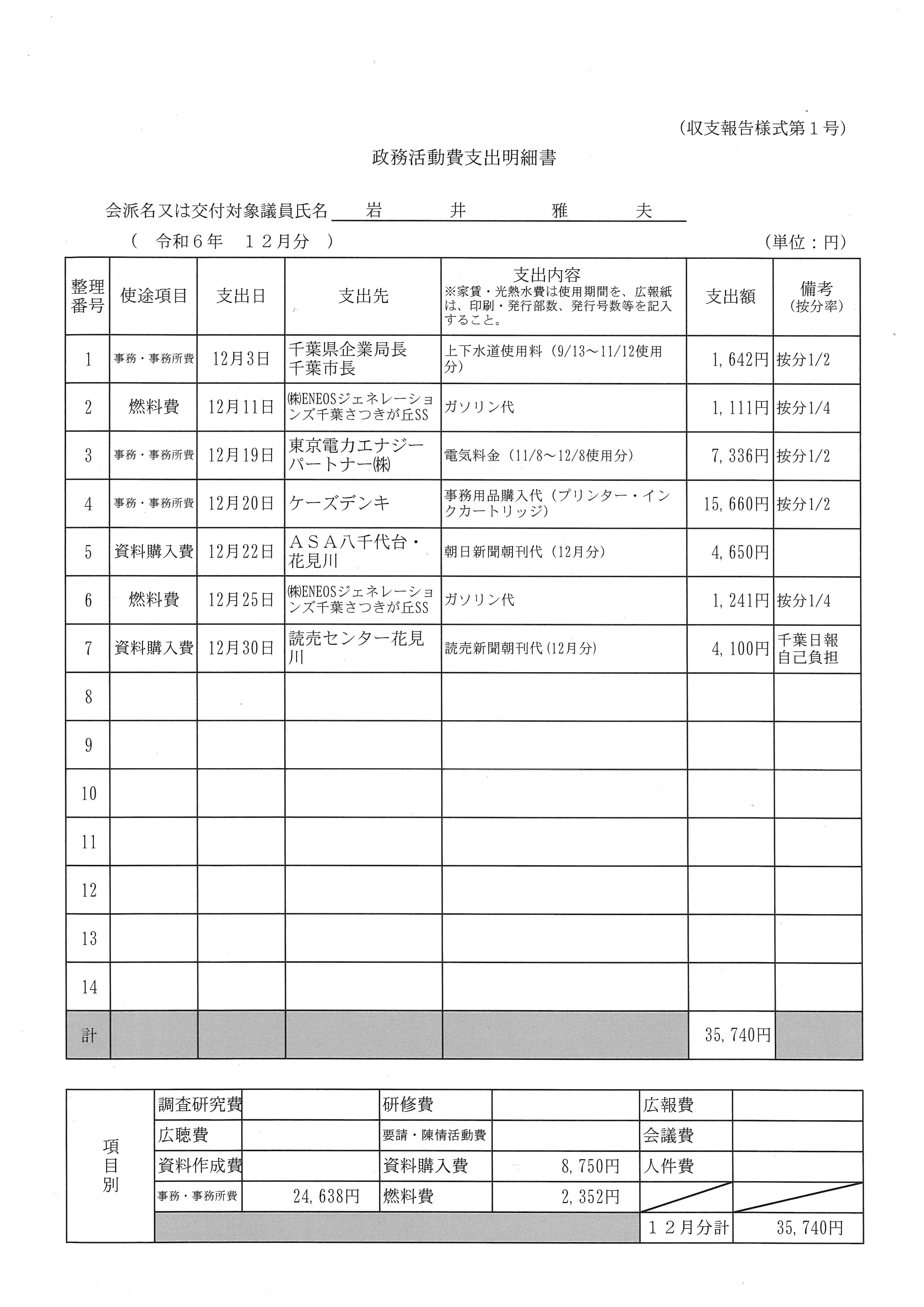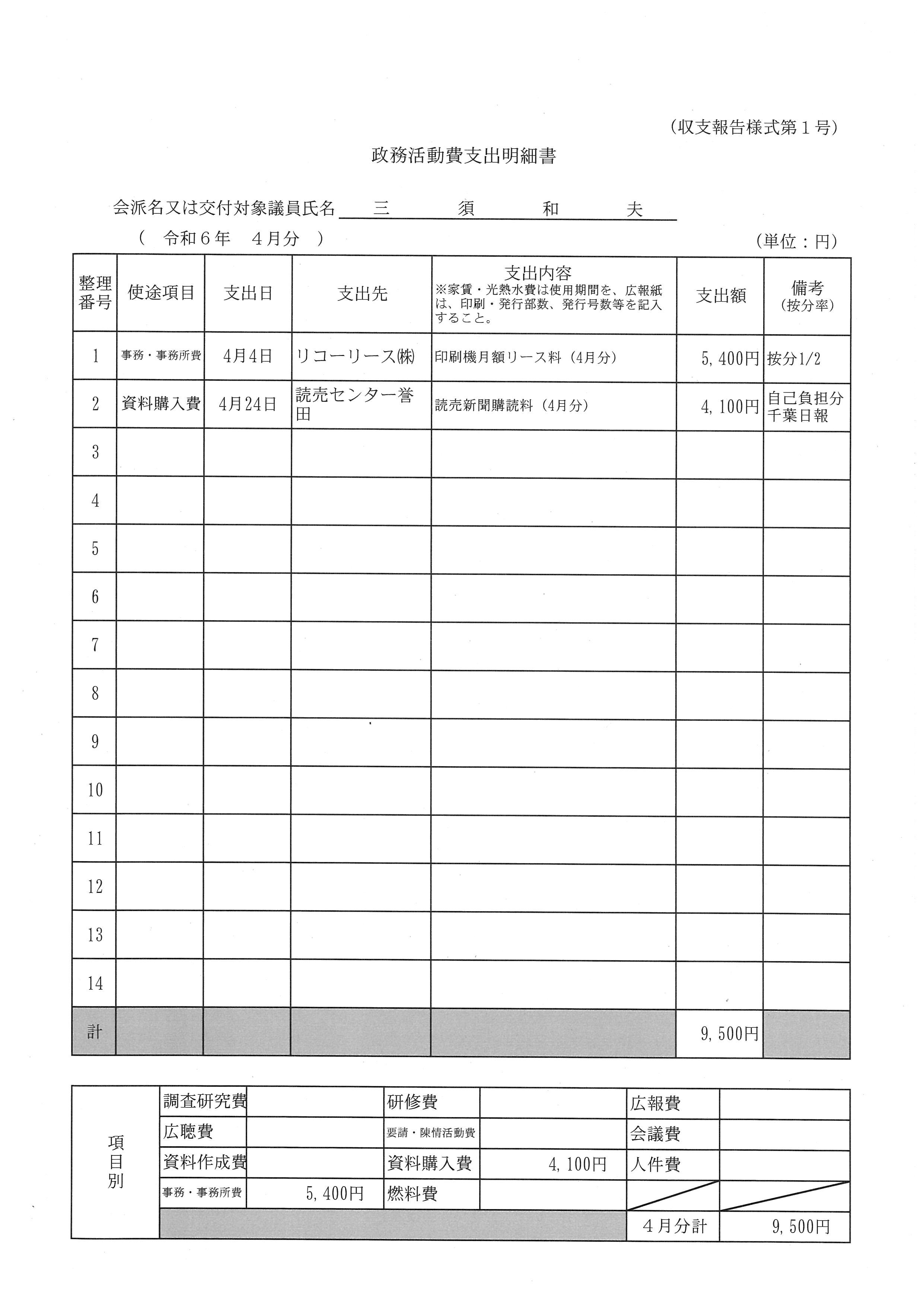 千葉市議会トップページ > 広報・情報公開 > 政務活動費 > 令和6年度交付分(政務活動費収支報告書)