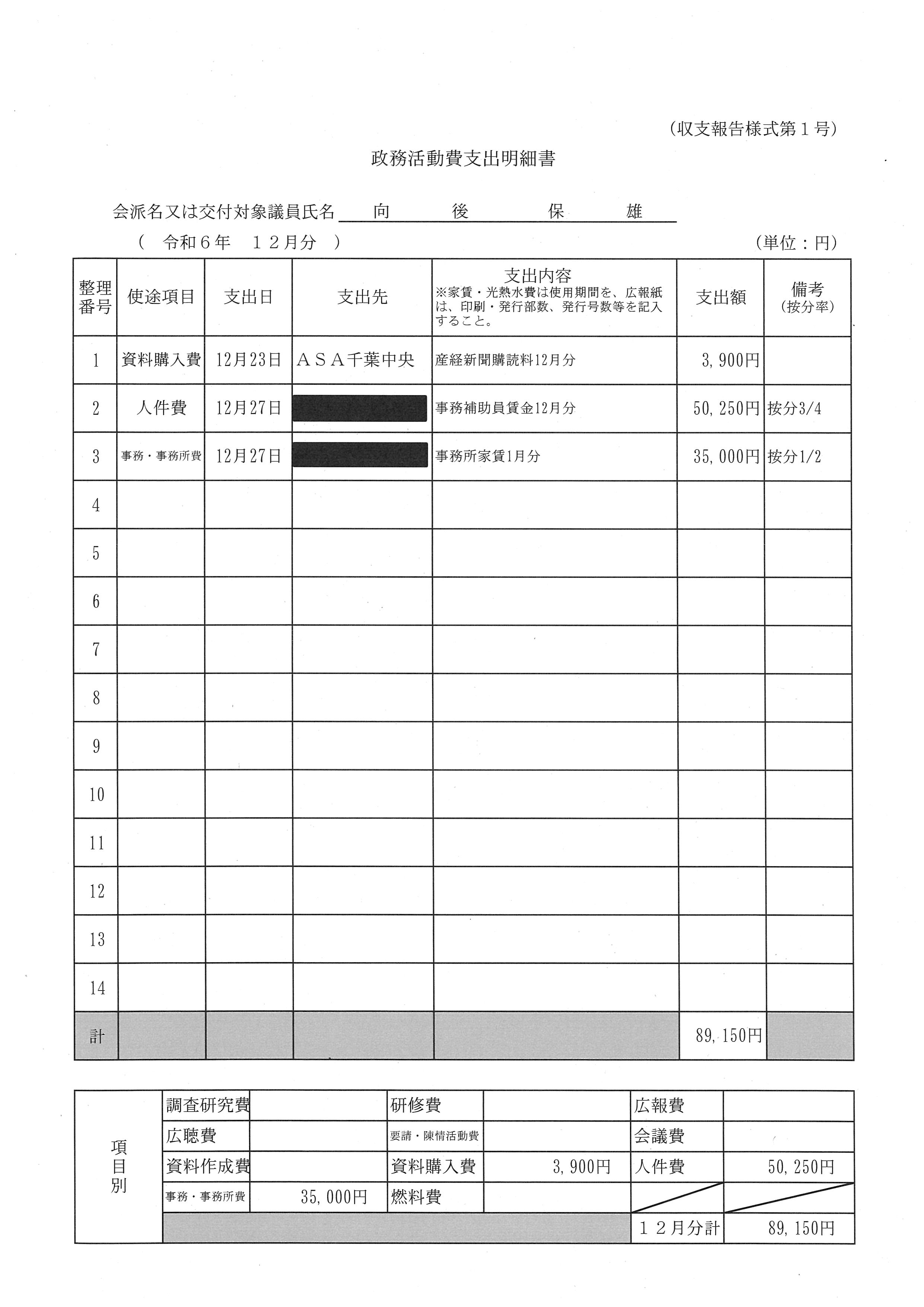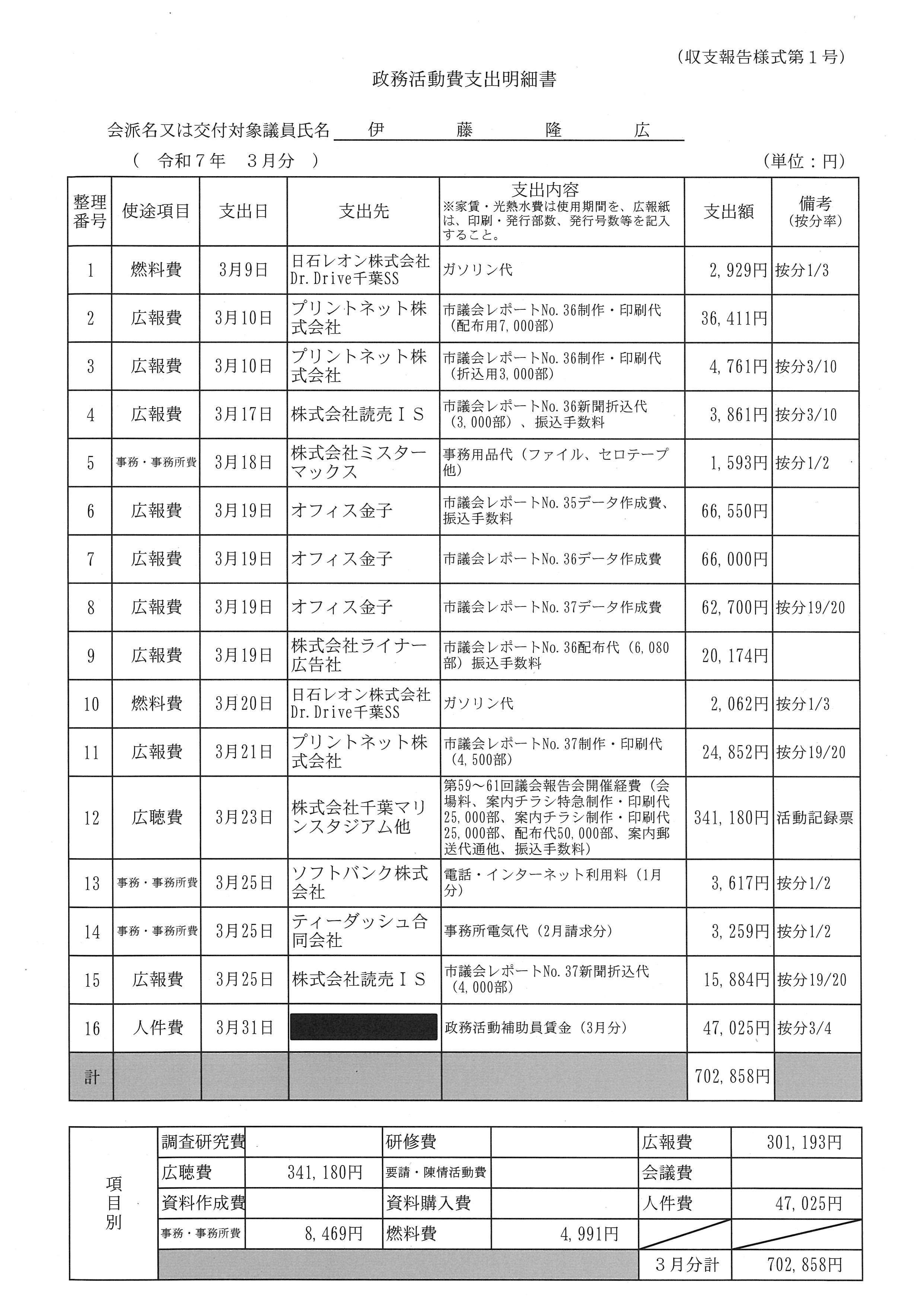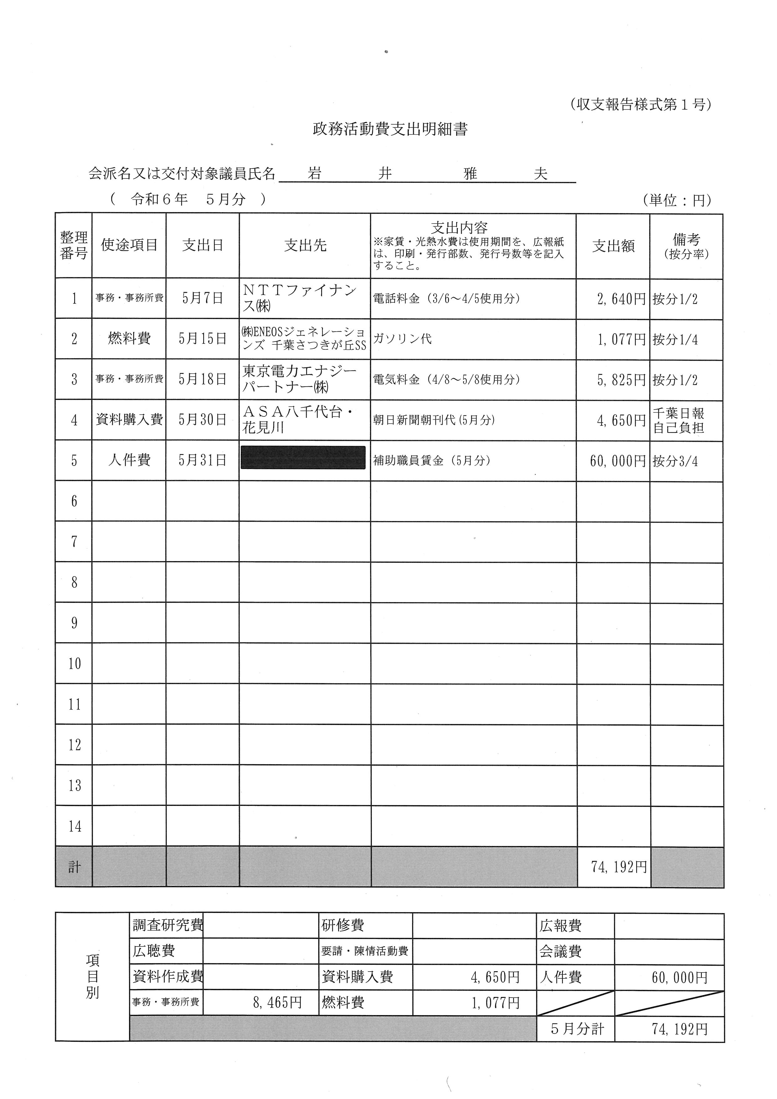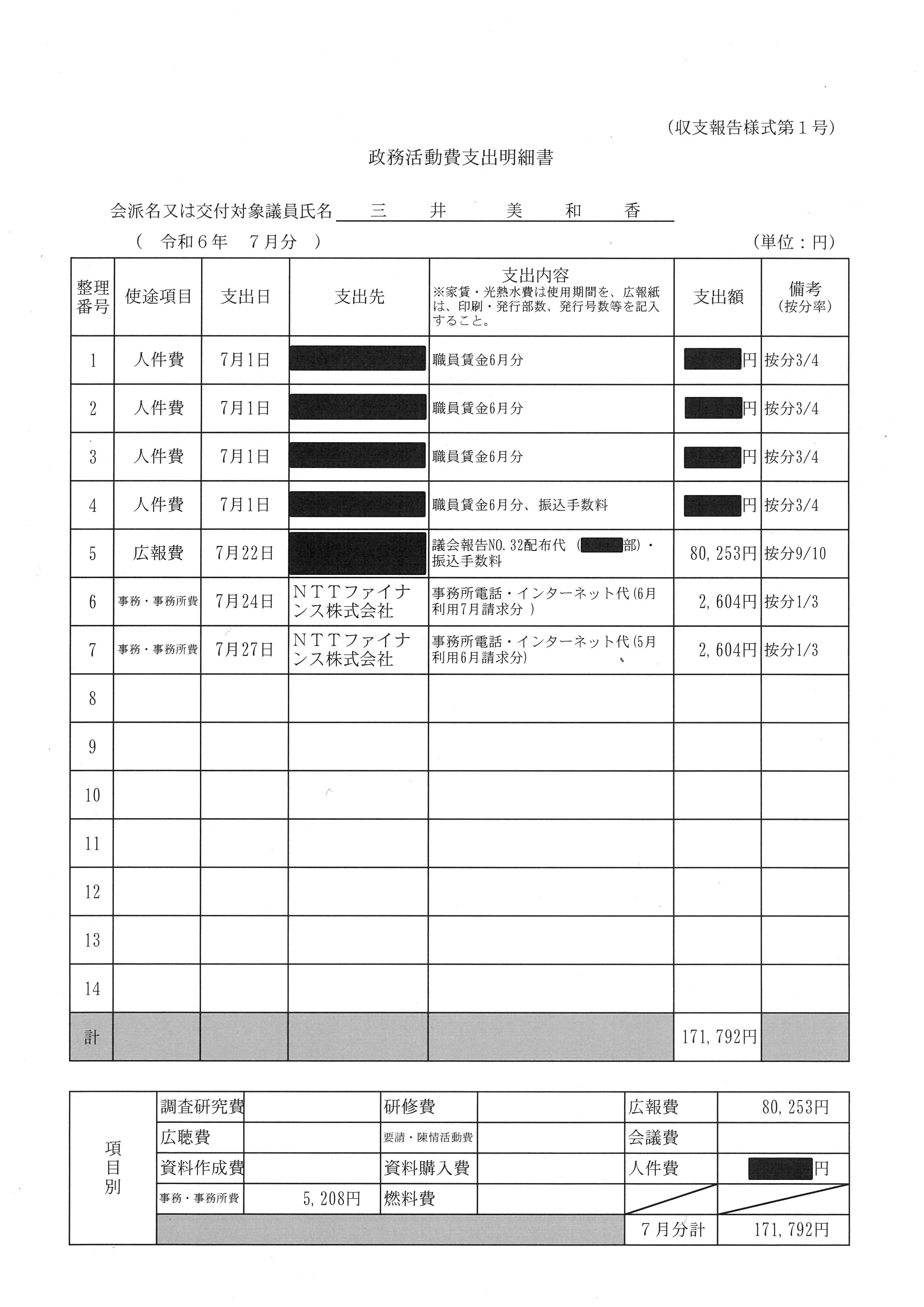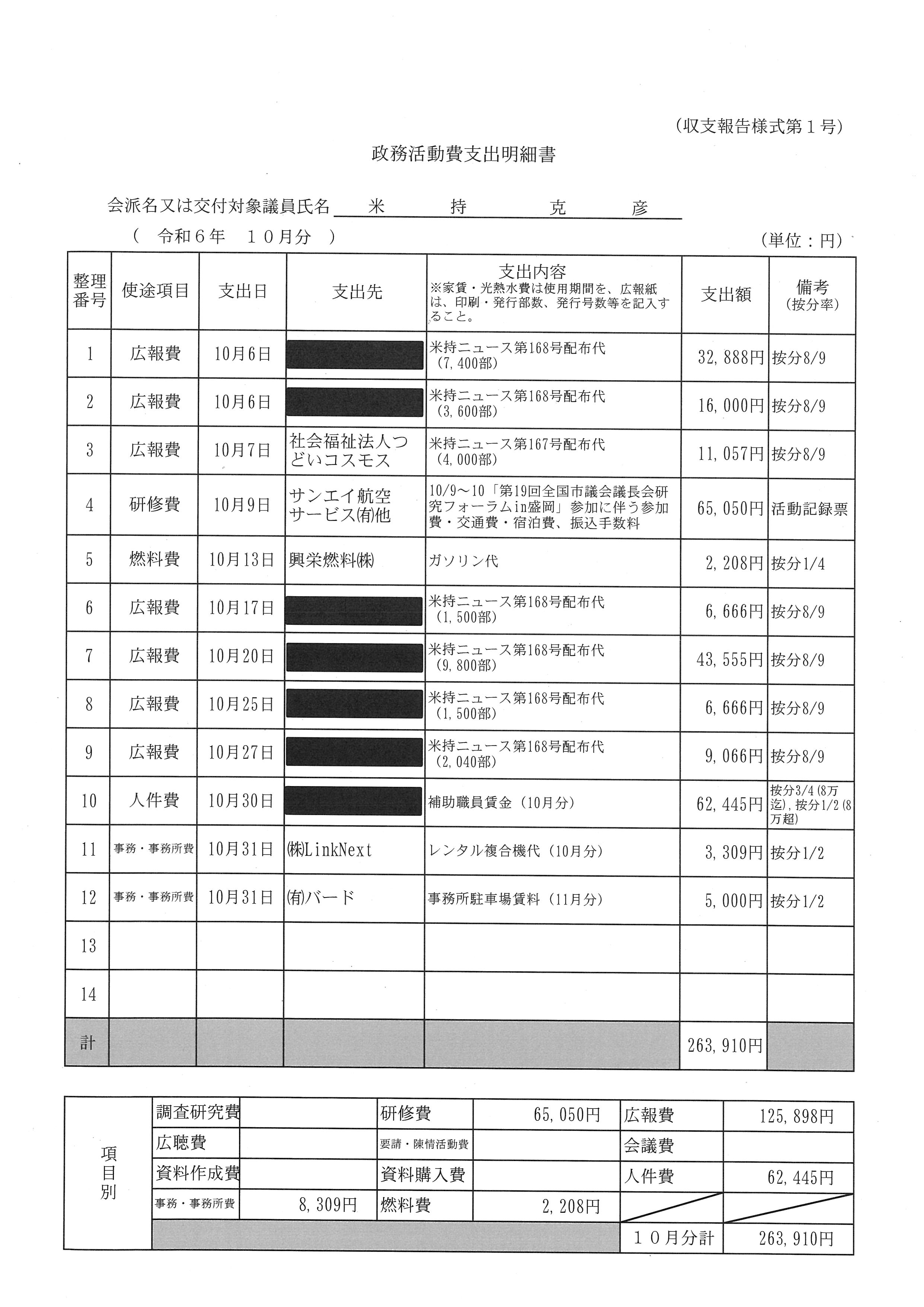 千葉市議会トップページ > 広報・情報公開 > 政務活動費 > 令和6年度交付分(政務活動費収支報告書)