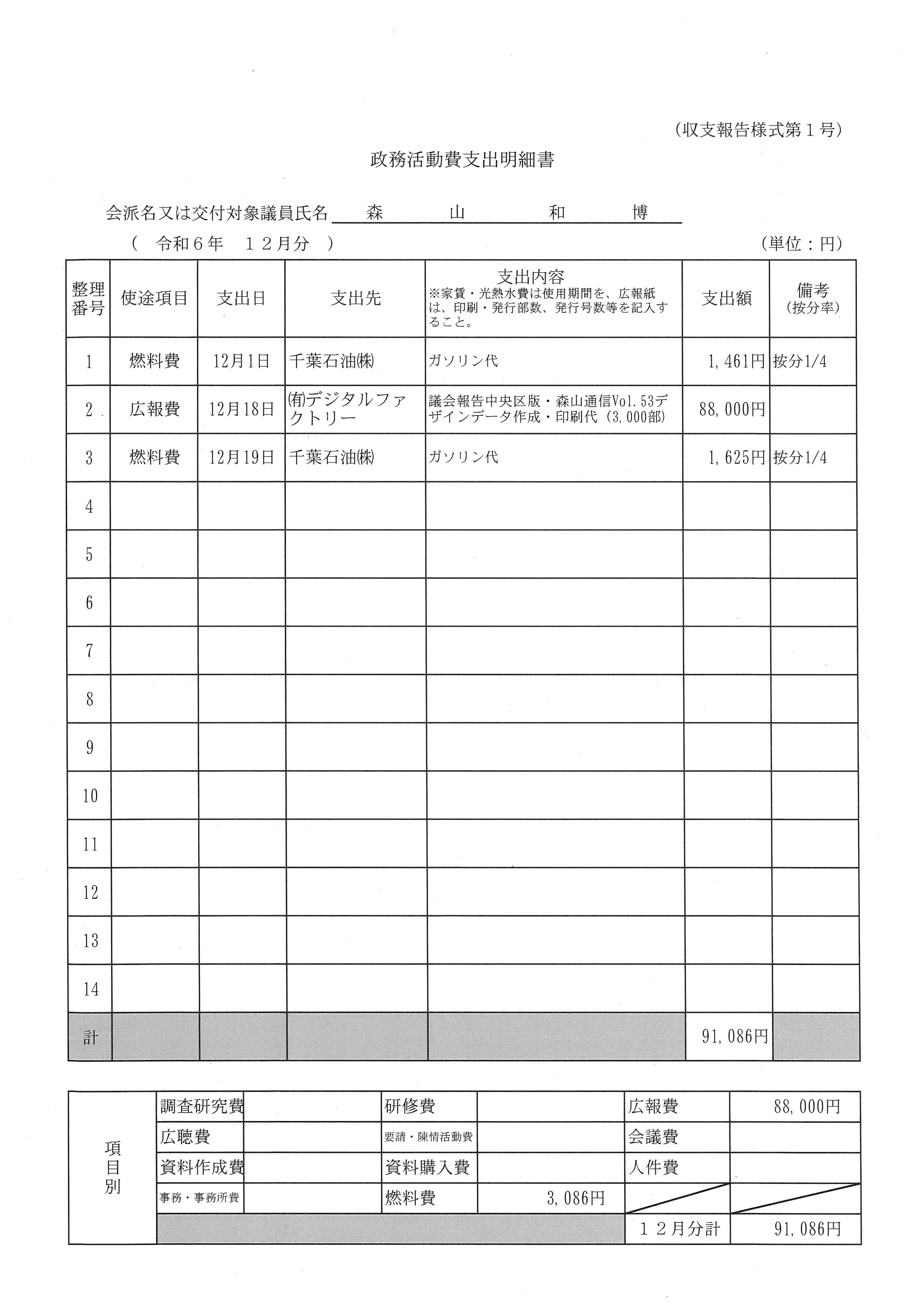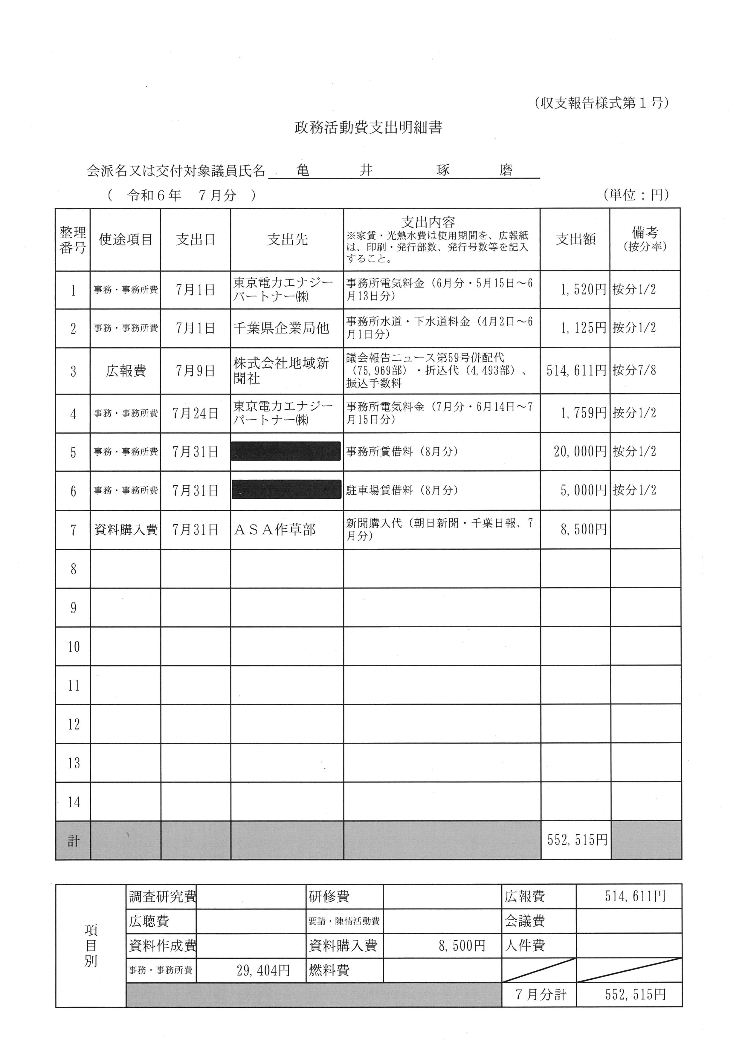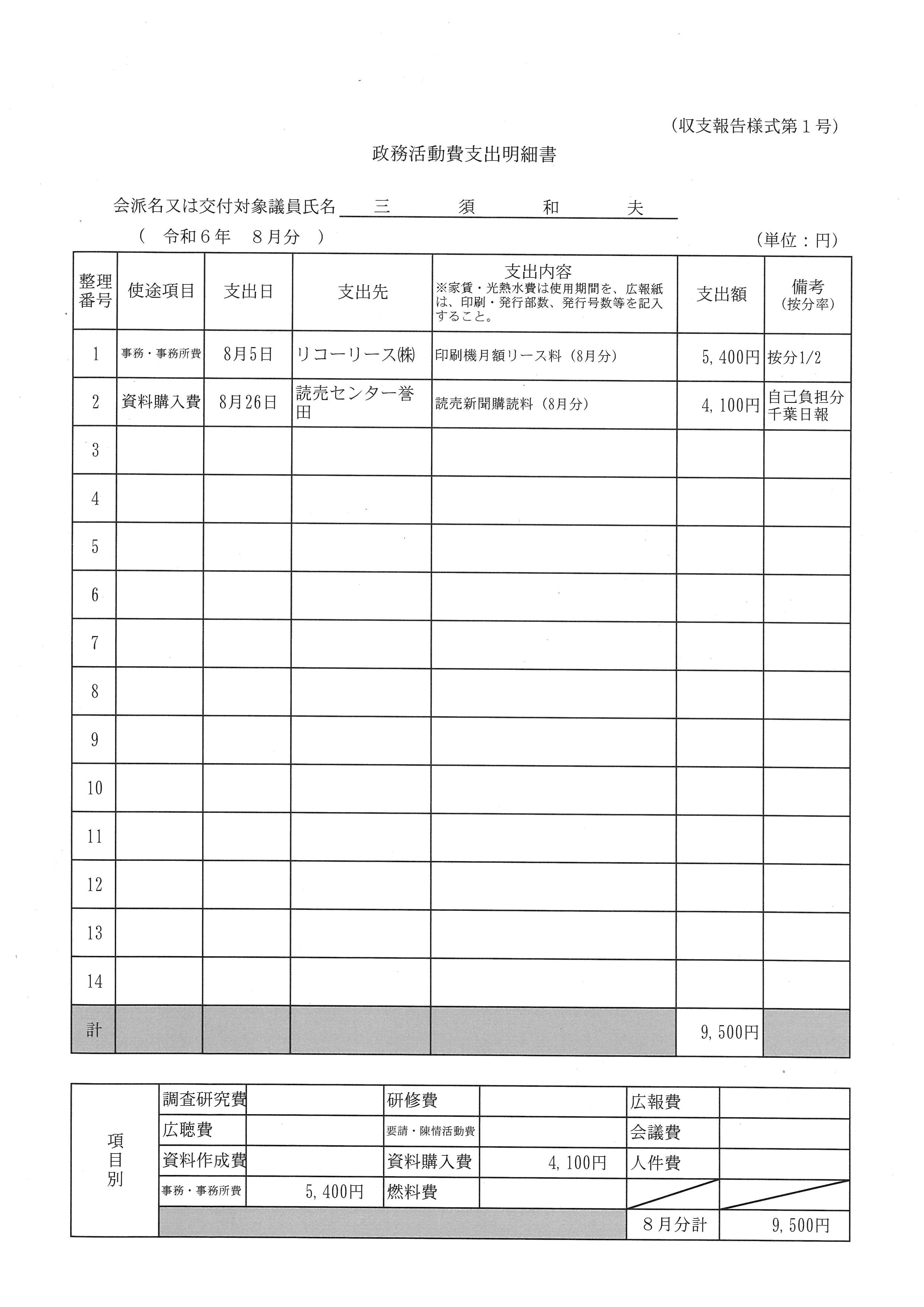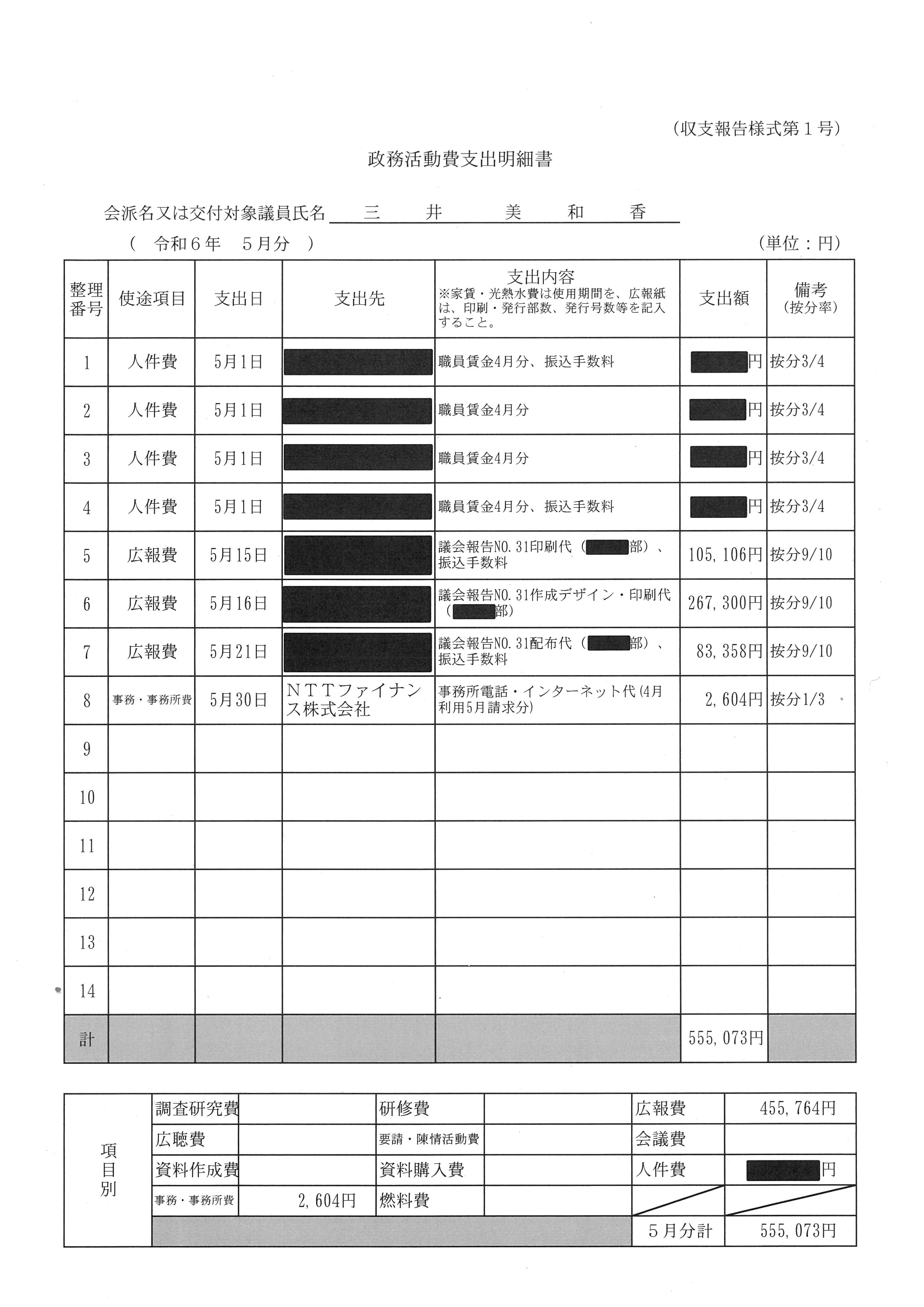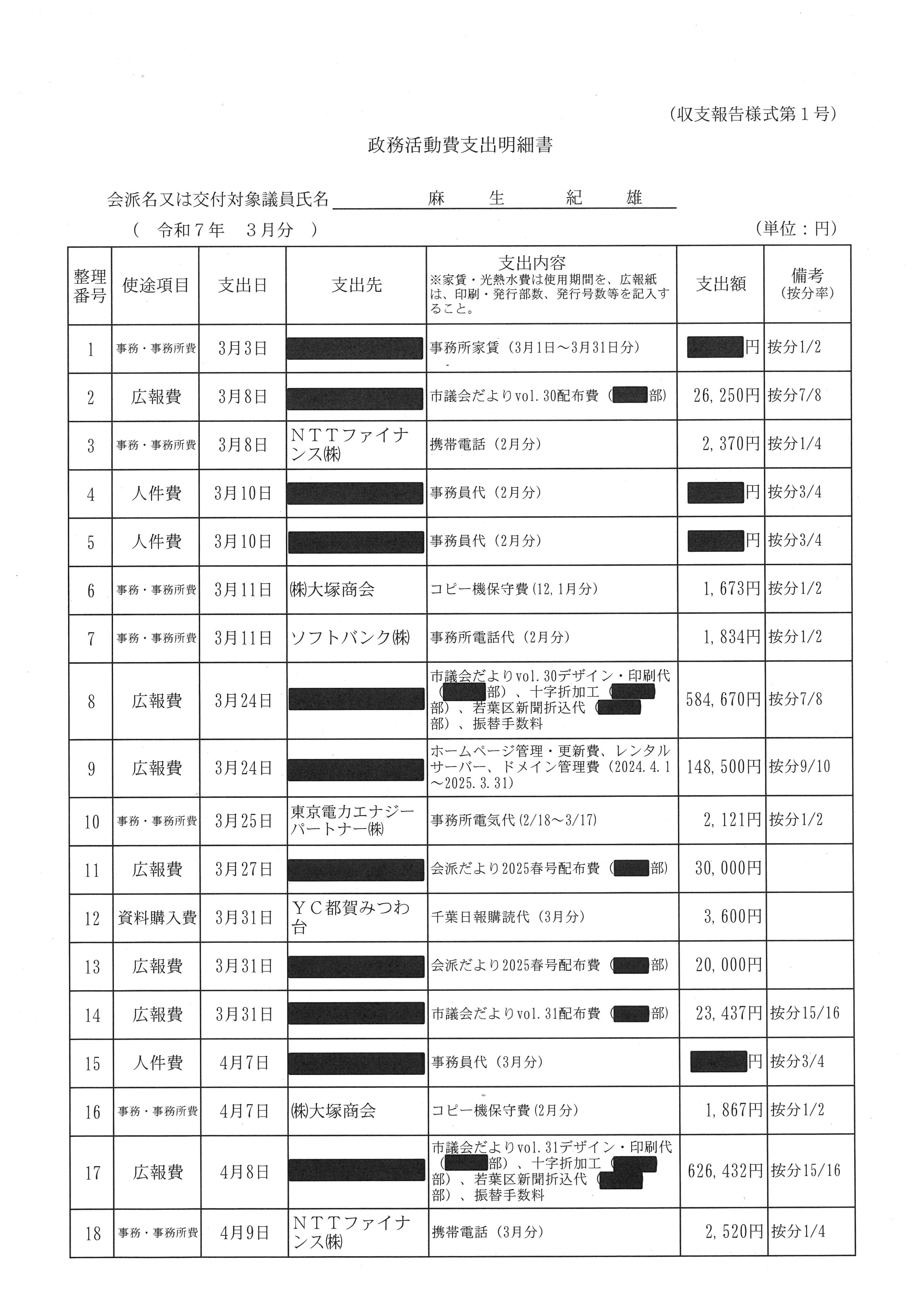 千葉市議会トップページ > 広報・情報公開 > 政務活動費 > 令和6年度交付分(政務活動費収支報告書)