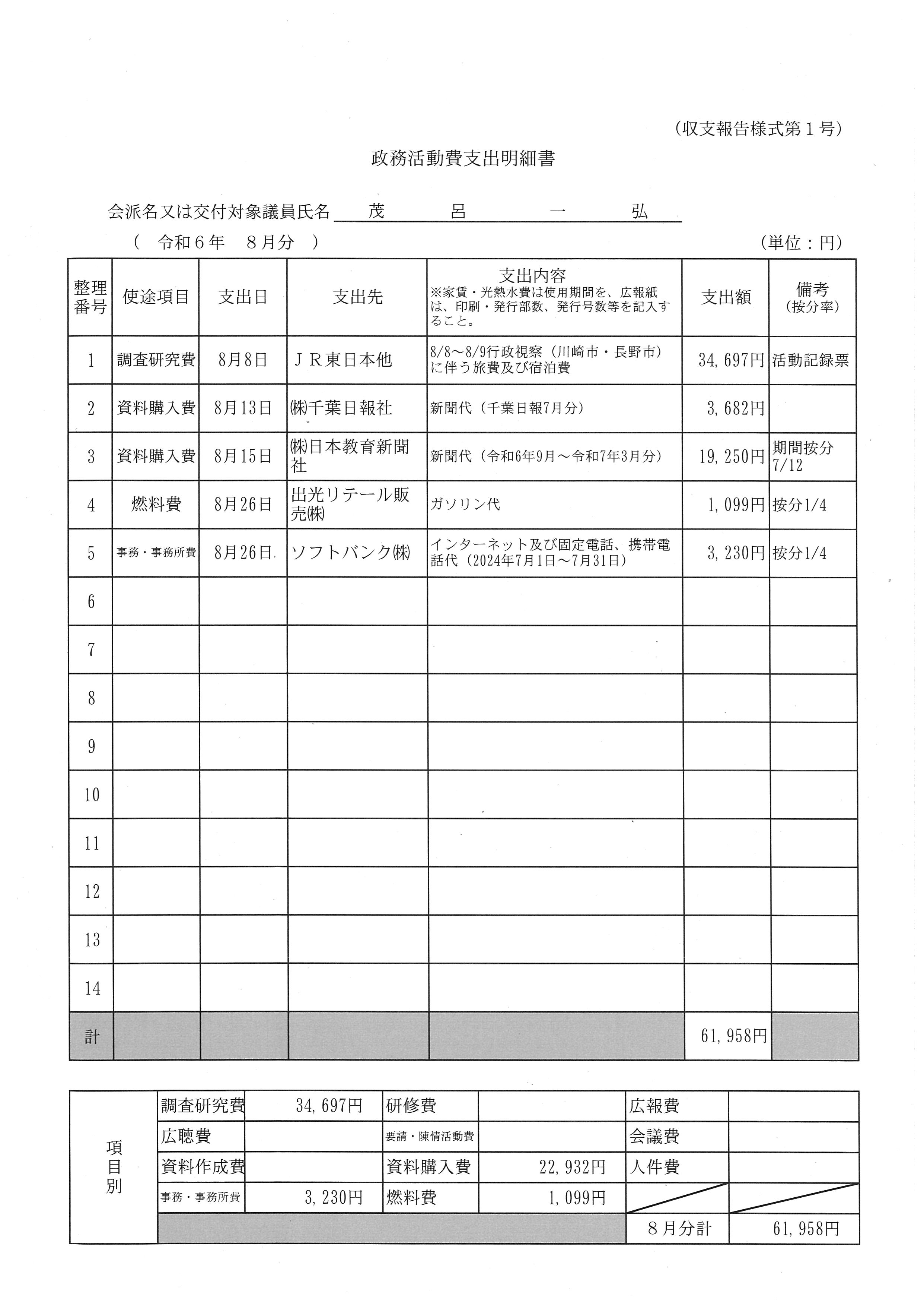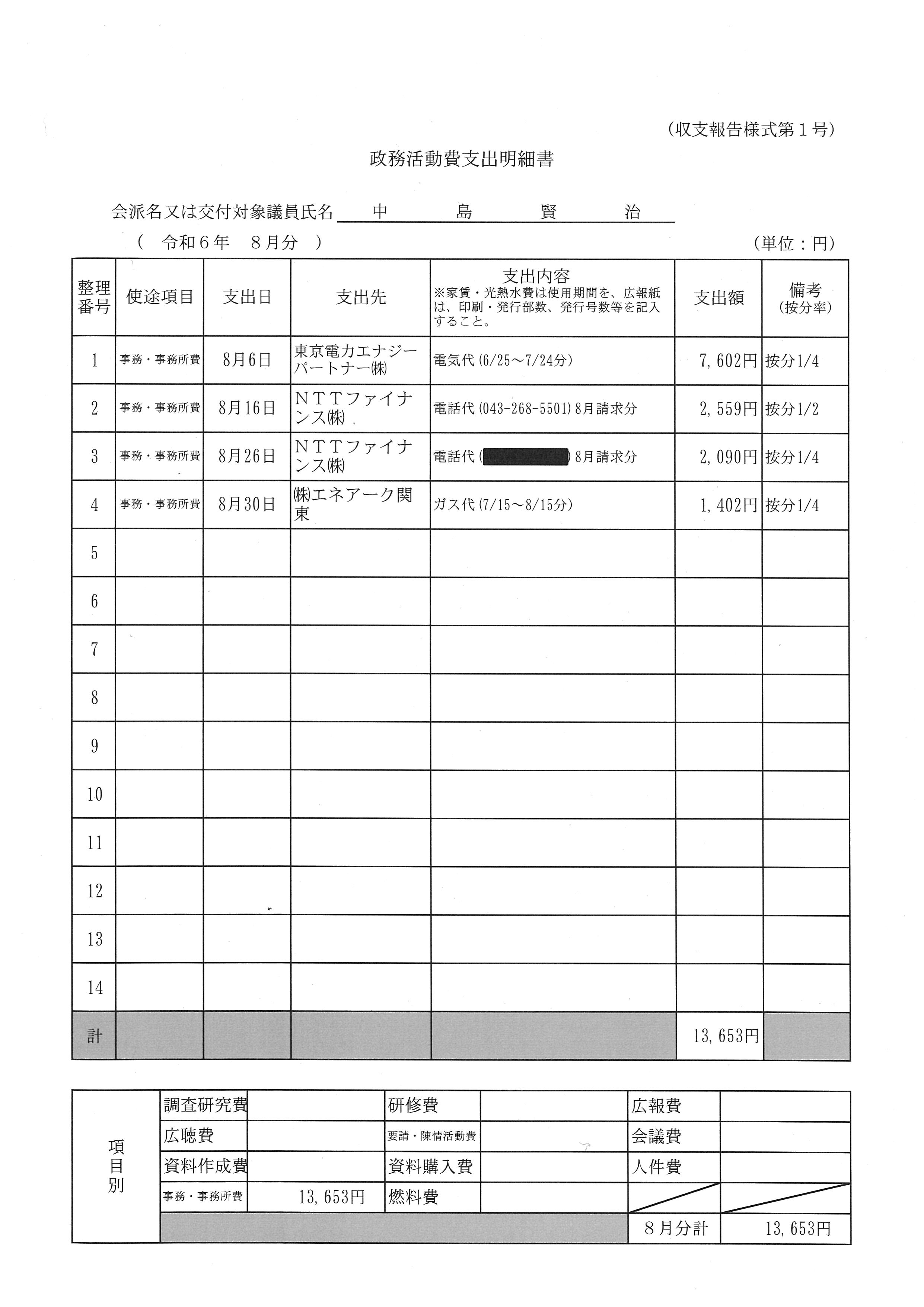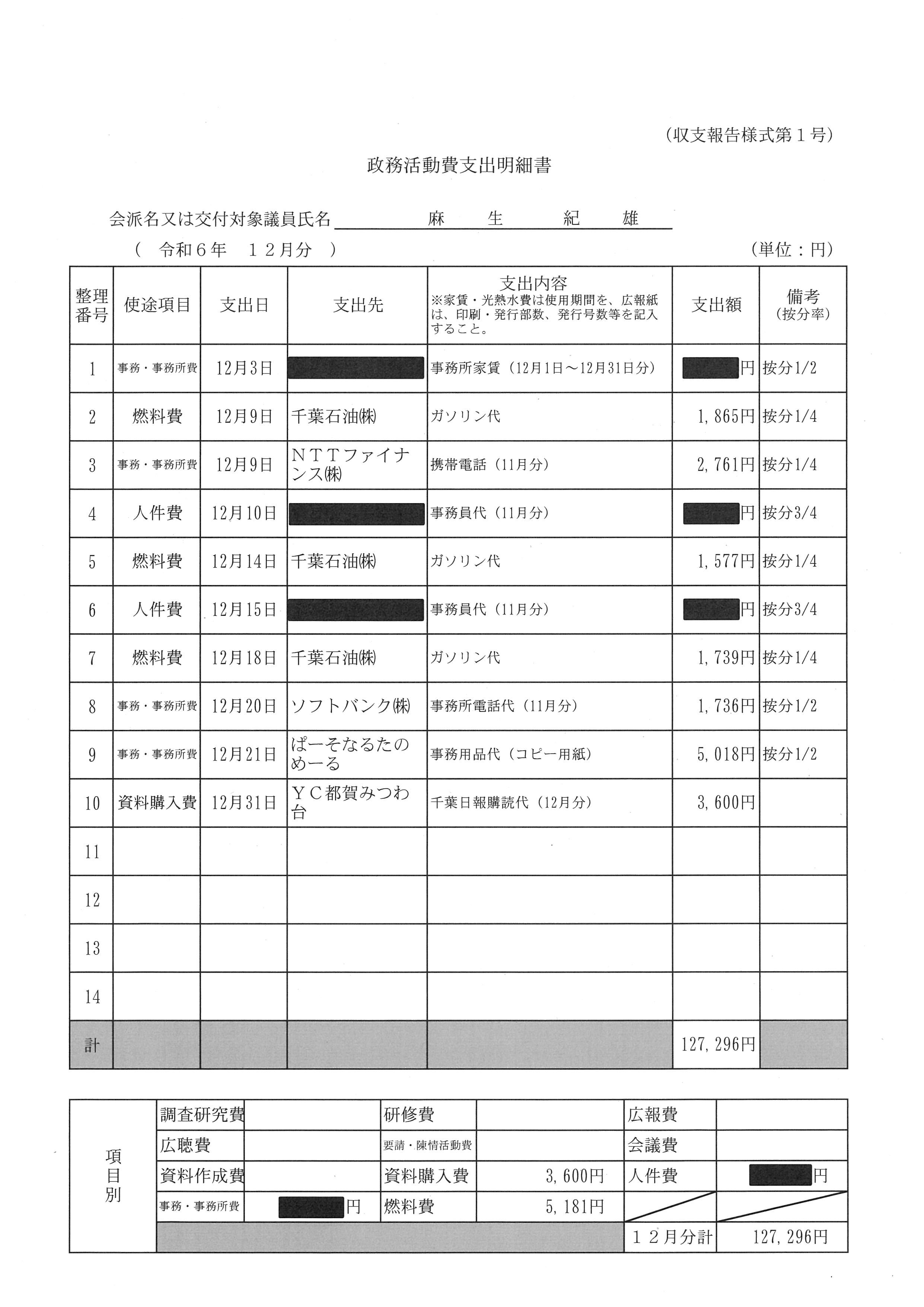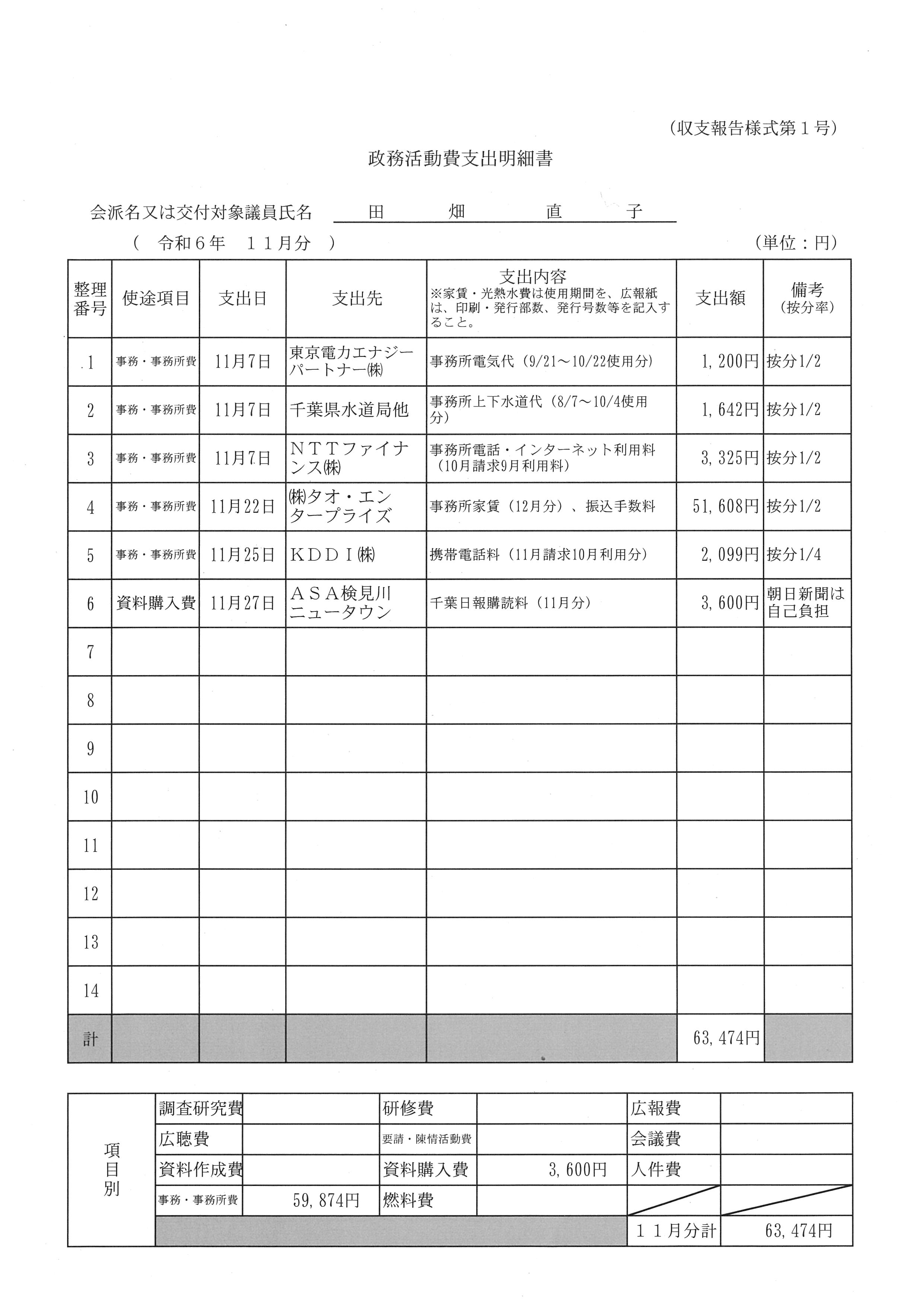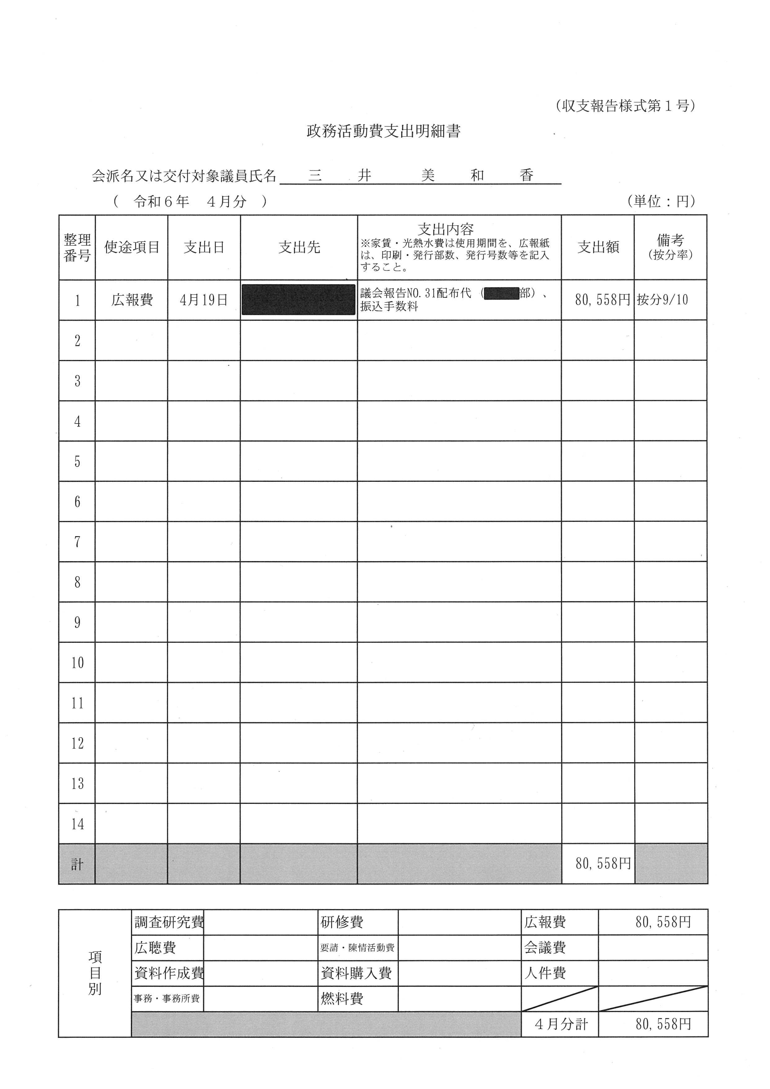 千葉市議会トップページ > 広報・情報公開 > 政務活動費 > 令和6年度交付分(政務活動費収支報告書)