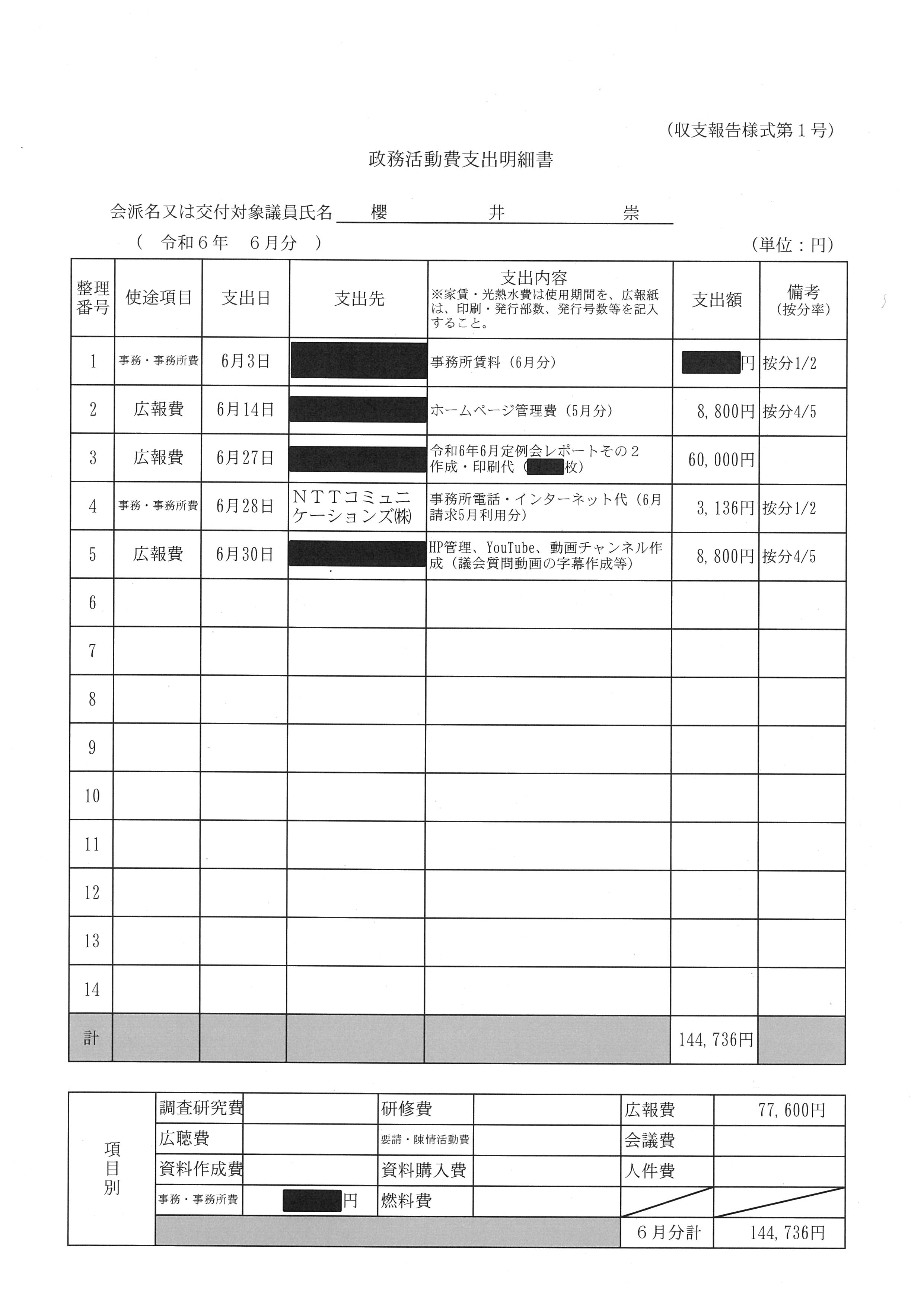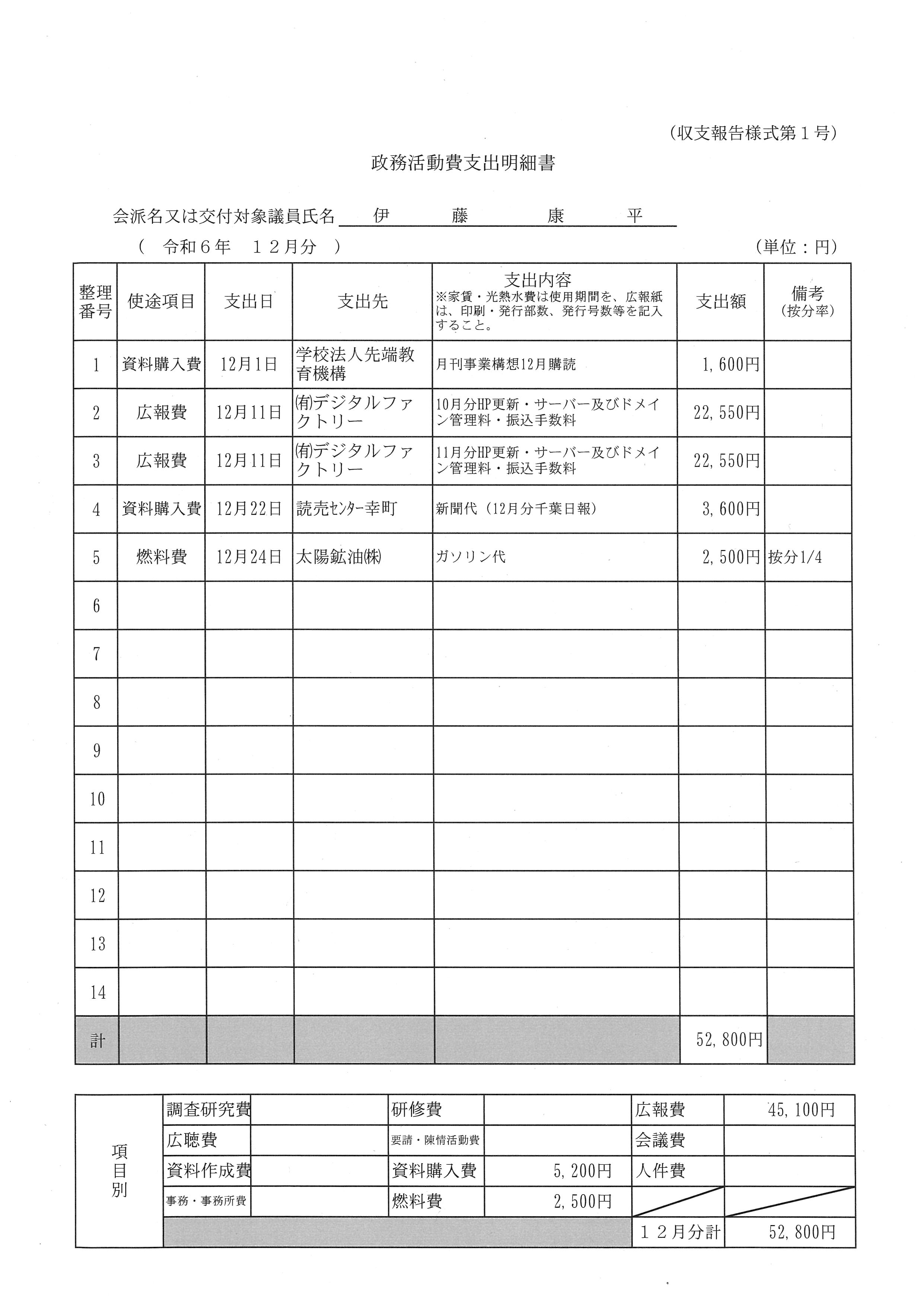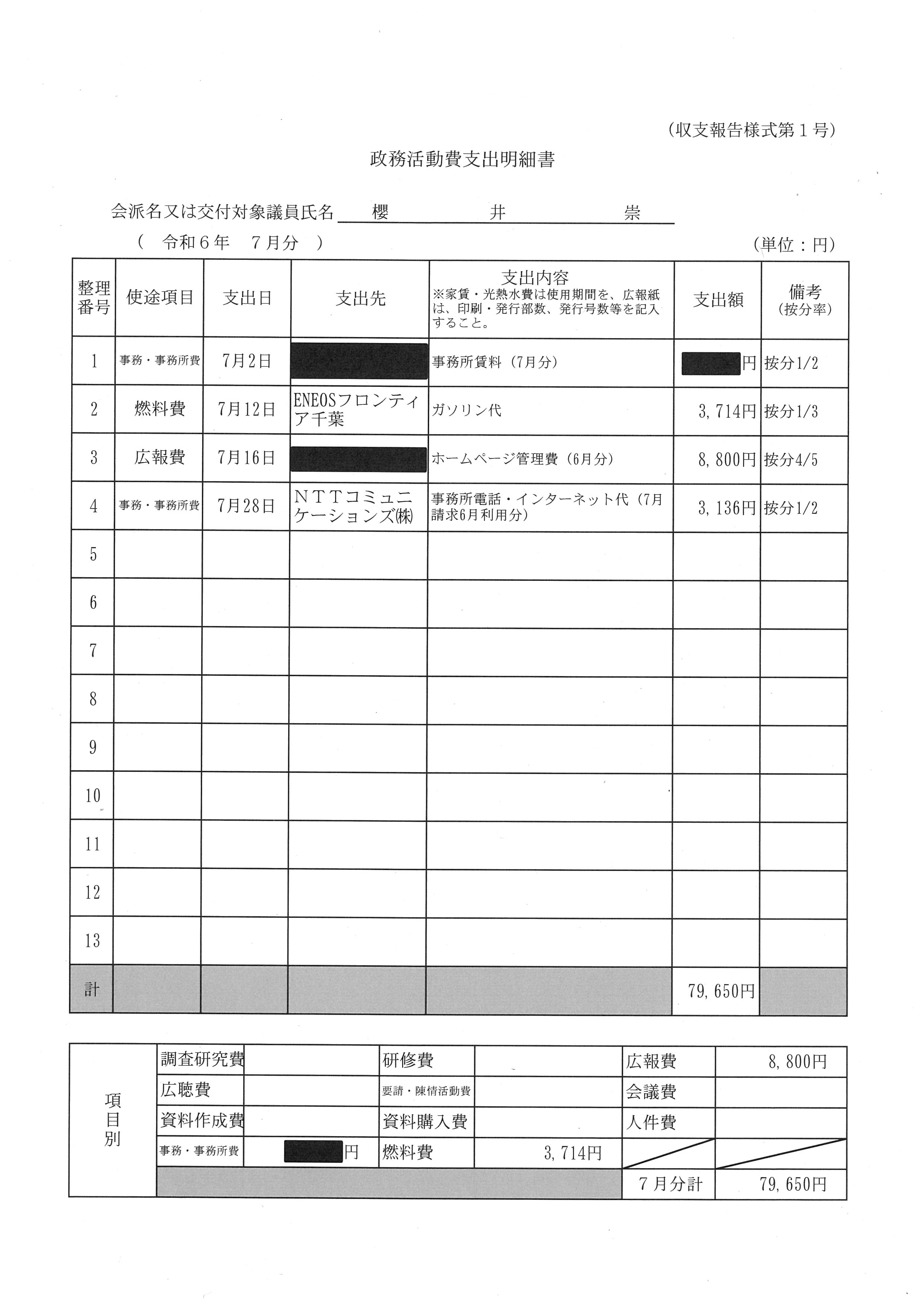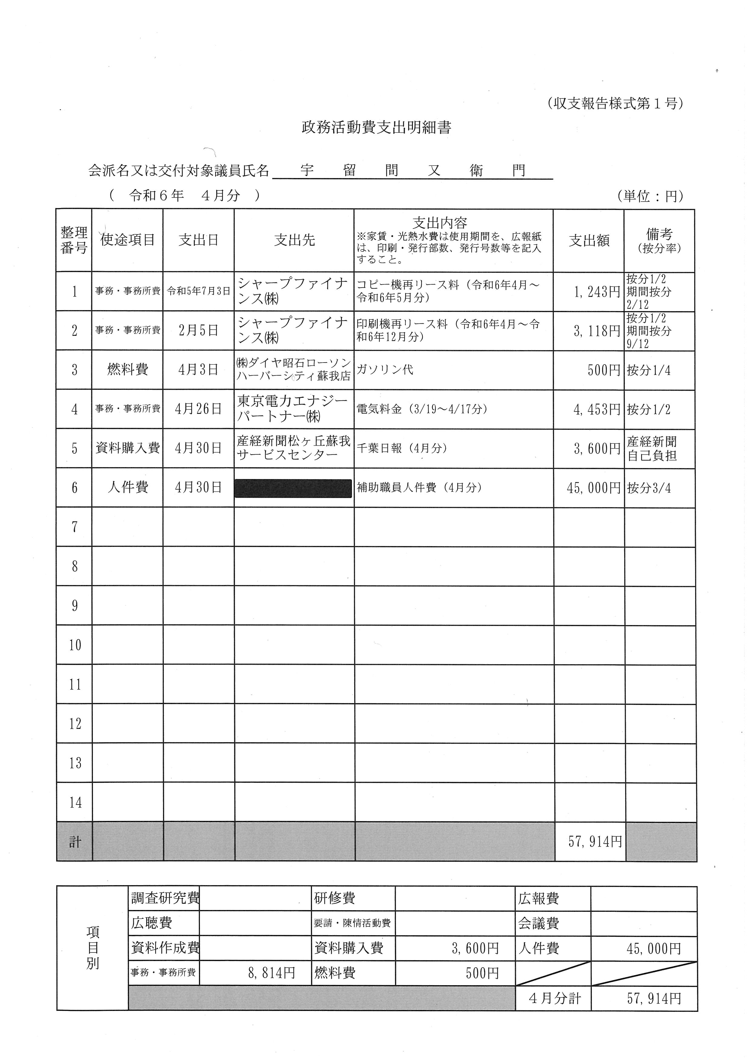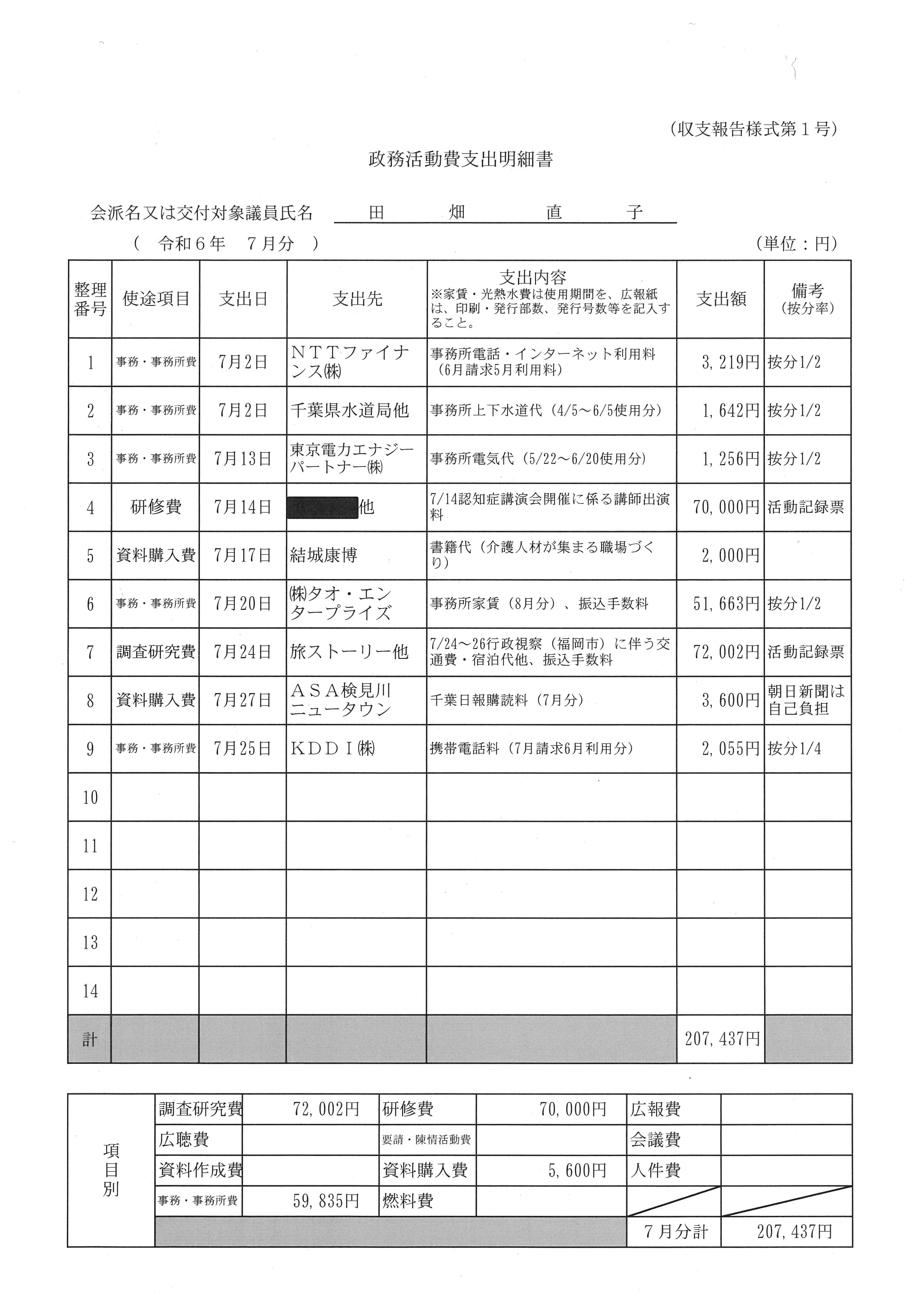 千葉市議会トップページ > 広報・情報公開 > 政務活動費 > 令和6年度交付分(政務活動費収支報告書)