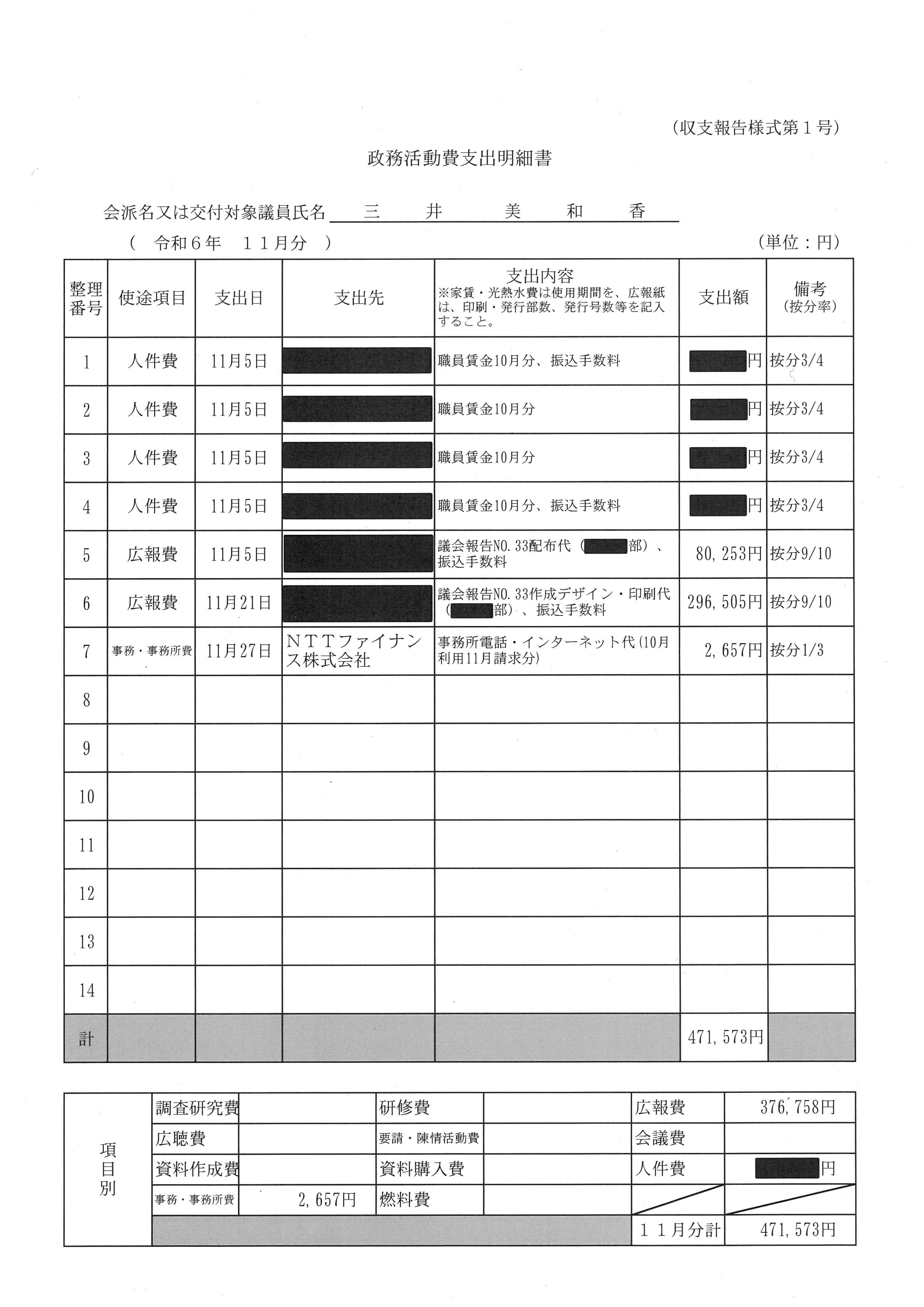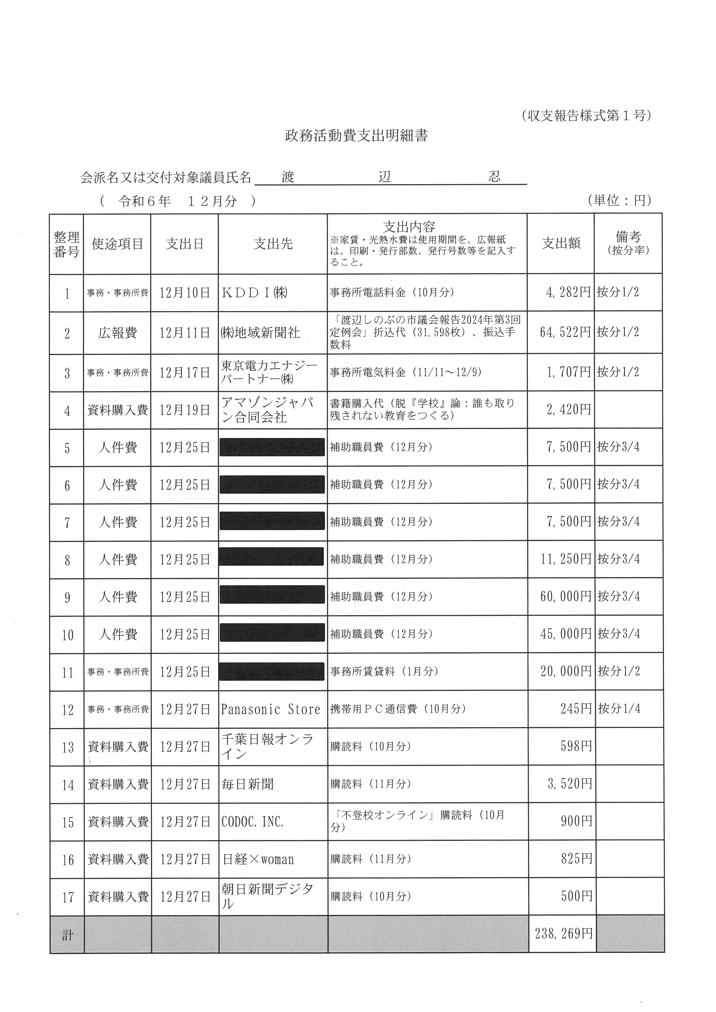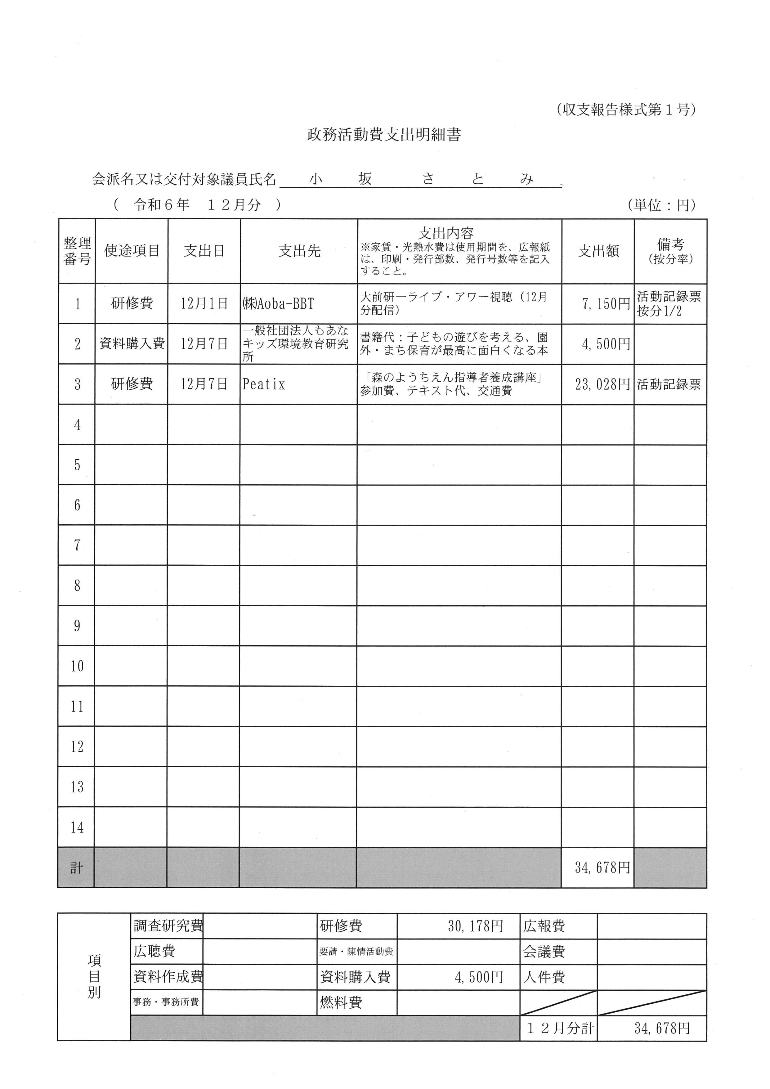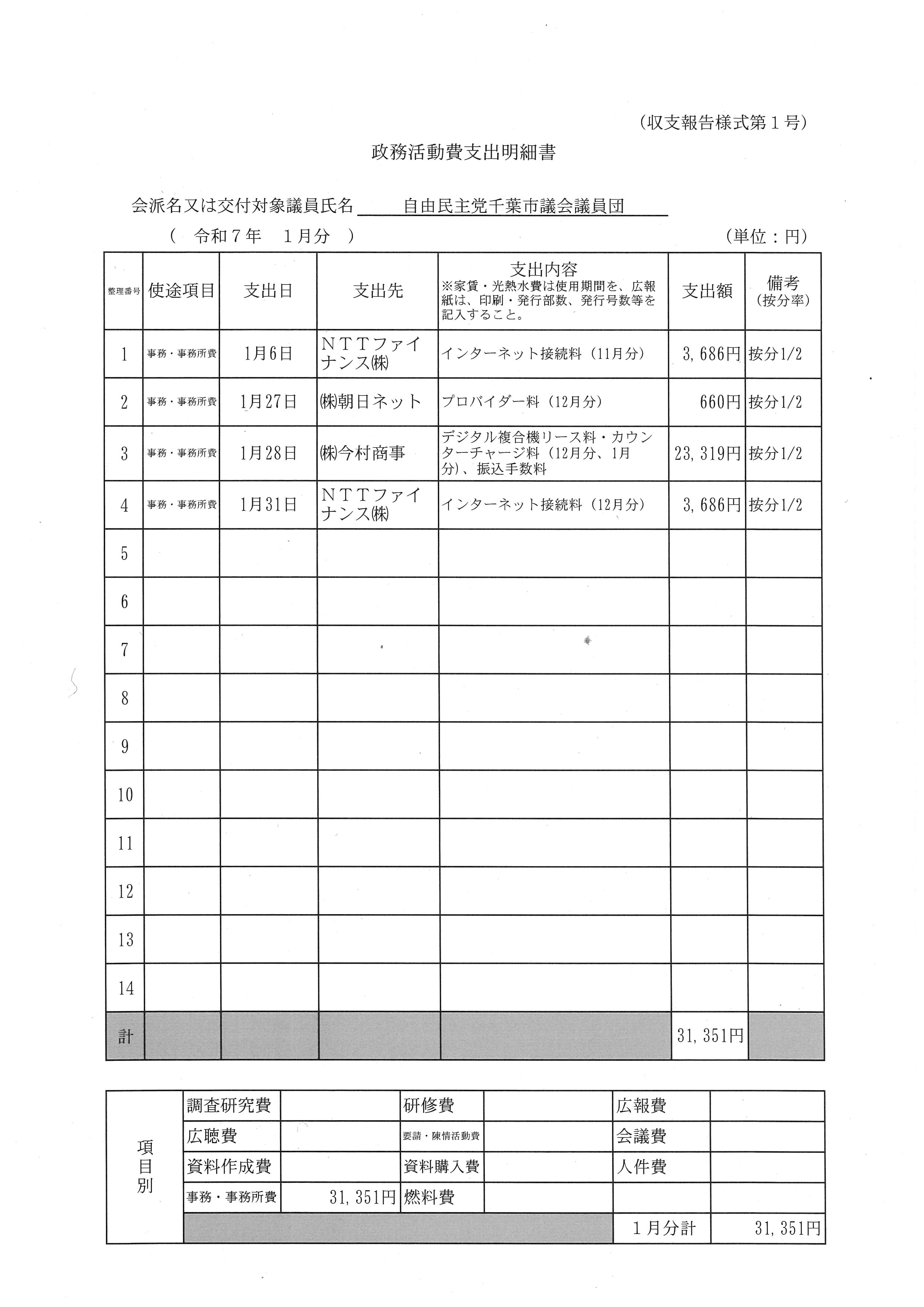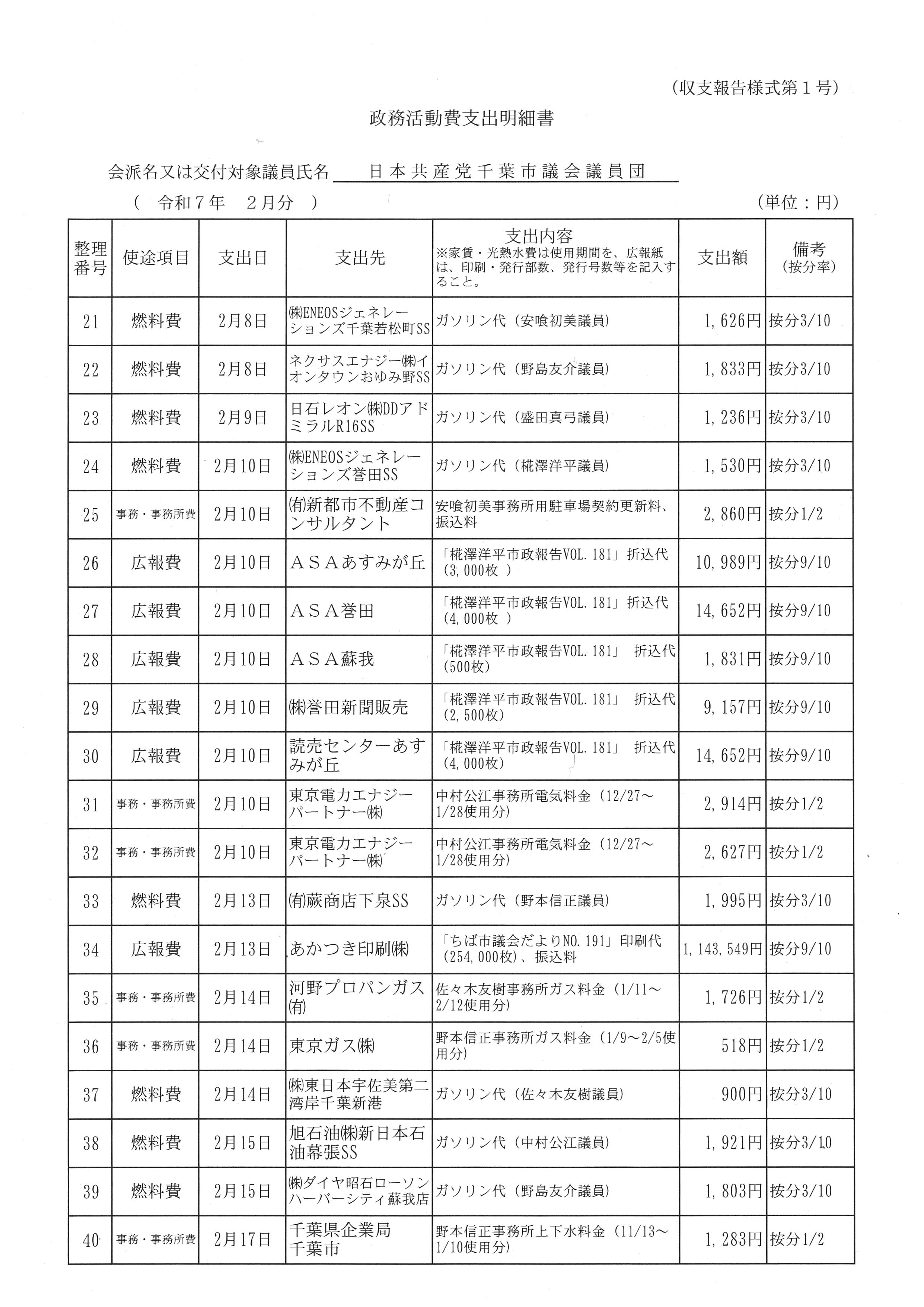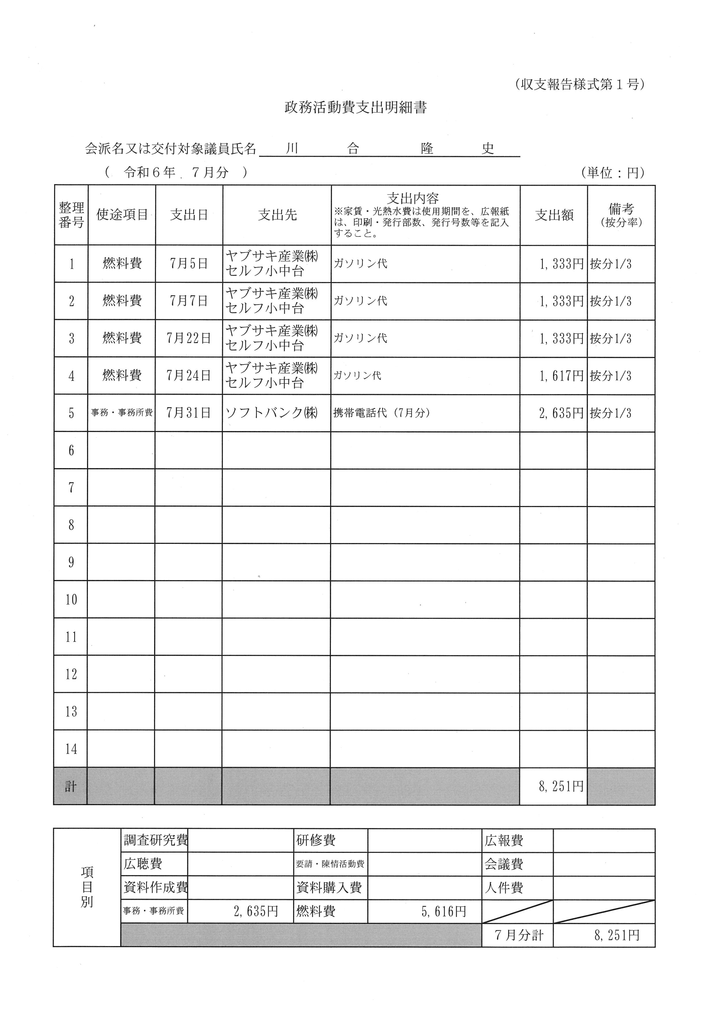 千葉市議会トップページ > 広報・情報公開 > 政務活動費 > 令和6年度交付分(政務活動費収支報告書)