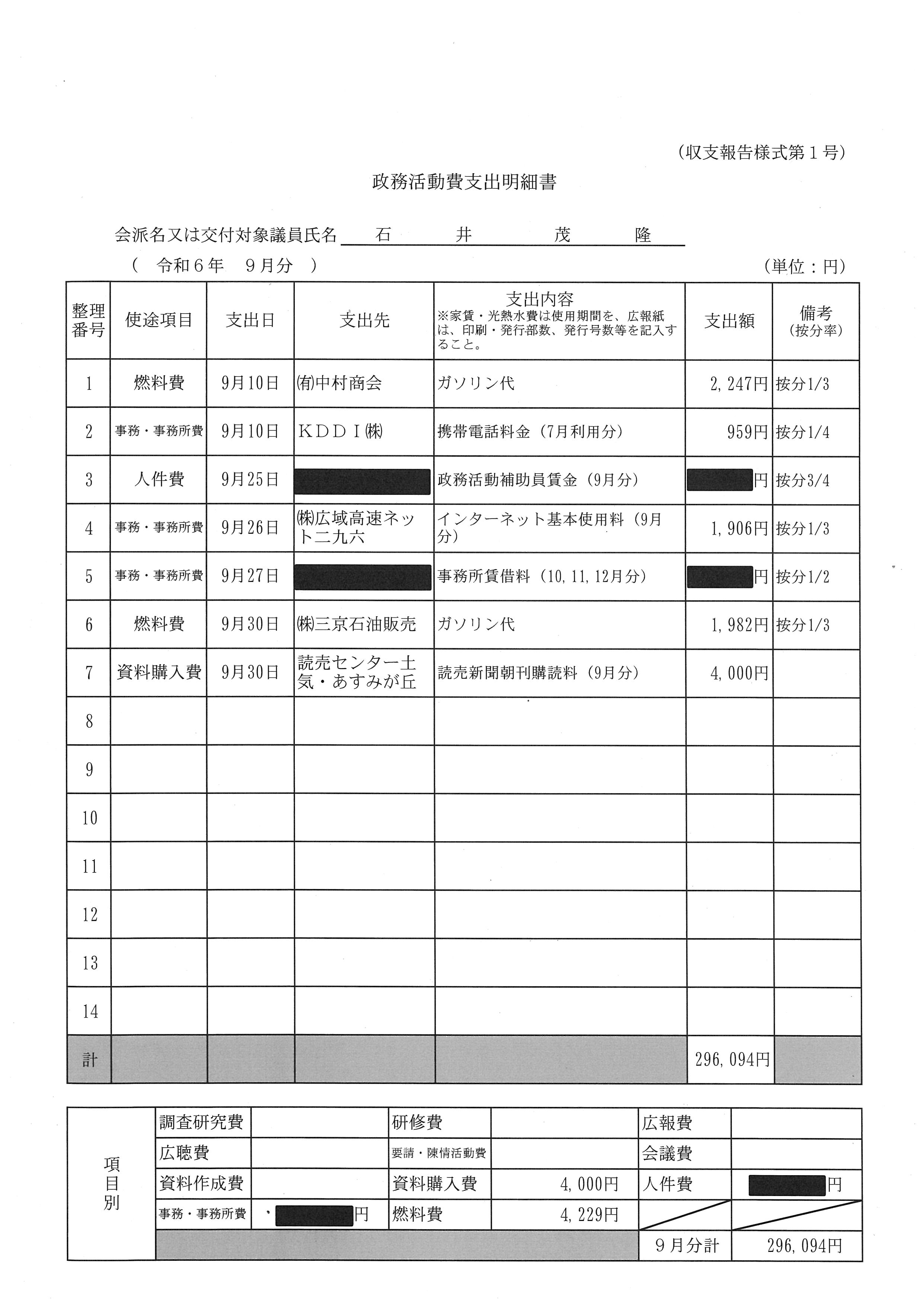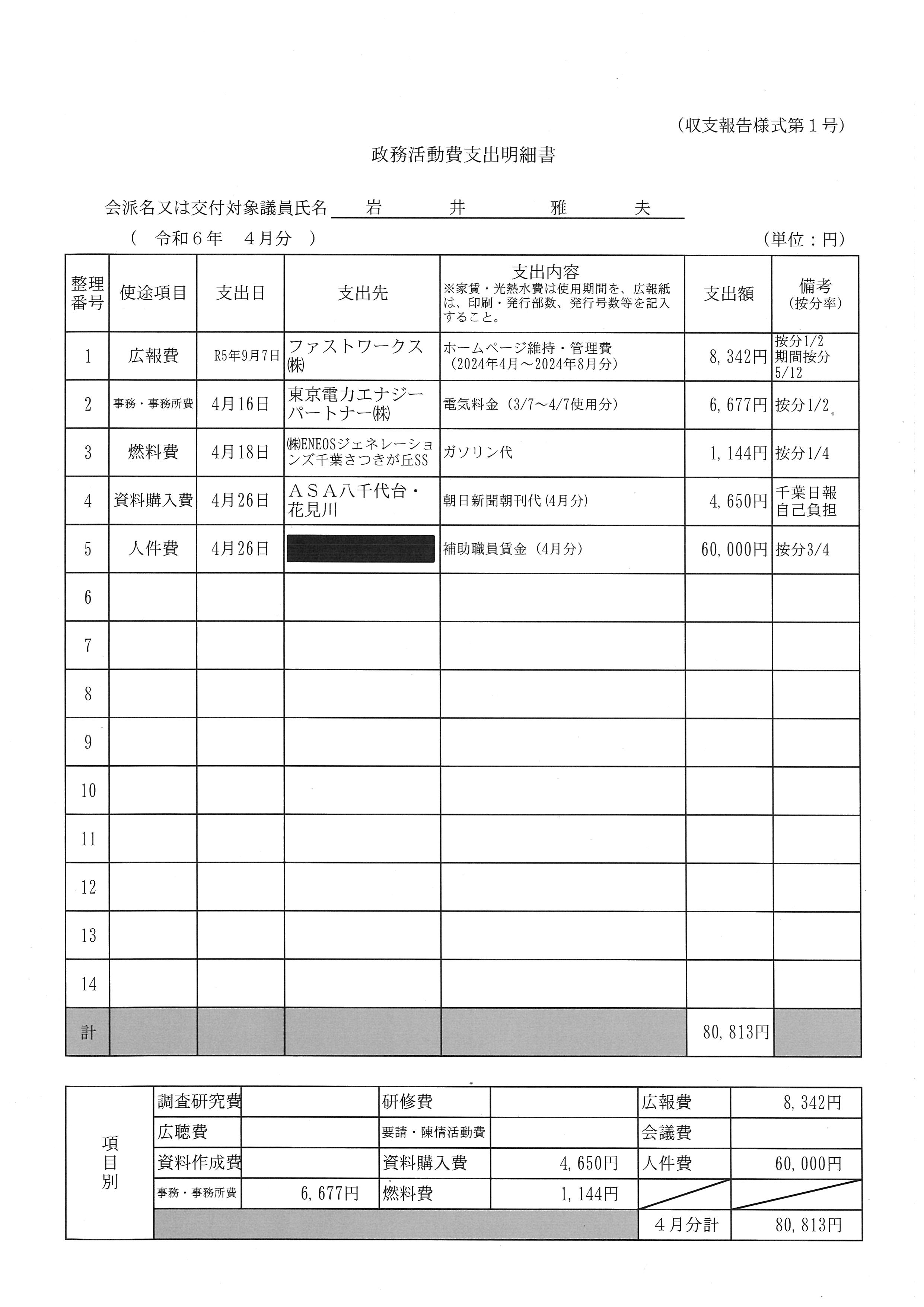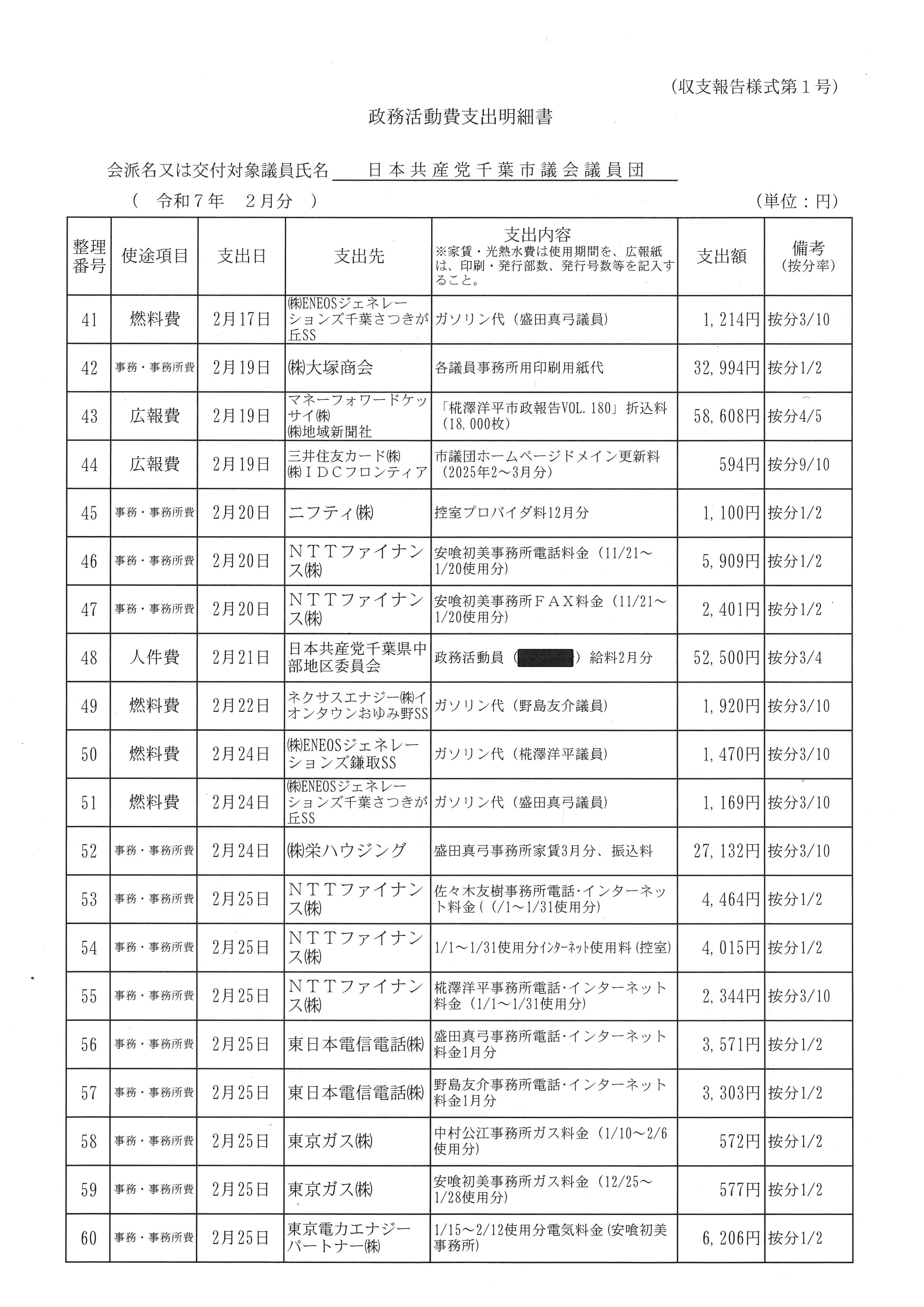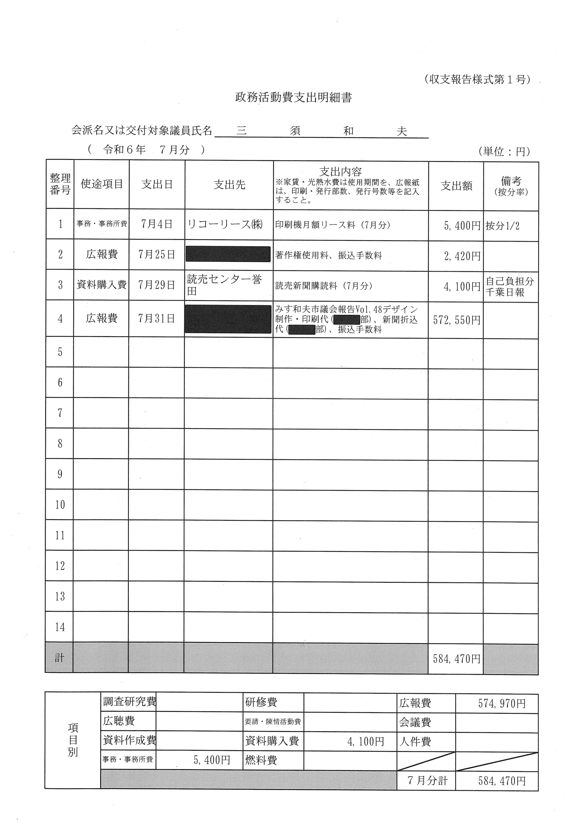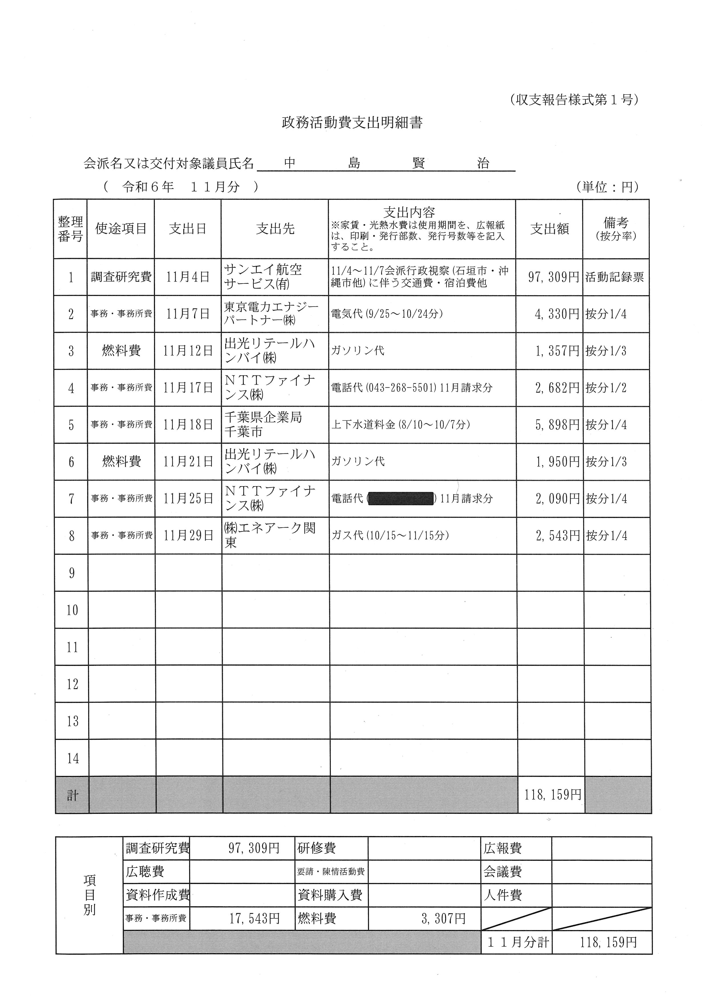 千葉市議会トップページ > 広報・情報公開 > 政務活動費 > 令和6年度交付分(政務活動費収支報告書)
