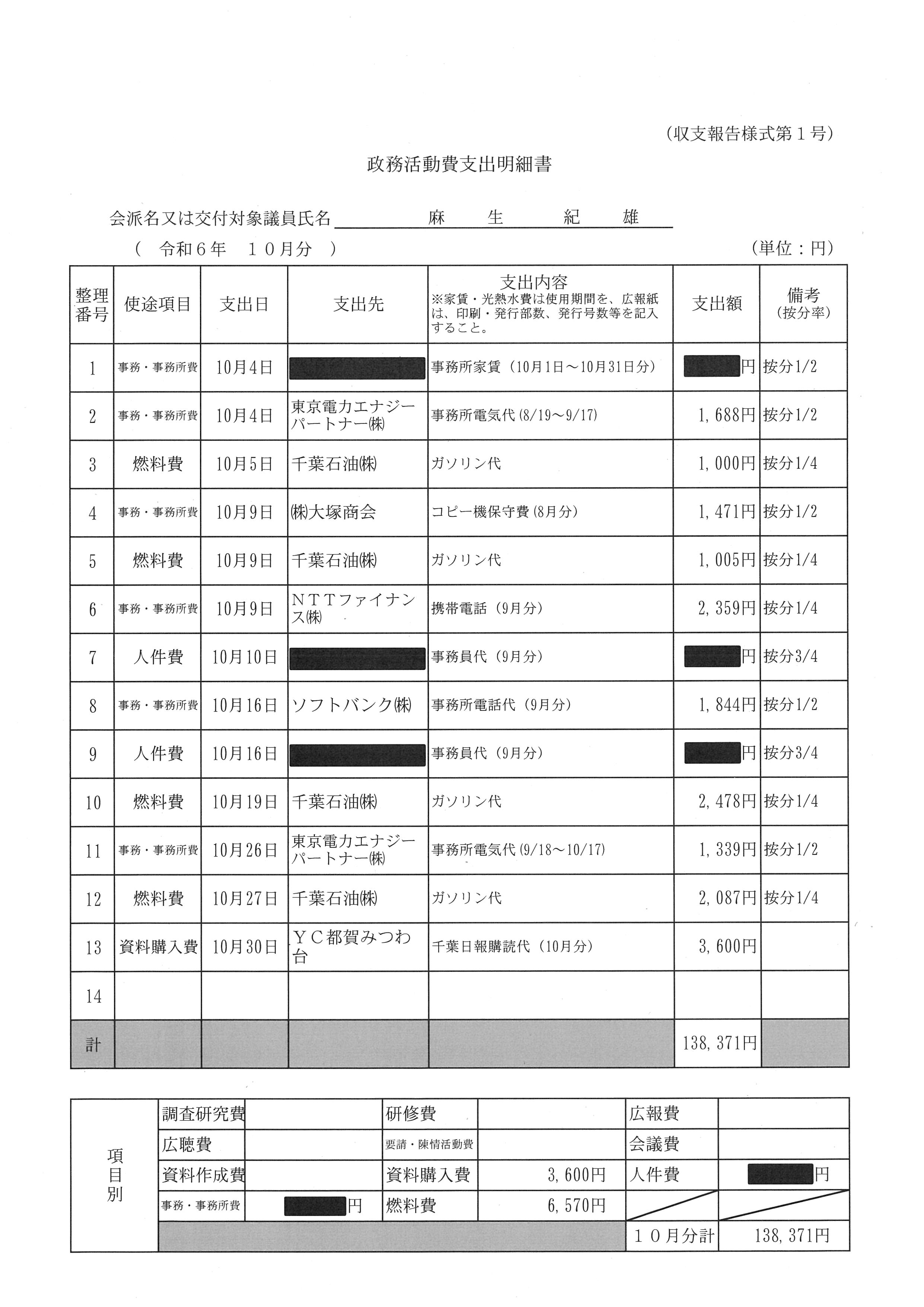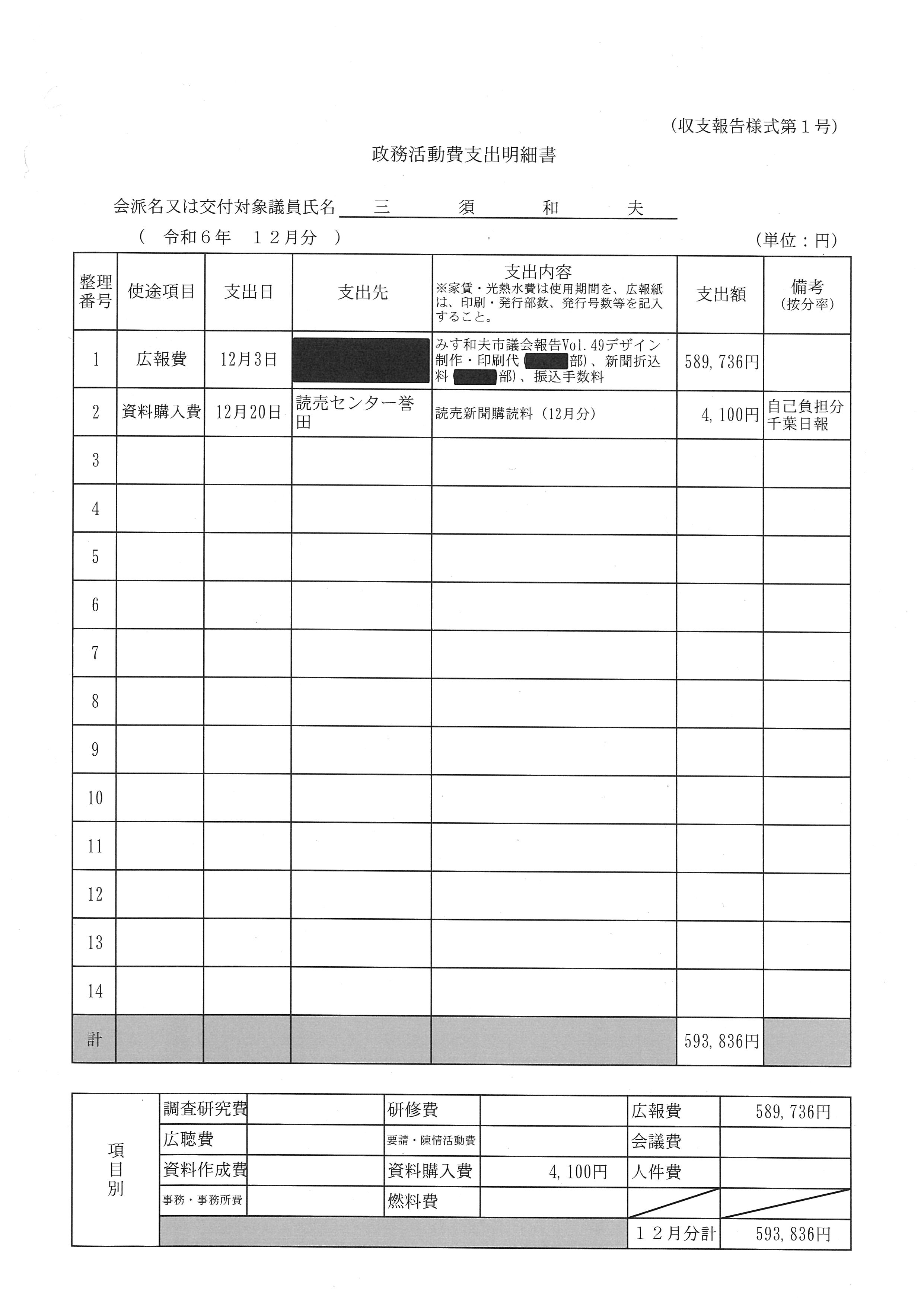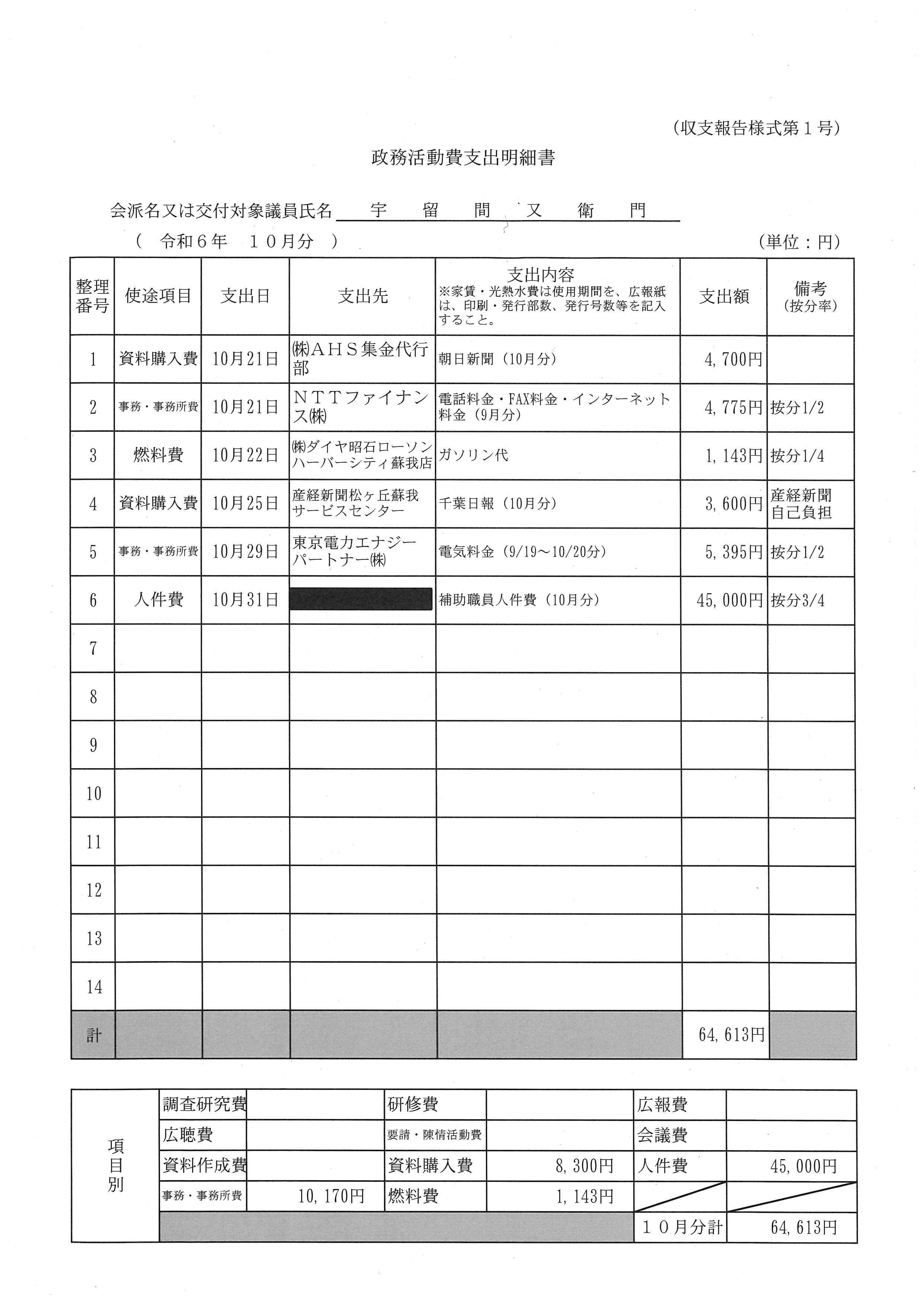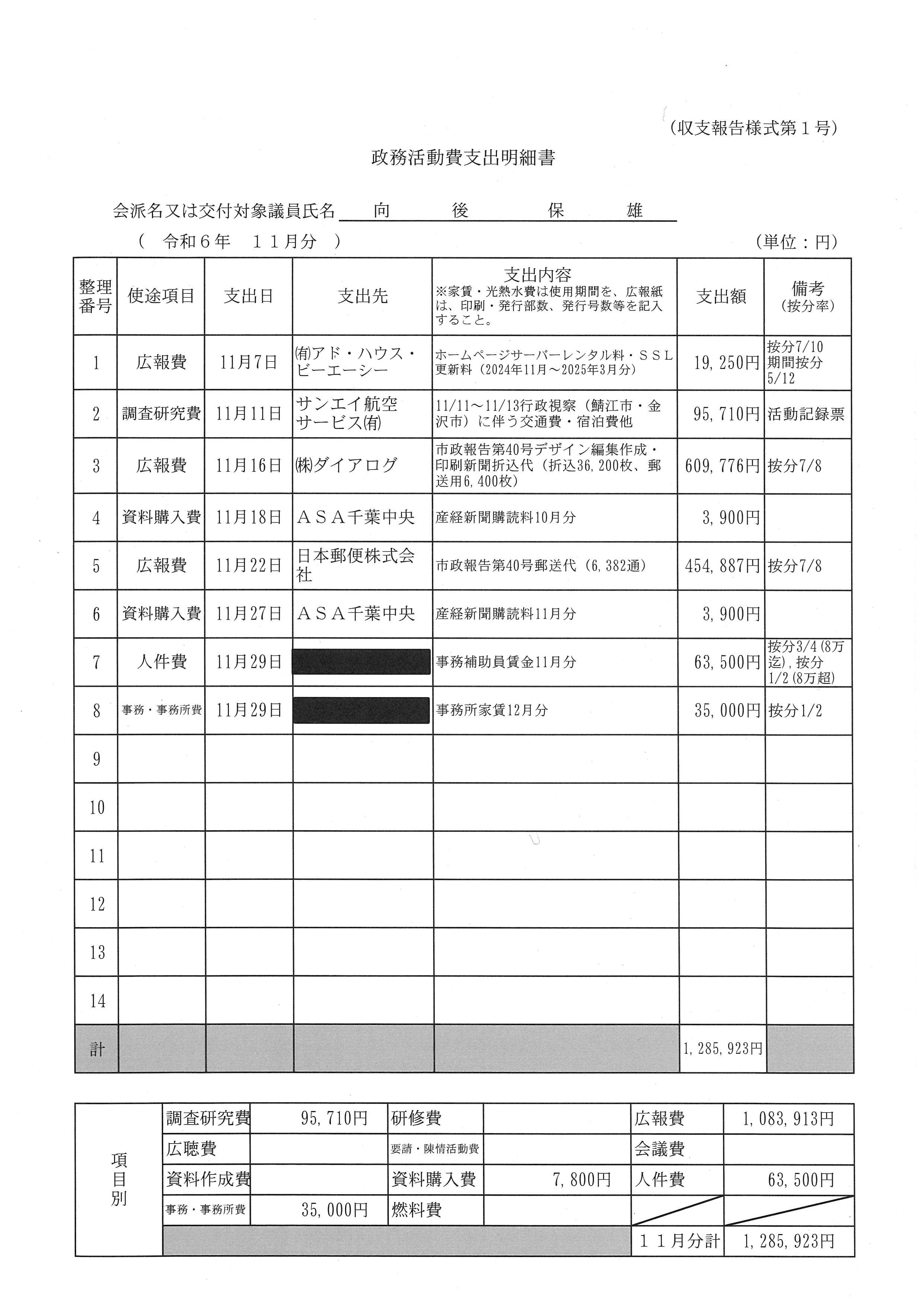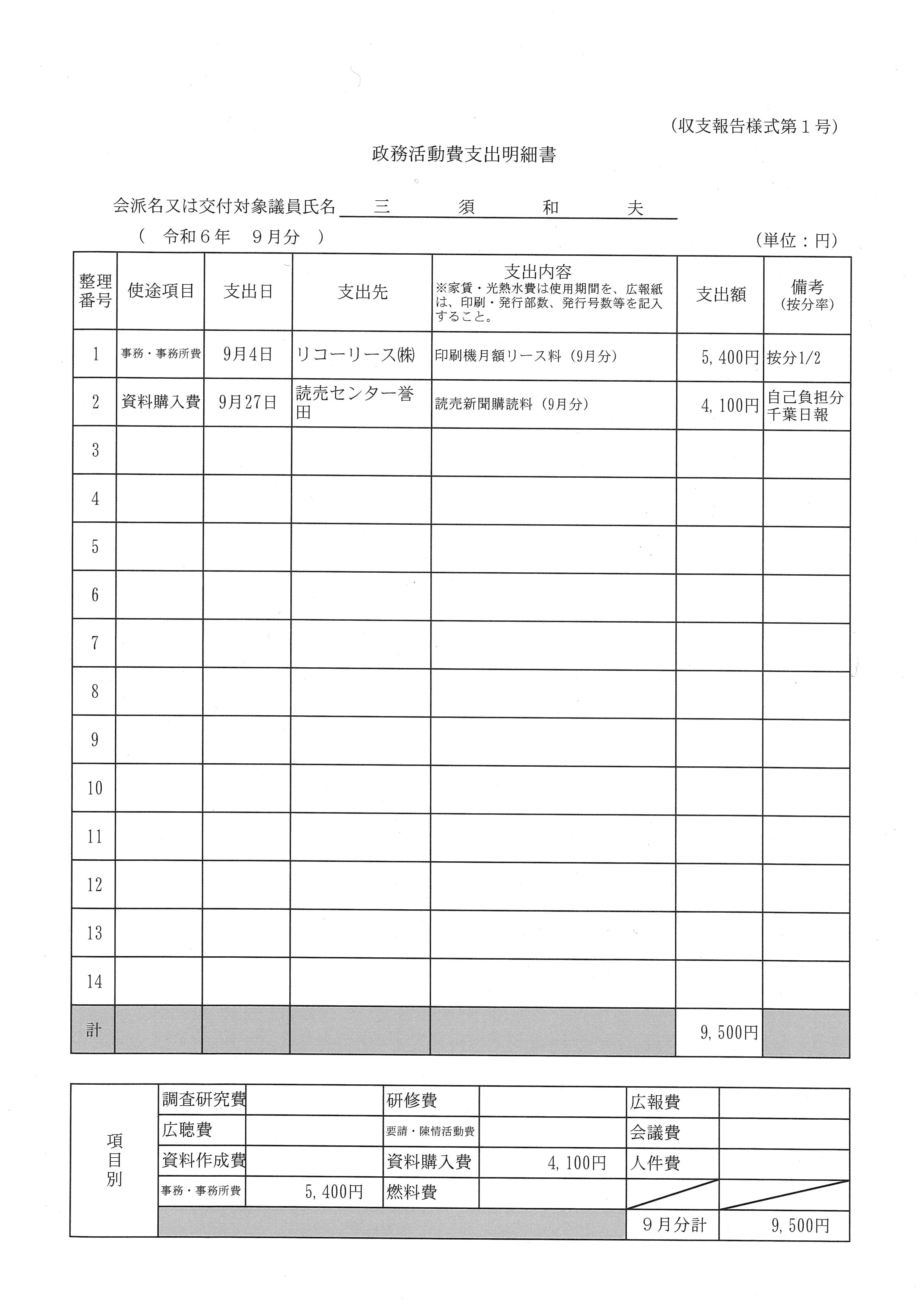 千葉市議会トップページ > 広報・情報公開 > 政務活動費 > 令和6年度交付分(政務活動費収支報告書)