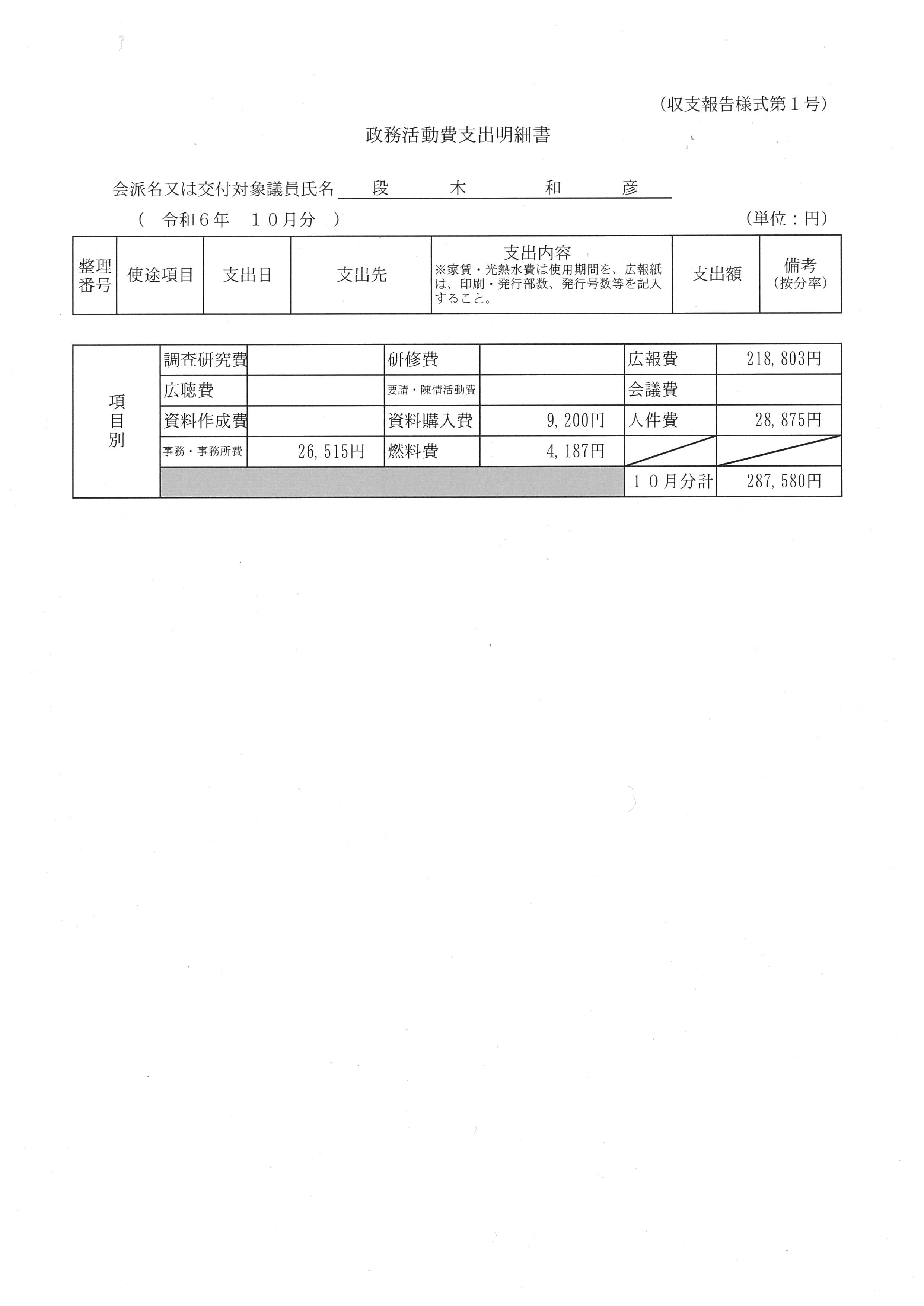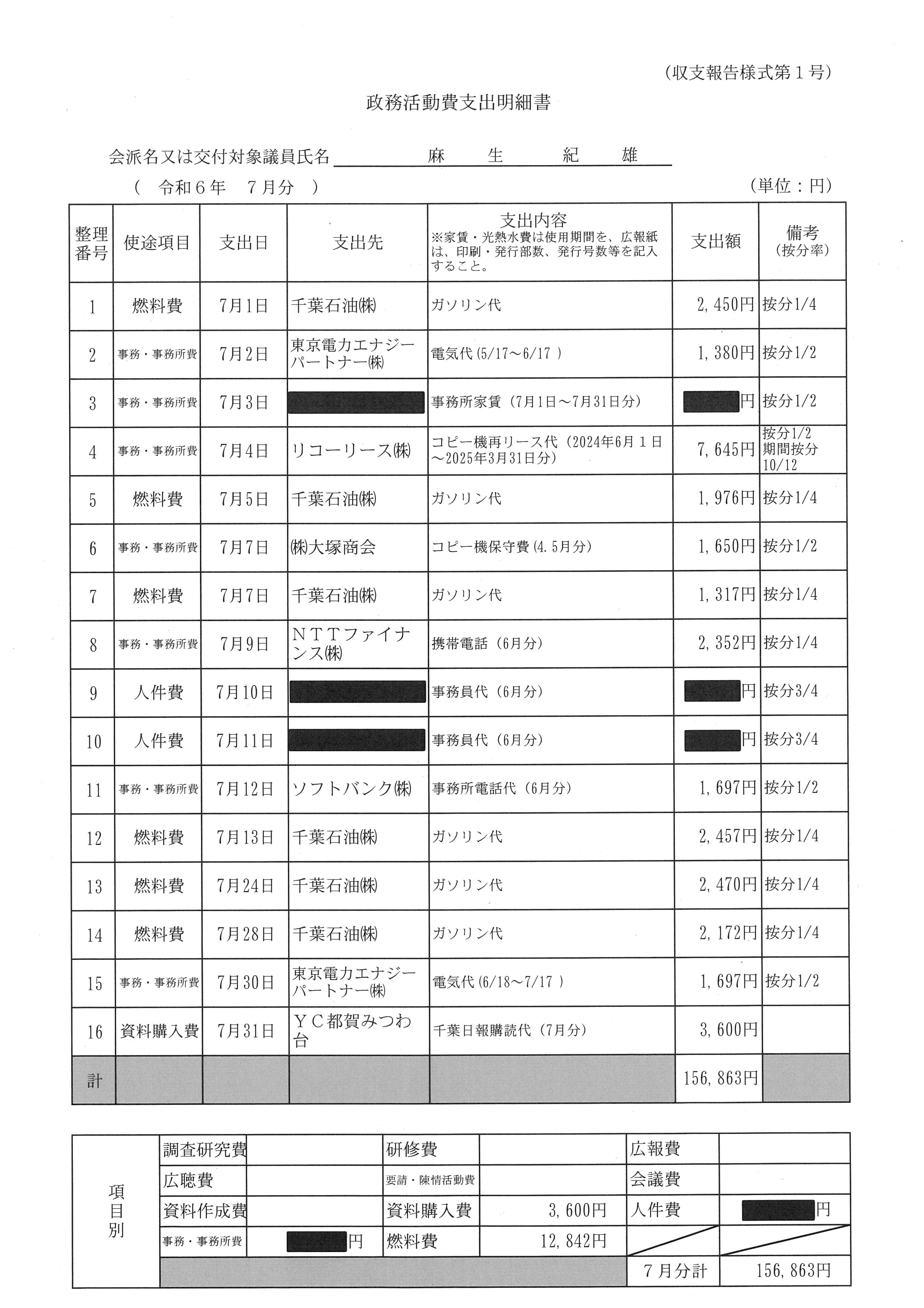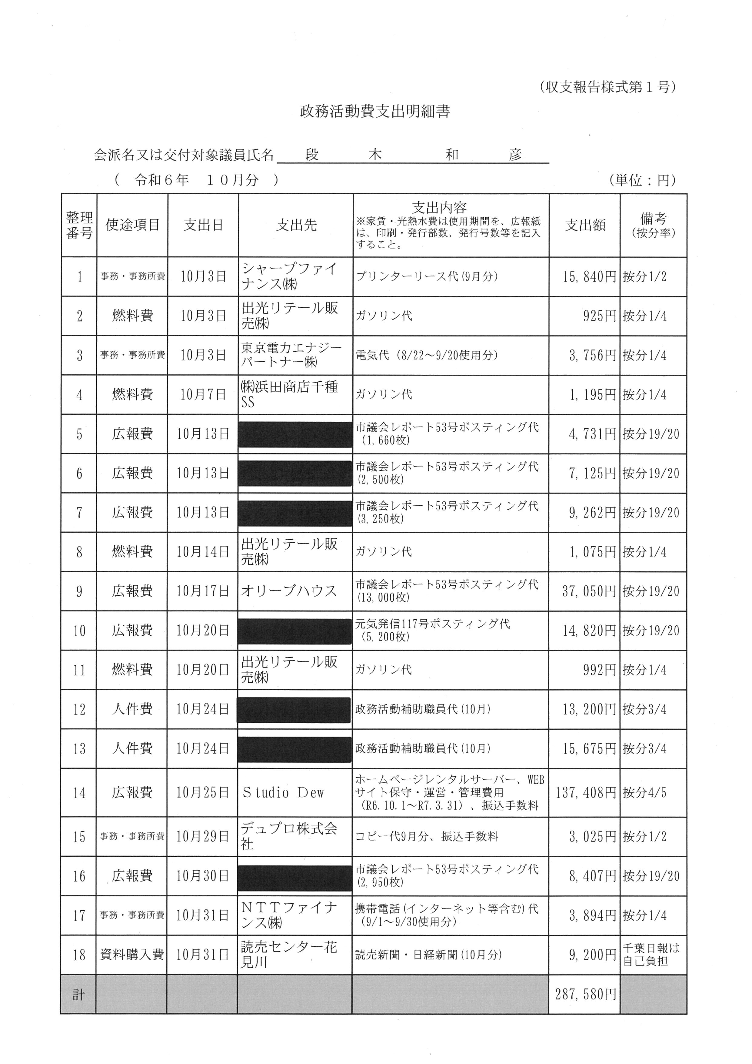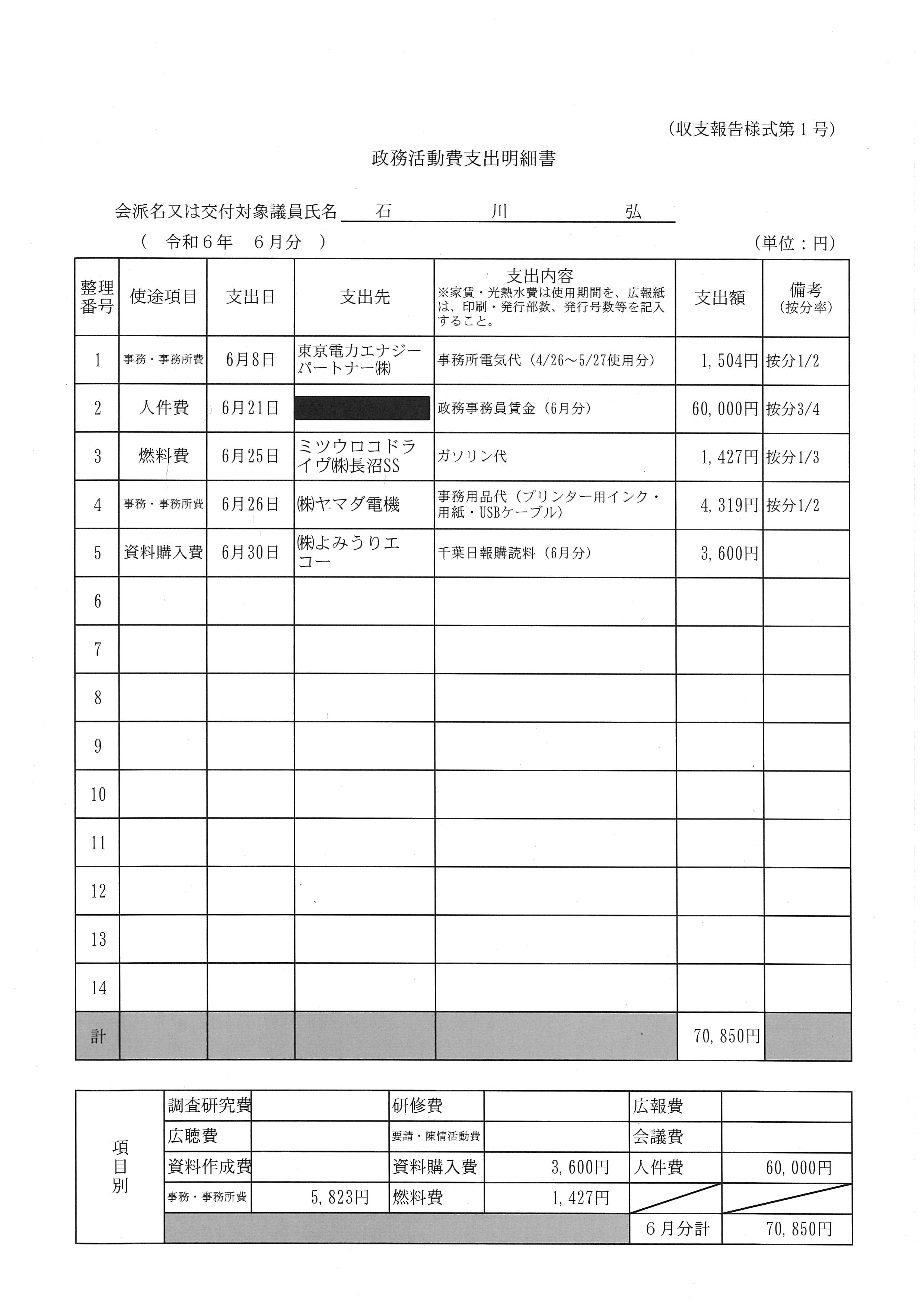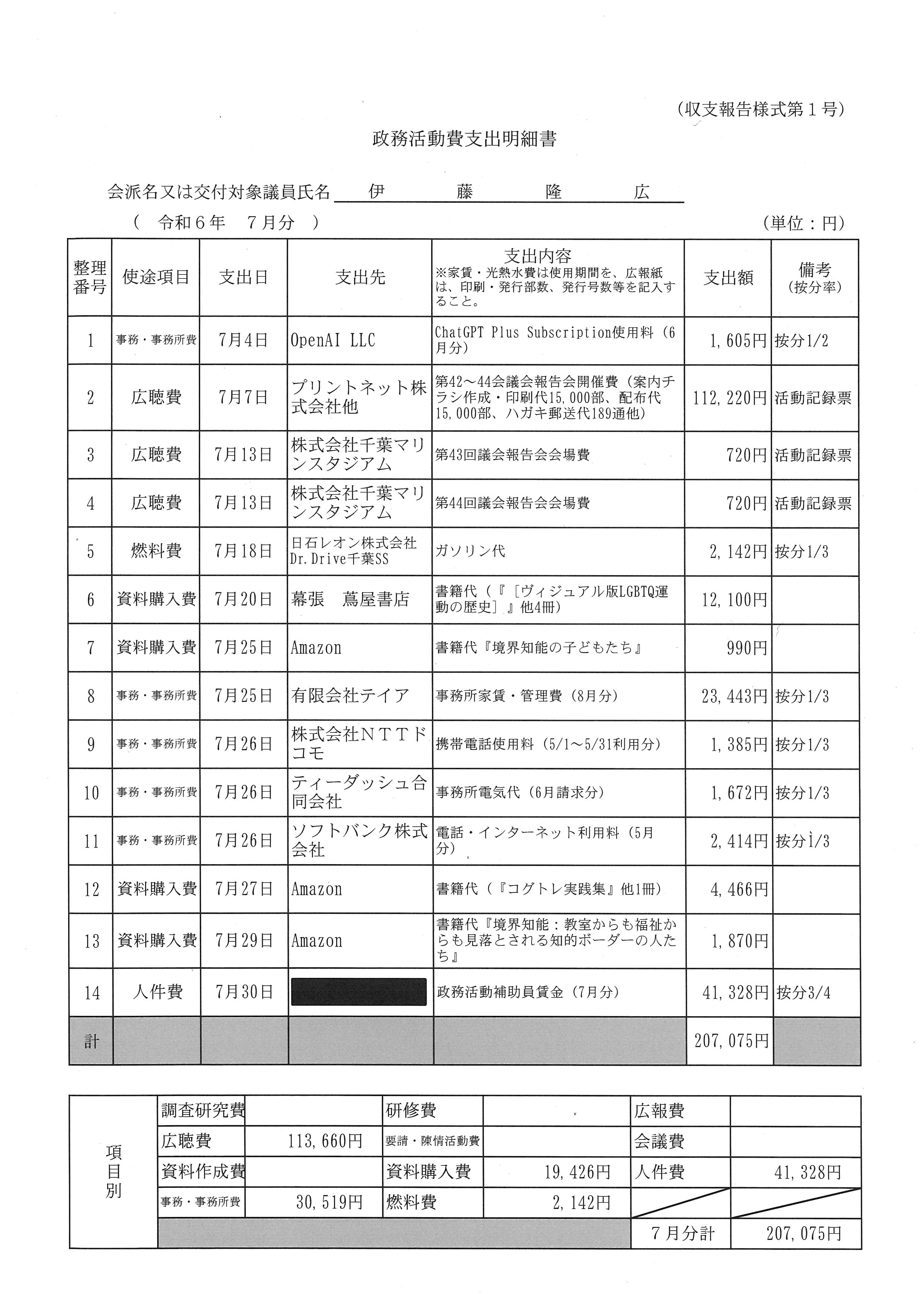 千葉市議会トップページ > 広報・情報公開 > 政務活動費 > 令和6年度交付分(政務活動費収支報告書)