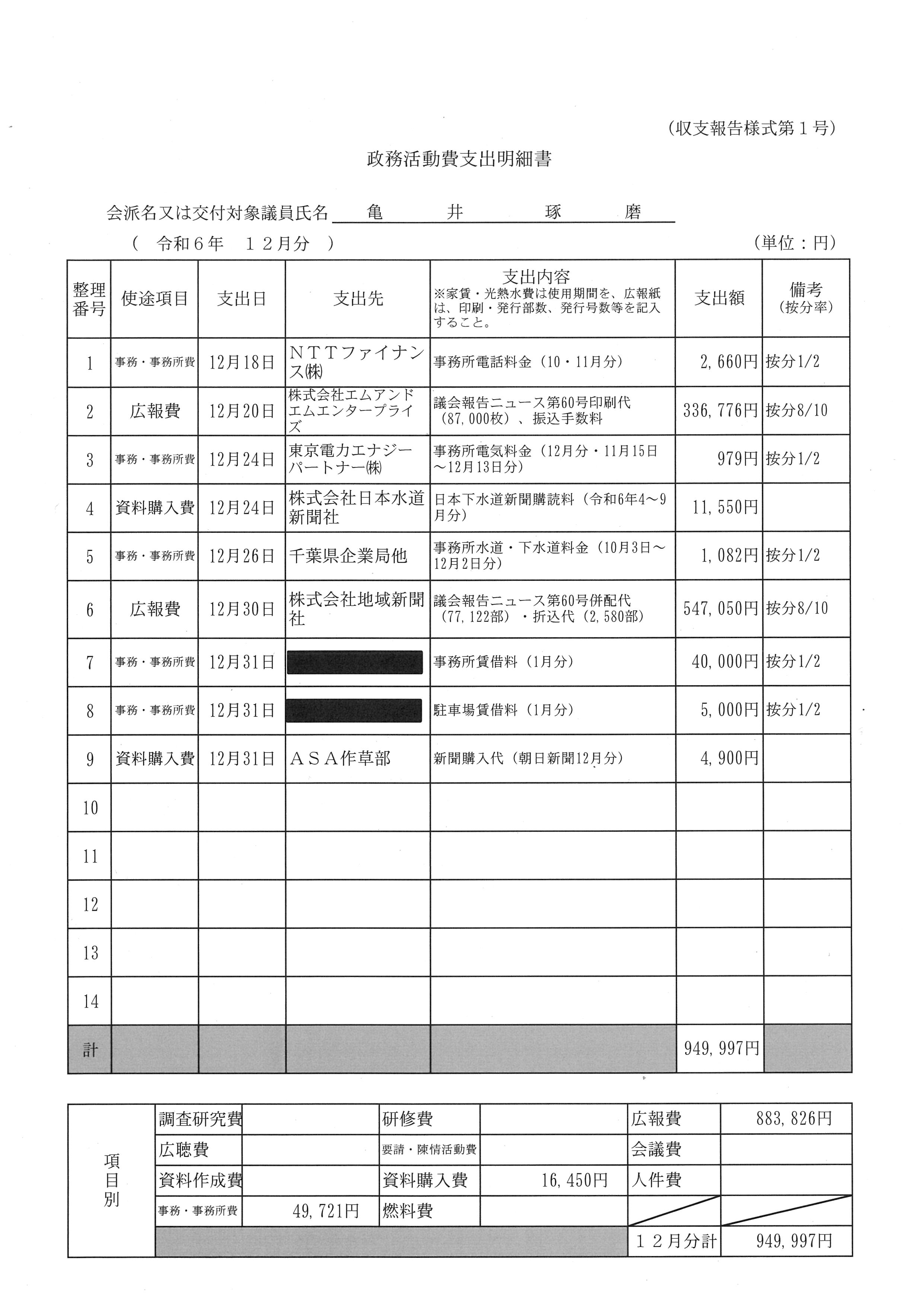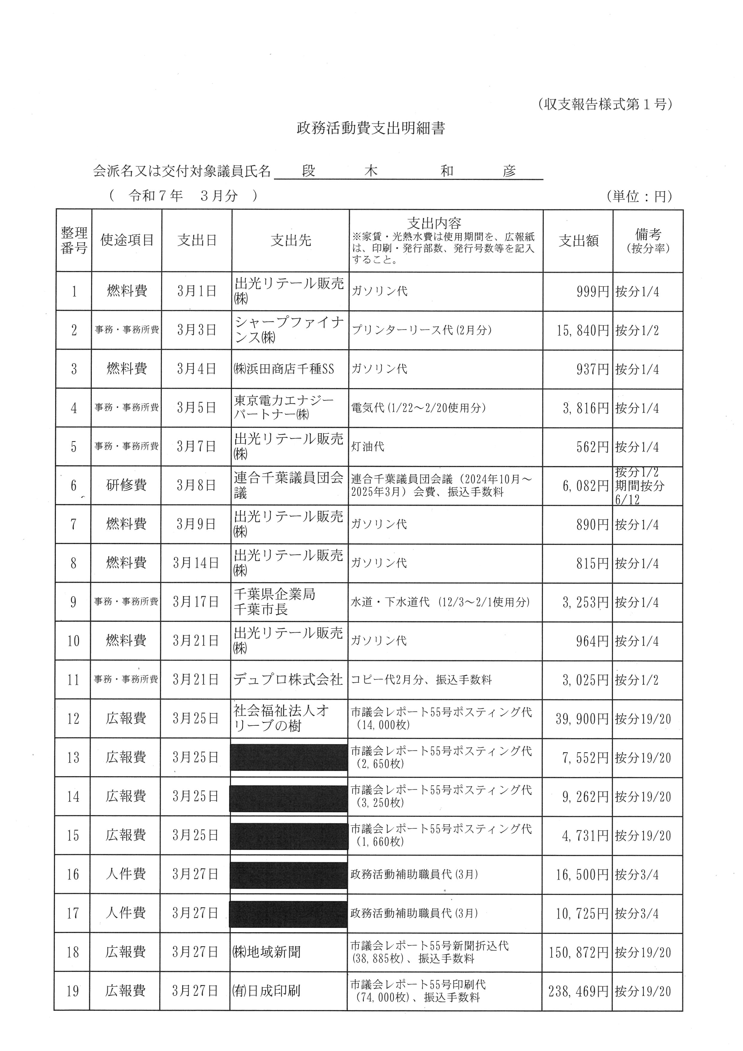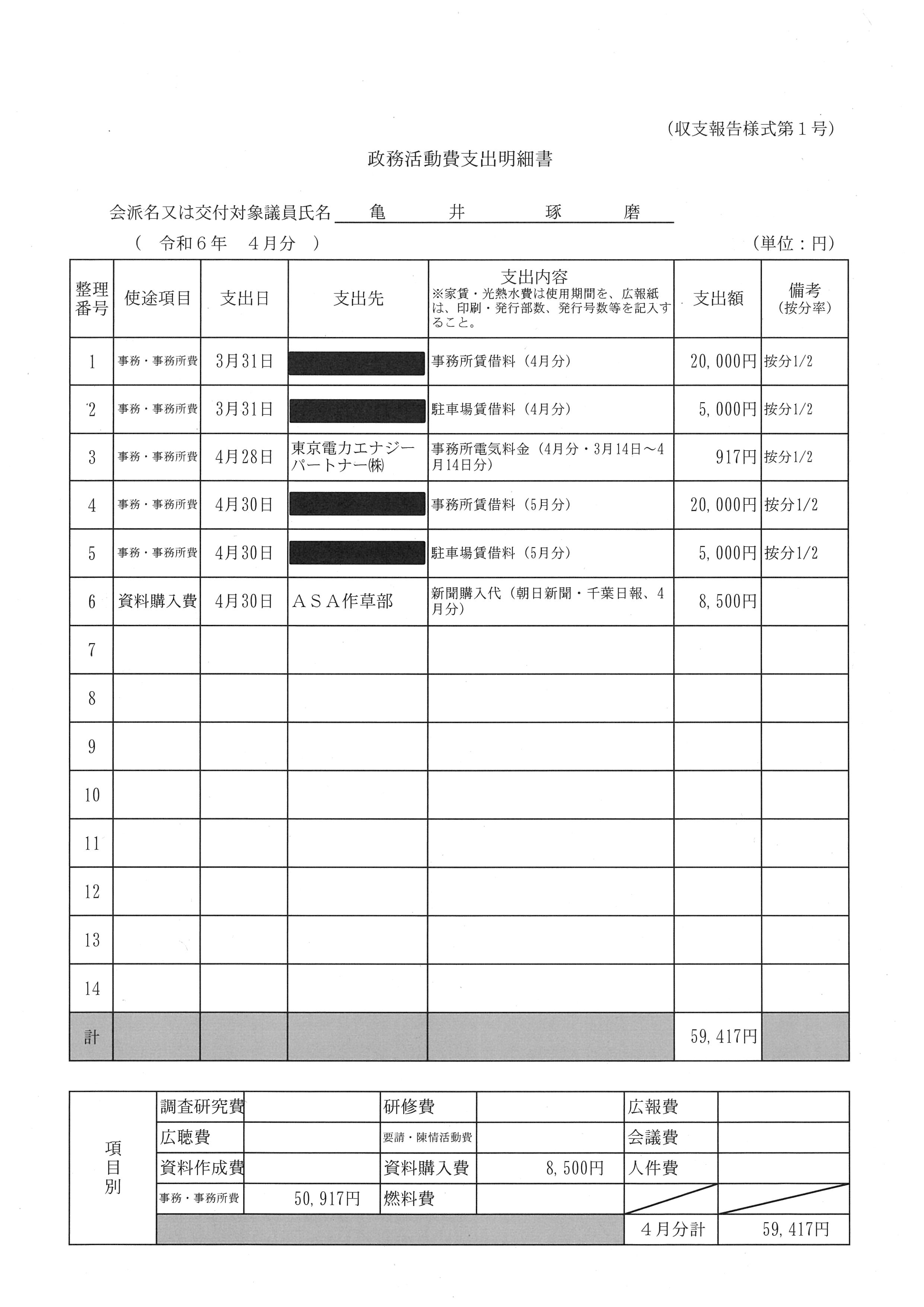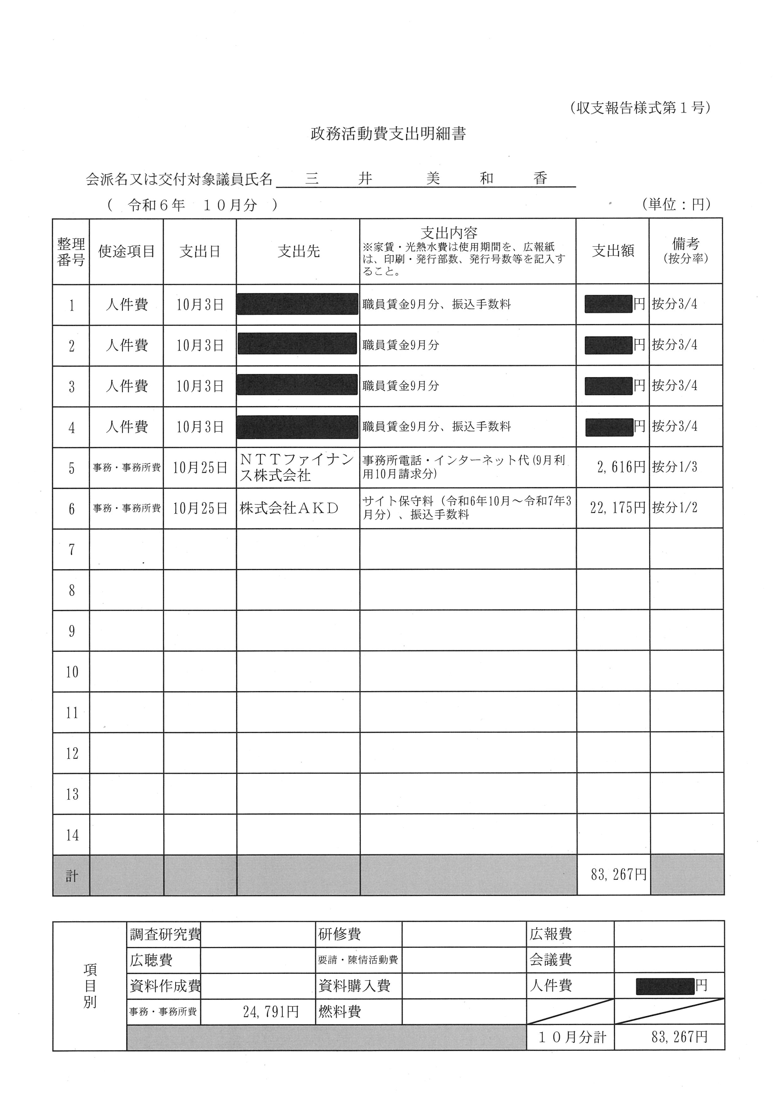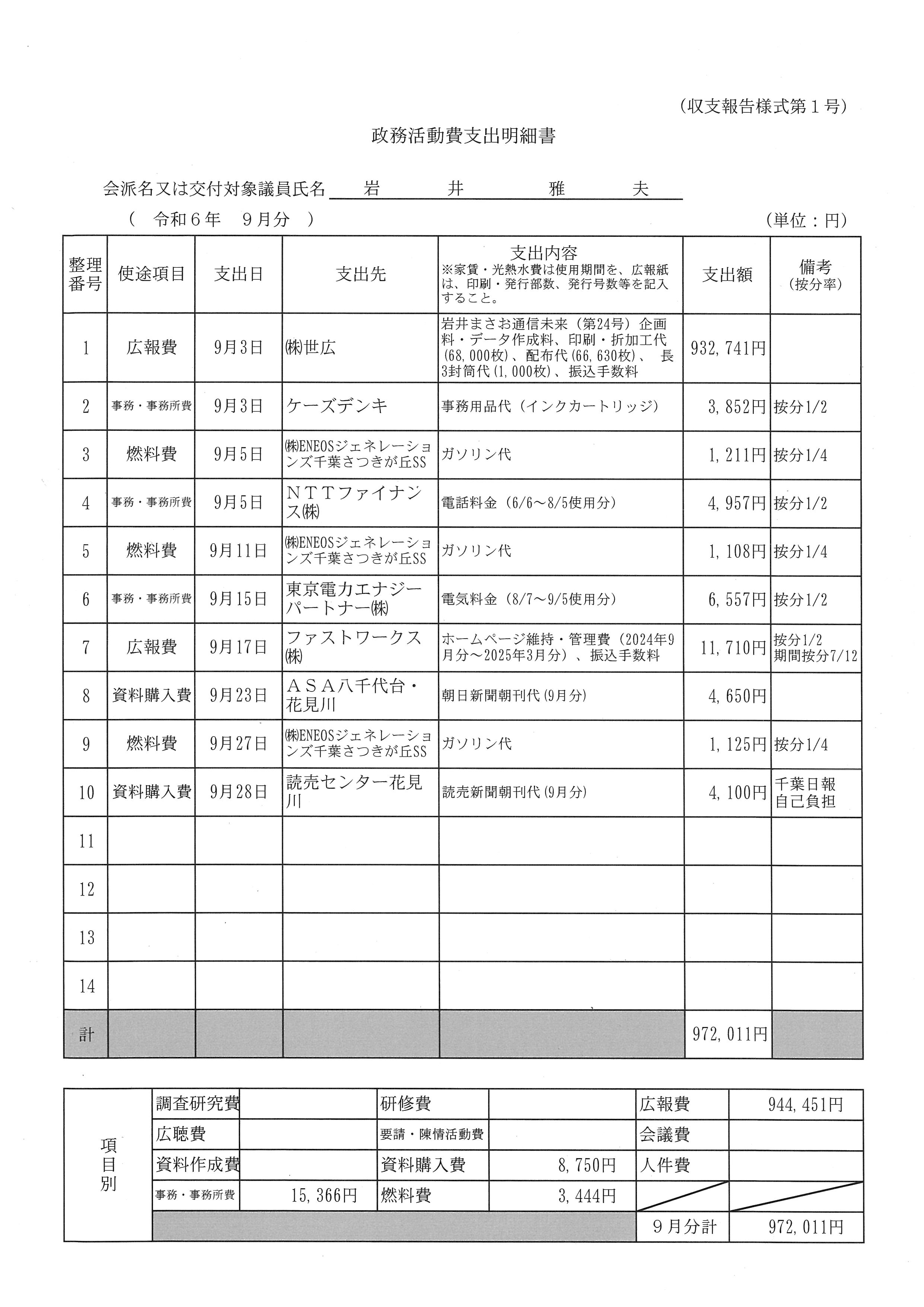 千葉市議会トップページ > 広報・情報公開 > 政務活動費 > 令和6年度交付分(政務活動費収支報告書)