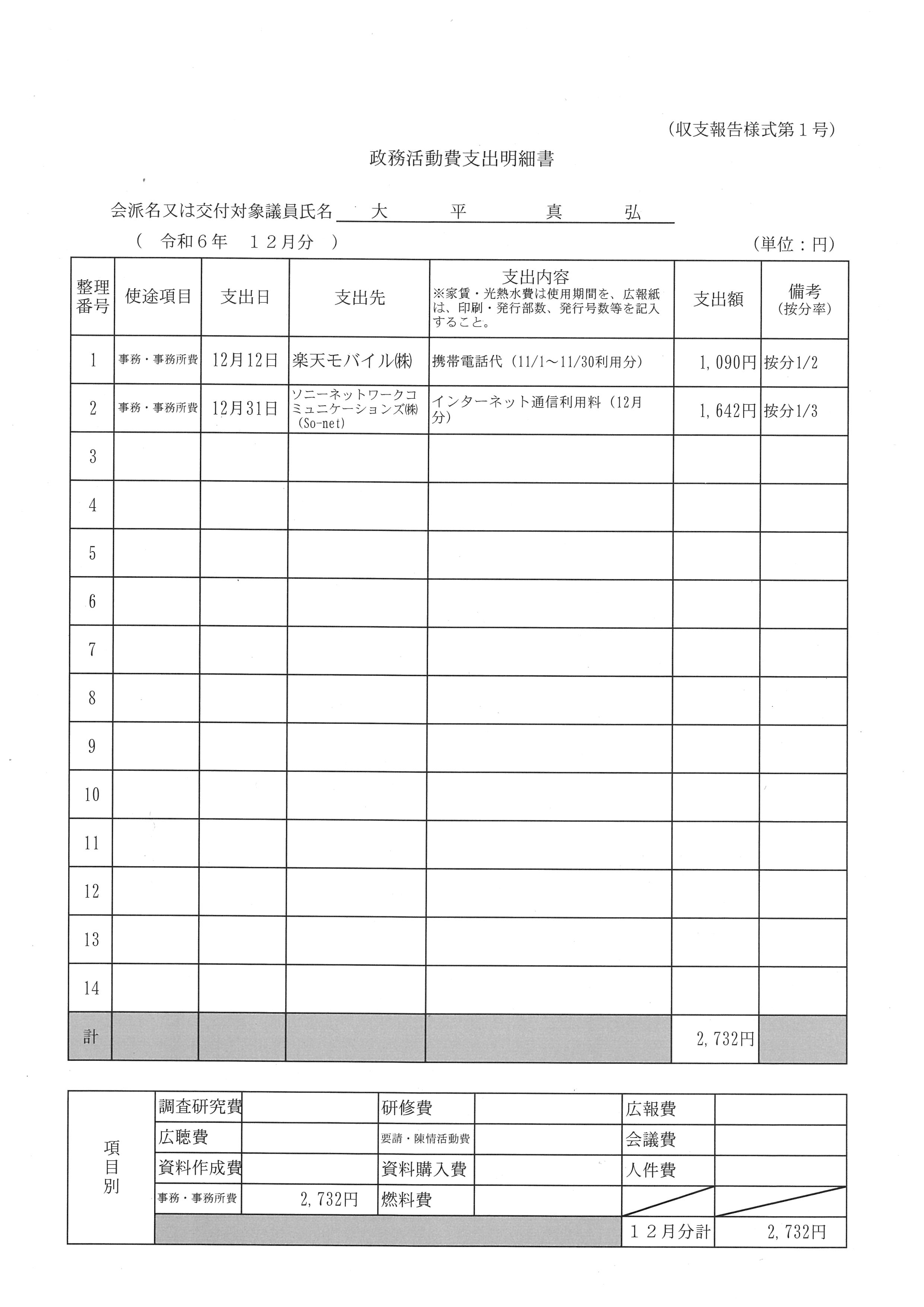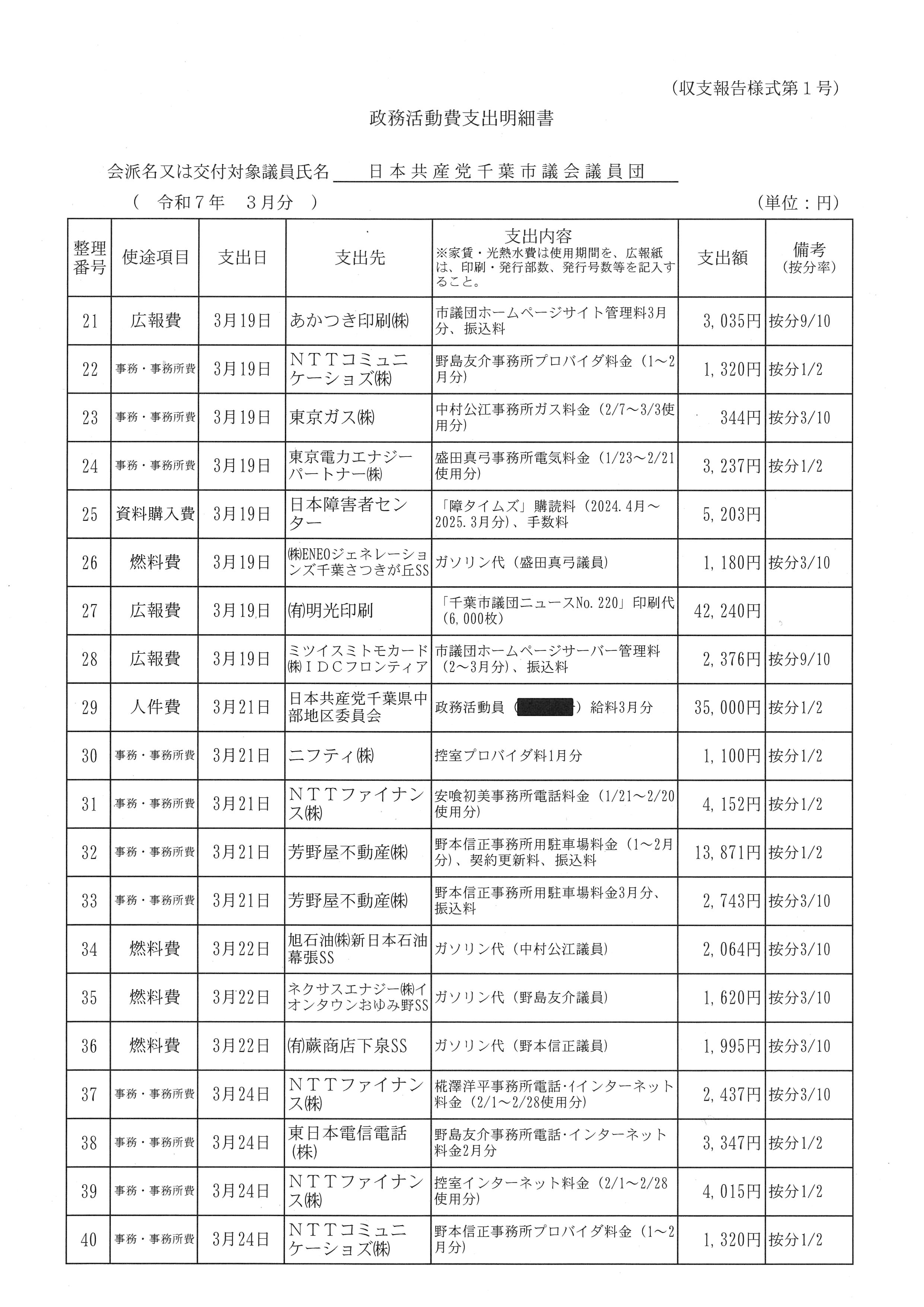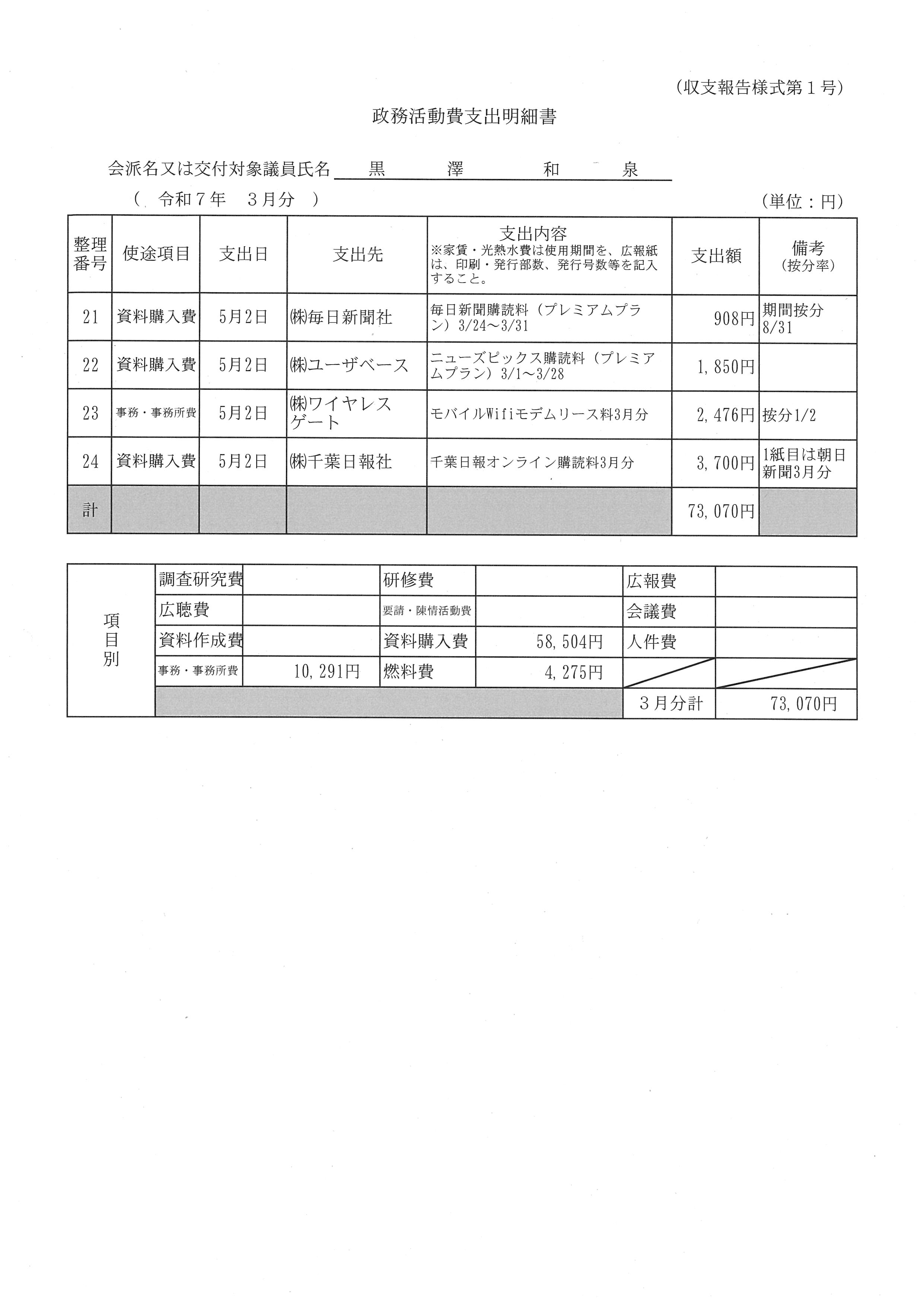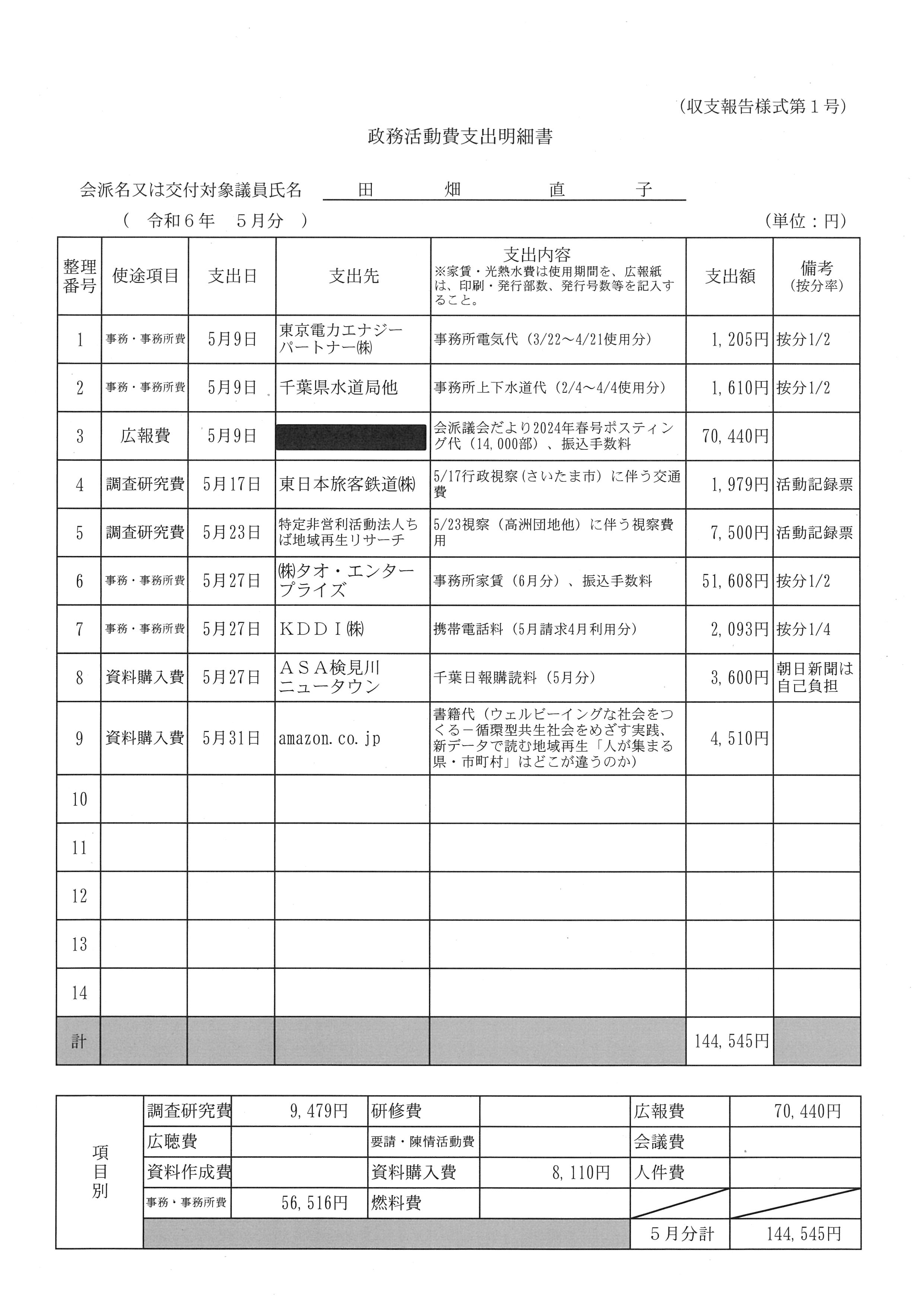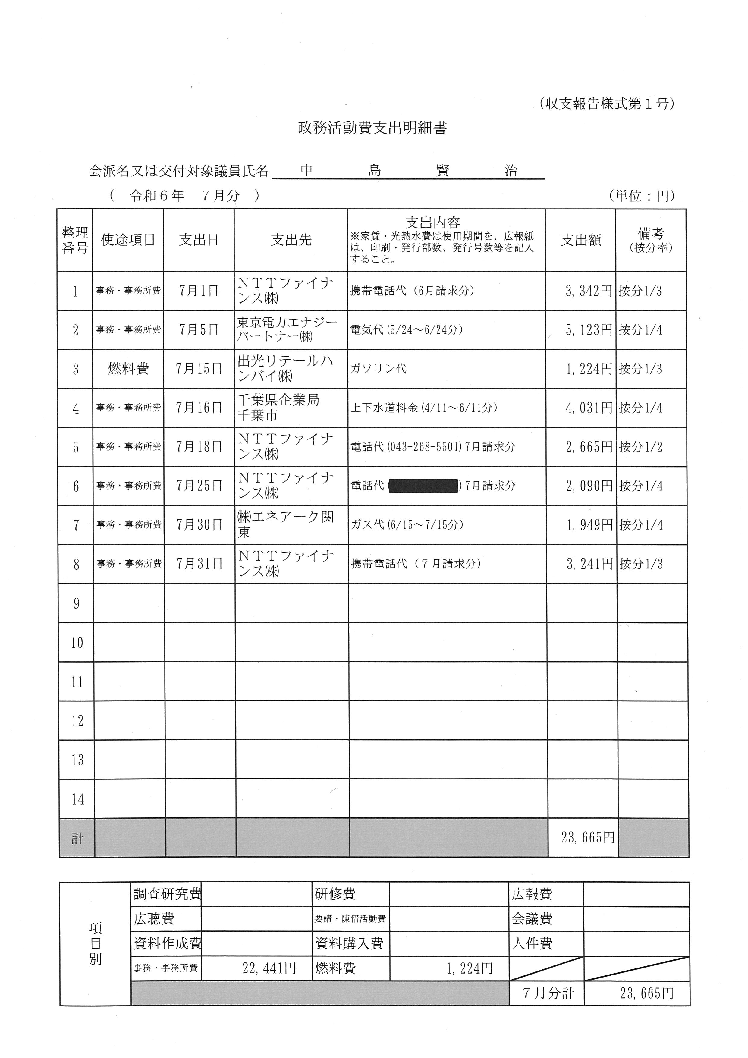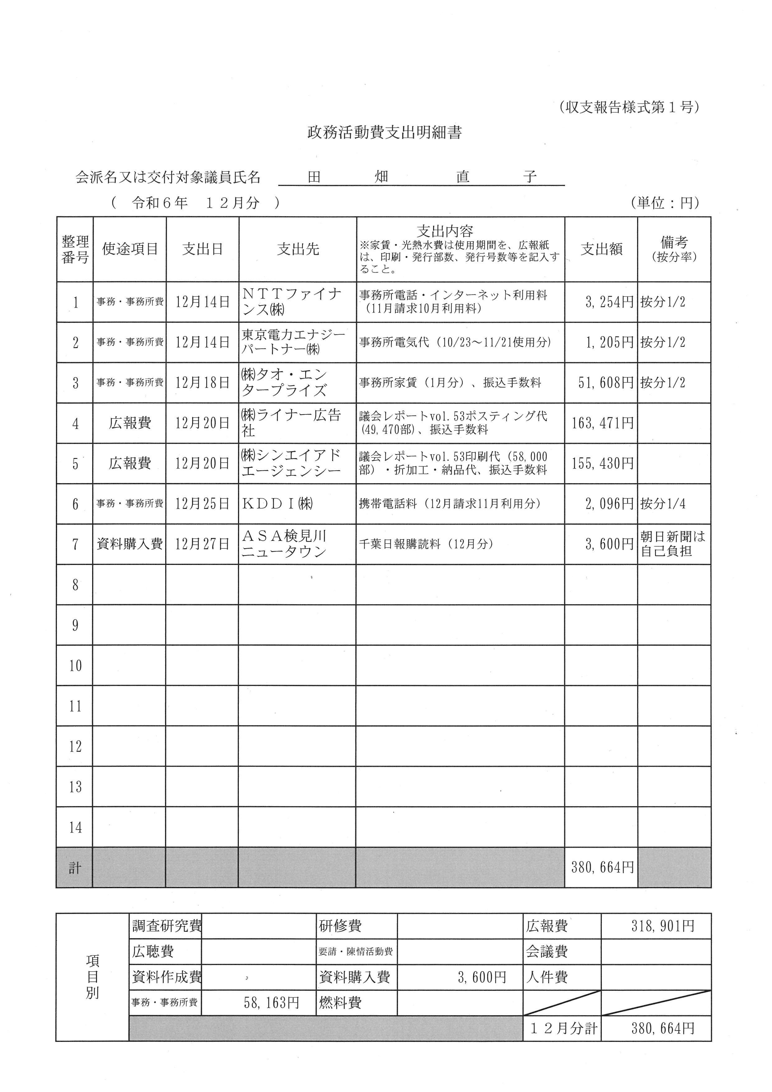 千葉市議会トップページ > 広報・情報公開 > 政務活動費 > 令和6年度交付分(政務活動費収支報告書)