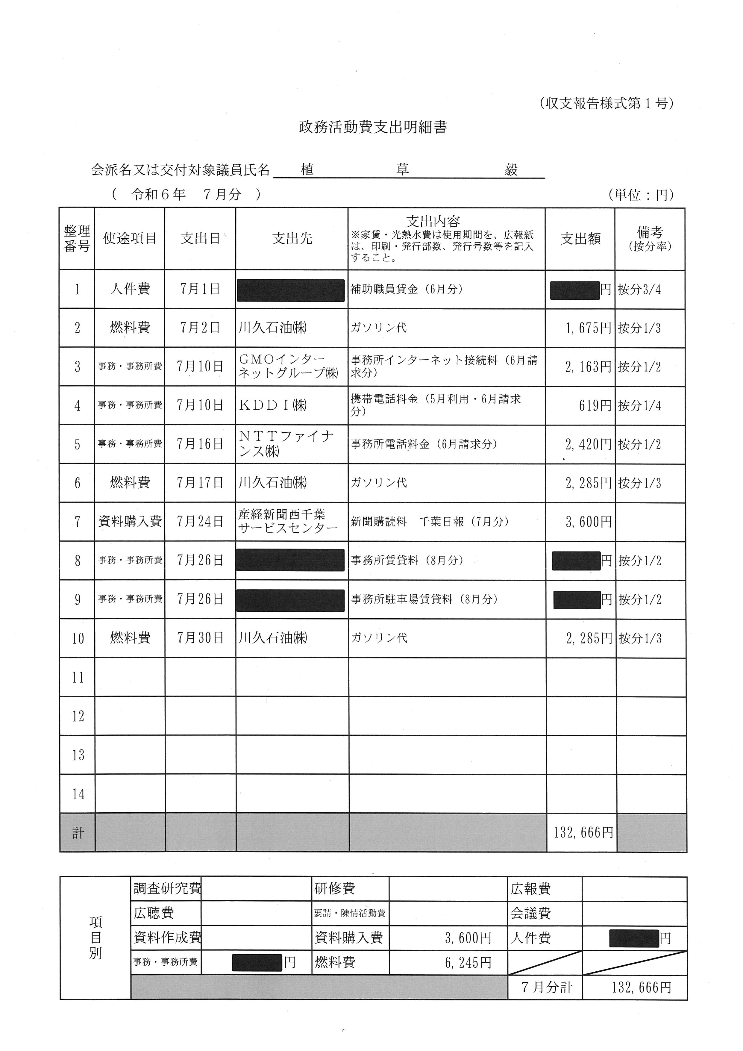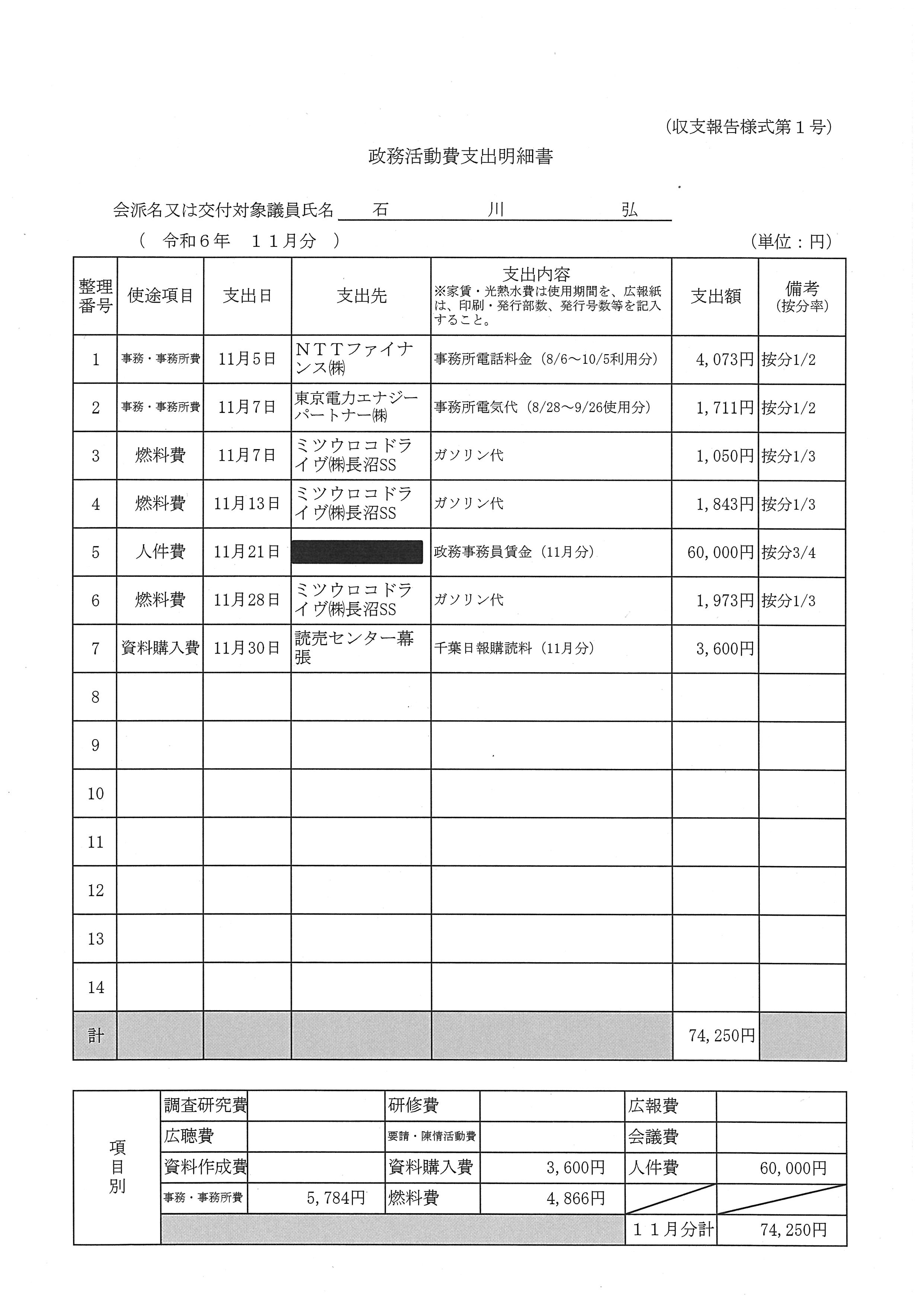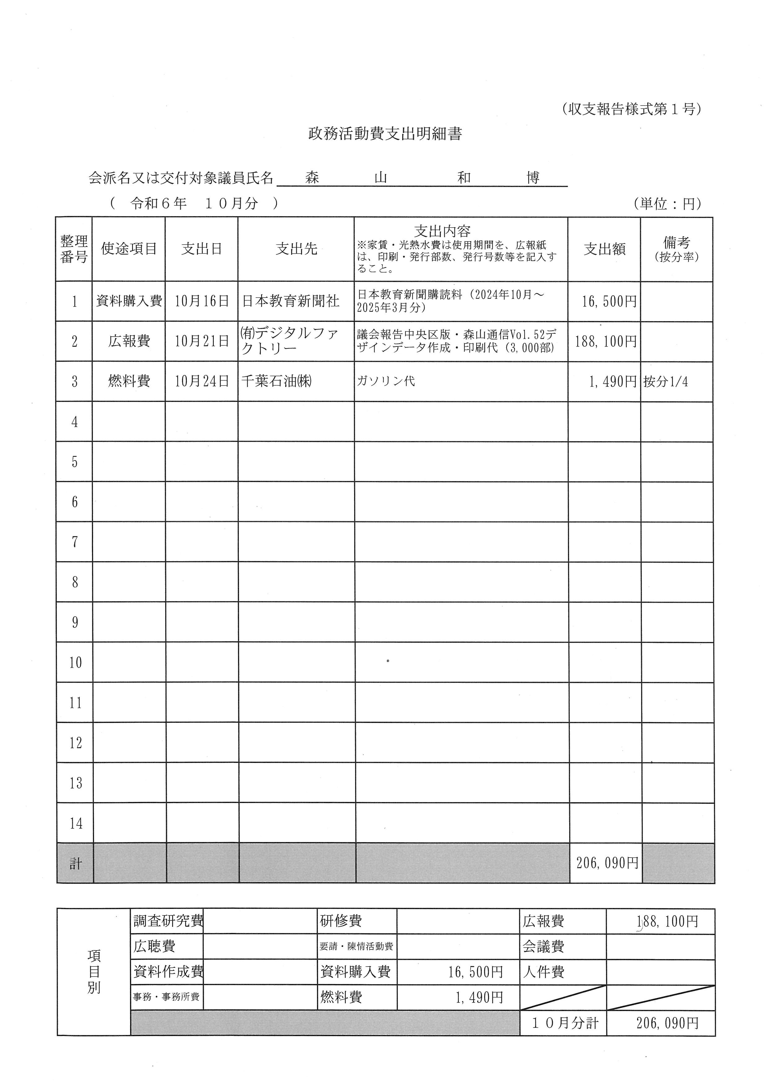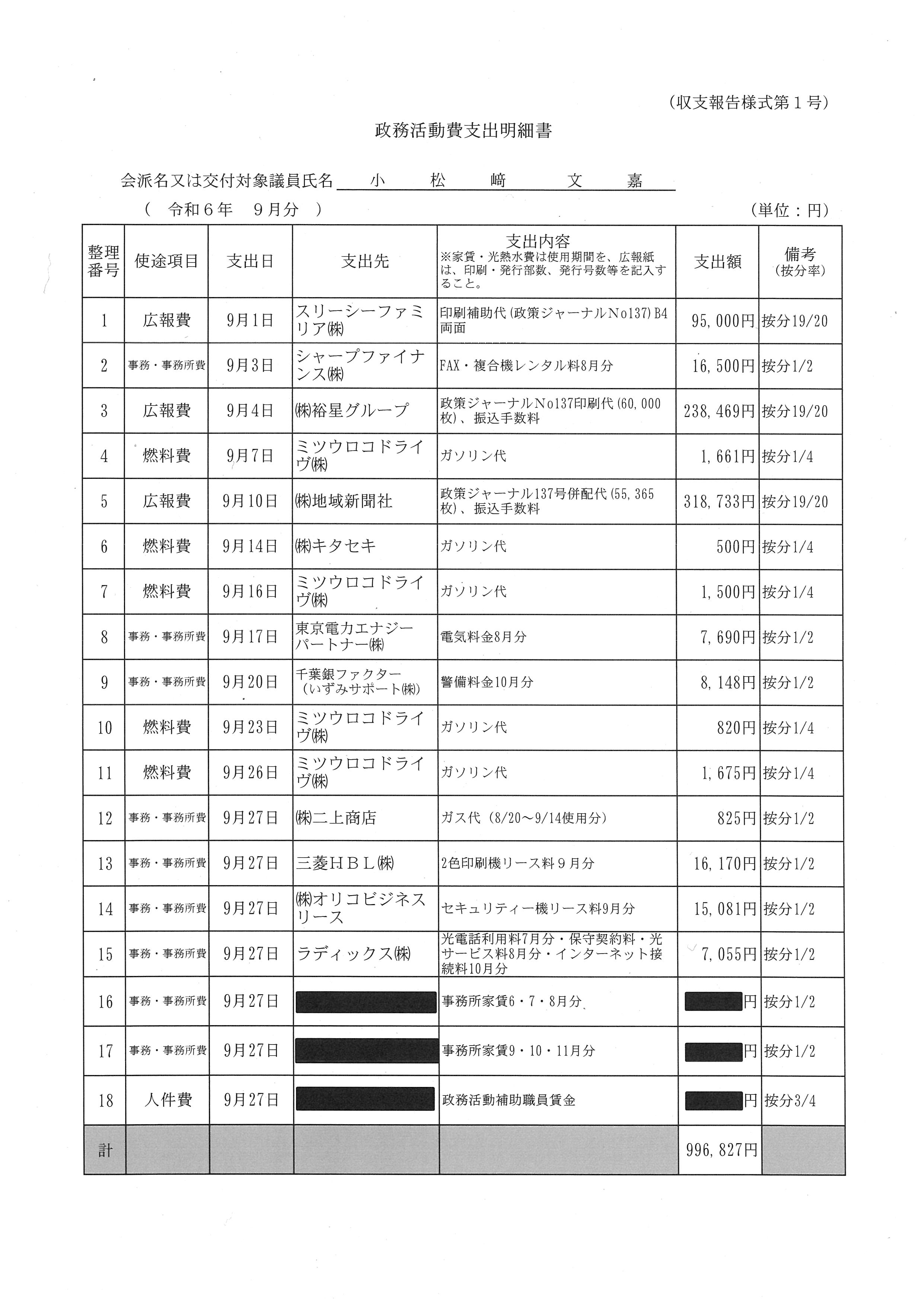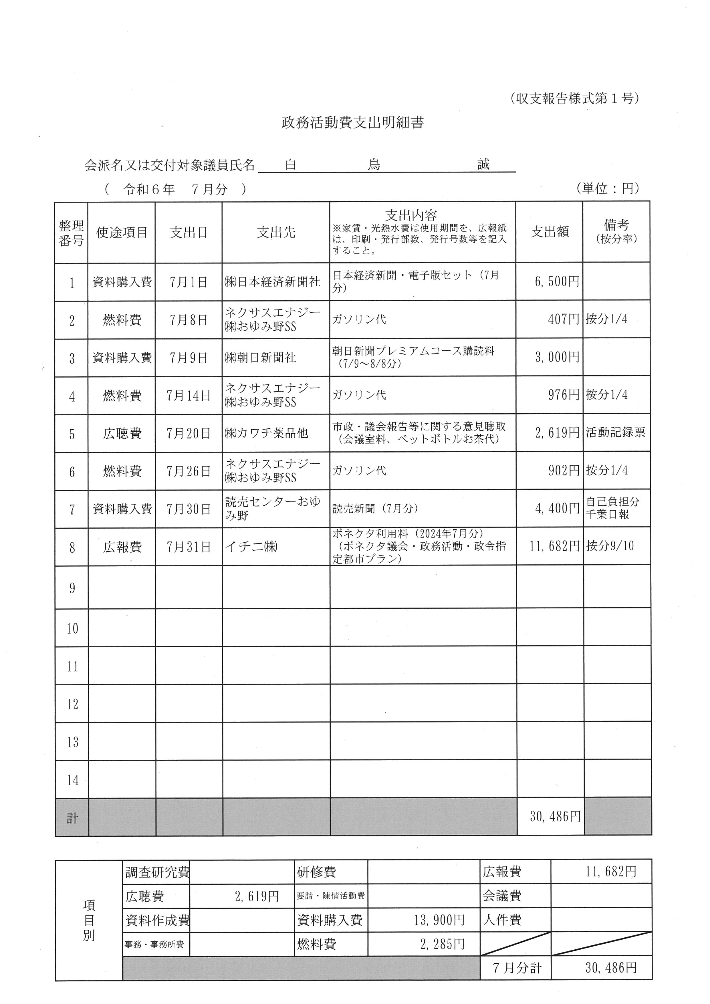 千葉市議会トップページ > 広報・情報公開 > 政務活動費 > 令和6年度交付分(政務活動費収支報告書)