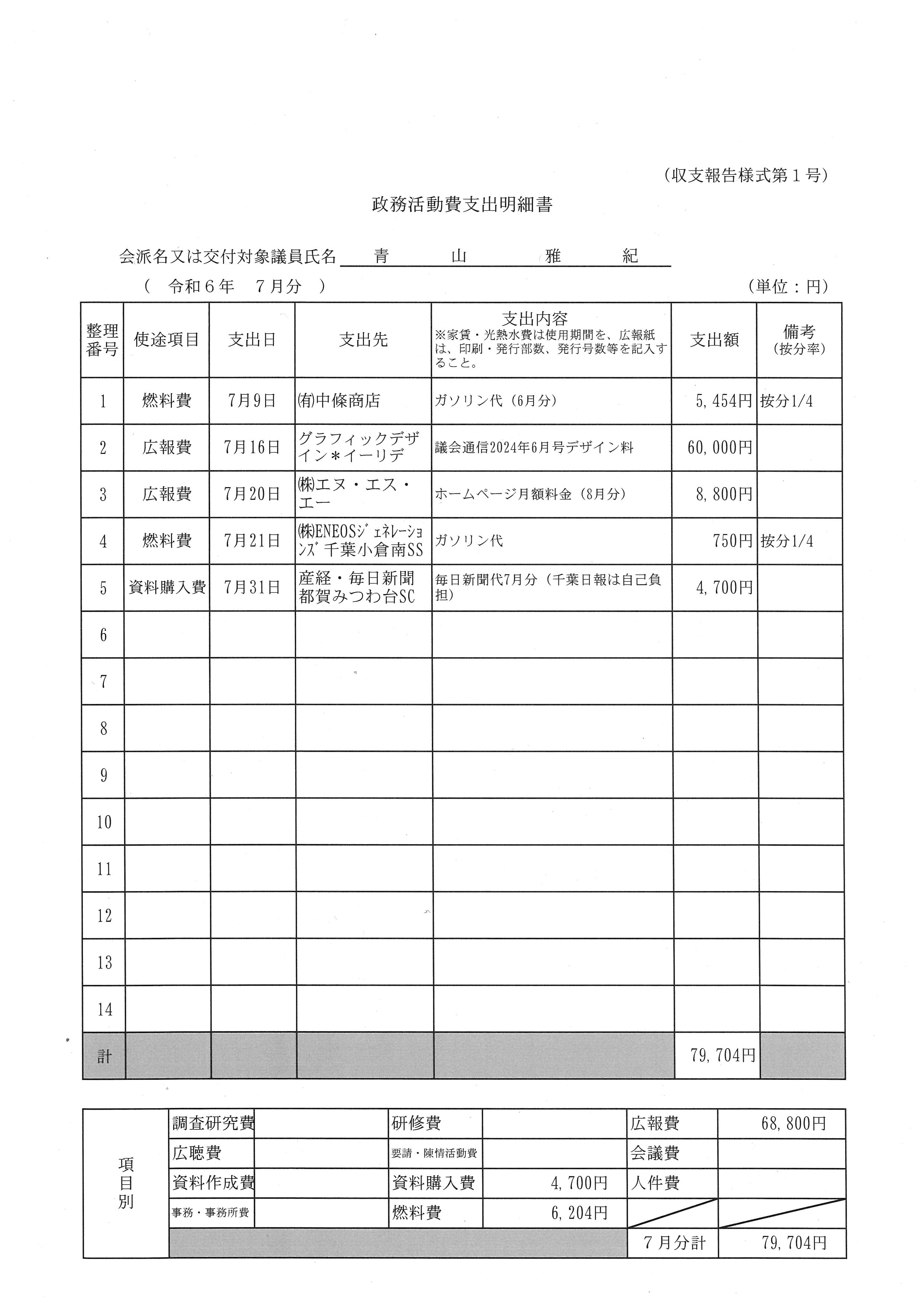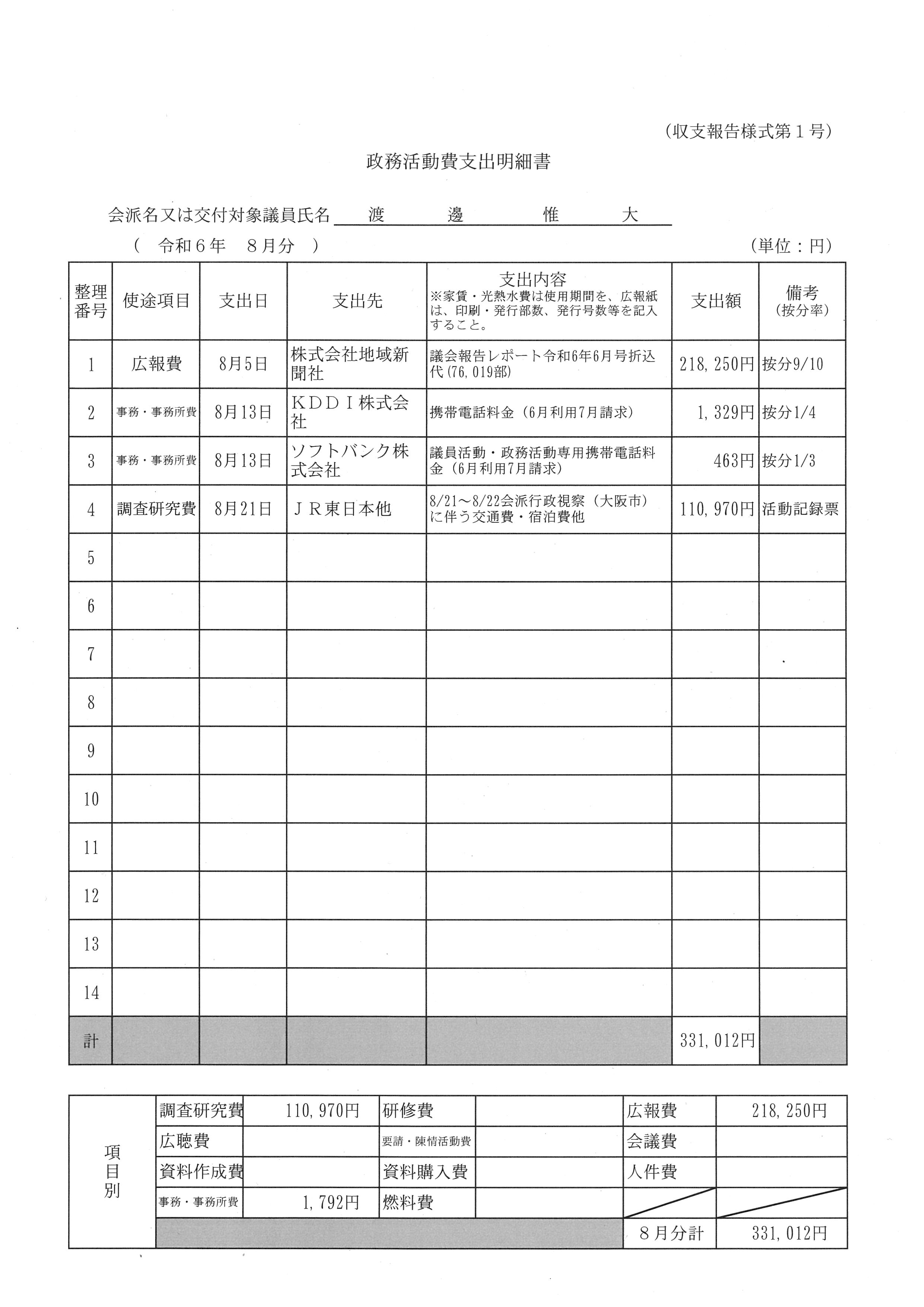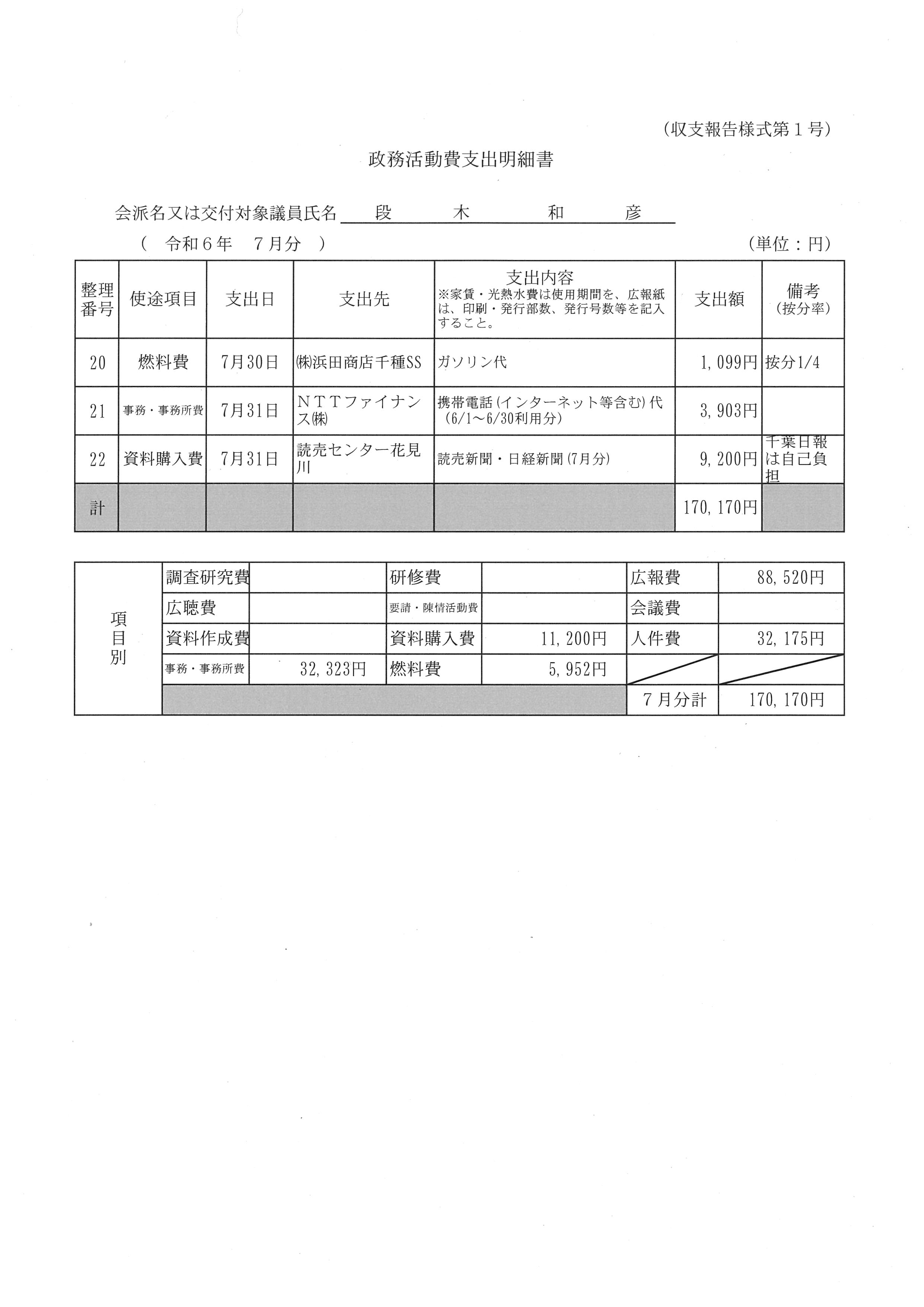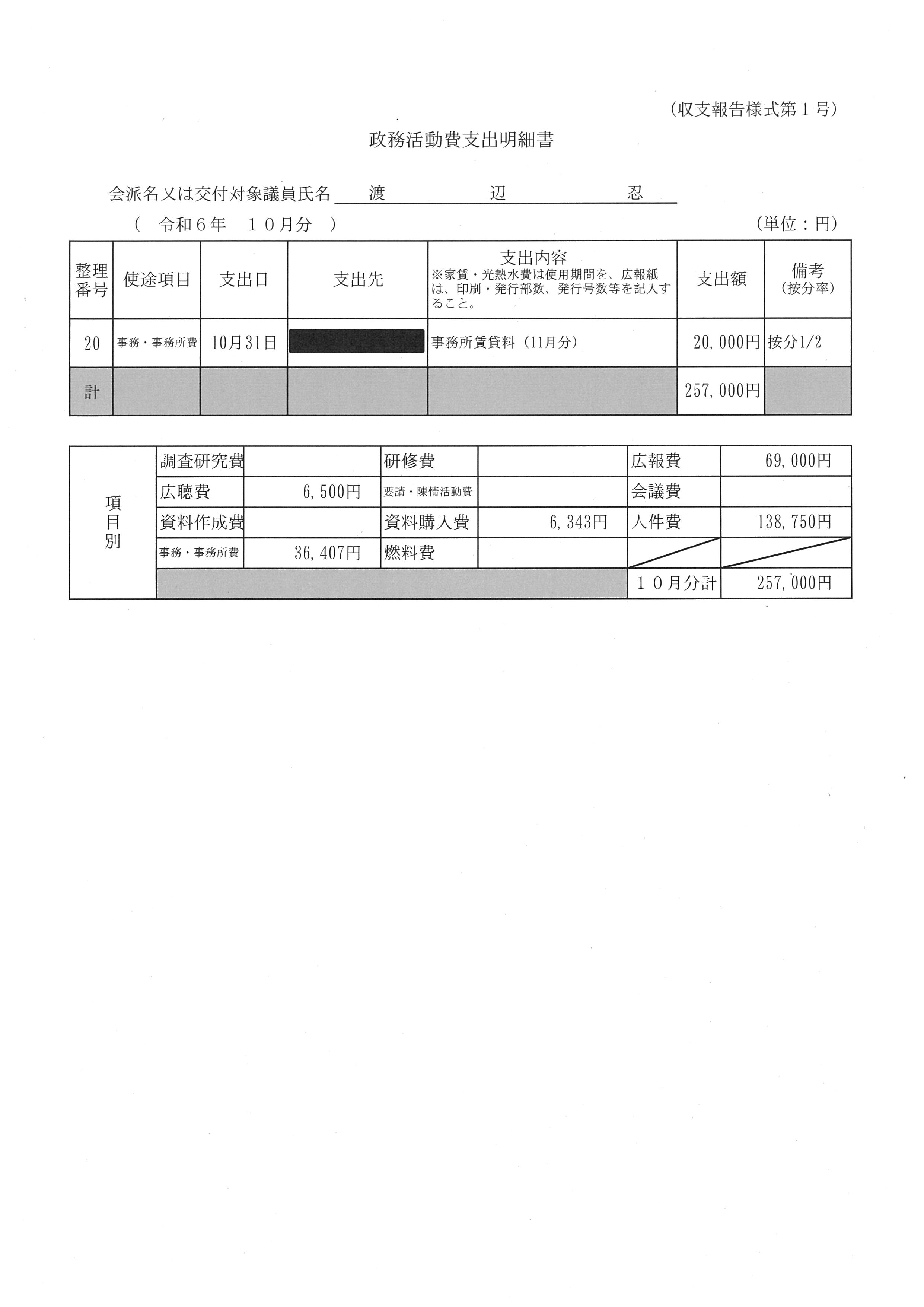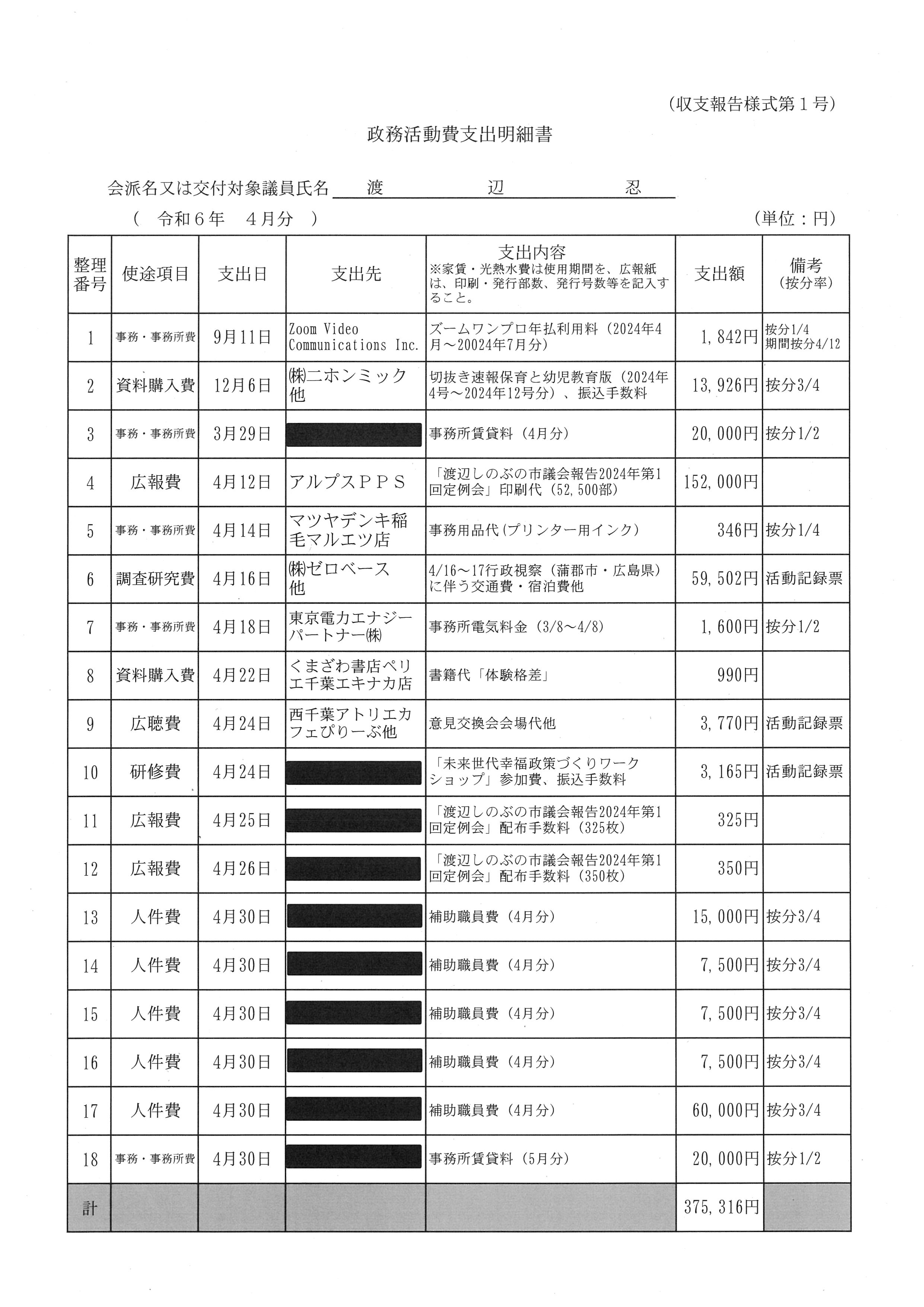 千葉市議会トップページ > 広報・情報公開 > 政務活動費 > 令和6年度交付分(政務活動費収支報告書)