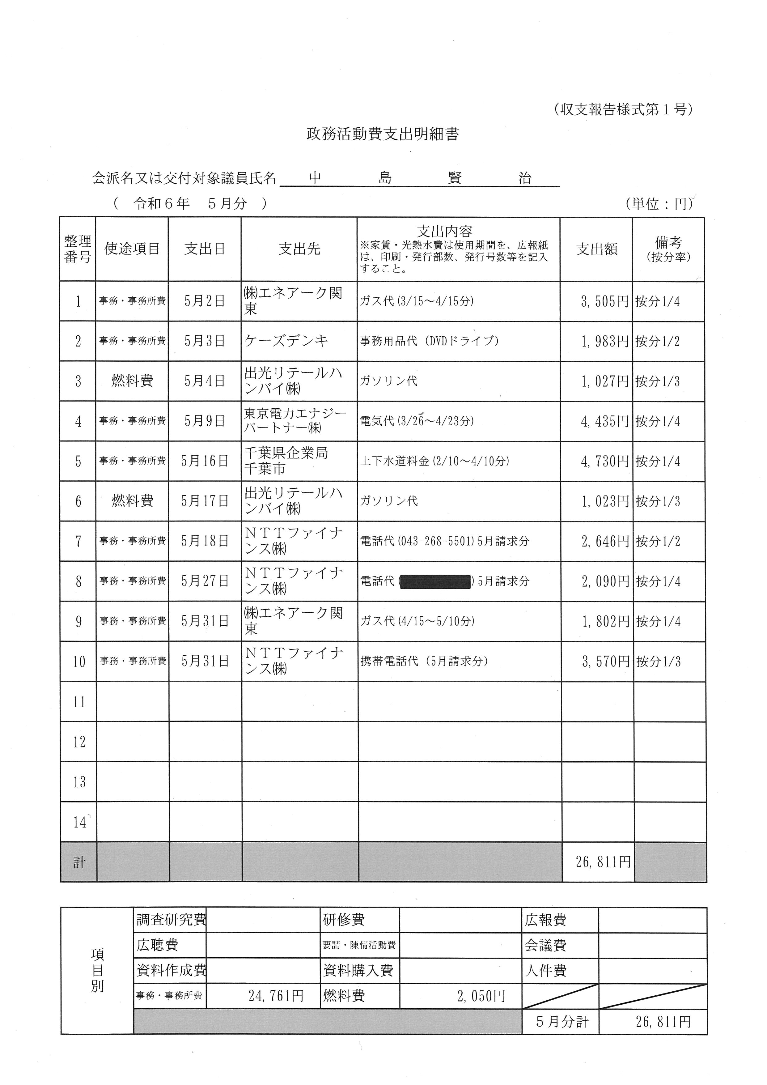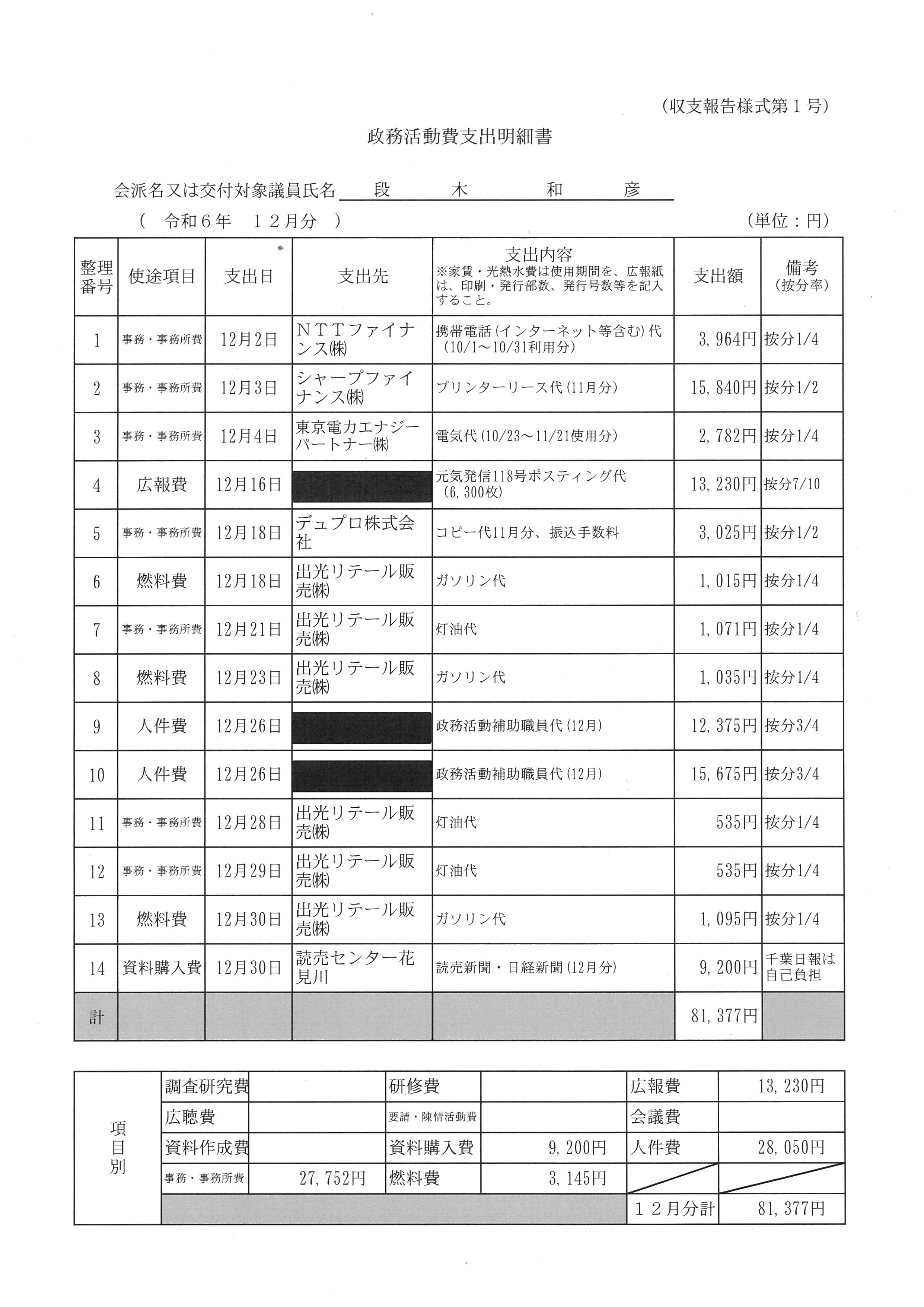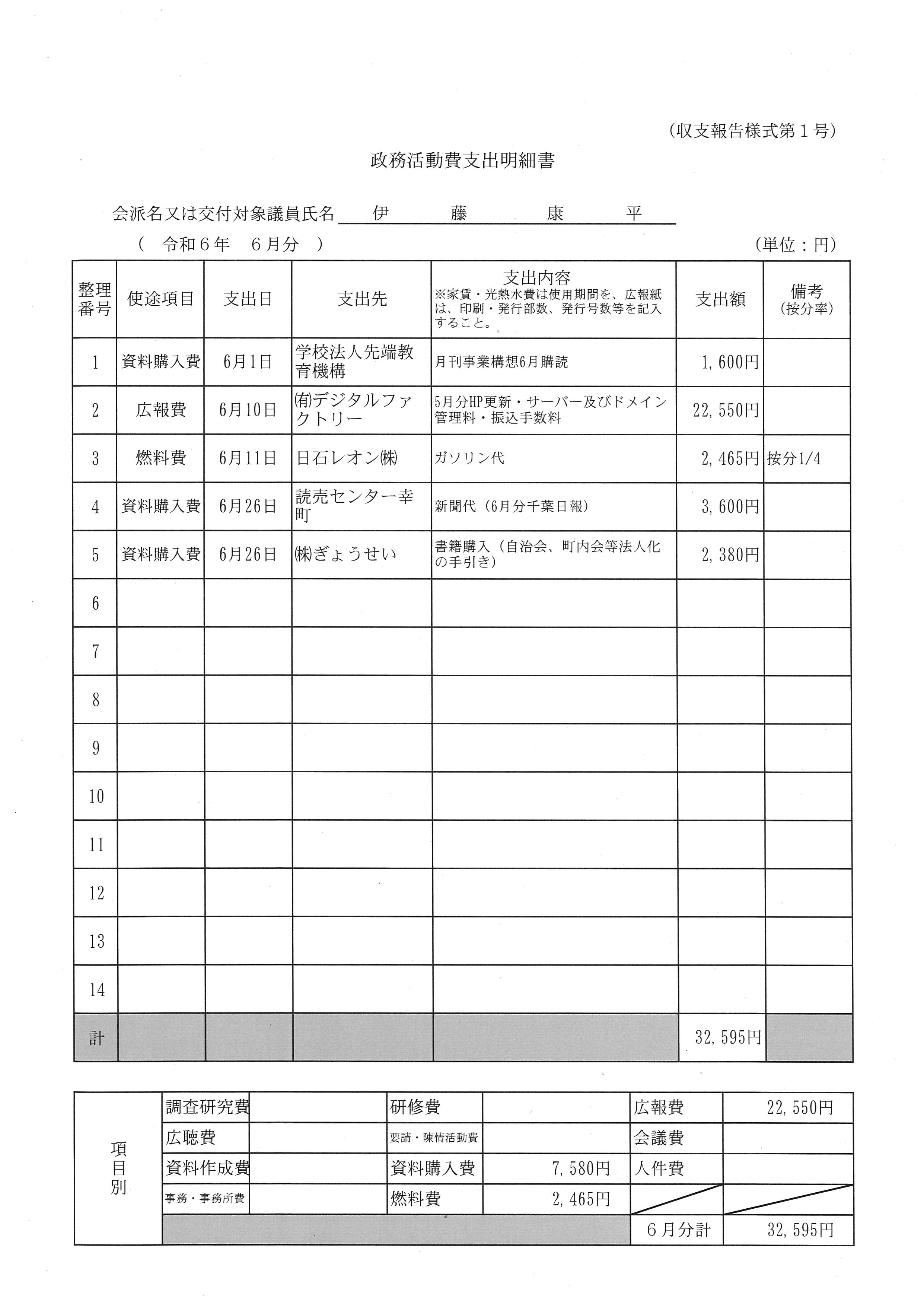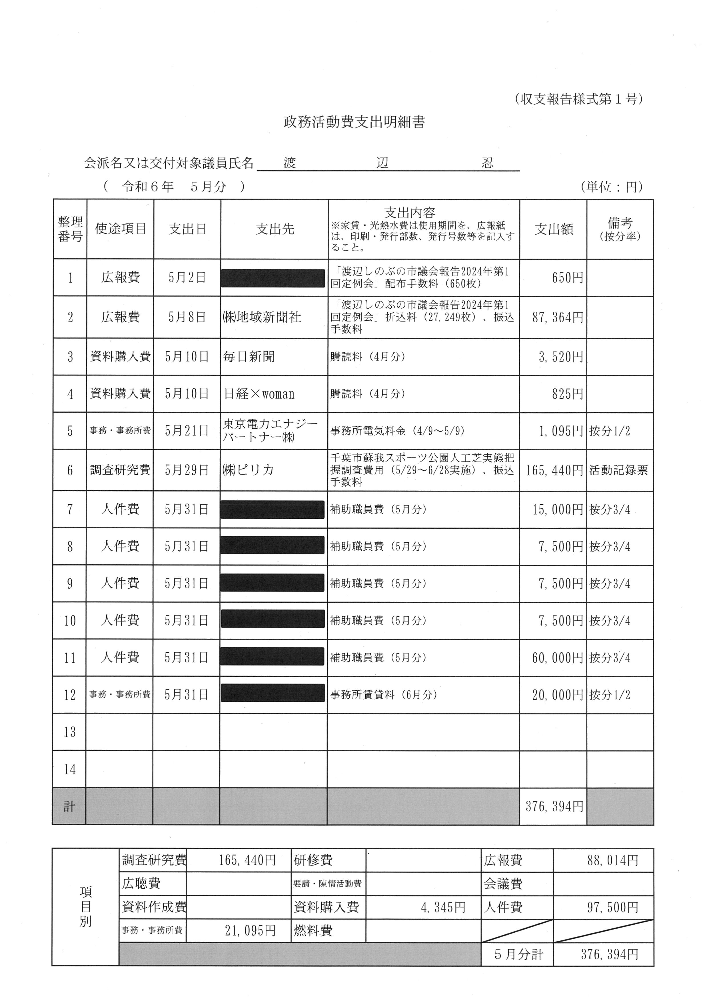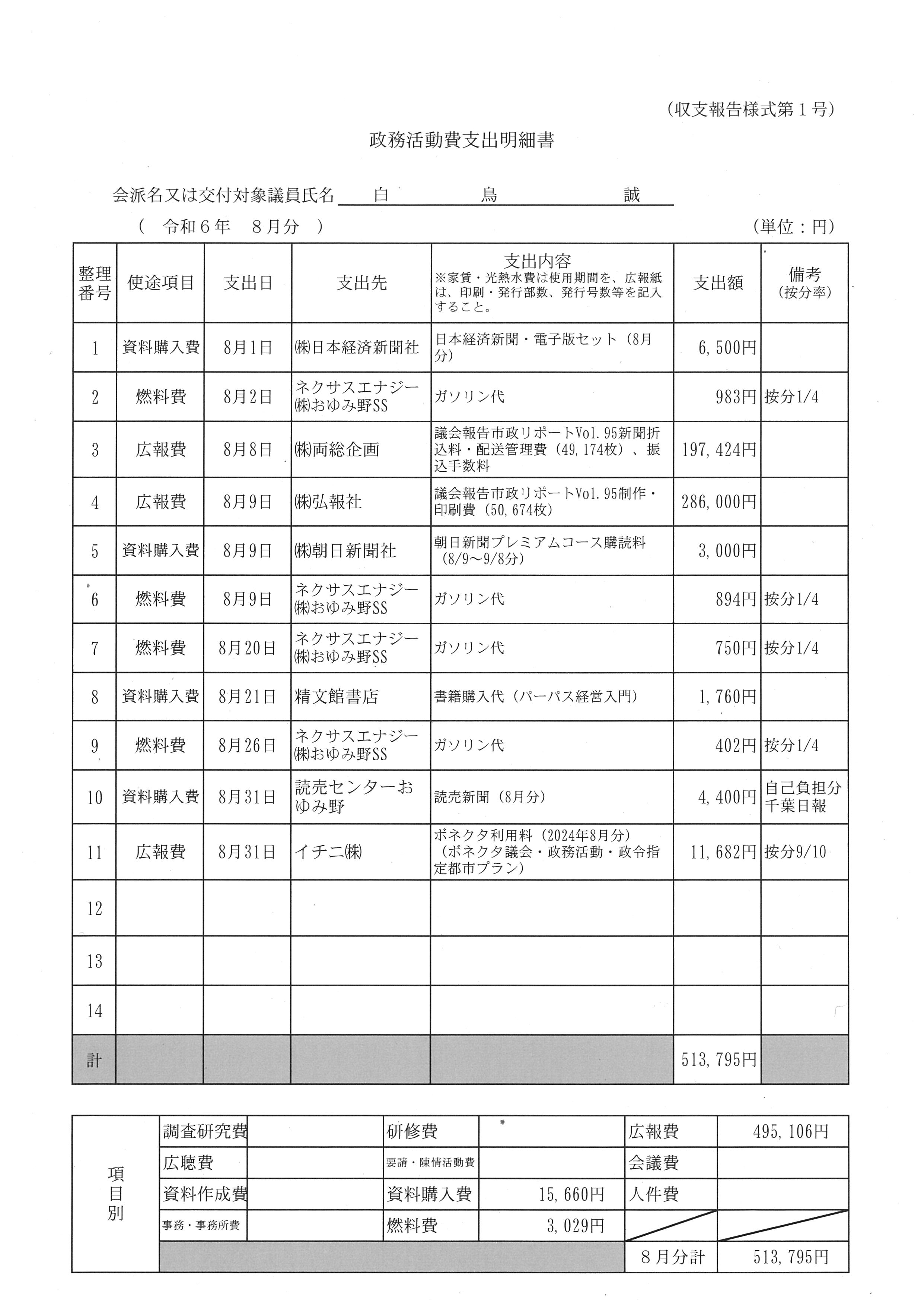 千葉市議会トップページ > 広報・情報公開 > 政務活動費 > 令和6年度交付分(政務活動費収支報告書)