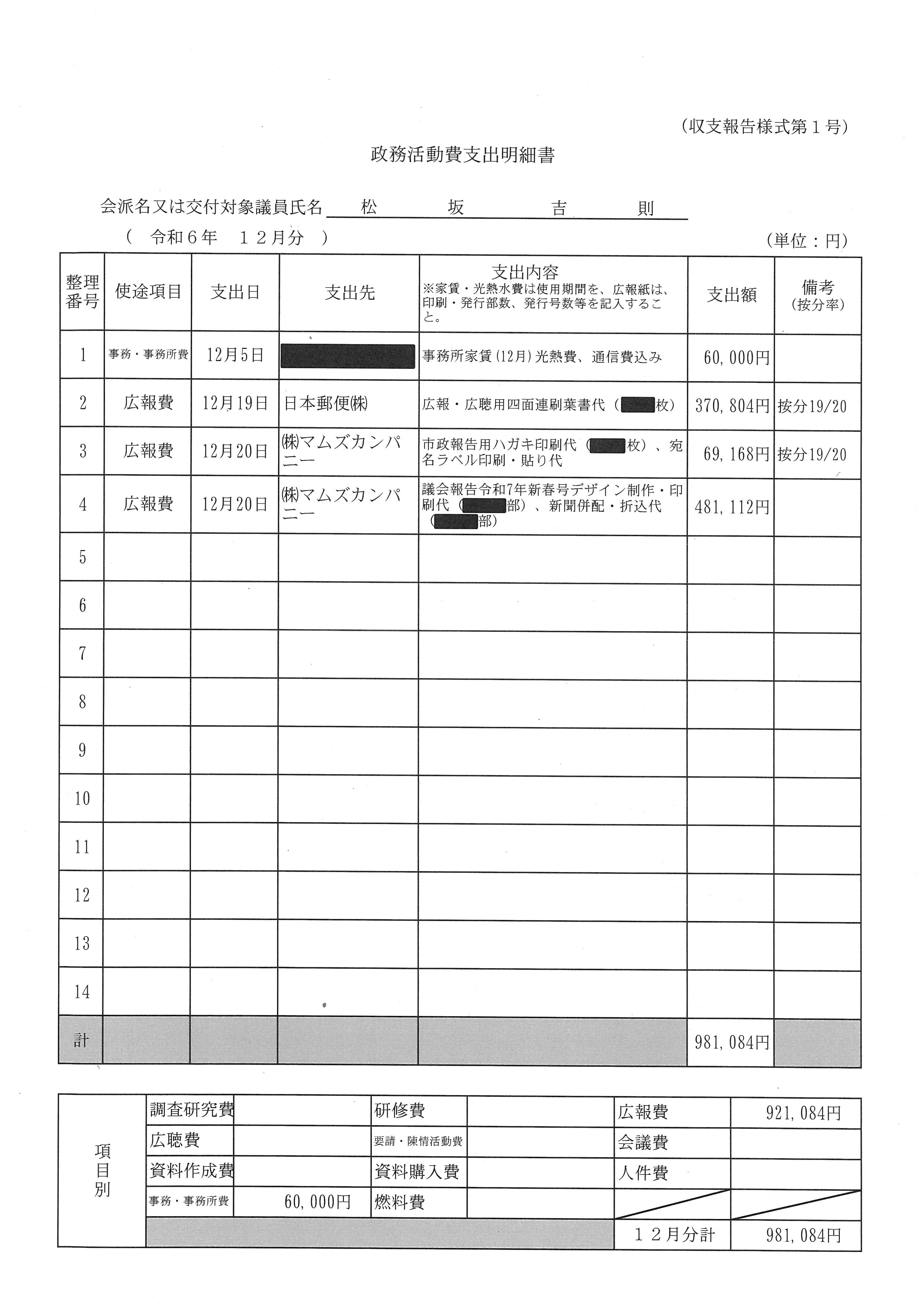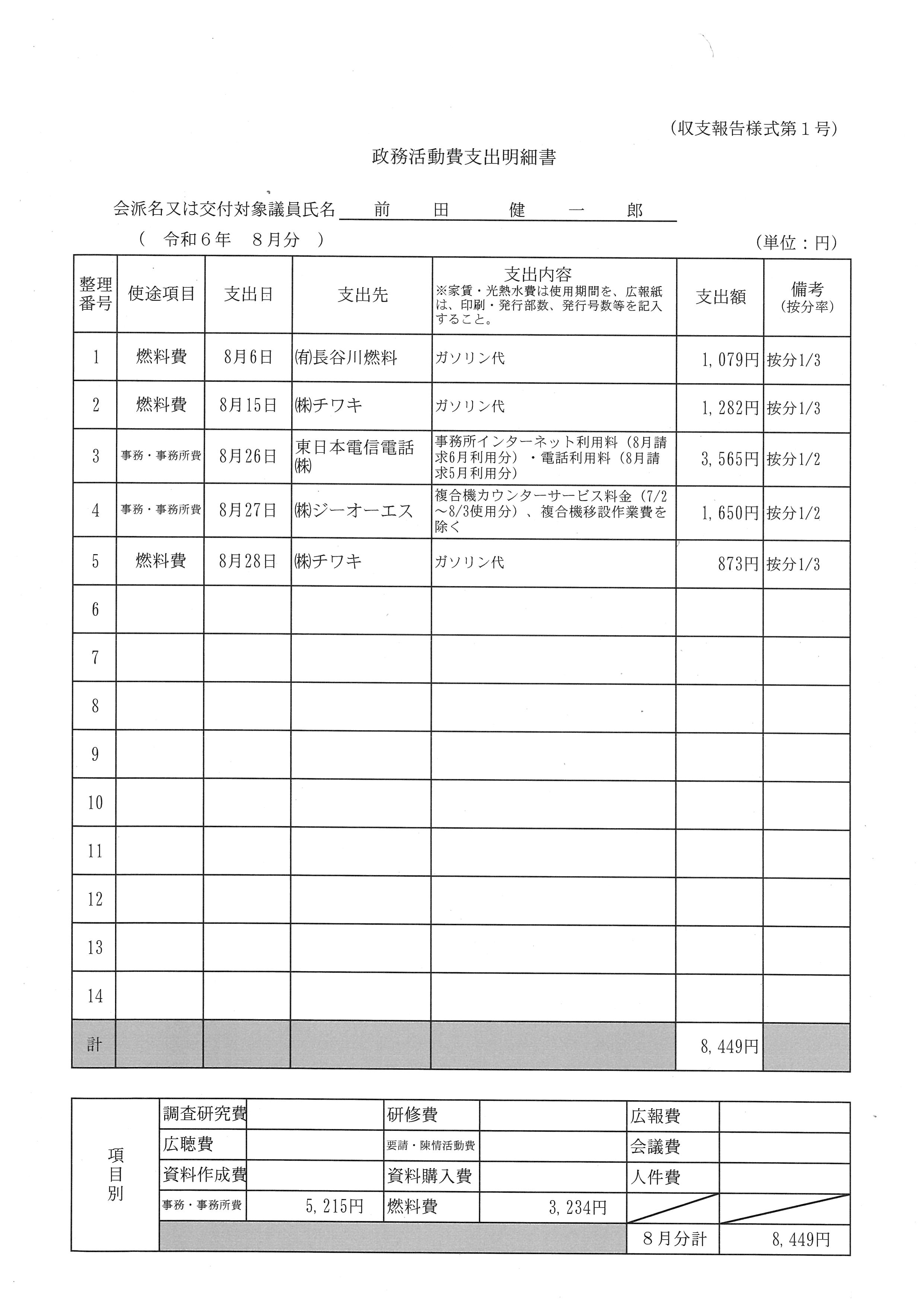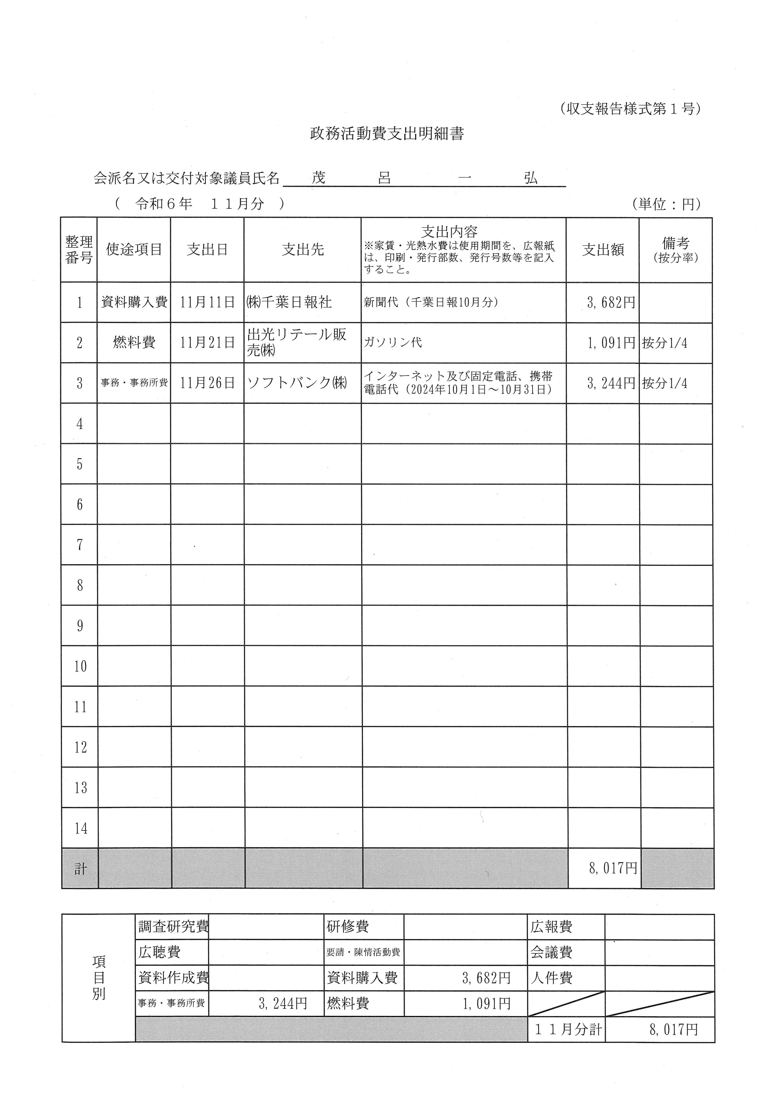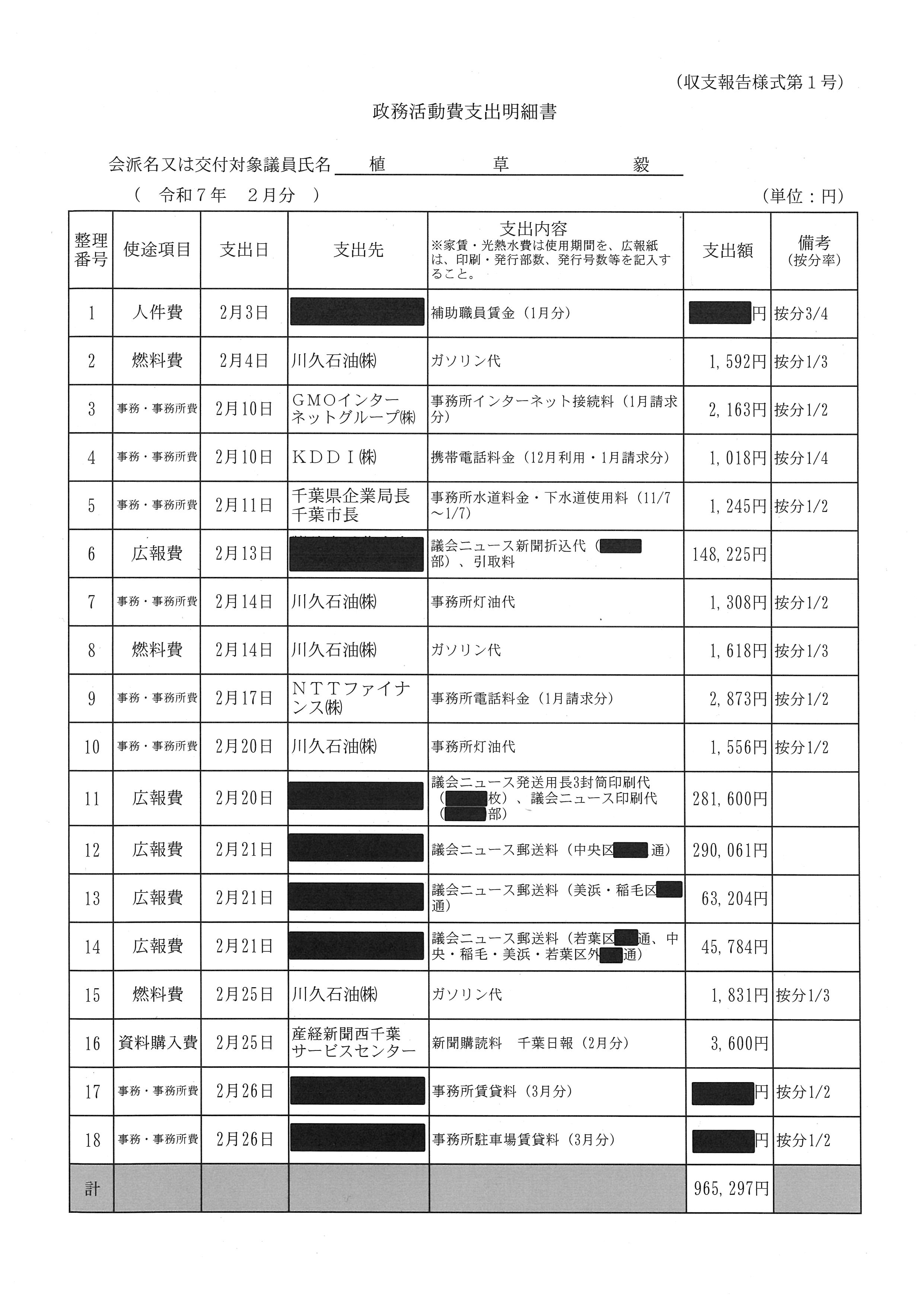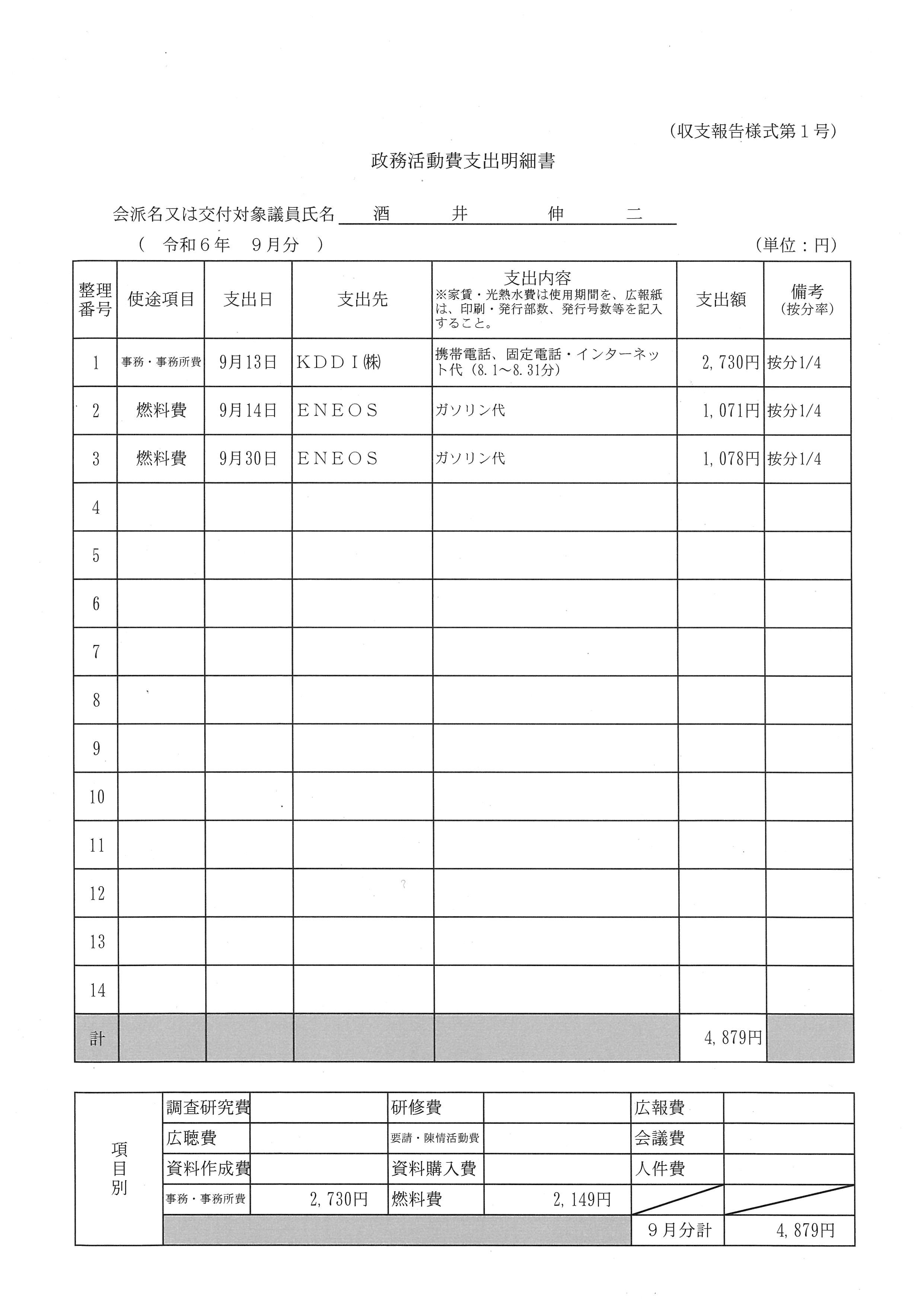 千葉市議会トップページ > 広報・情報公開 > 政務活動費 > 令和6年度交付分(政務活動費収支報告書)