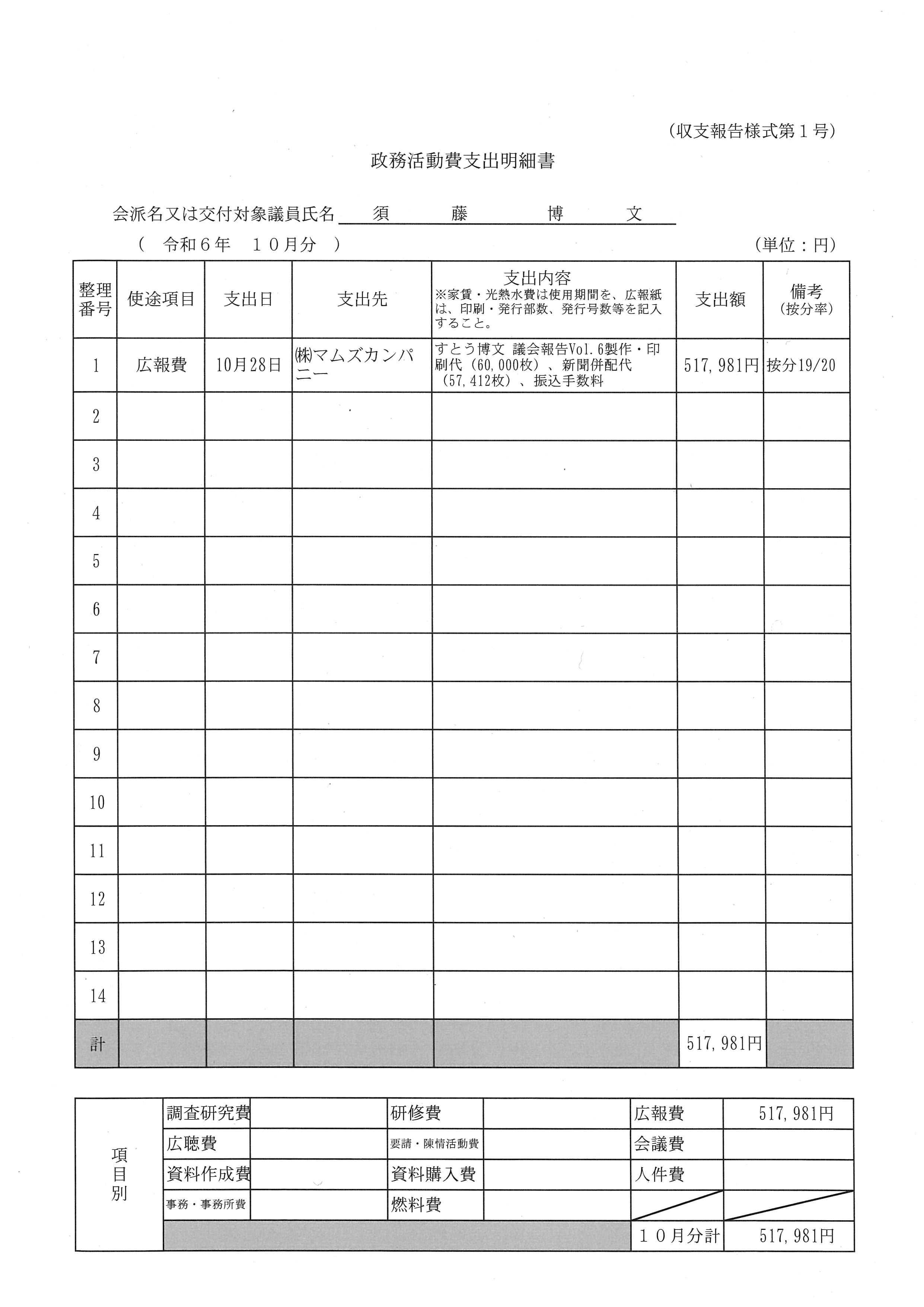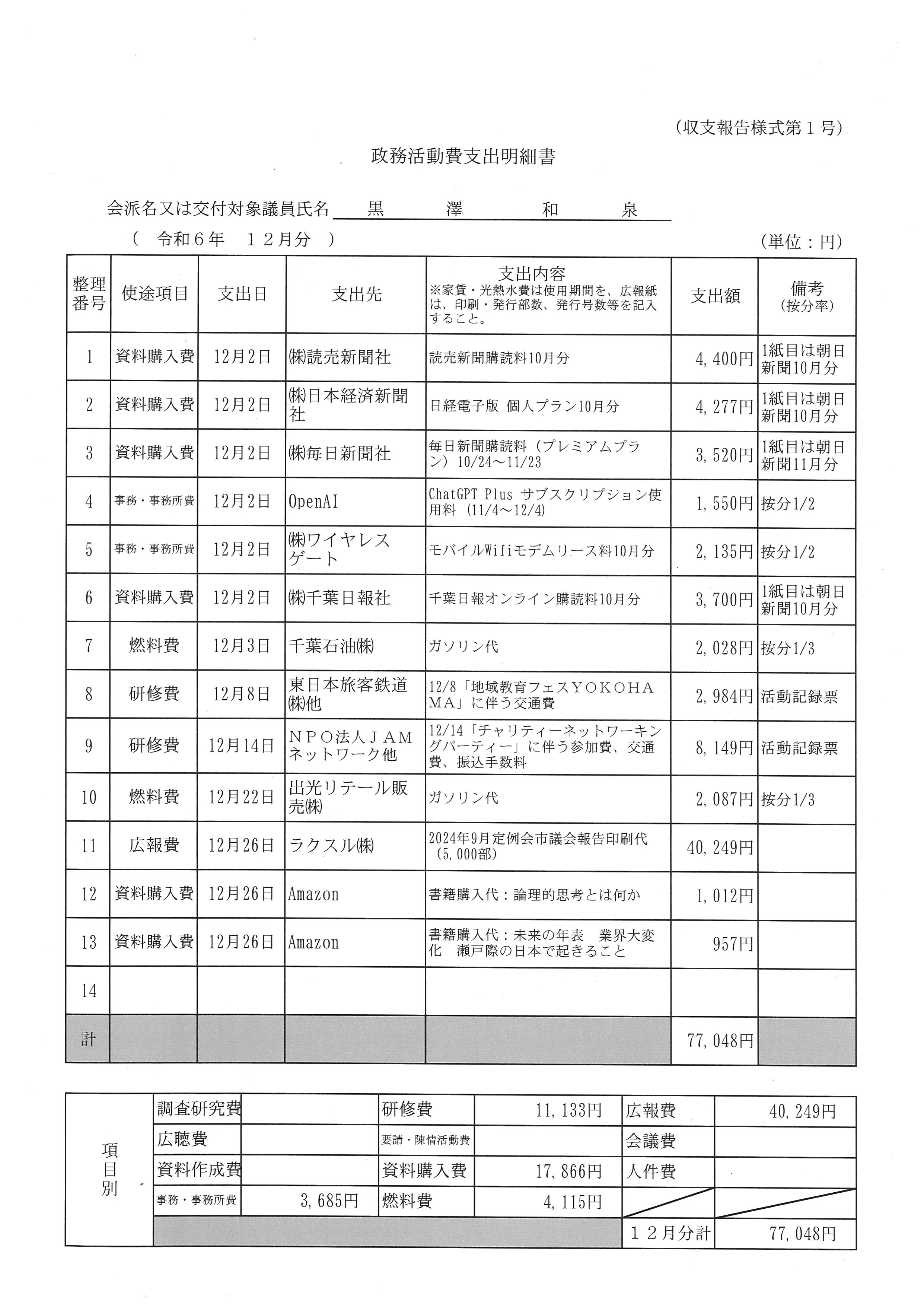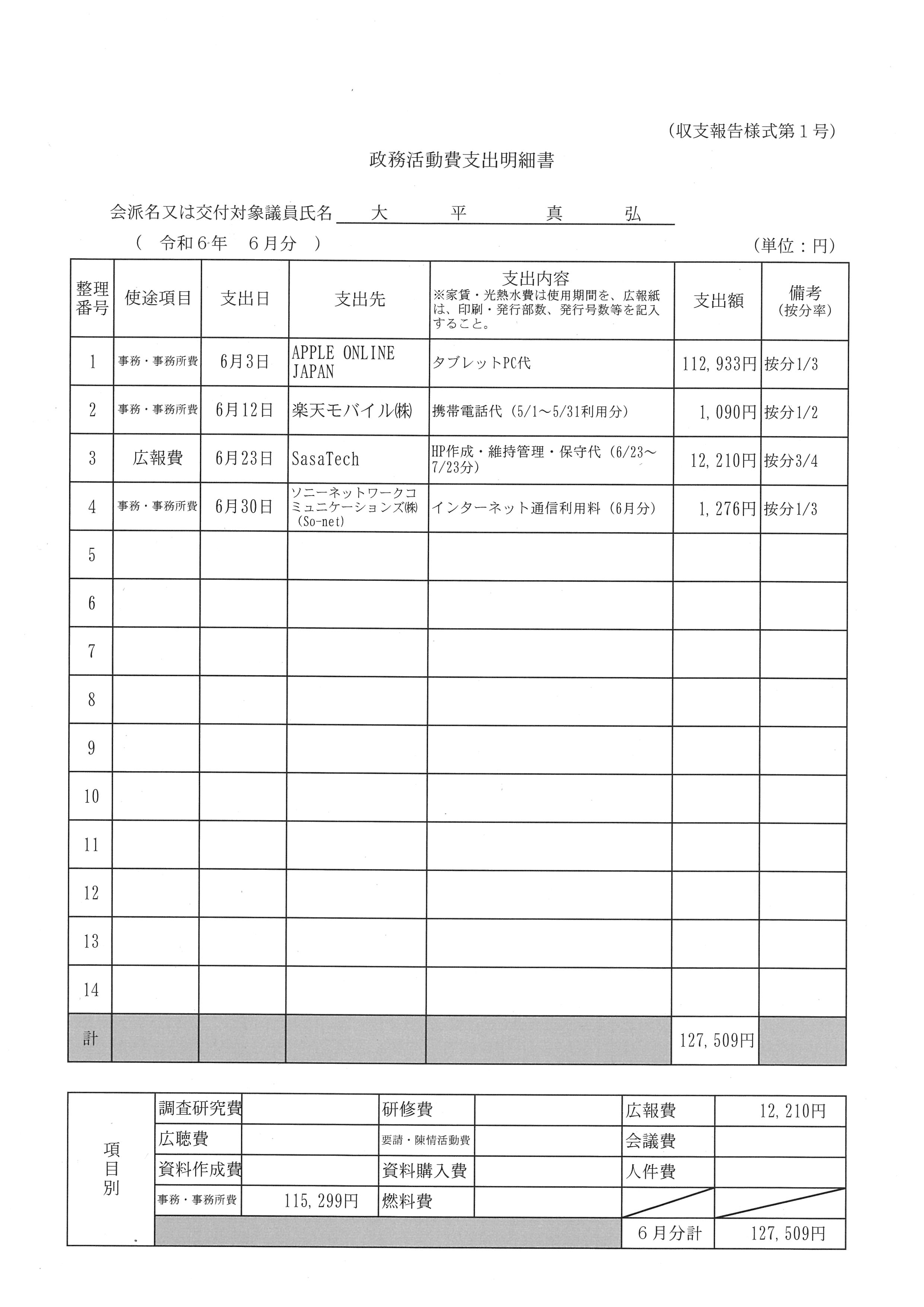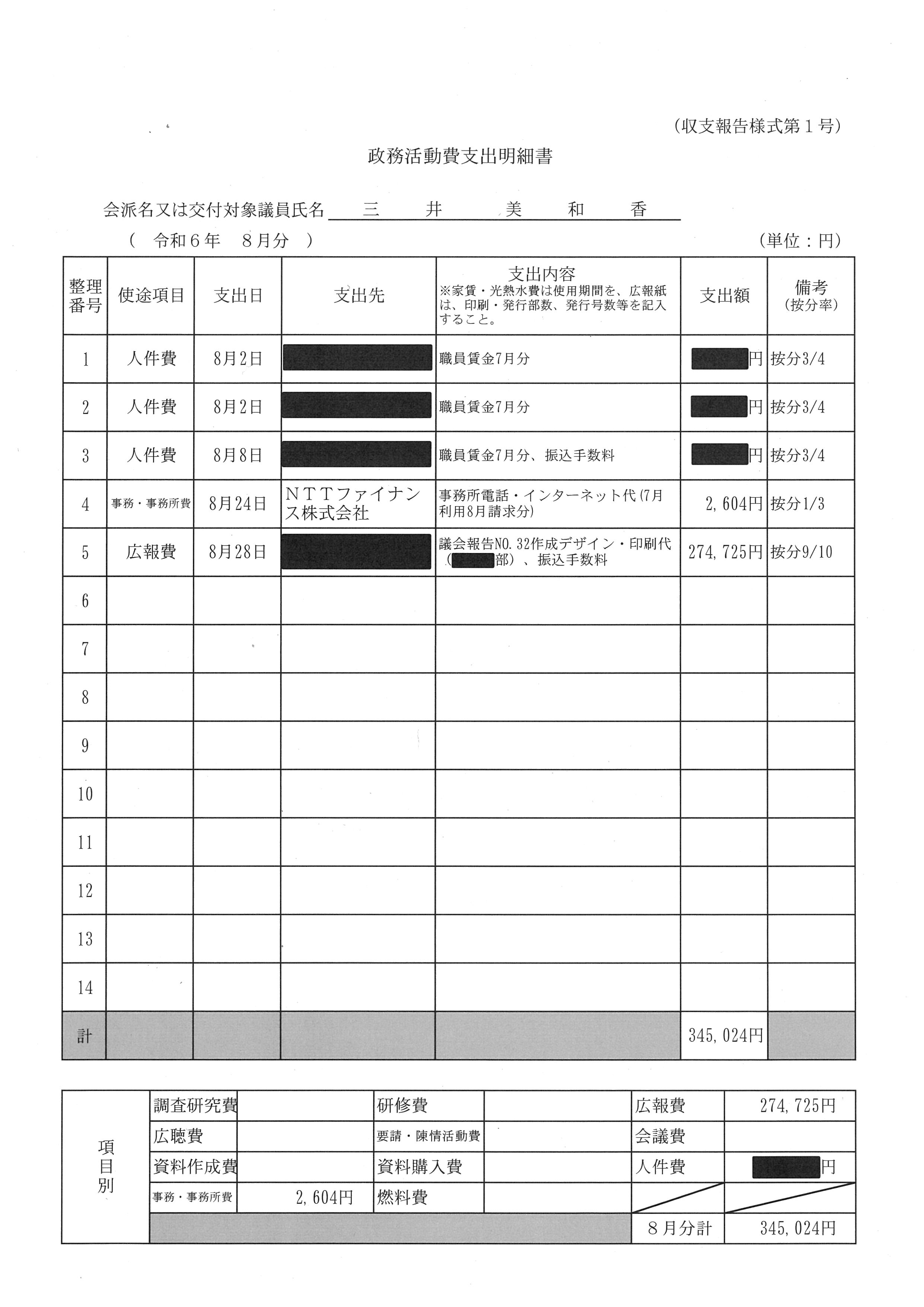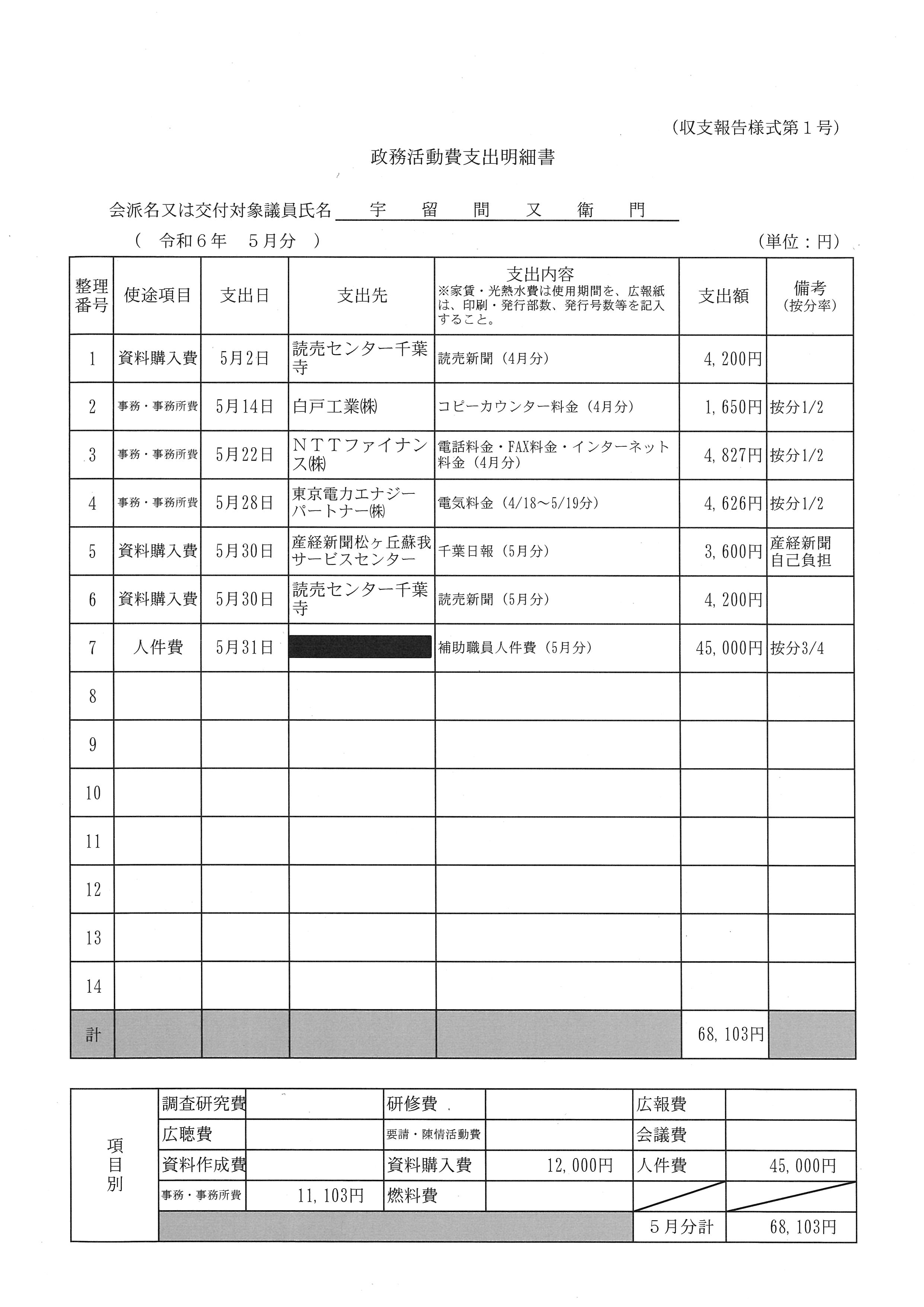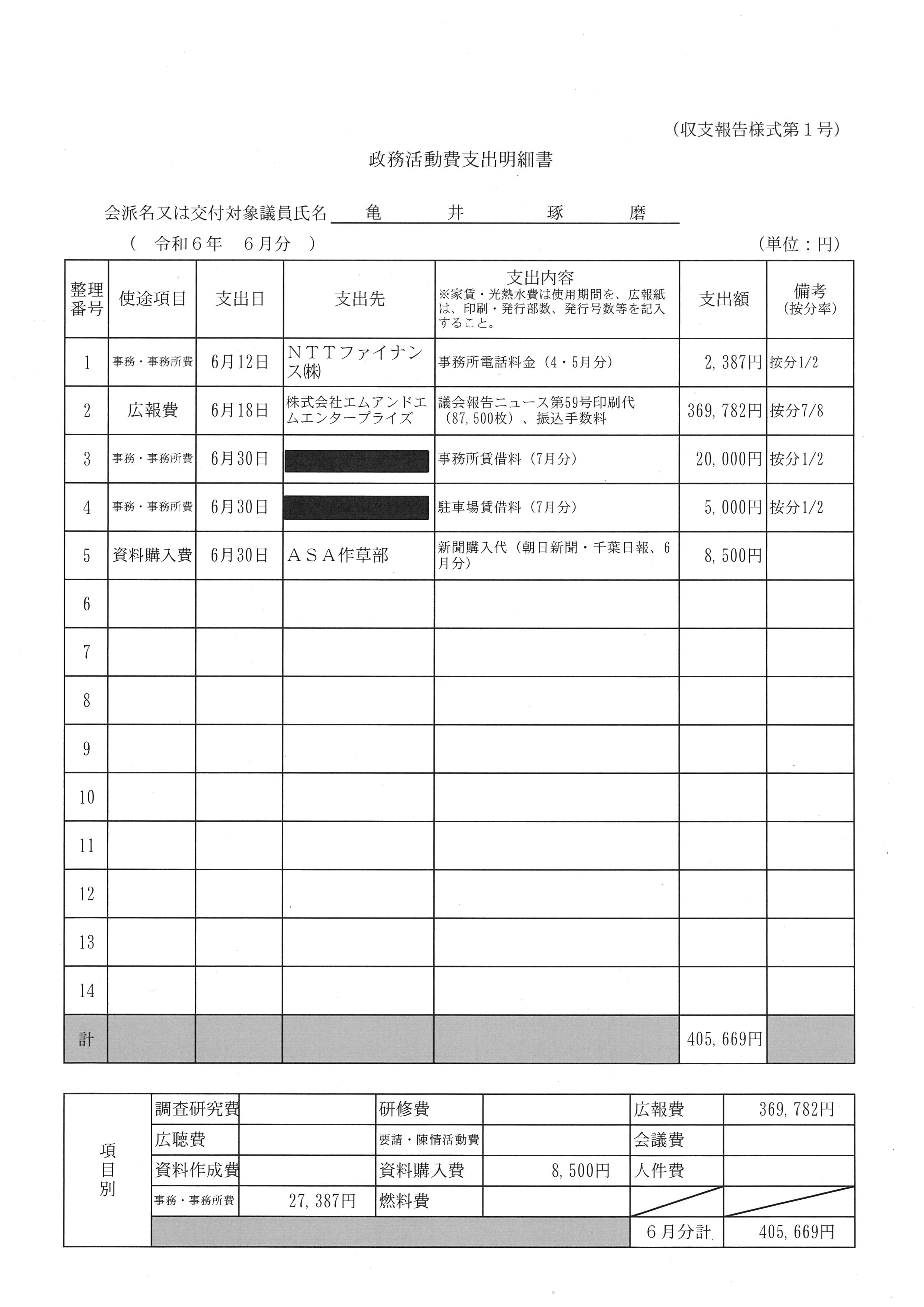 千葉市議会トップページ > 広報・情報公開 > 政務活動費 > 令和6年度交付分(政務活動費収支報告書)