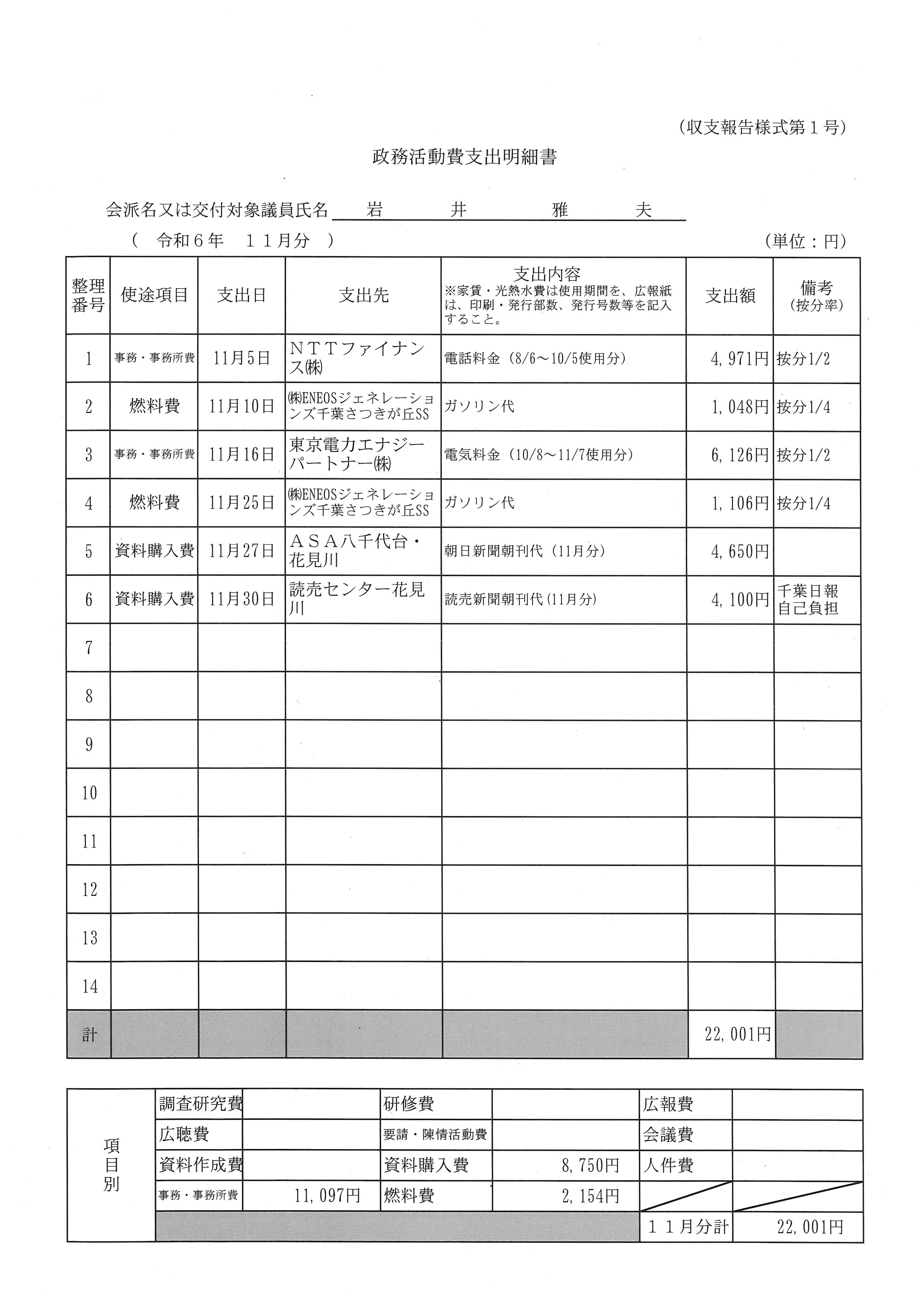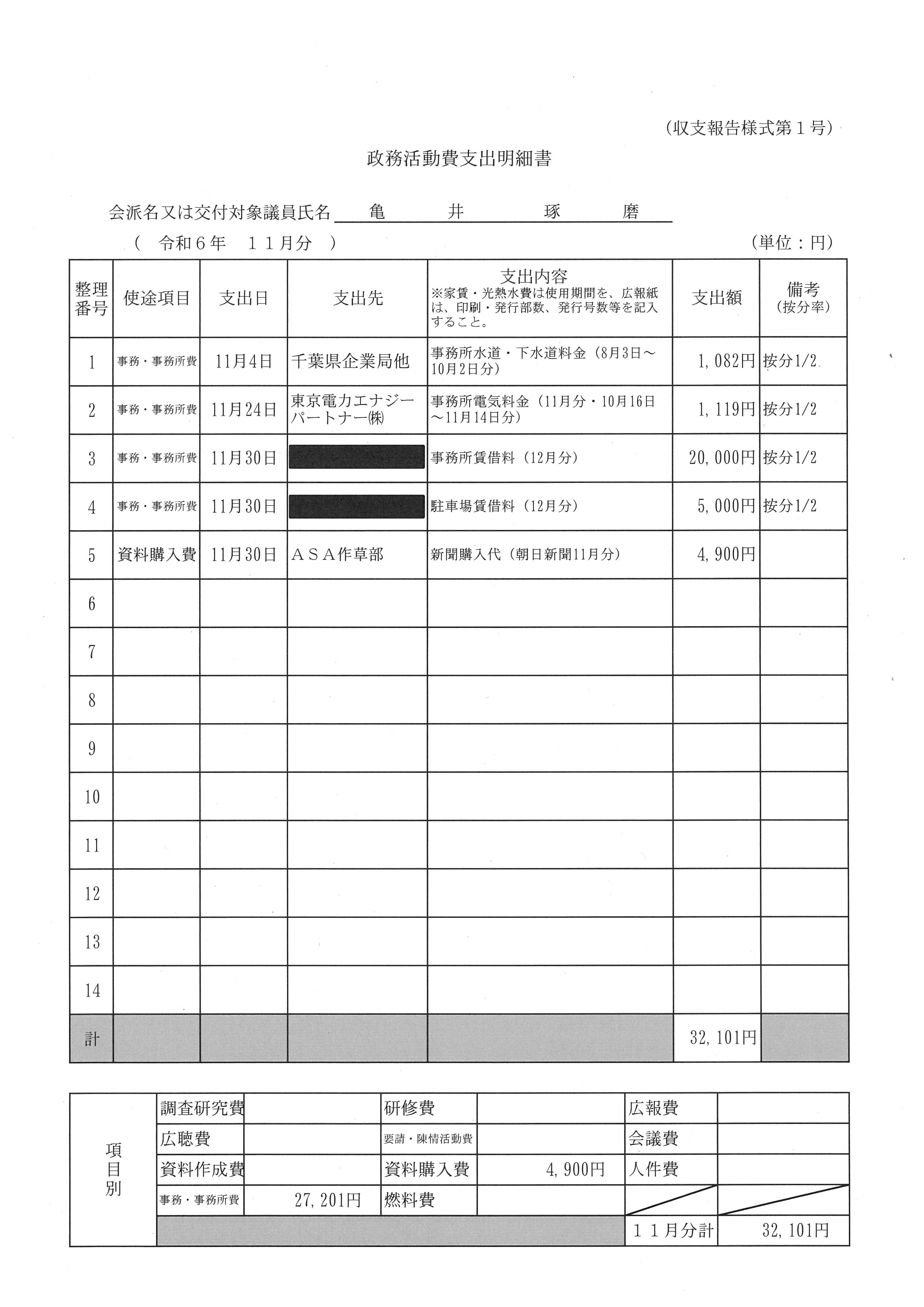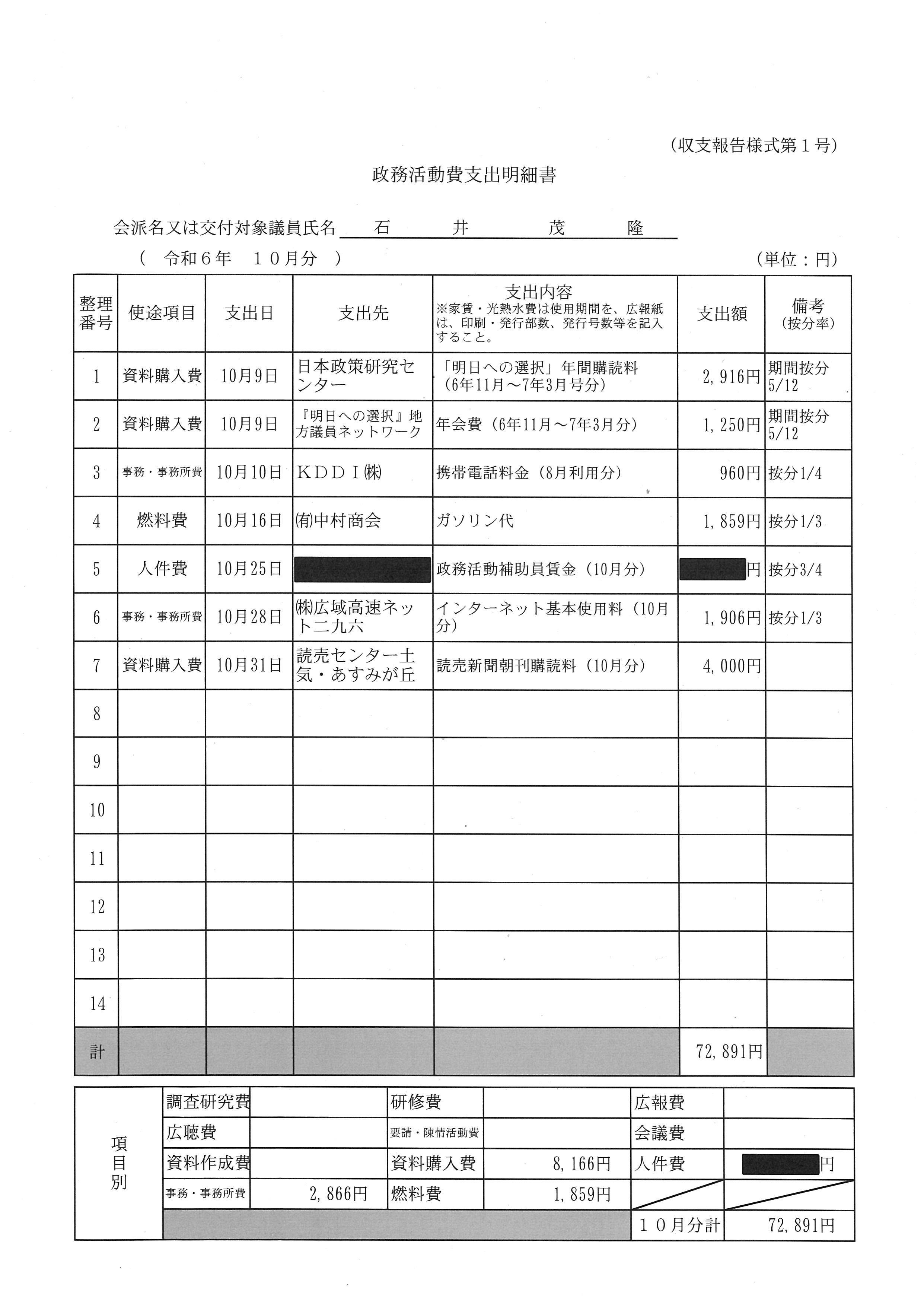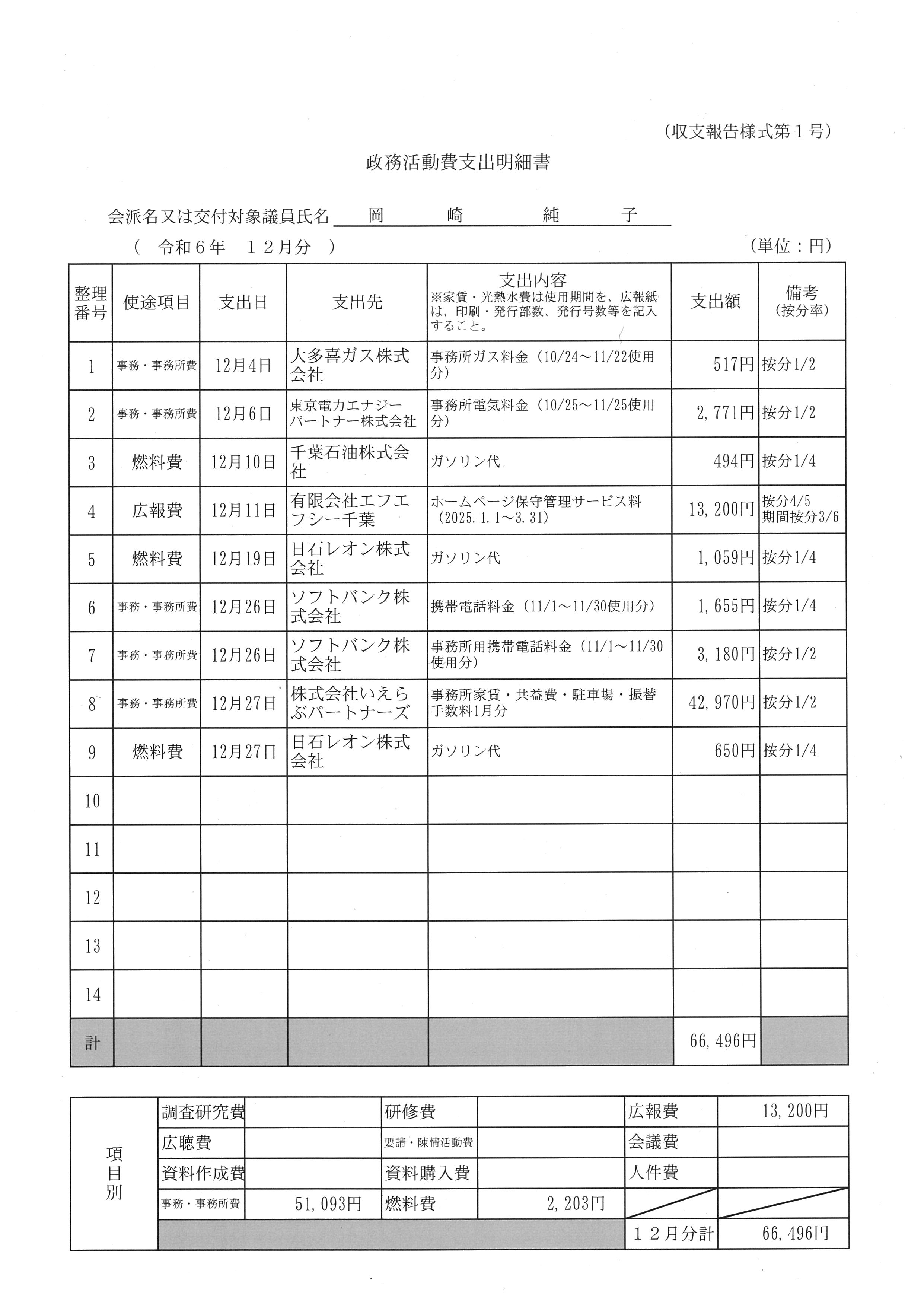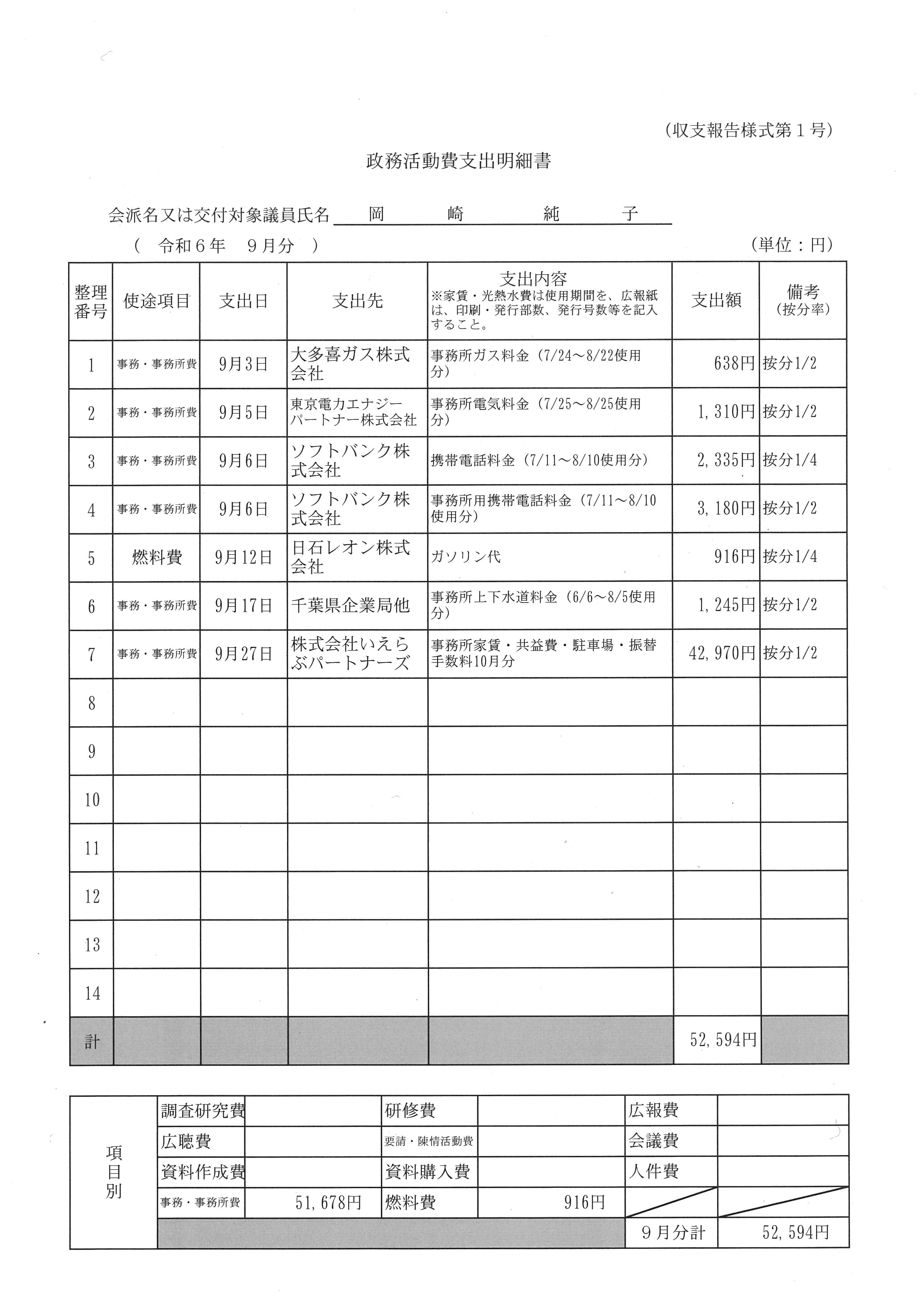 千葉市議会トップページ > 広報・情報公開 > 政務活動費 > 令和6年度交付分(政務活動費収支報告書)