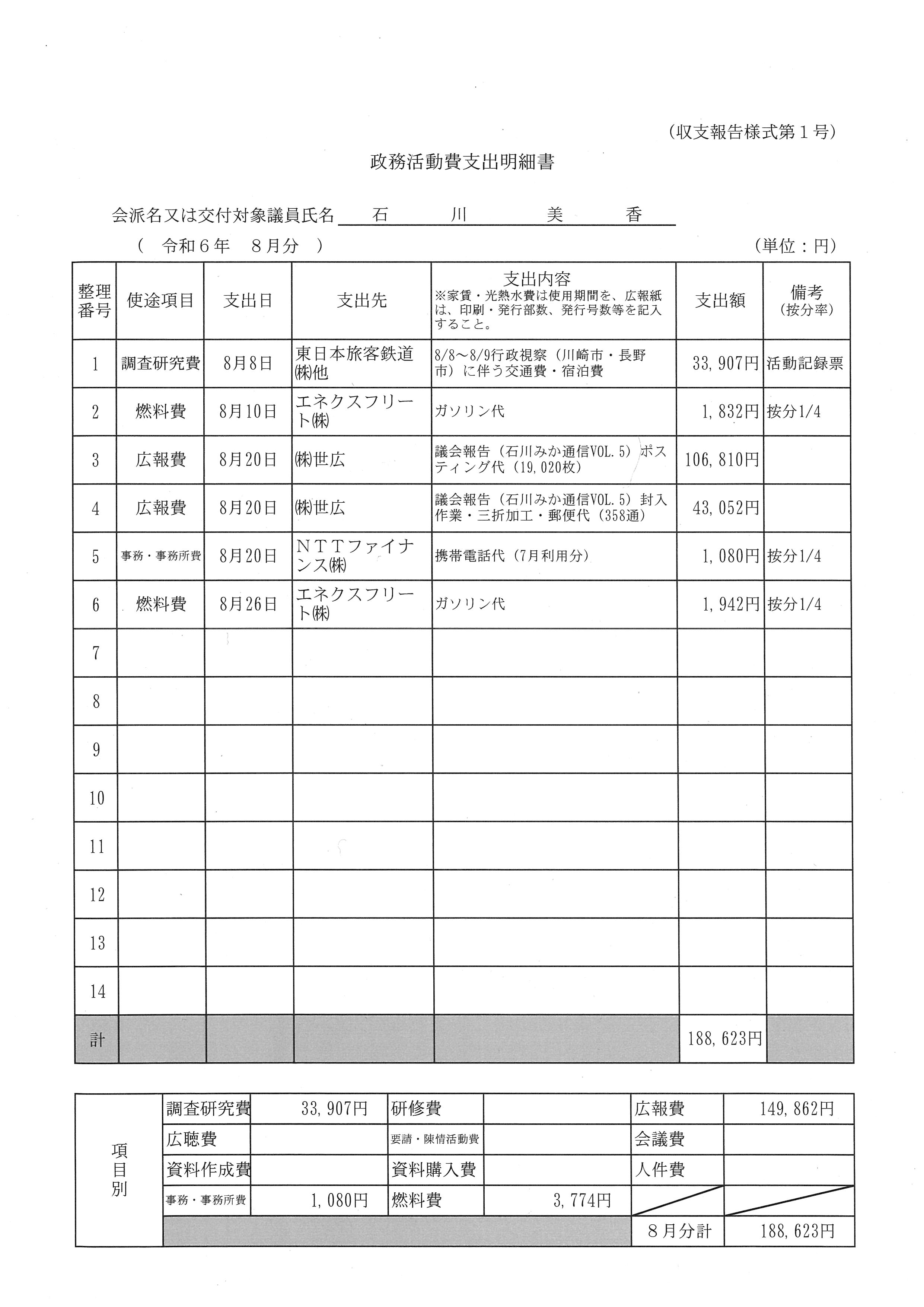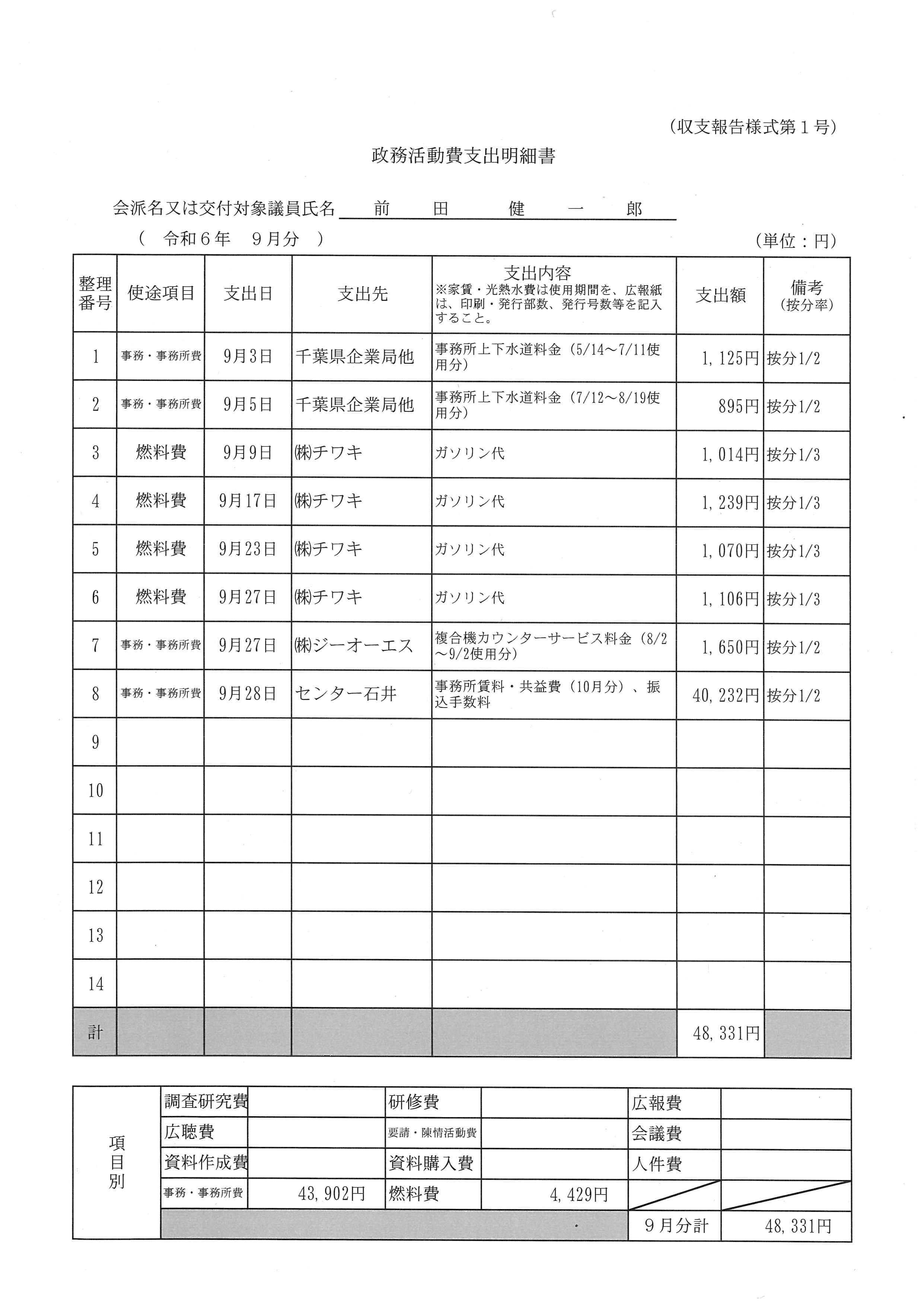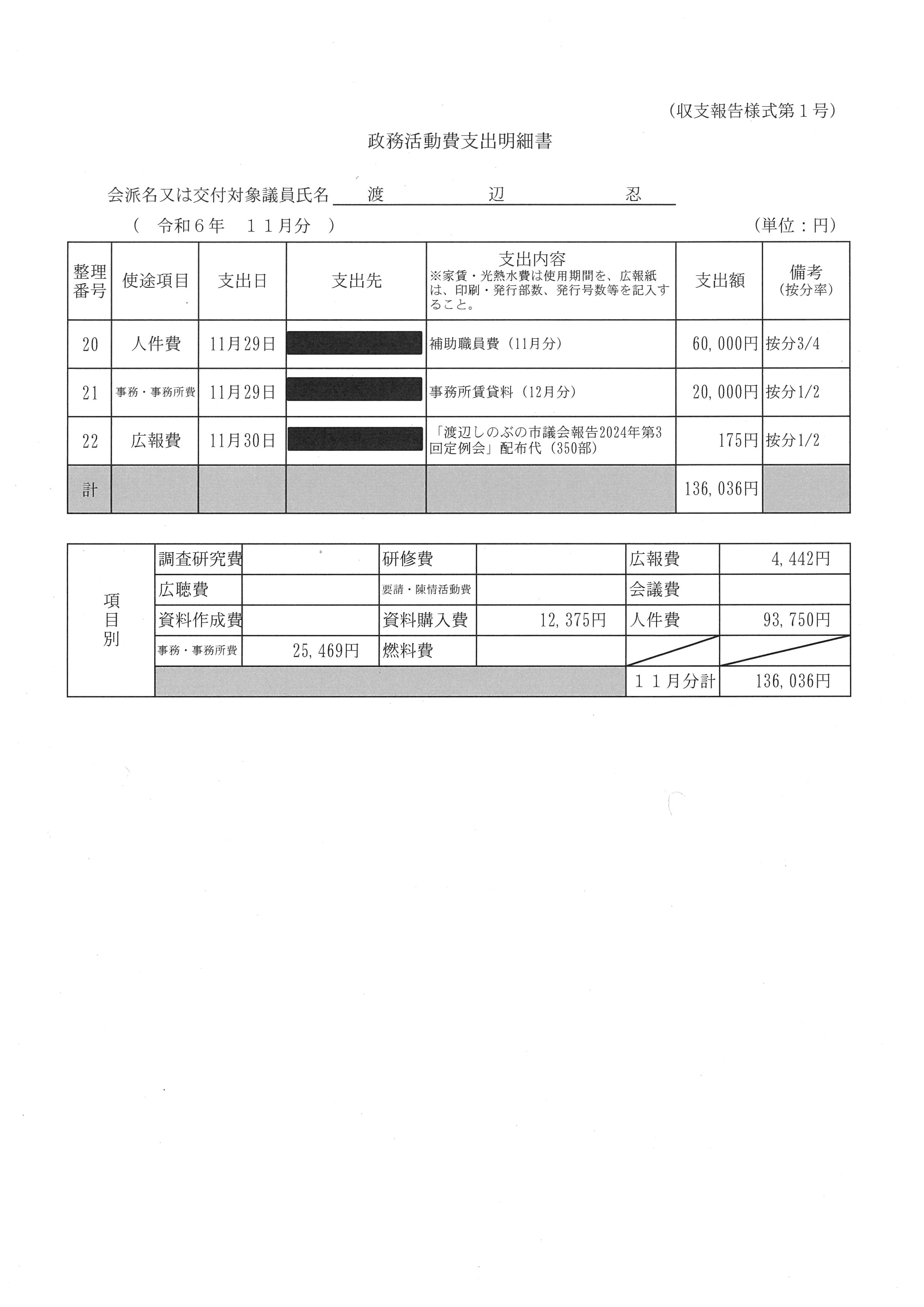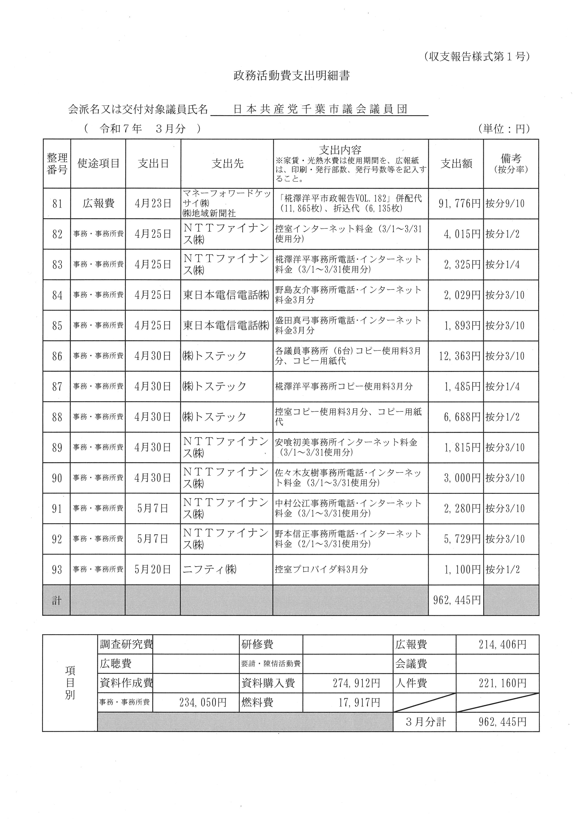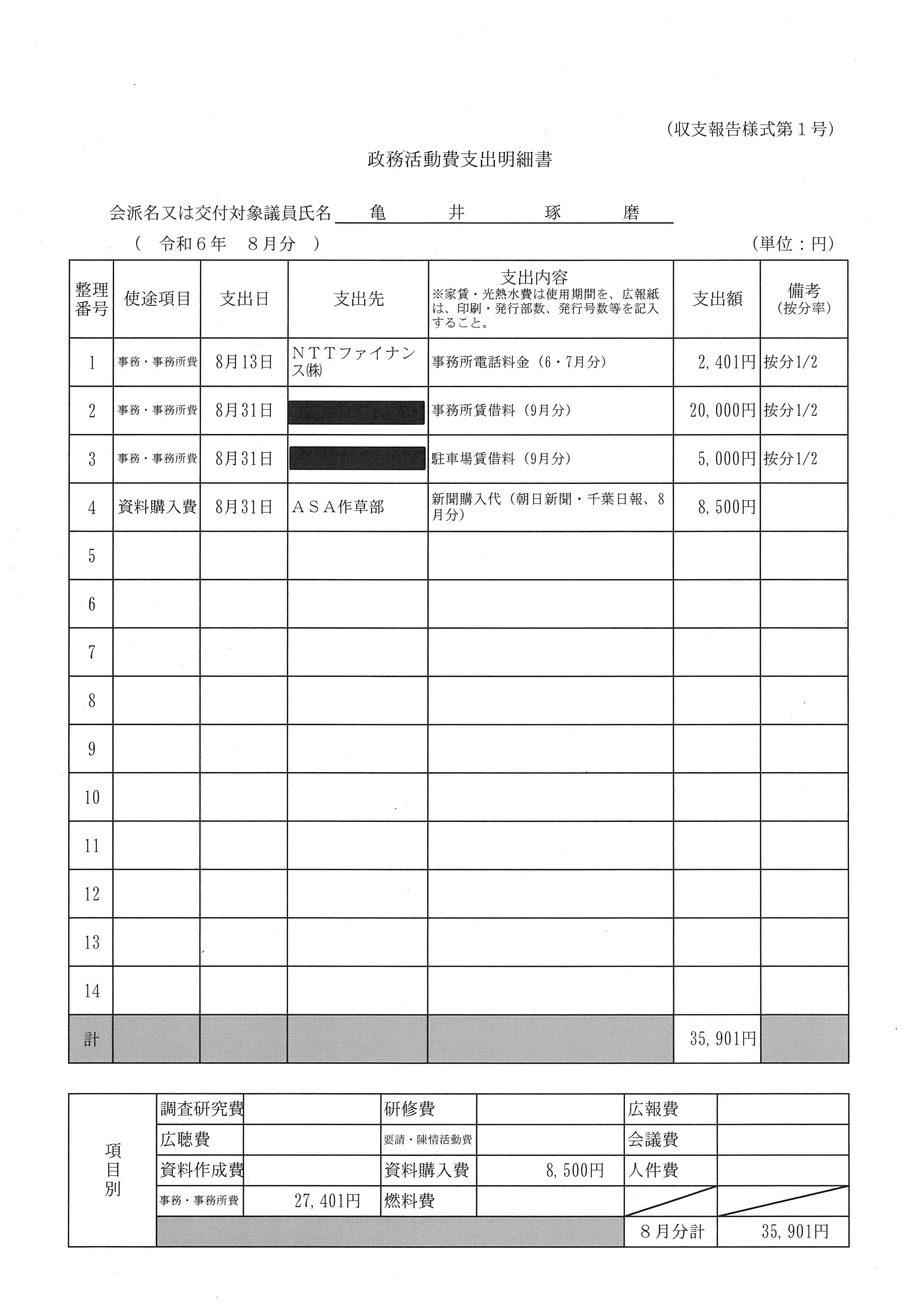 千葉市議会トップページ > 広報・情報公開 > 政務活動費 > 令和6年度交付分(政務活動費収支報告書)