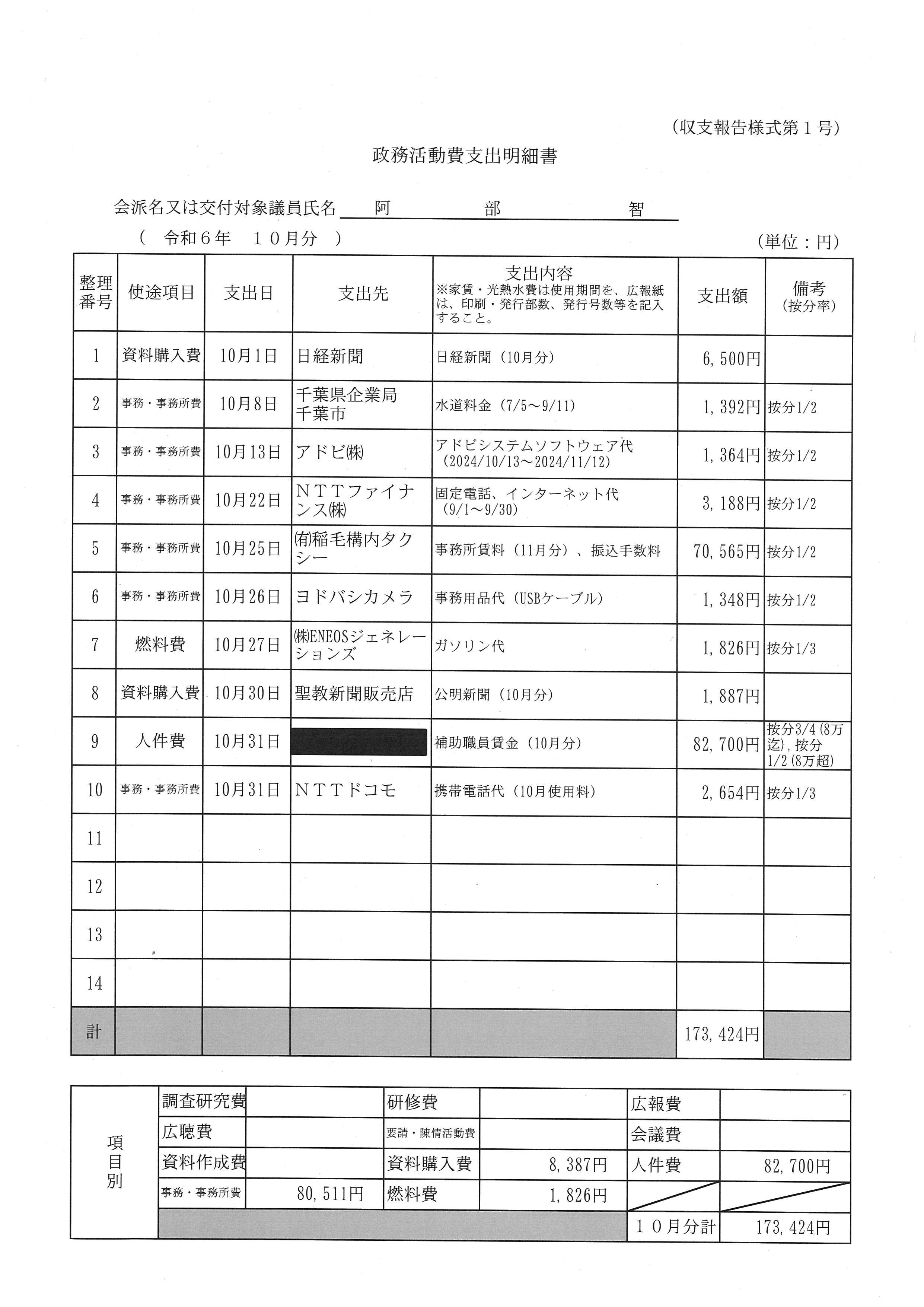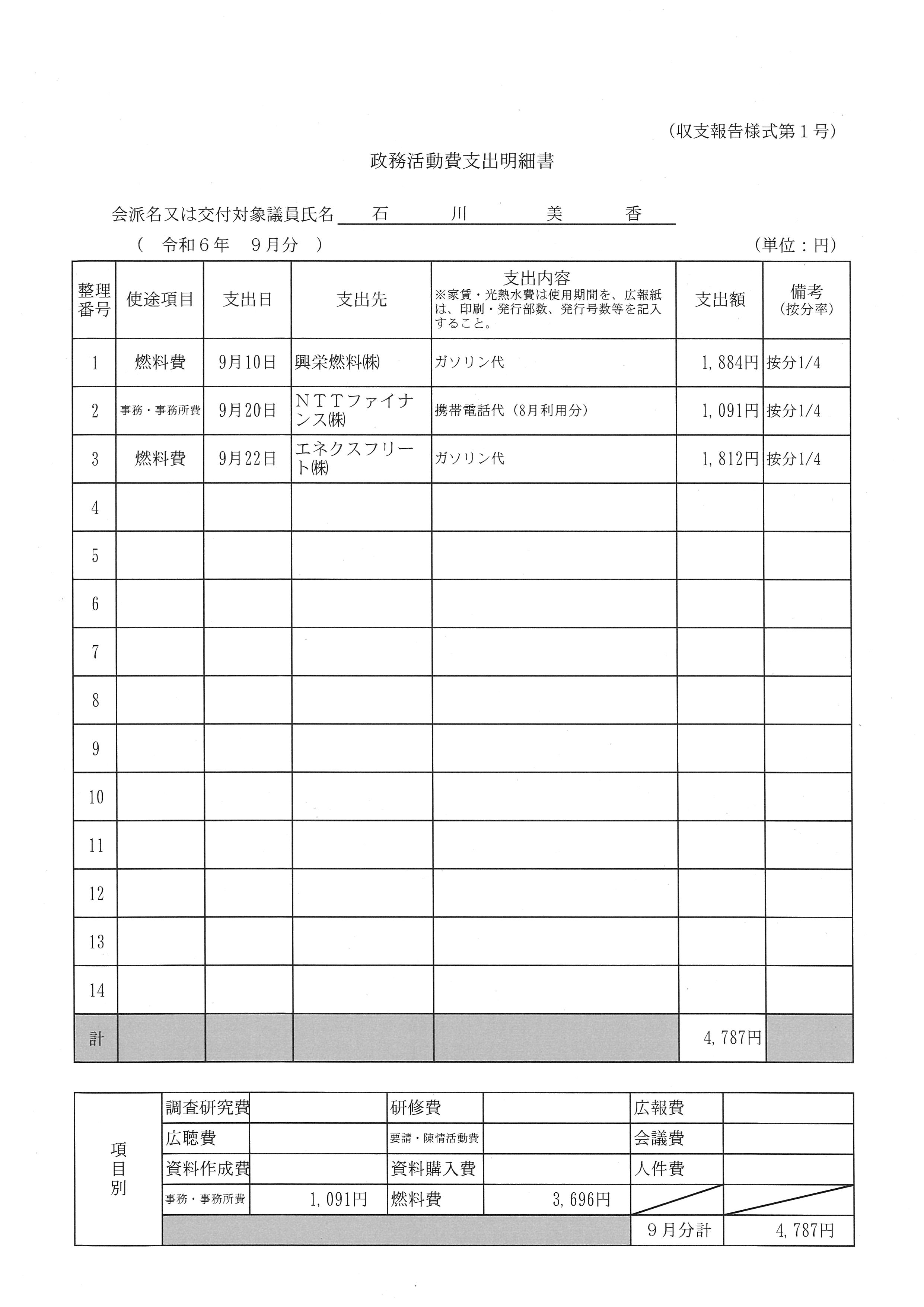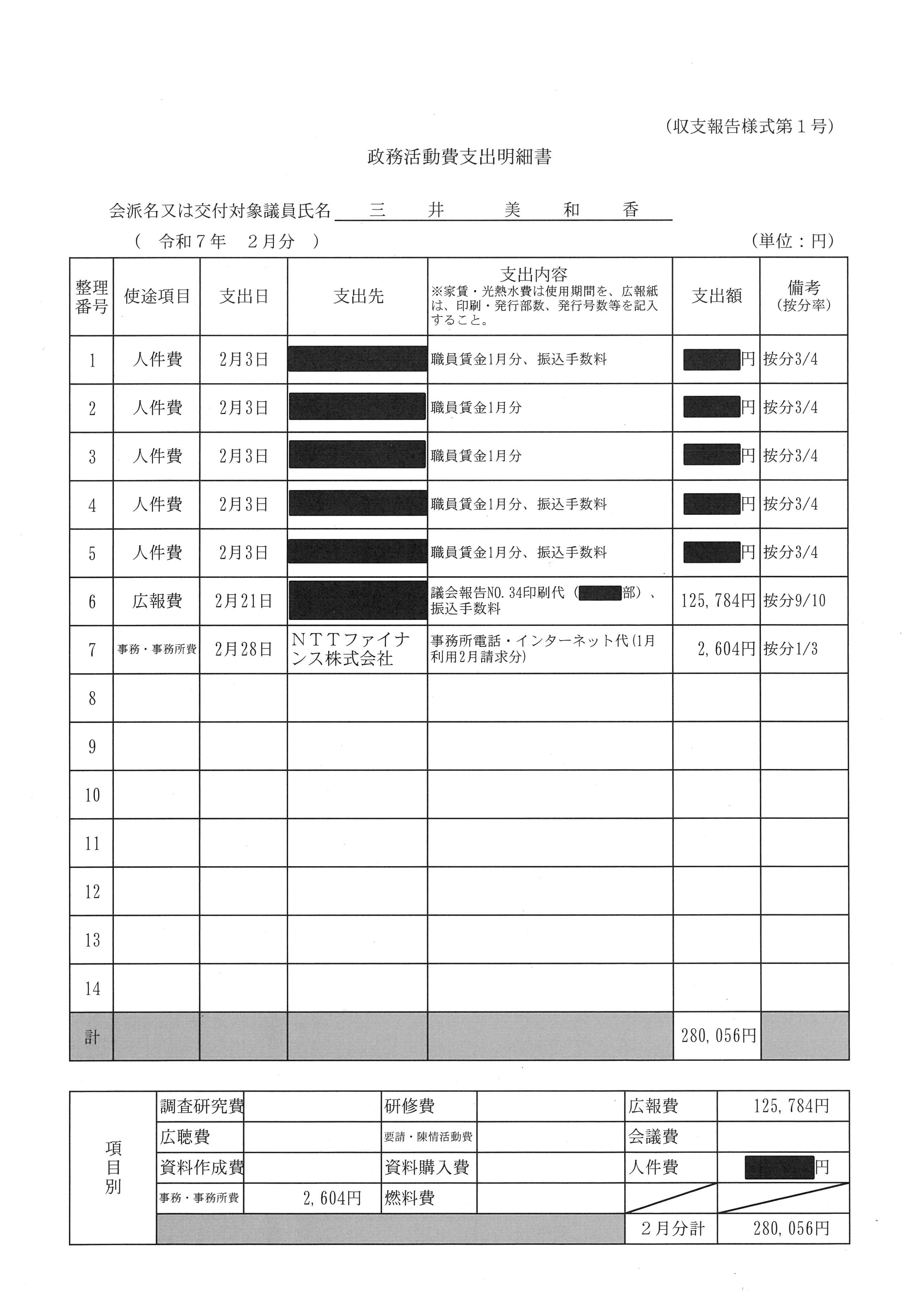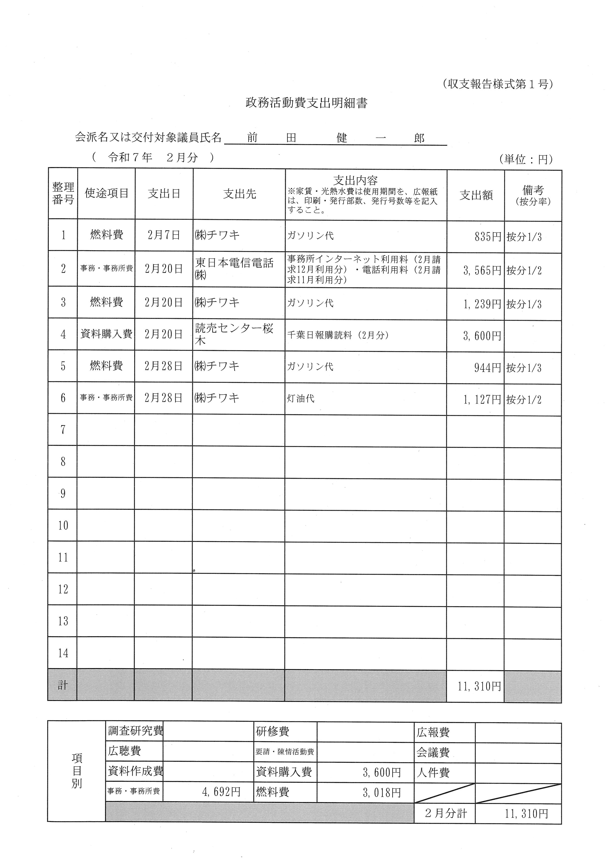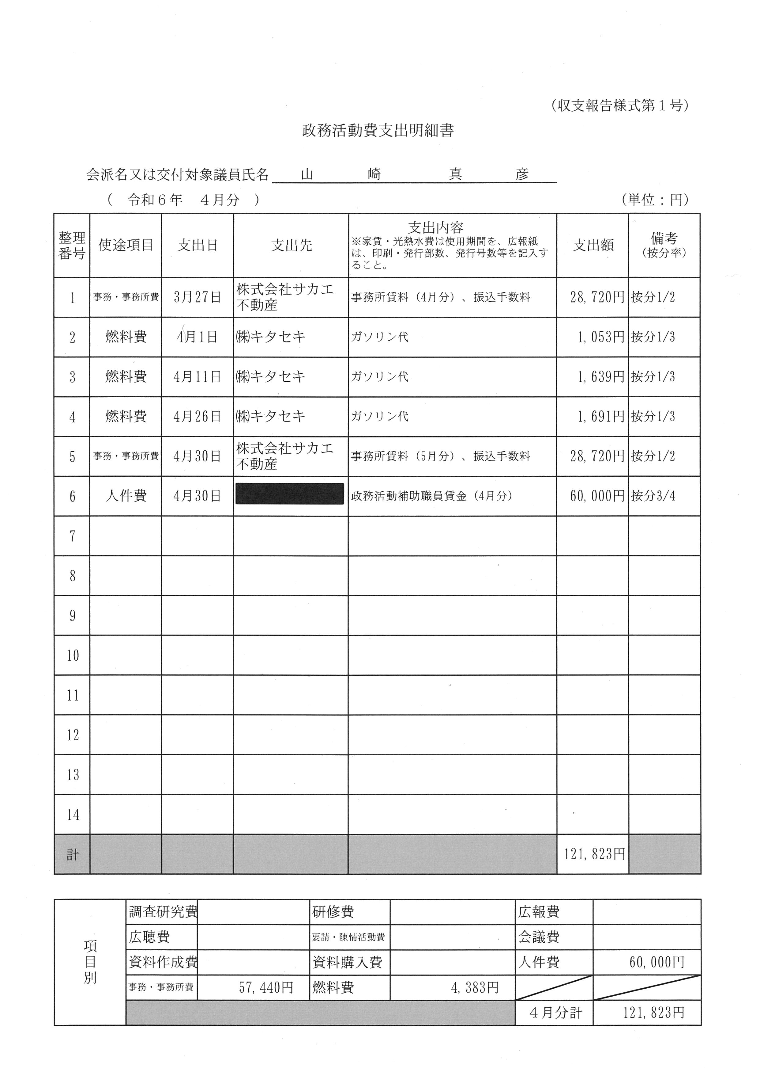 千葉市議会トップページ > 広報・情報公開 > 政務活動費 > 令和6年度交付分(政務活動費収支報告書)