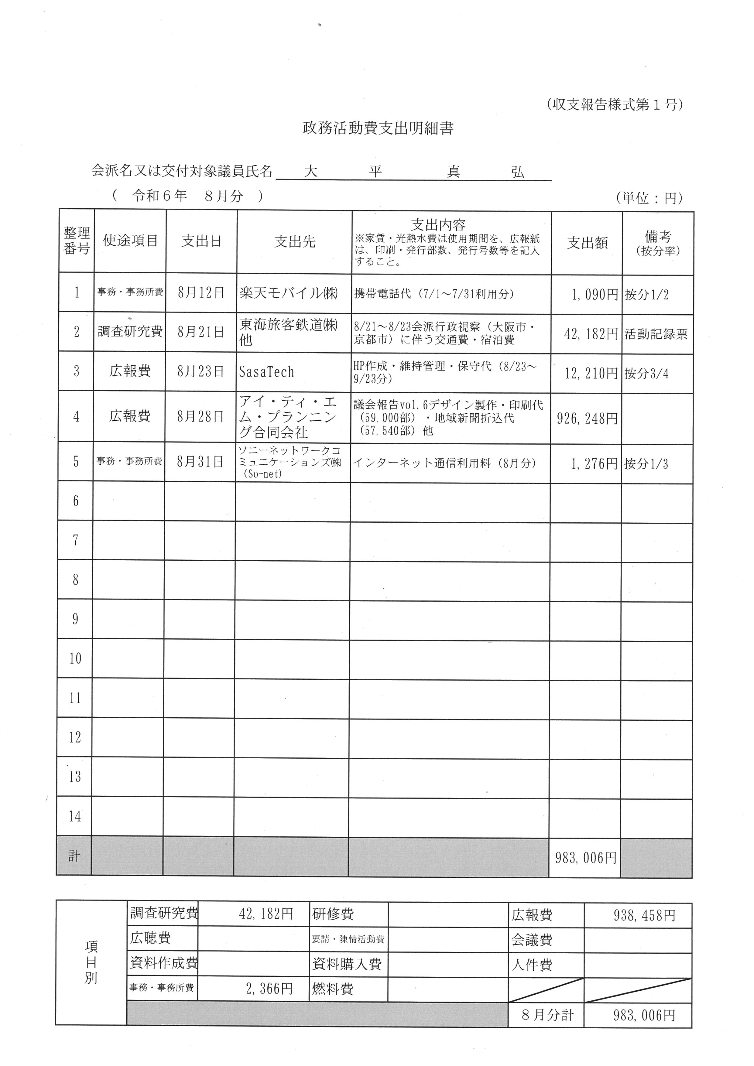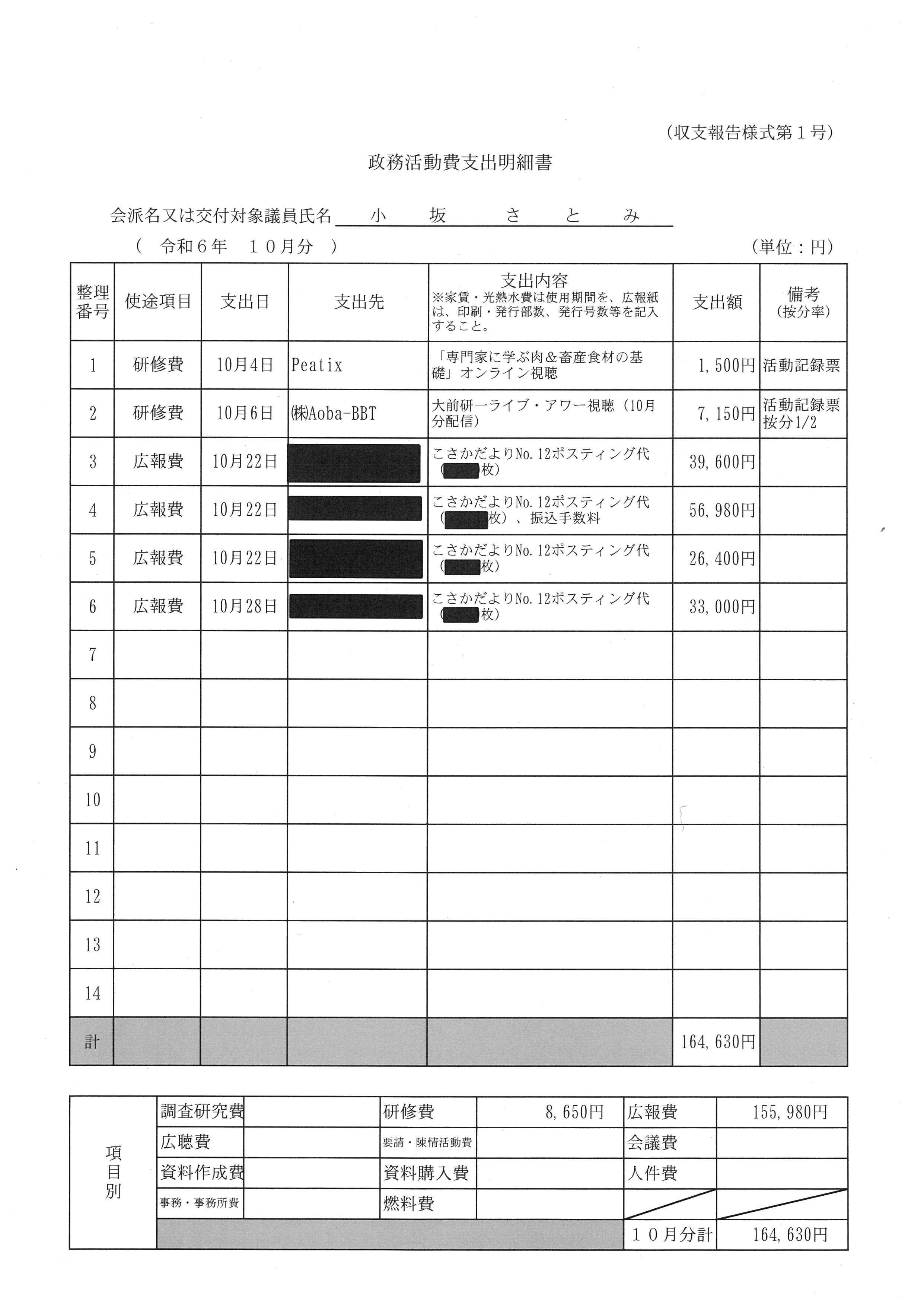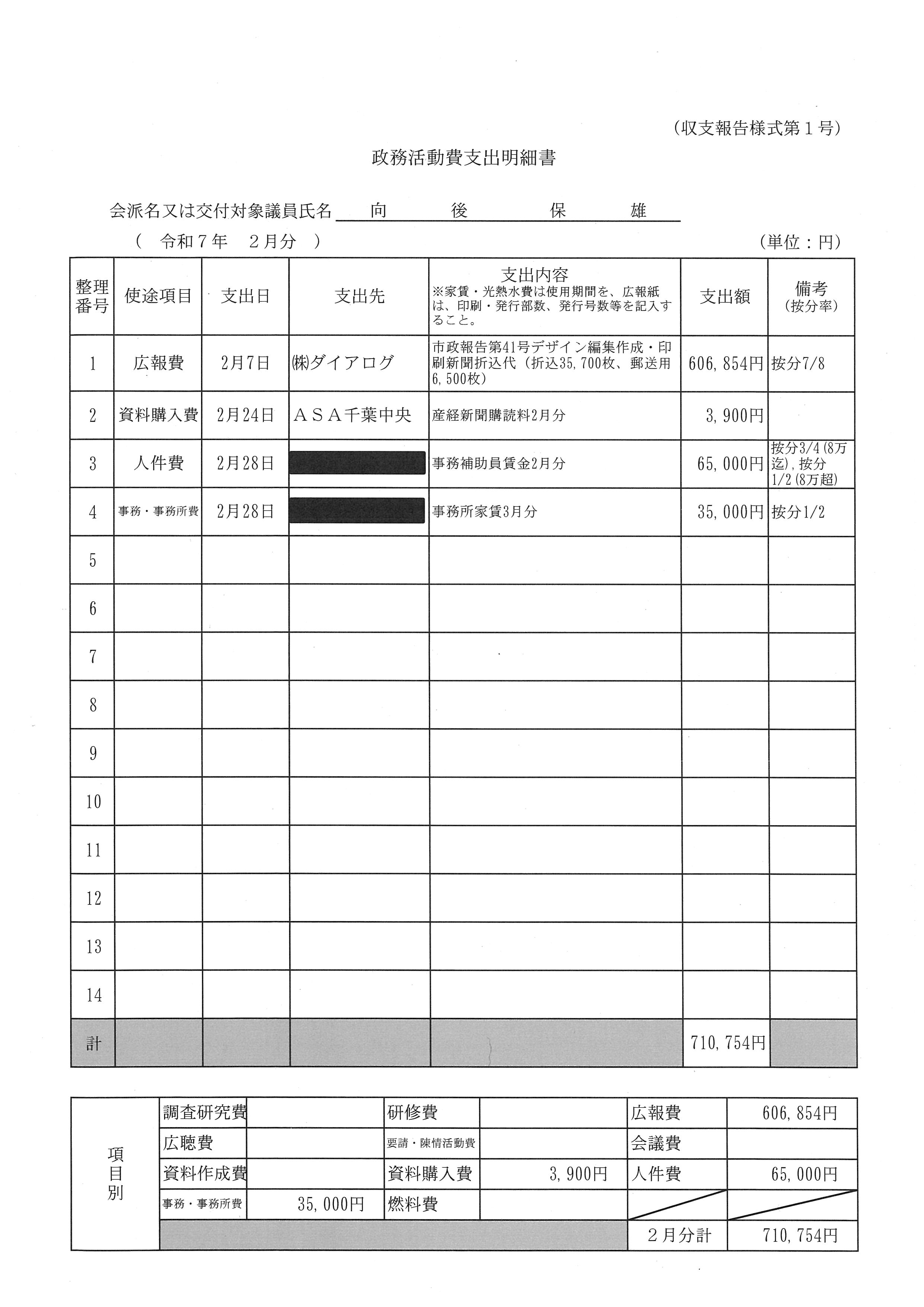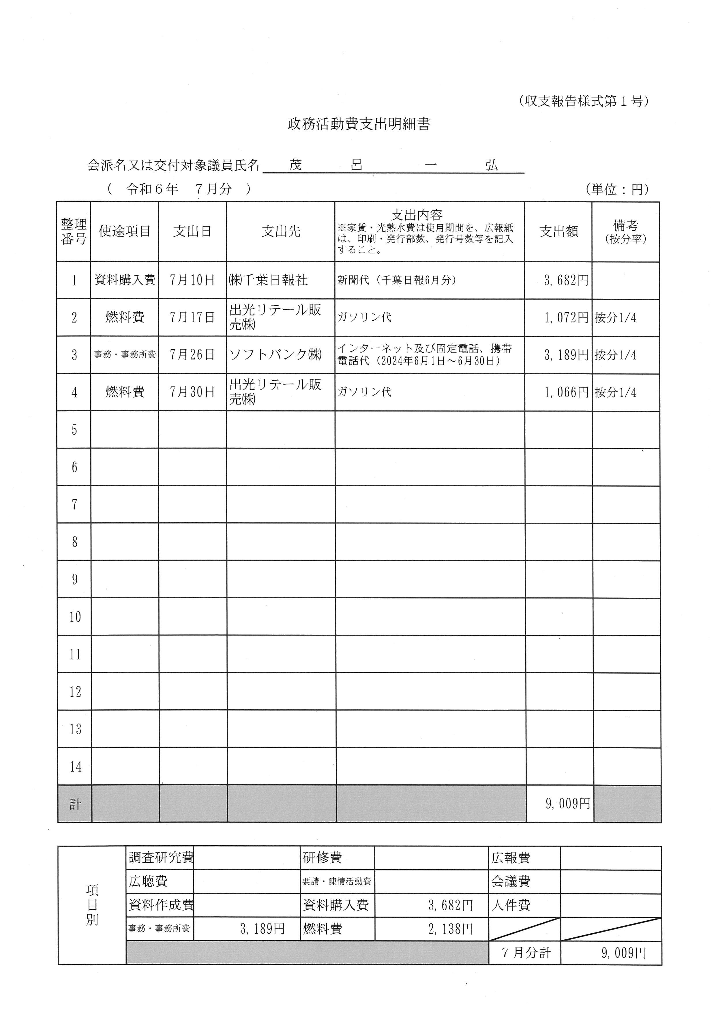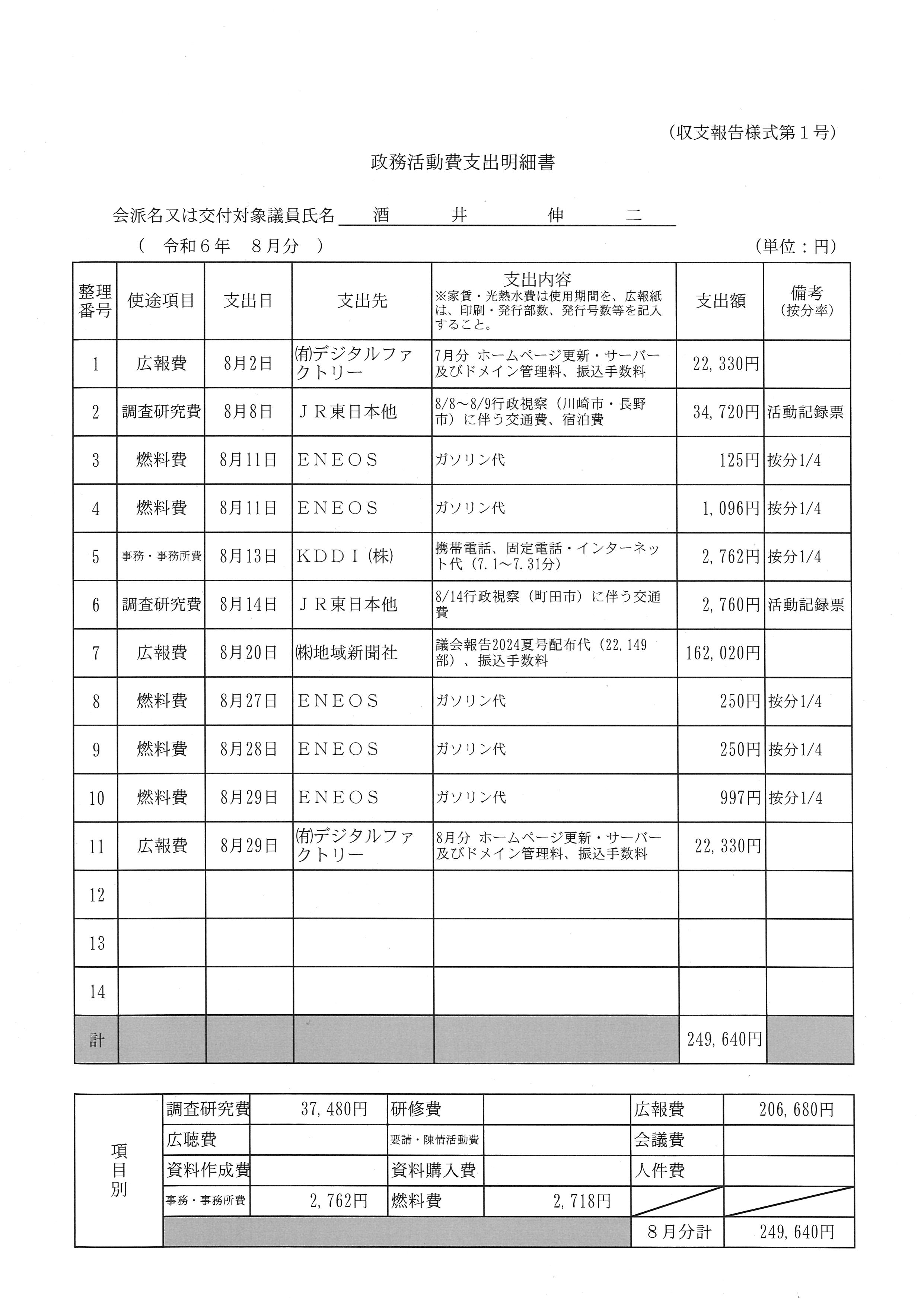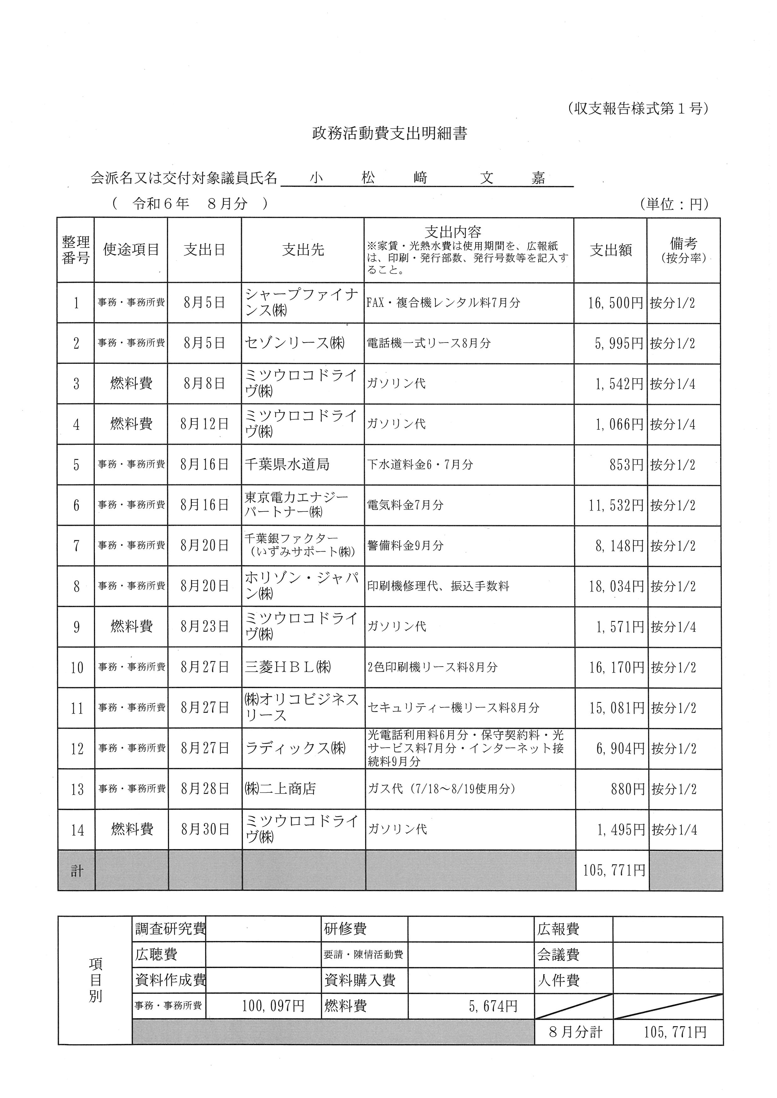 千葉市議会トップページ > 広報・情報公開 > 政務活動費 > 令和6年度交付分(政務活動費収支報告書)