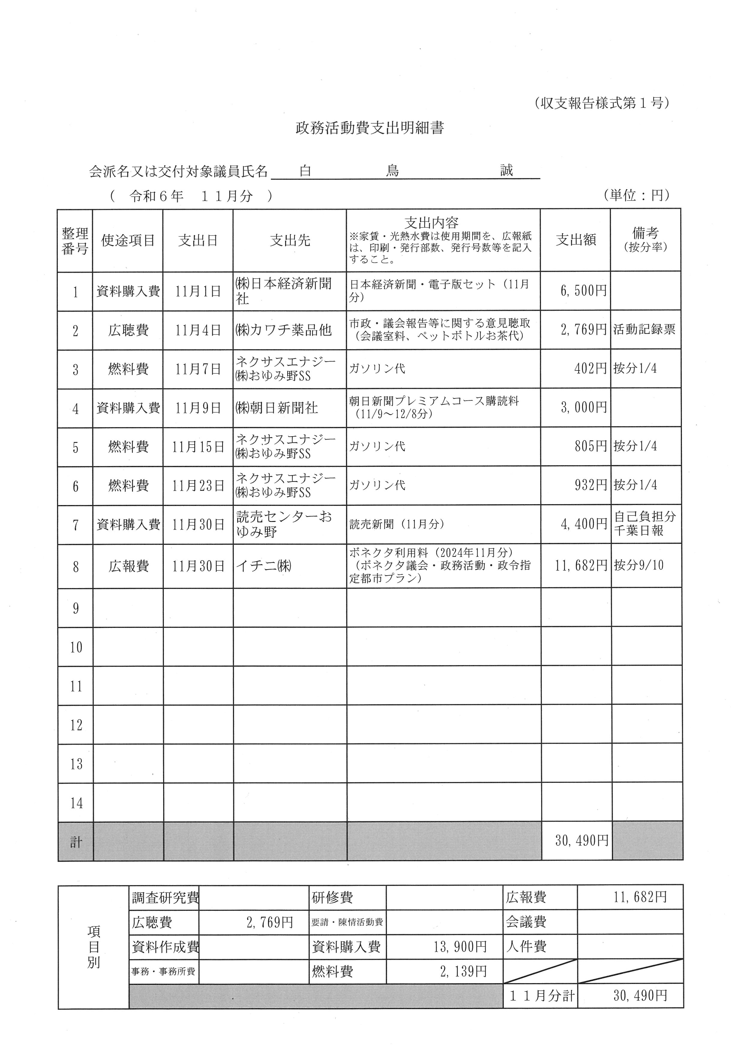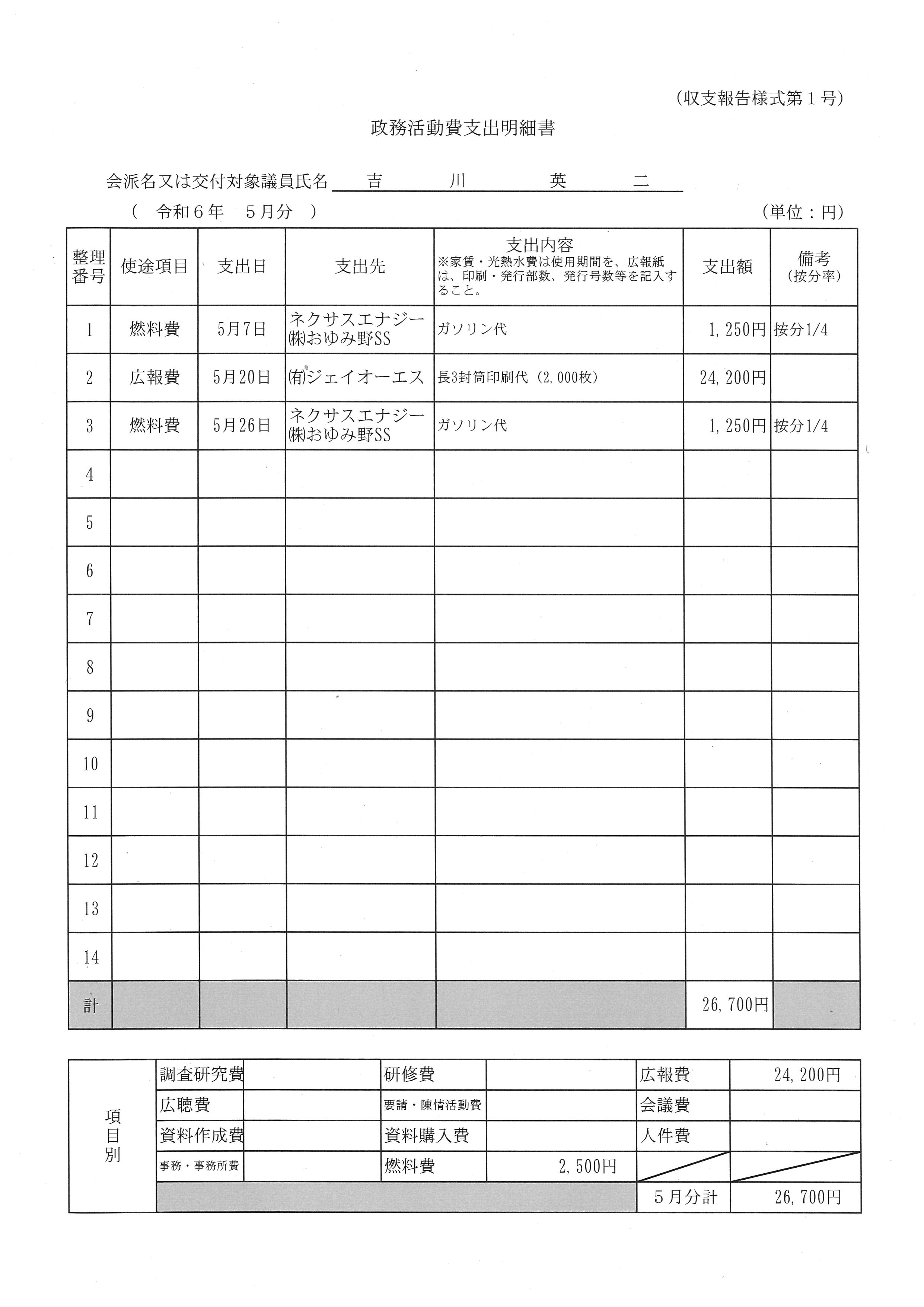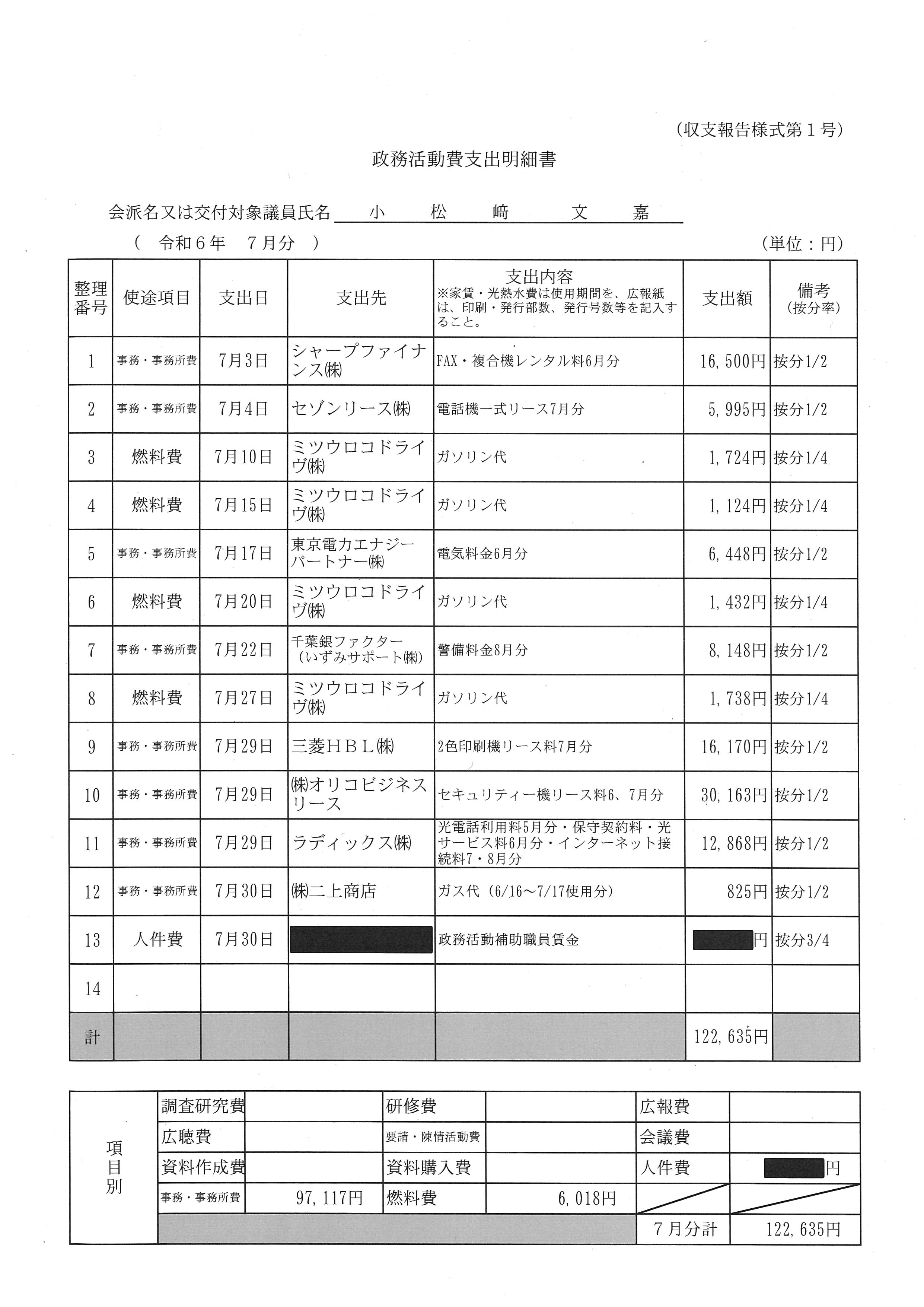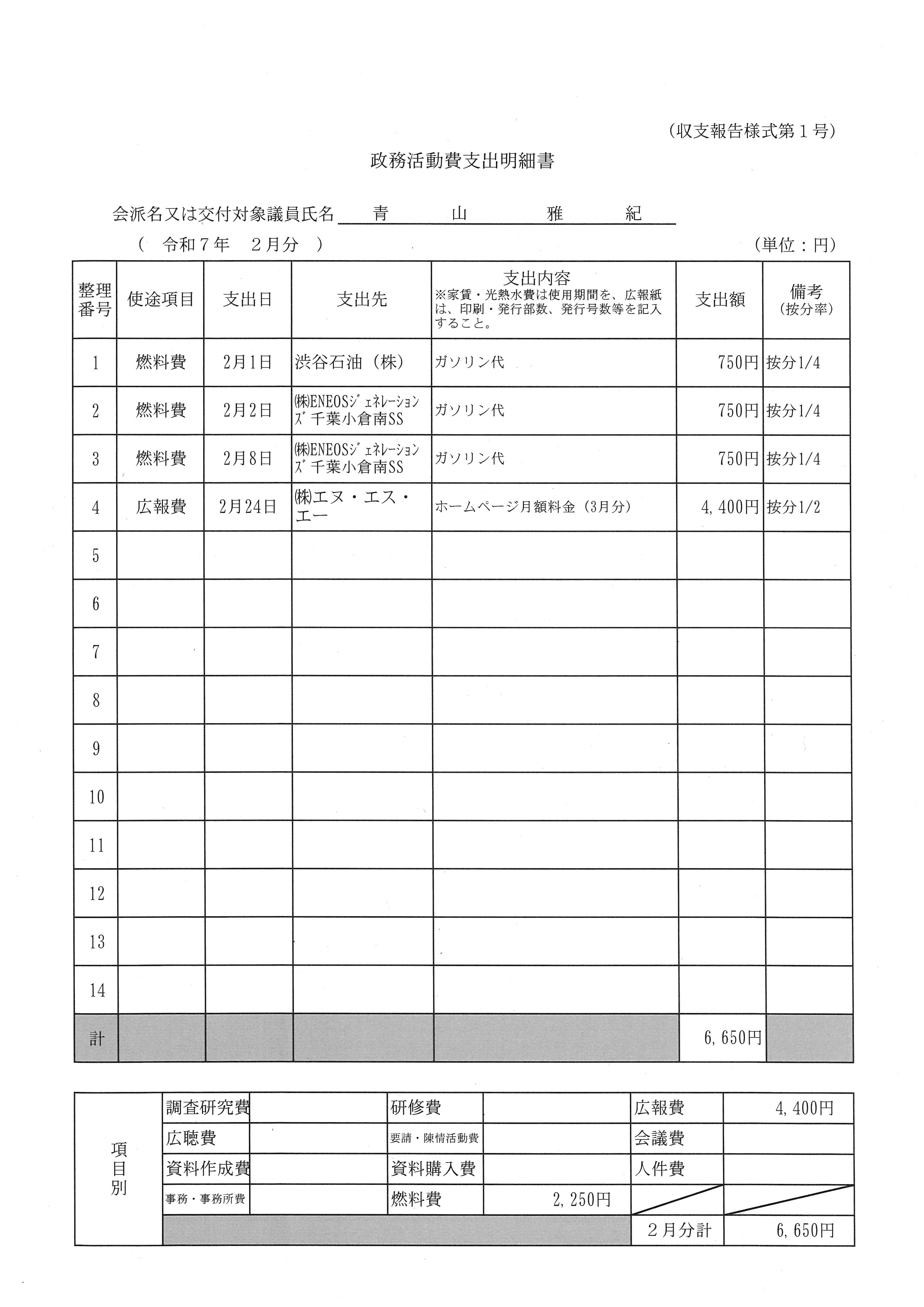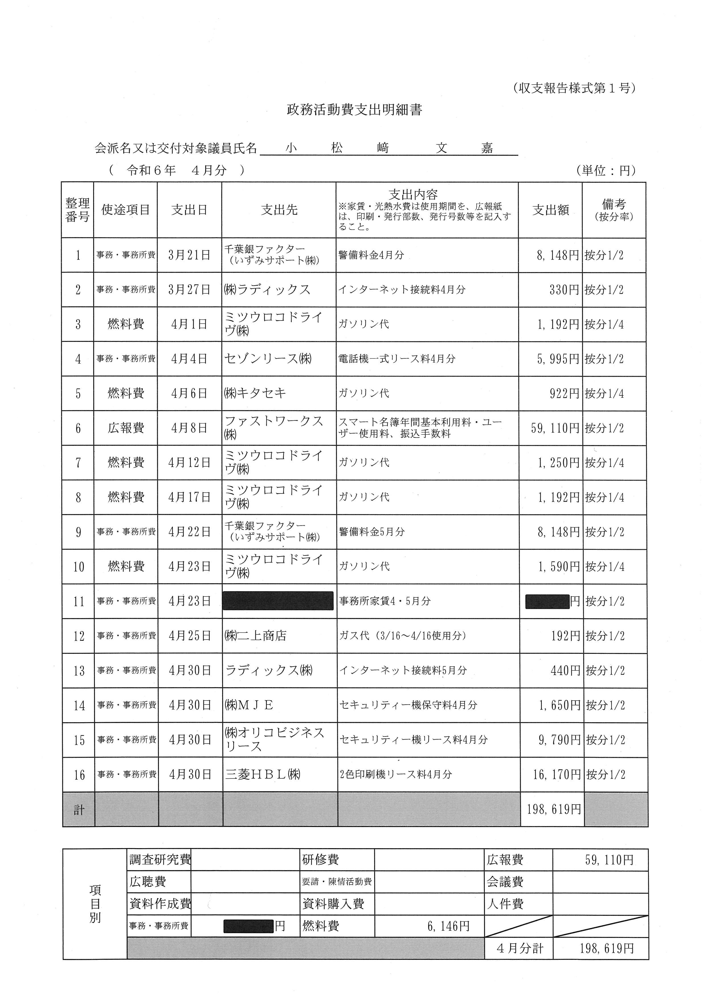 千葉市議会トップページ > 広報・情報公開 > 政務活動費 > 令和6年度交付分(政務活動費収支報告書)