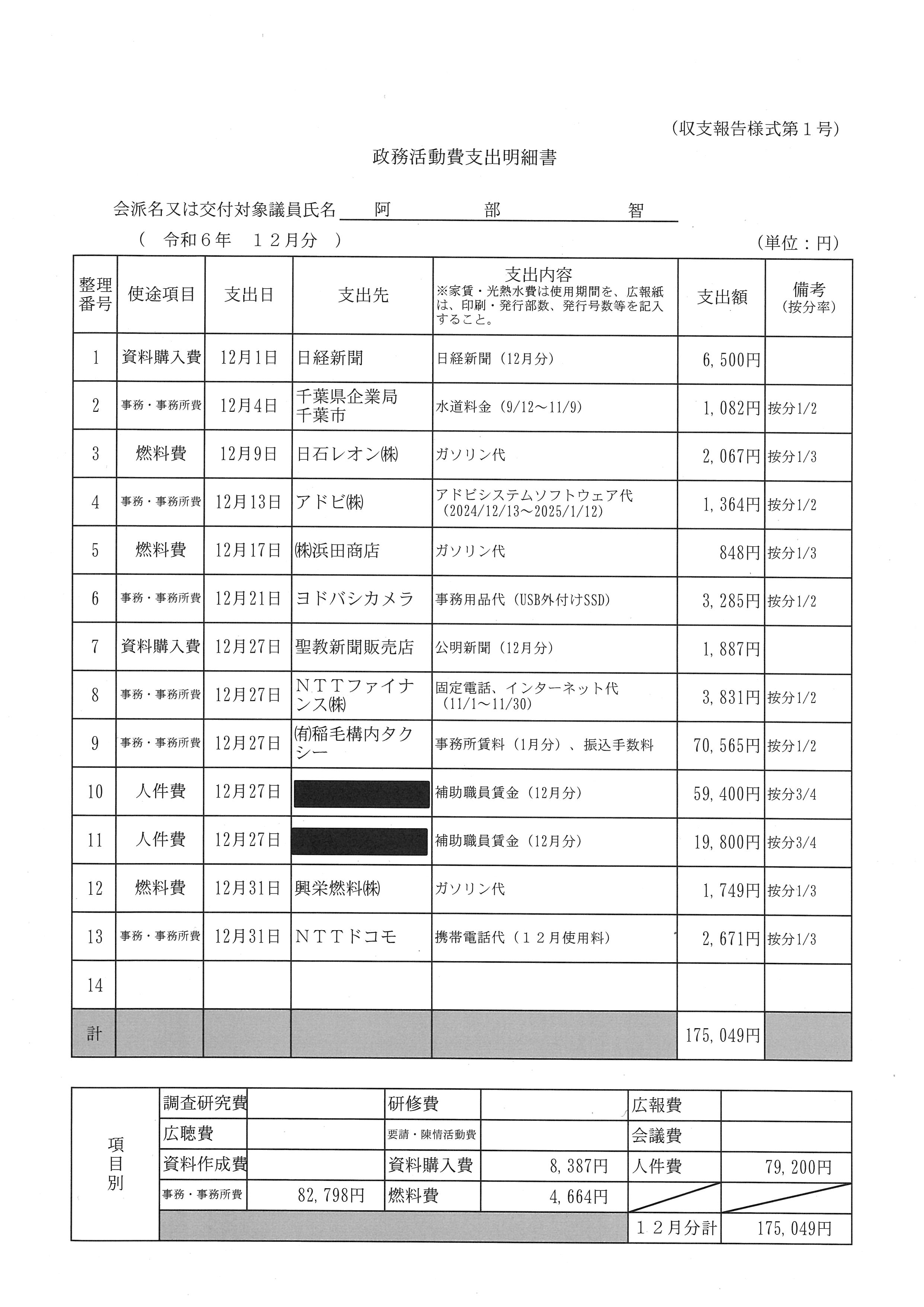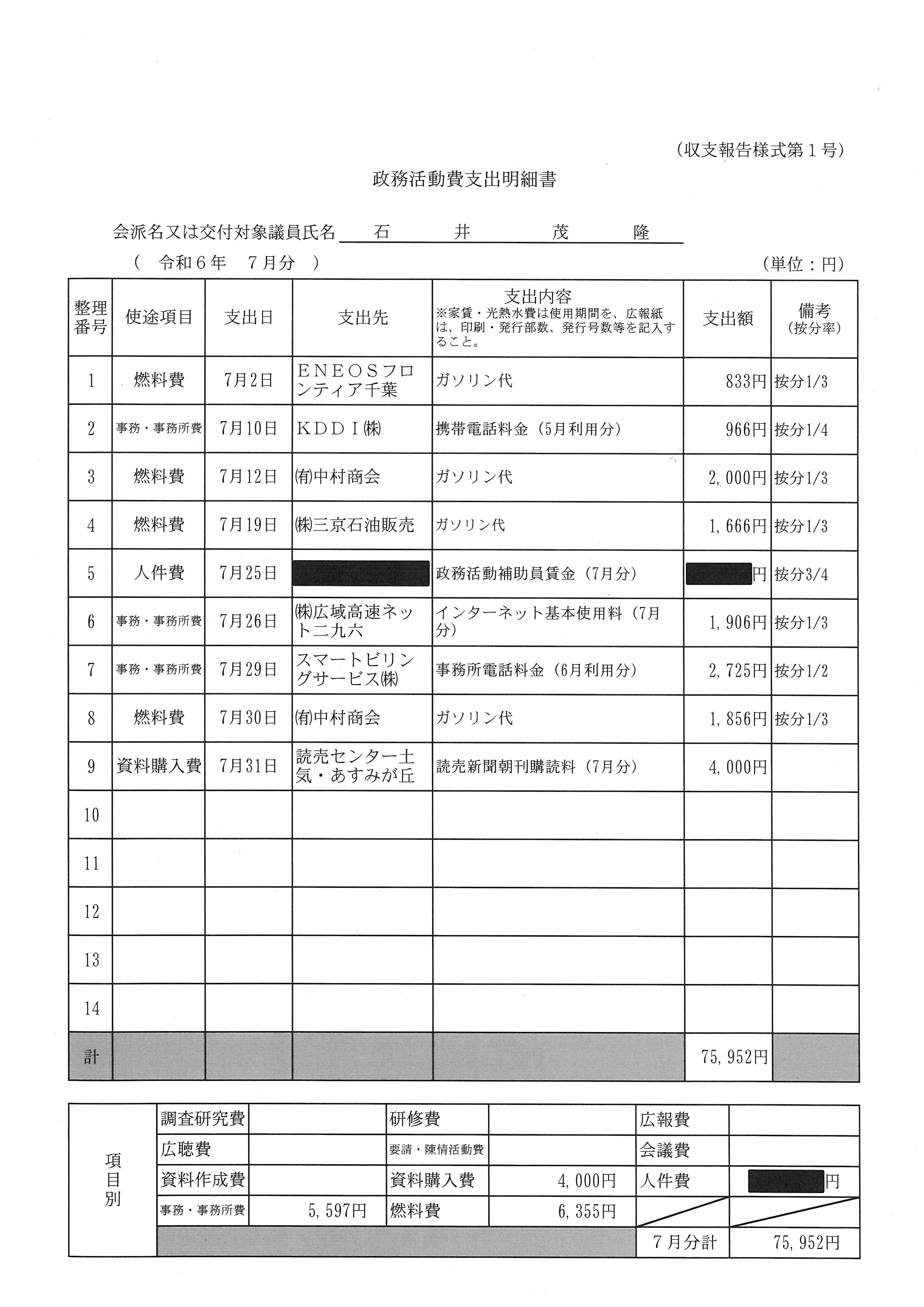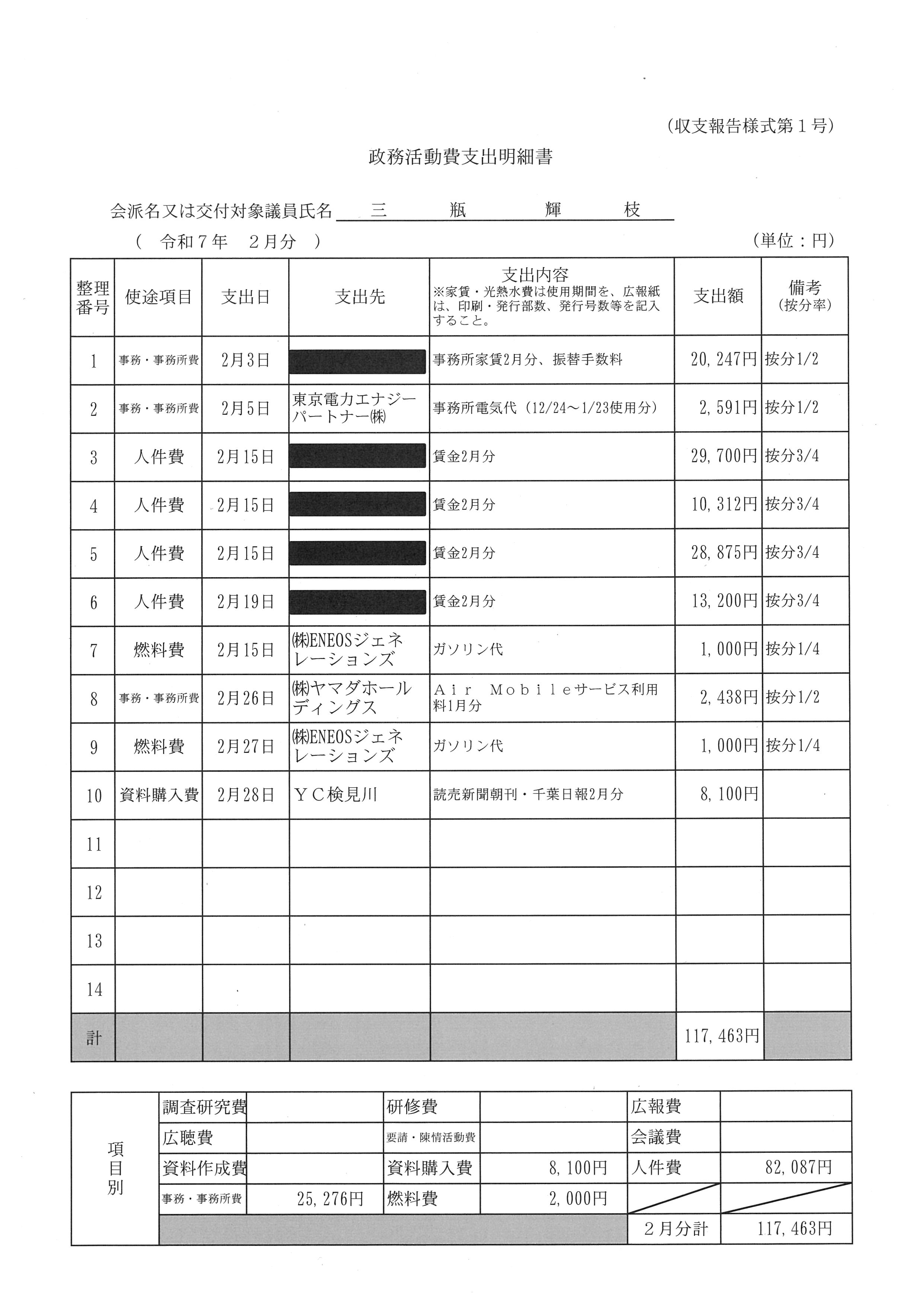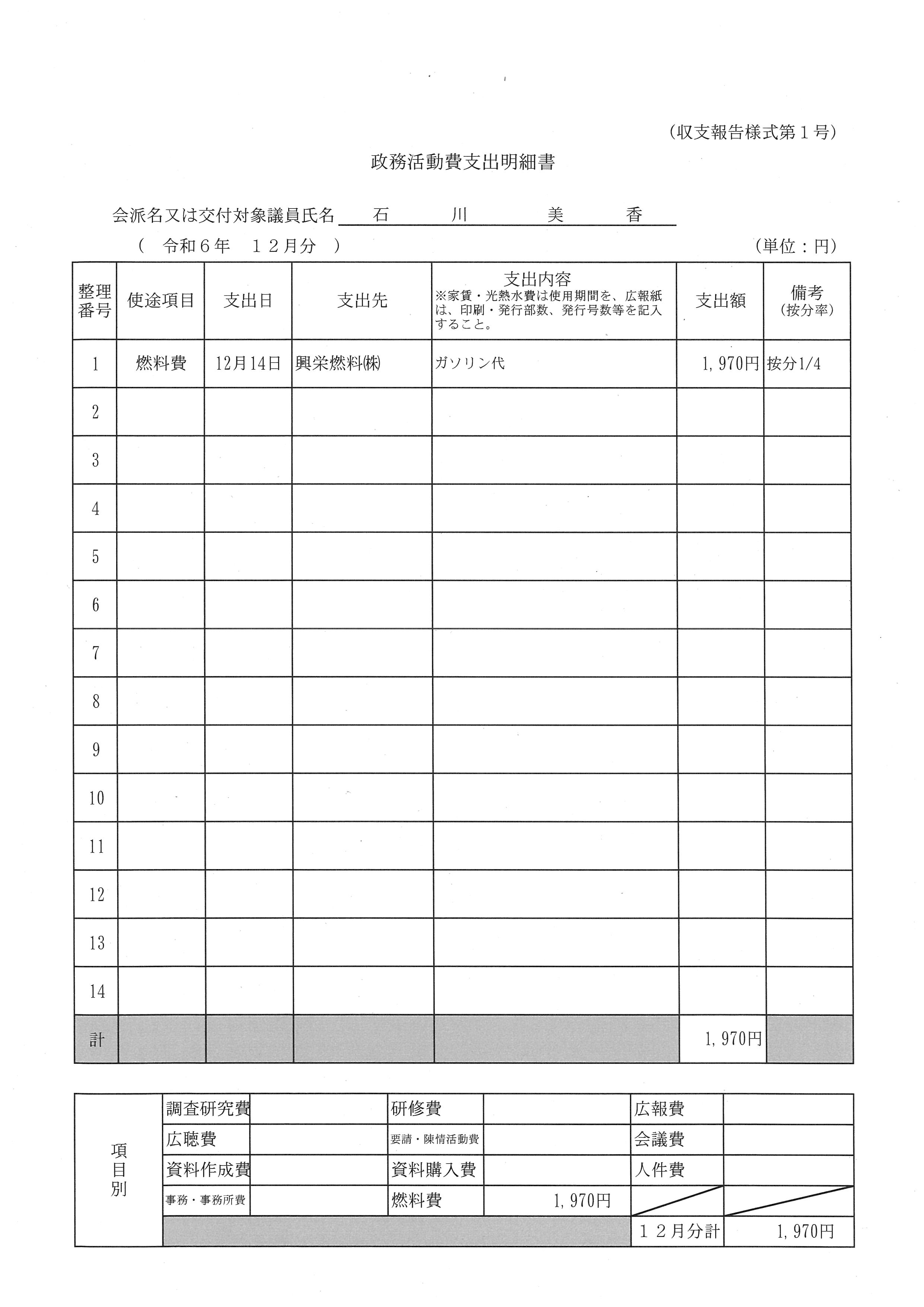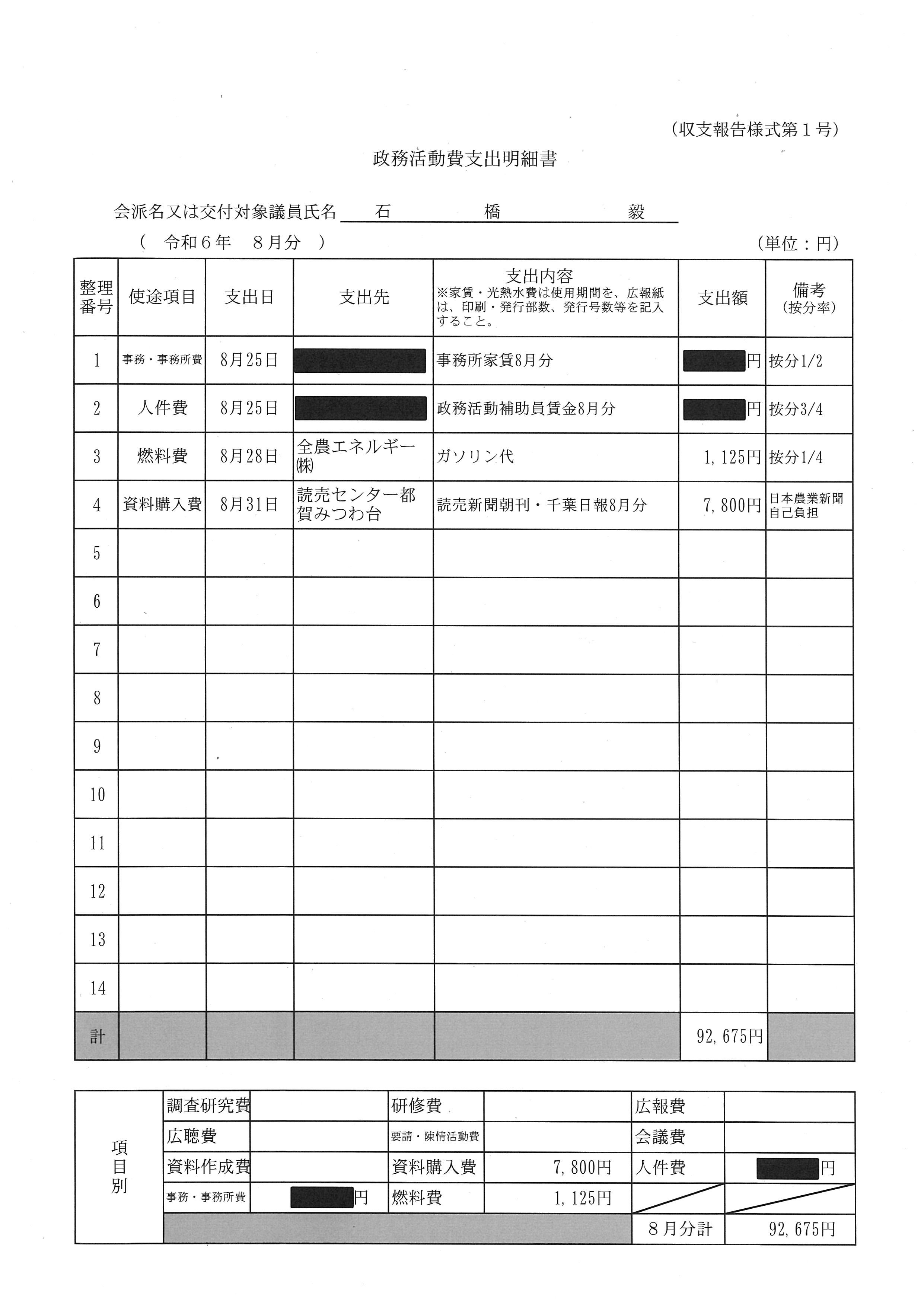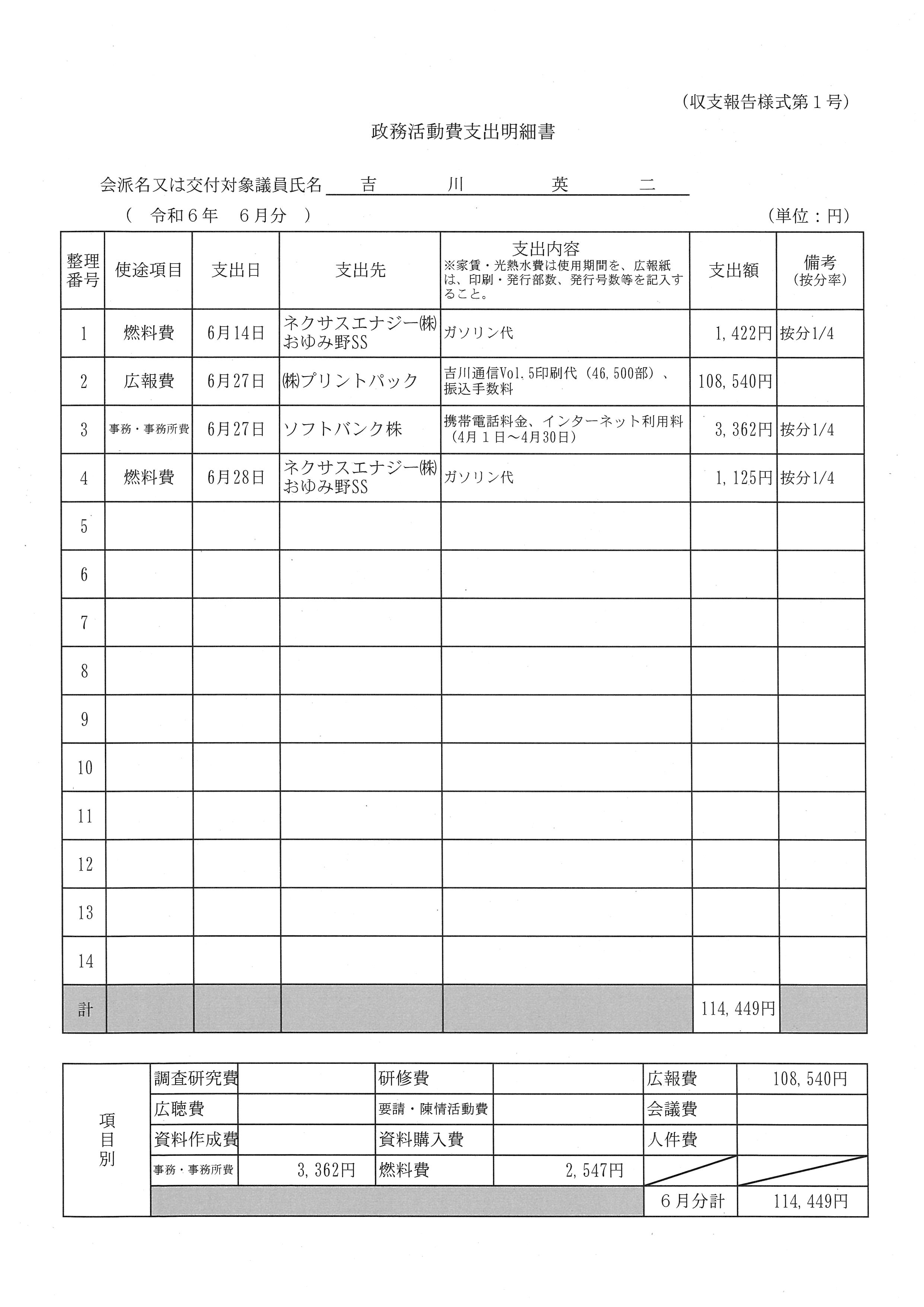 千葉市議会トップページ > 広報・情報公開 > 政務活動費 > 令和6年度交付分(政務活動費収支報告書)