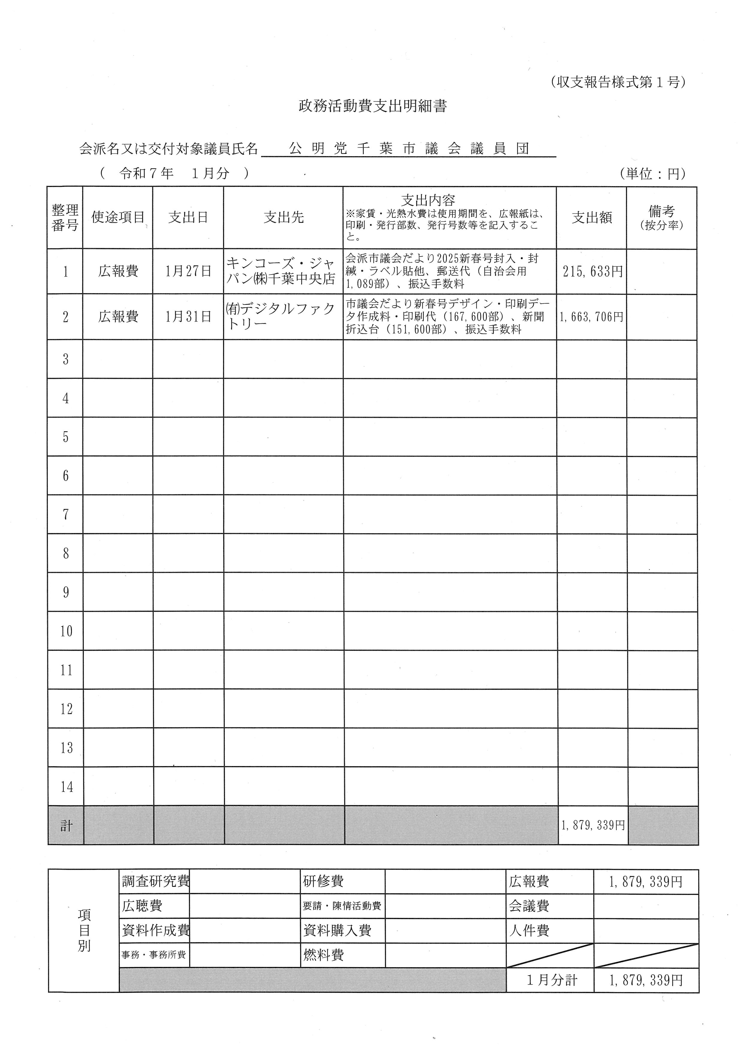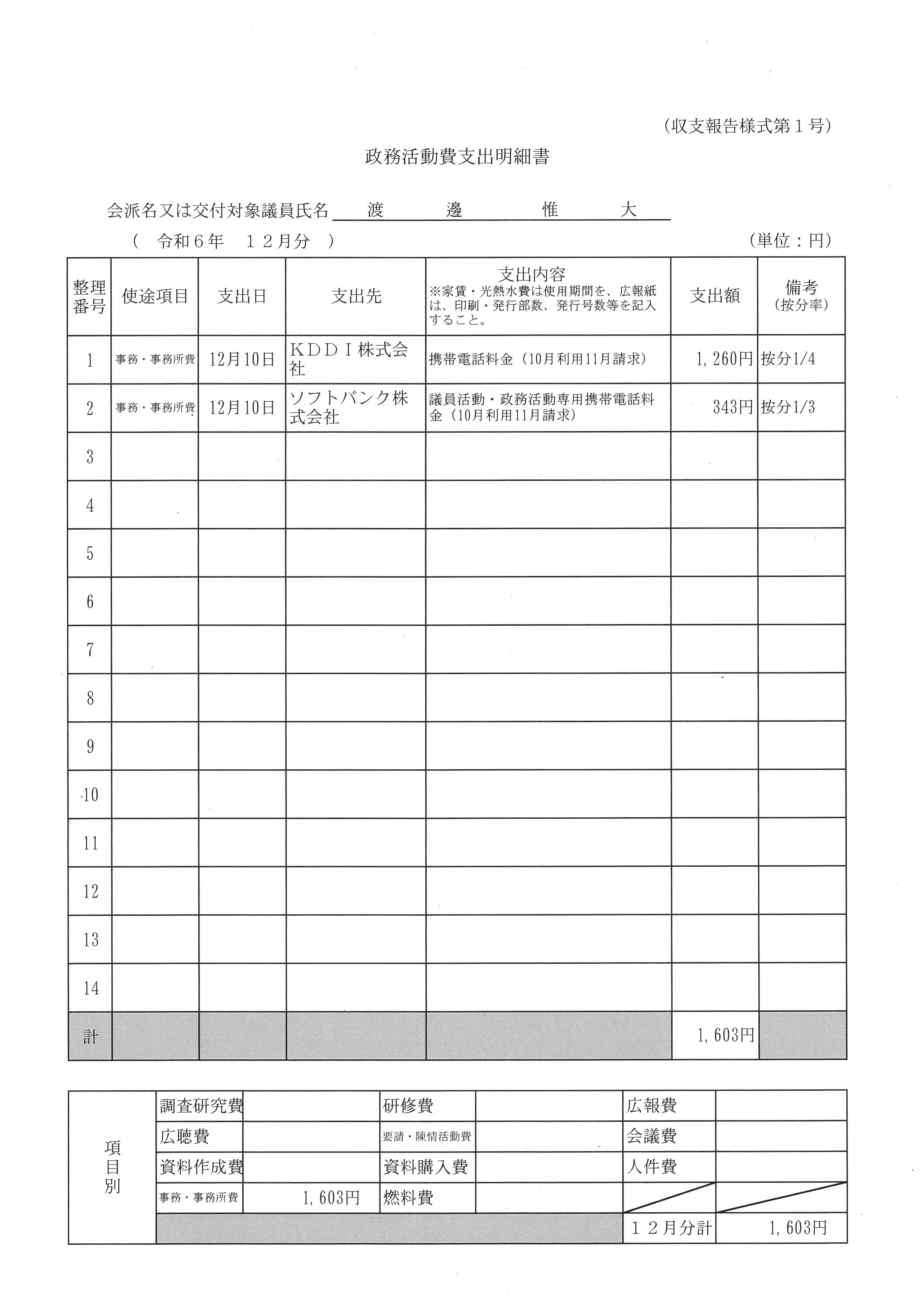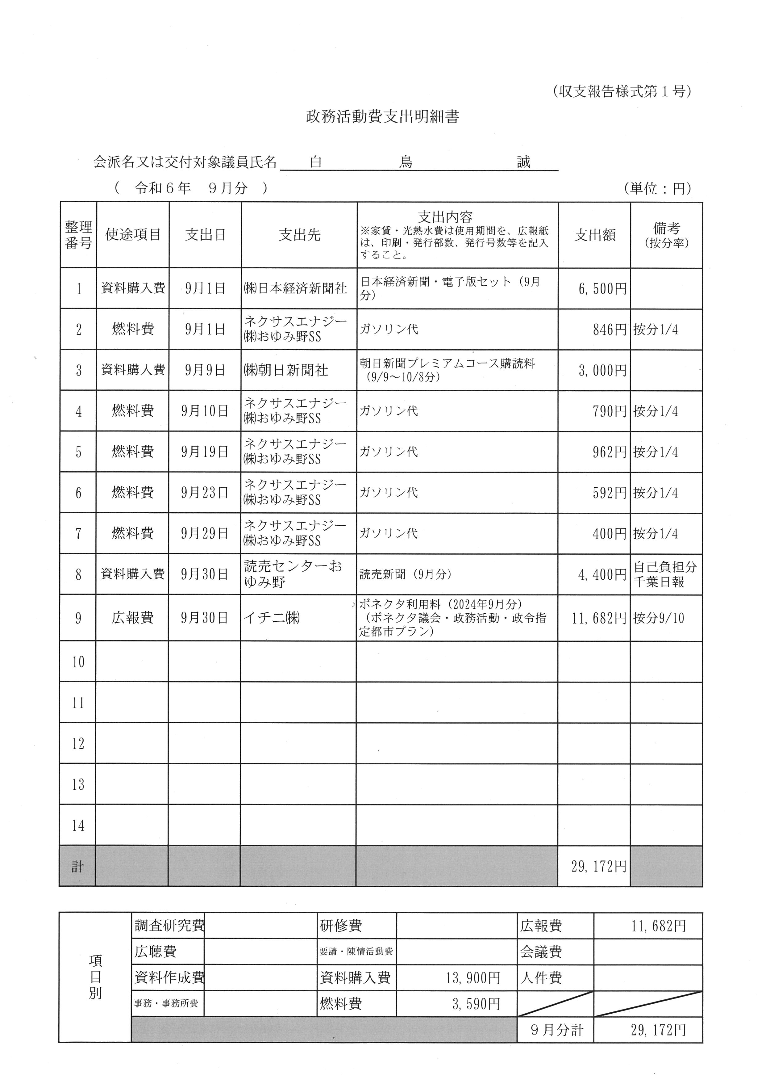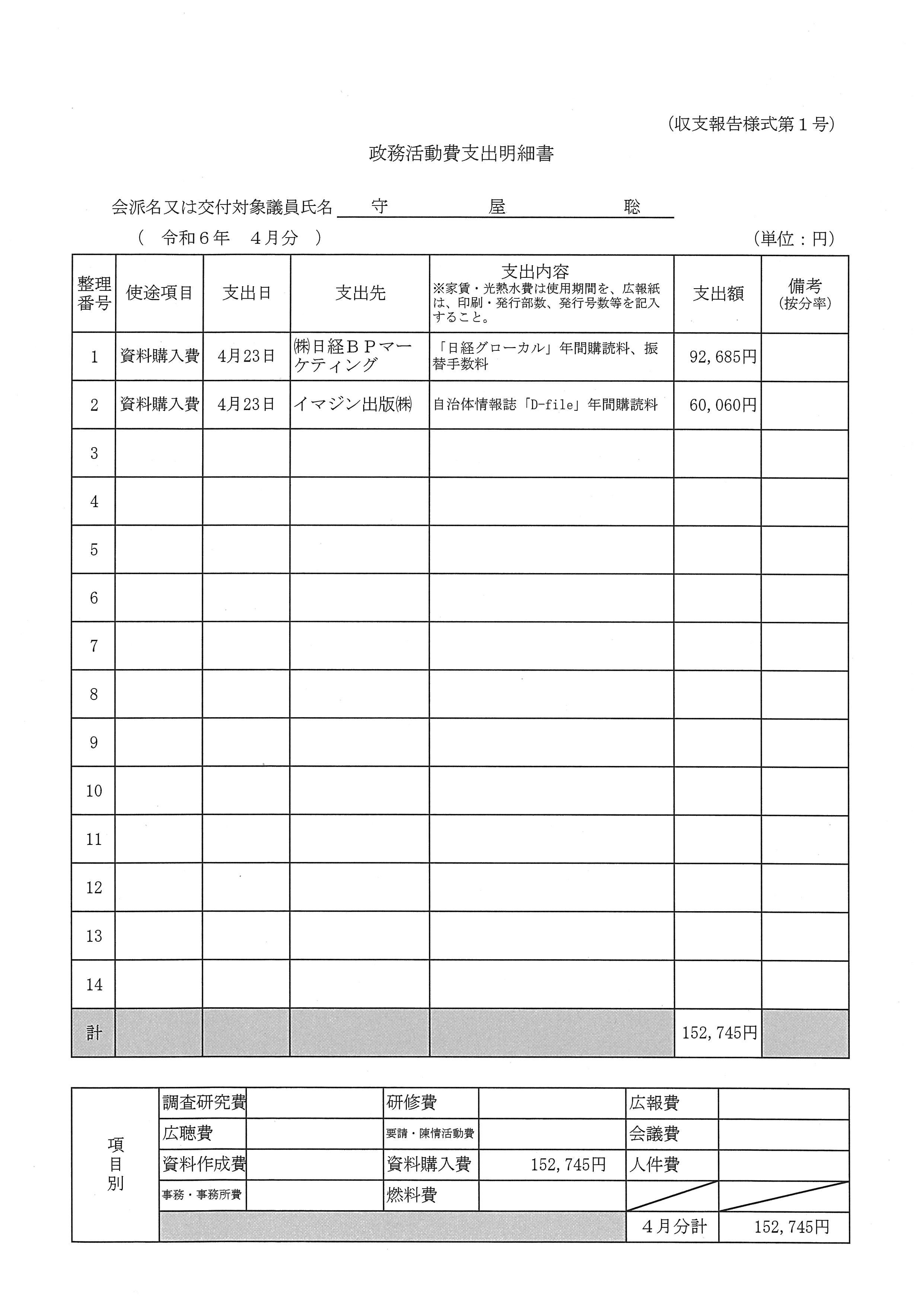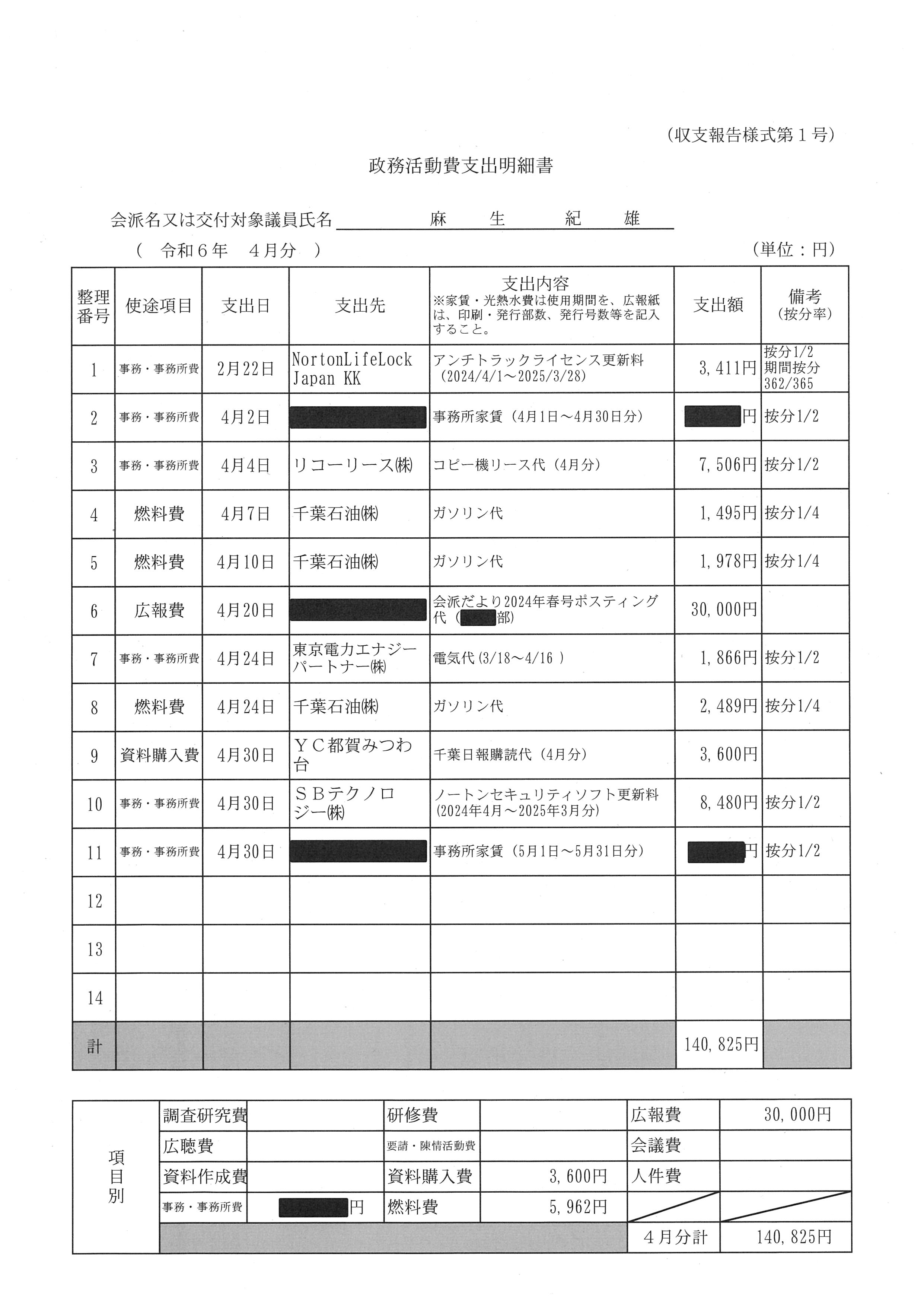 千葉市議会トップページ > 広報・情報公開 > 政務活動費 > 令和6年度交付分(政務活動費収支報告書)