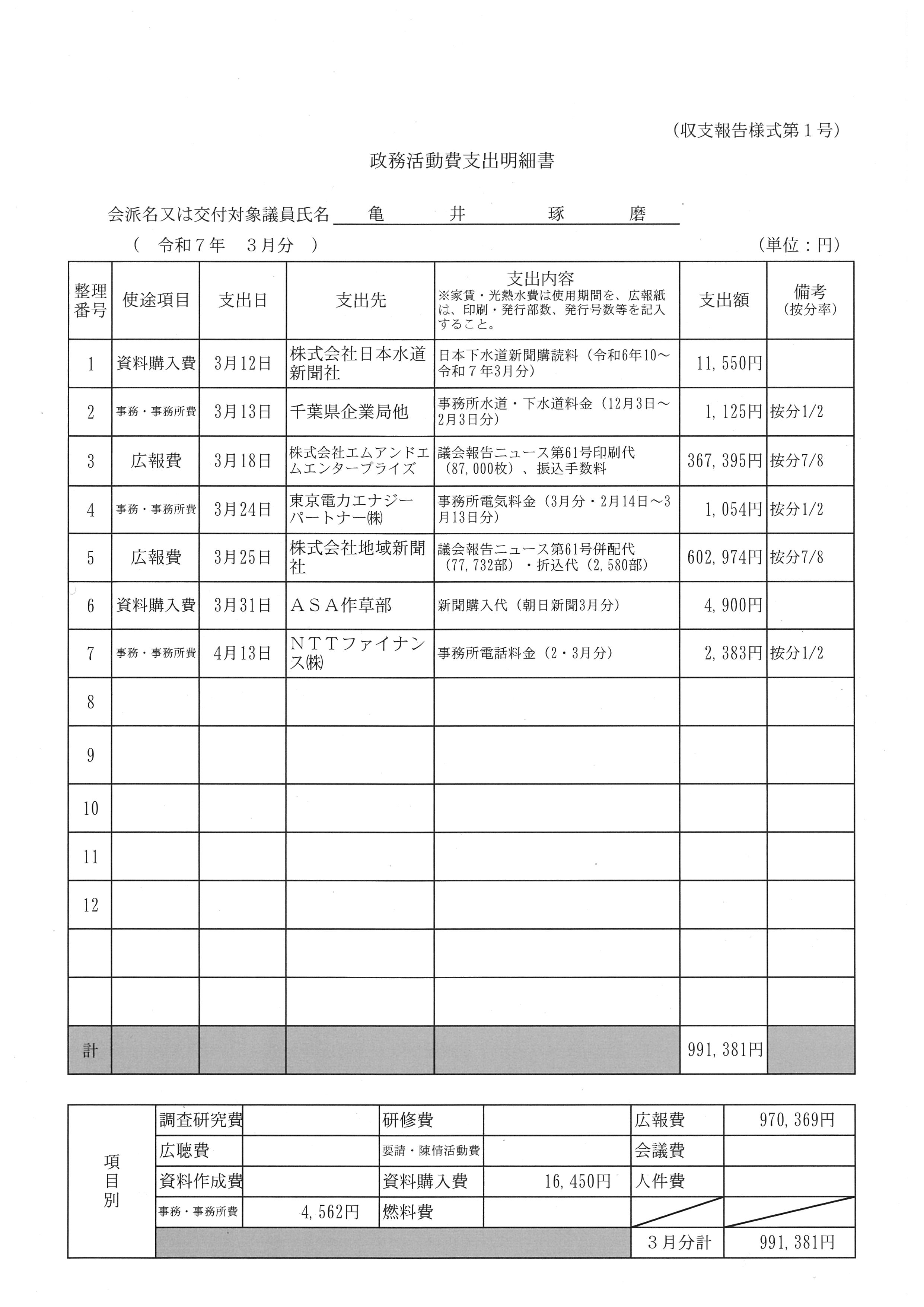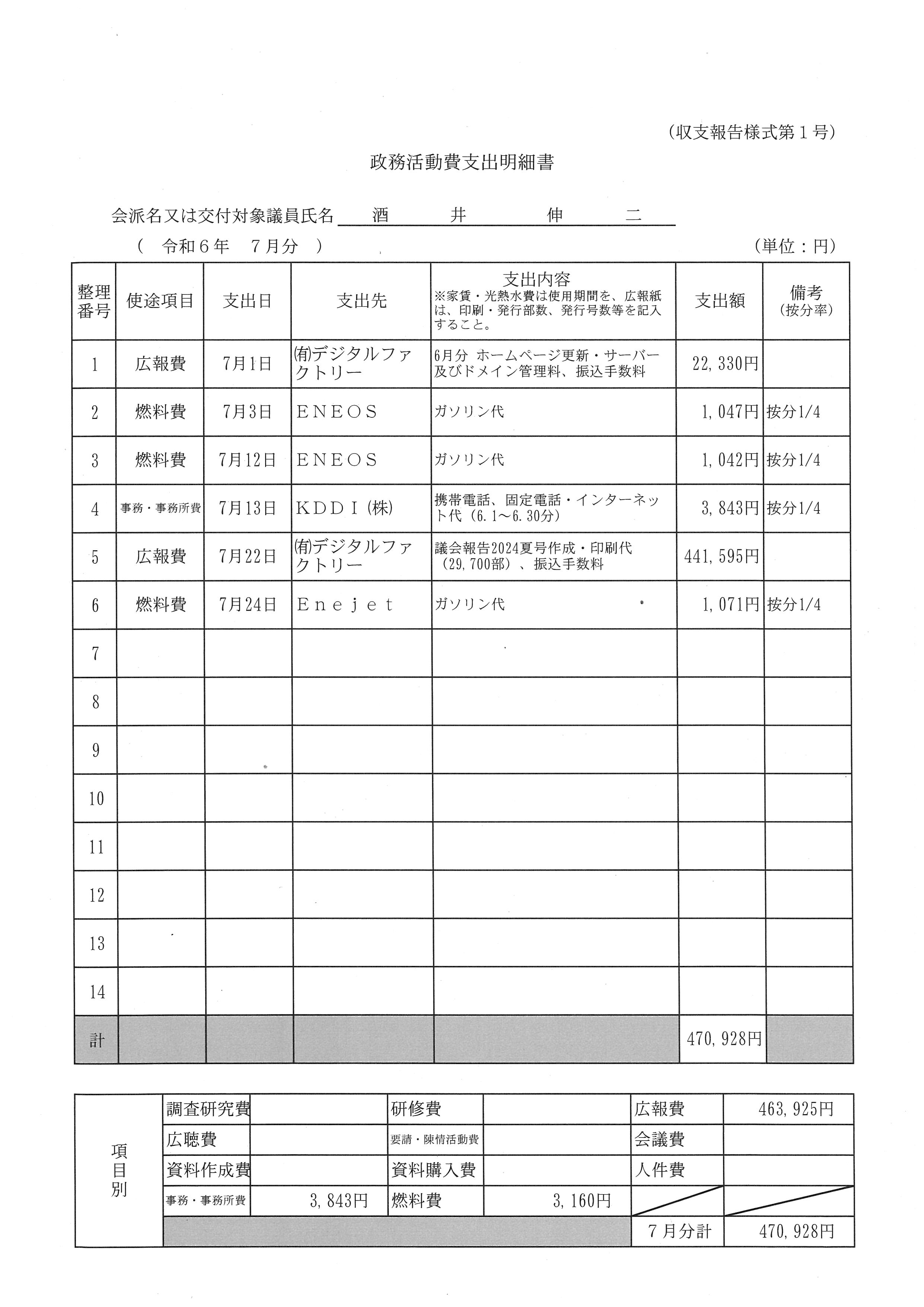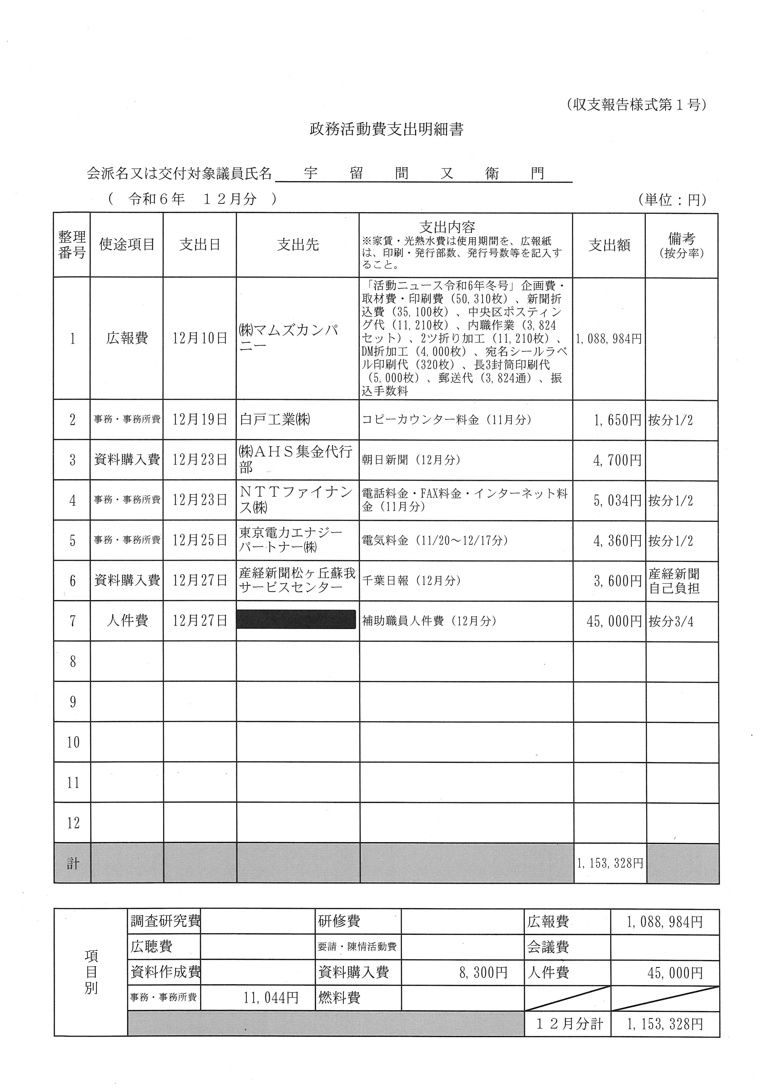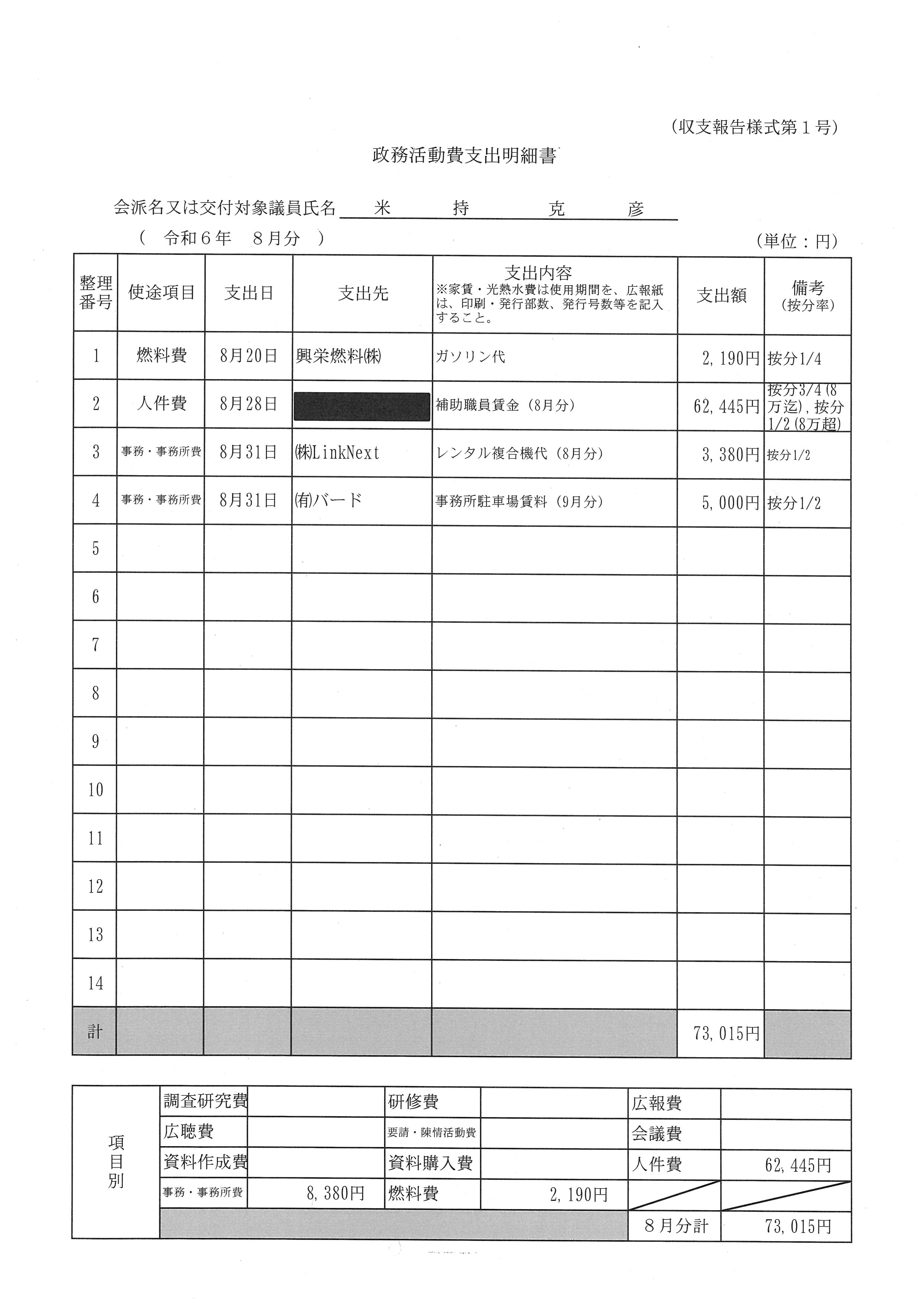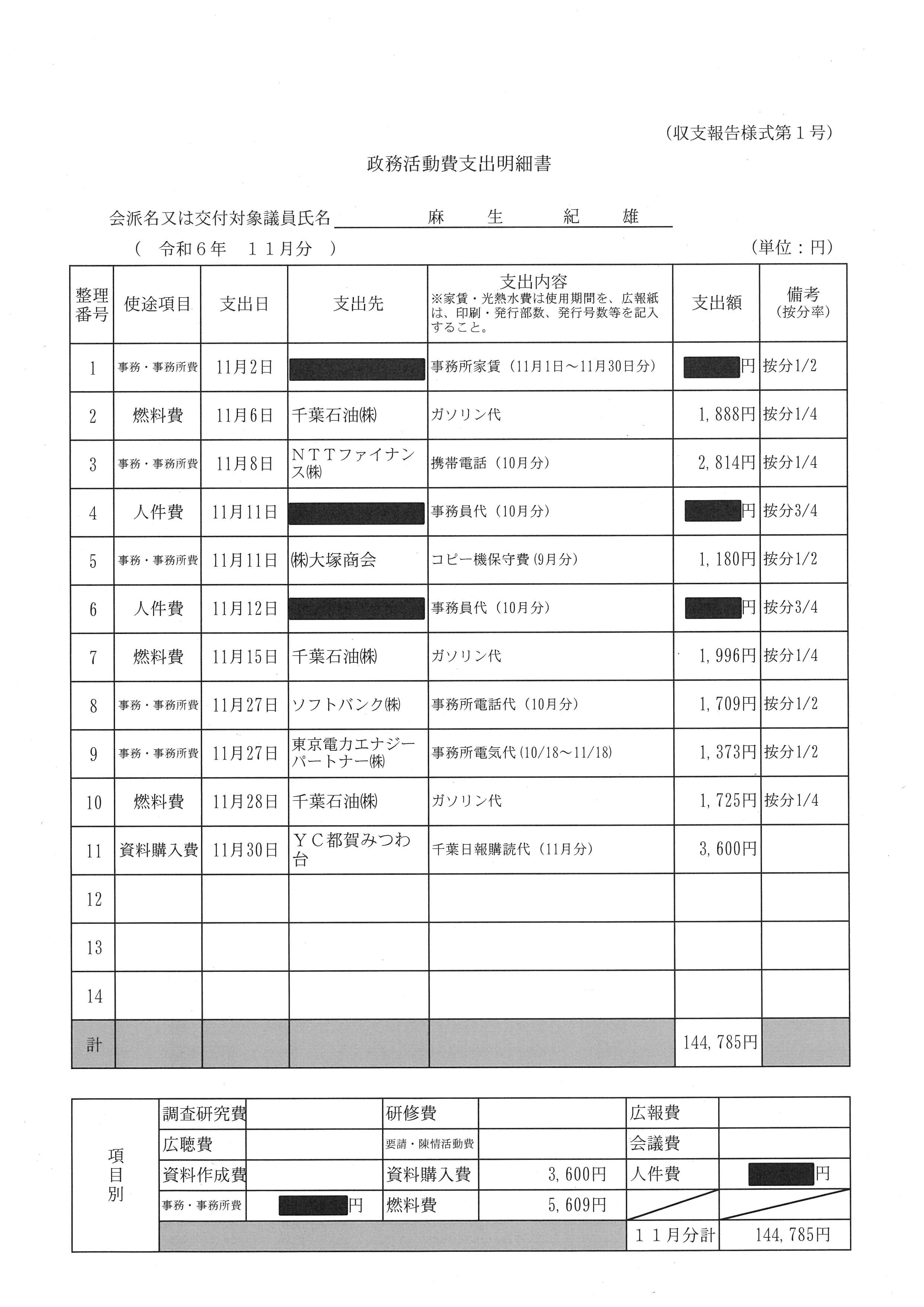 千葉市議会トップページ > 広報・情報公開 > 政務活動費 > 令和6年度交付分(政務活動費収支報告書)