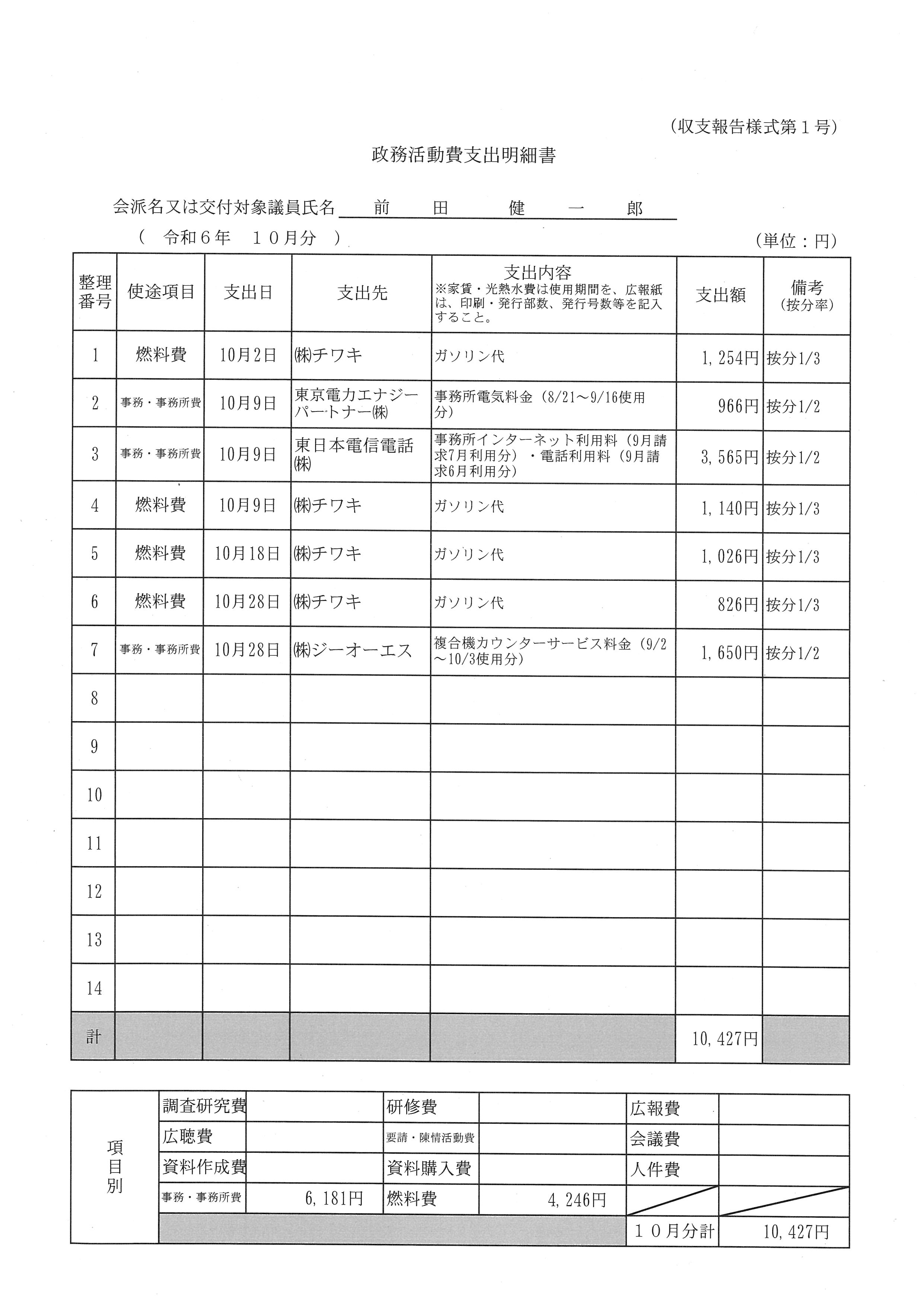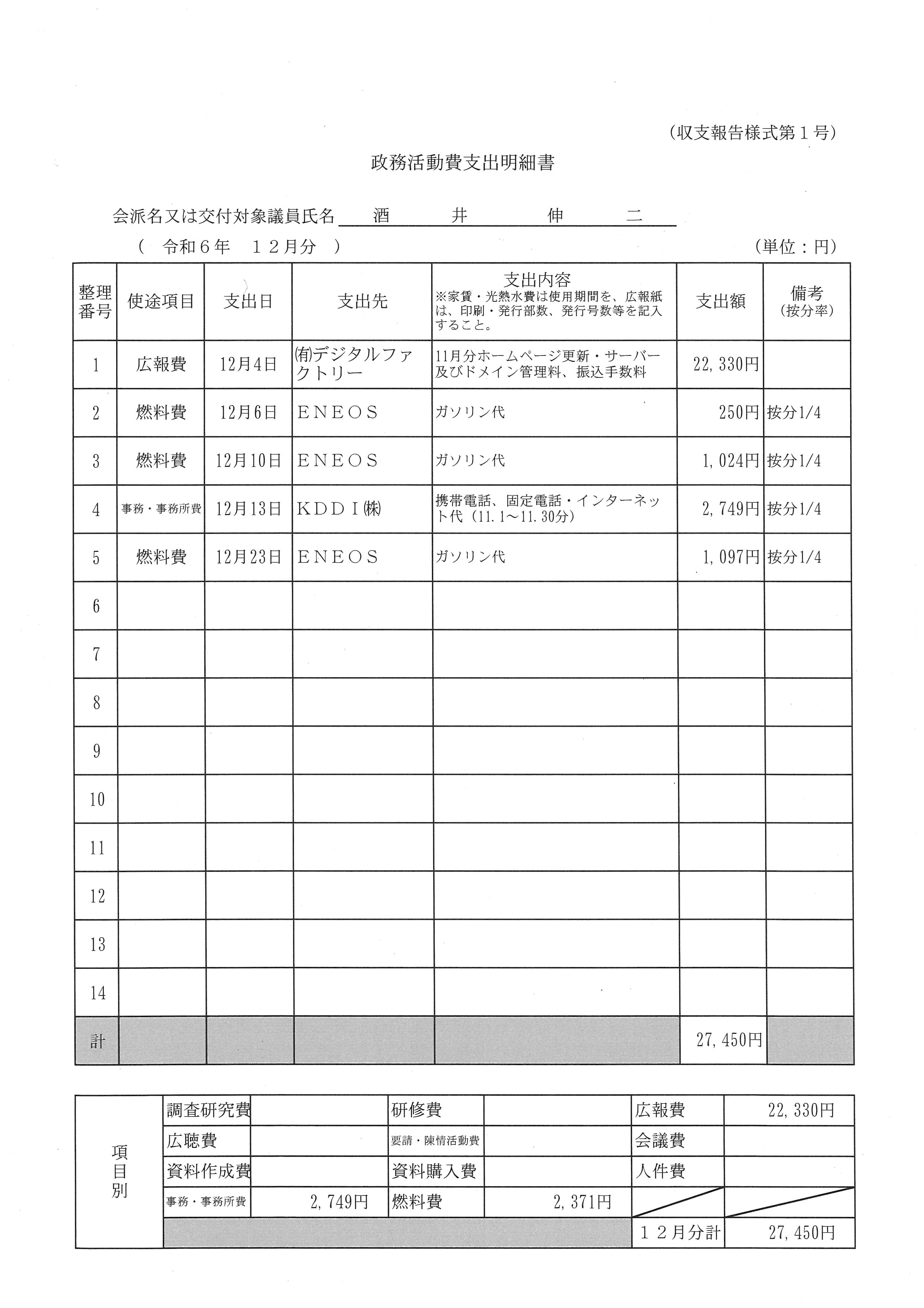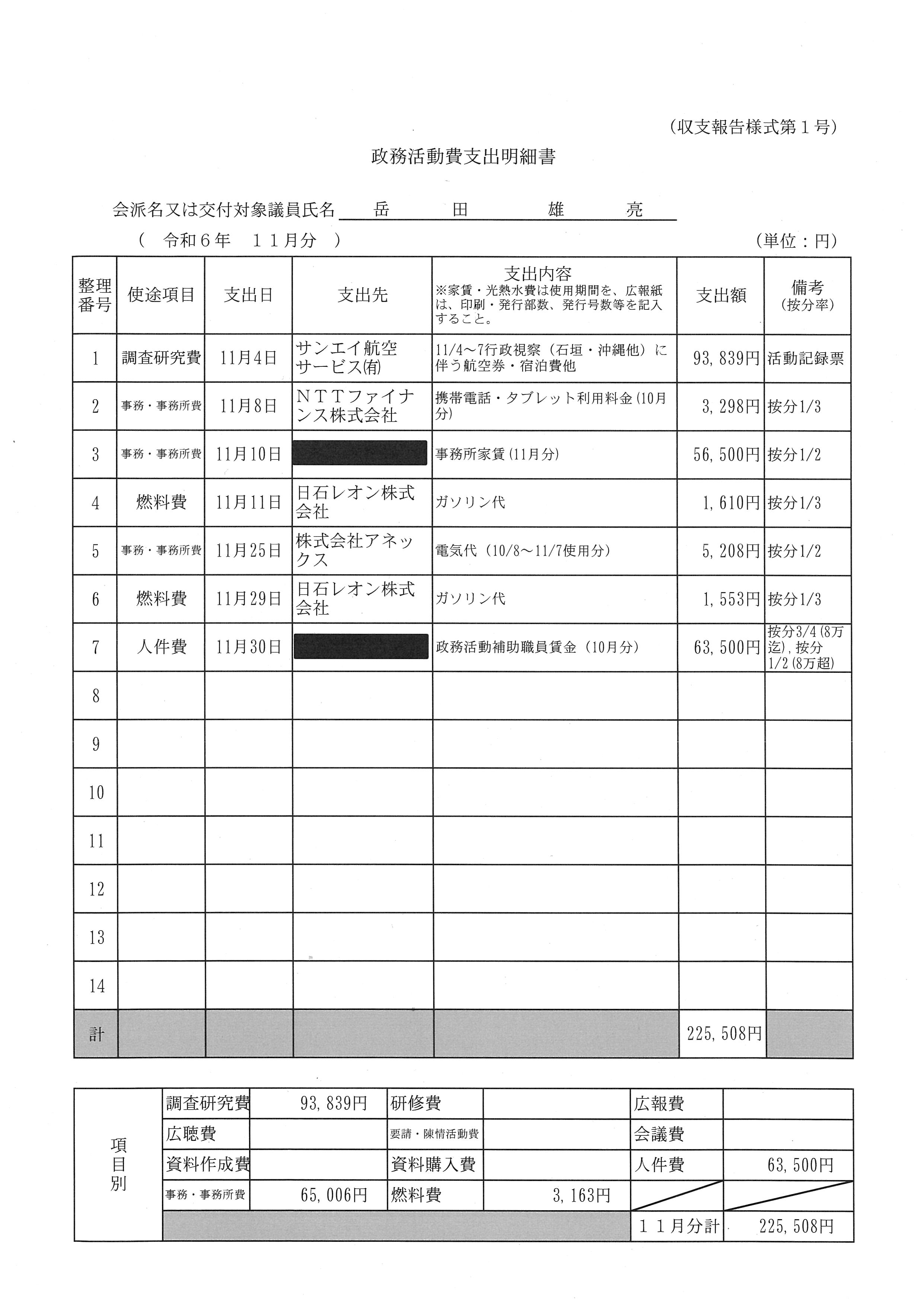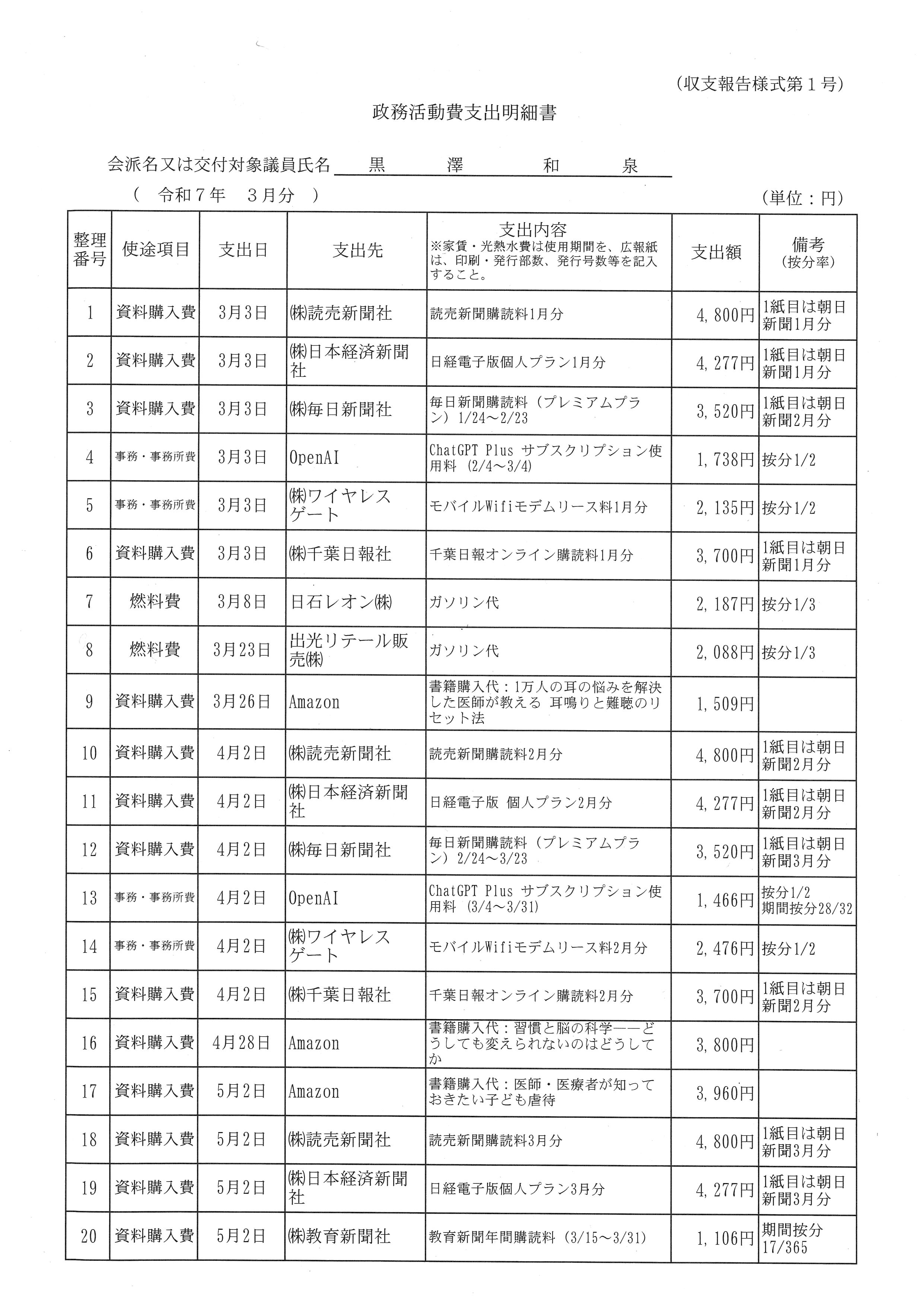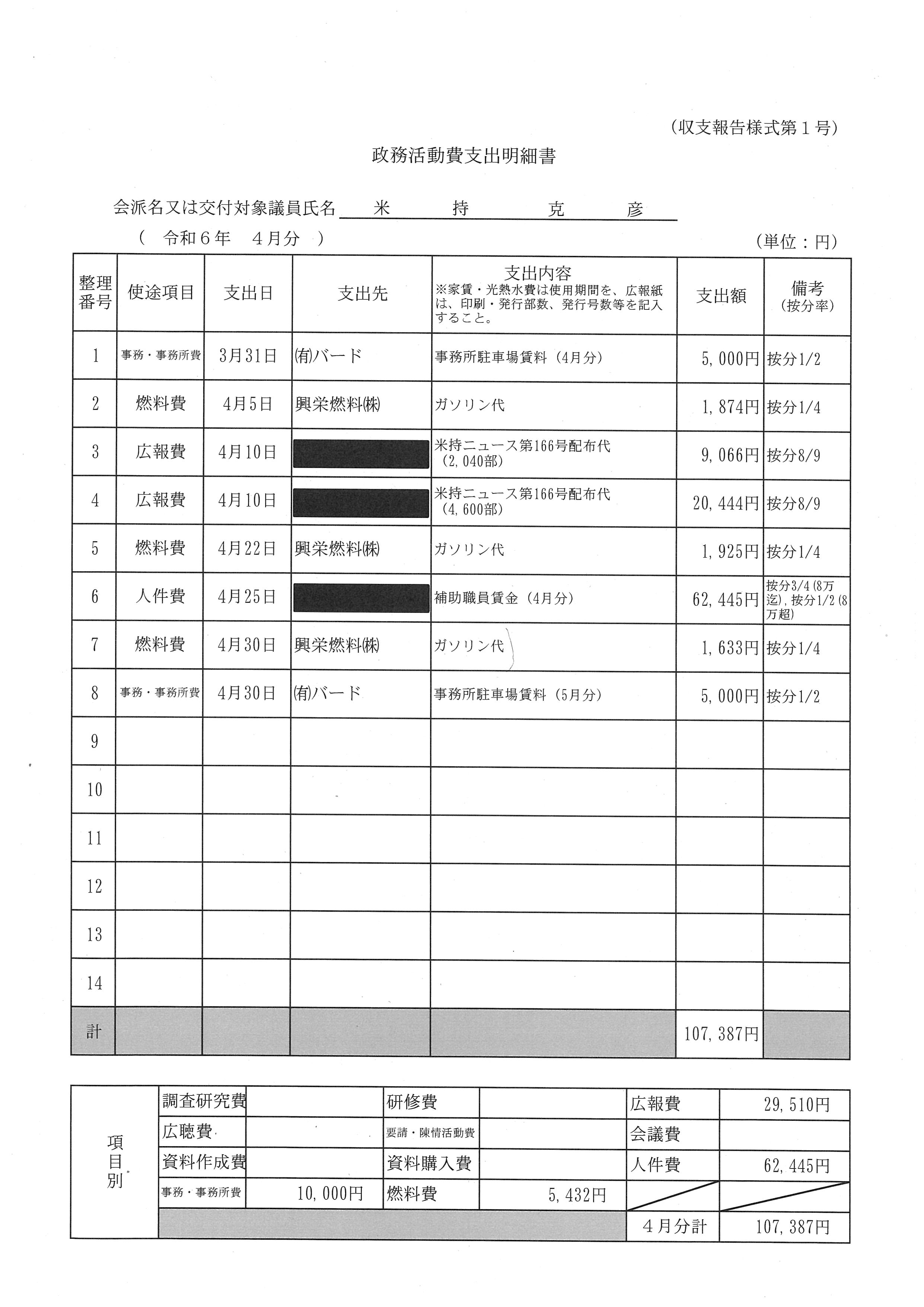 千葉市議会トップページ > 広報・情報公開 > 政務活動費 > 令和6年度交付分(政務活動費収支報告書)