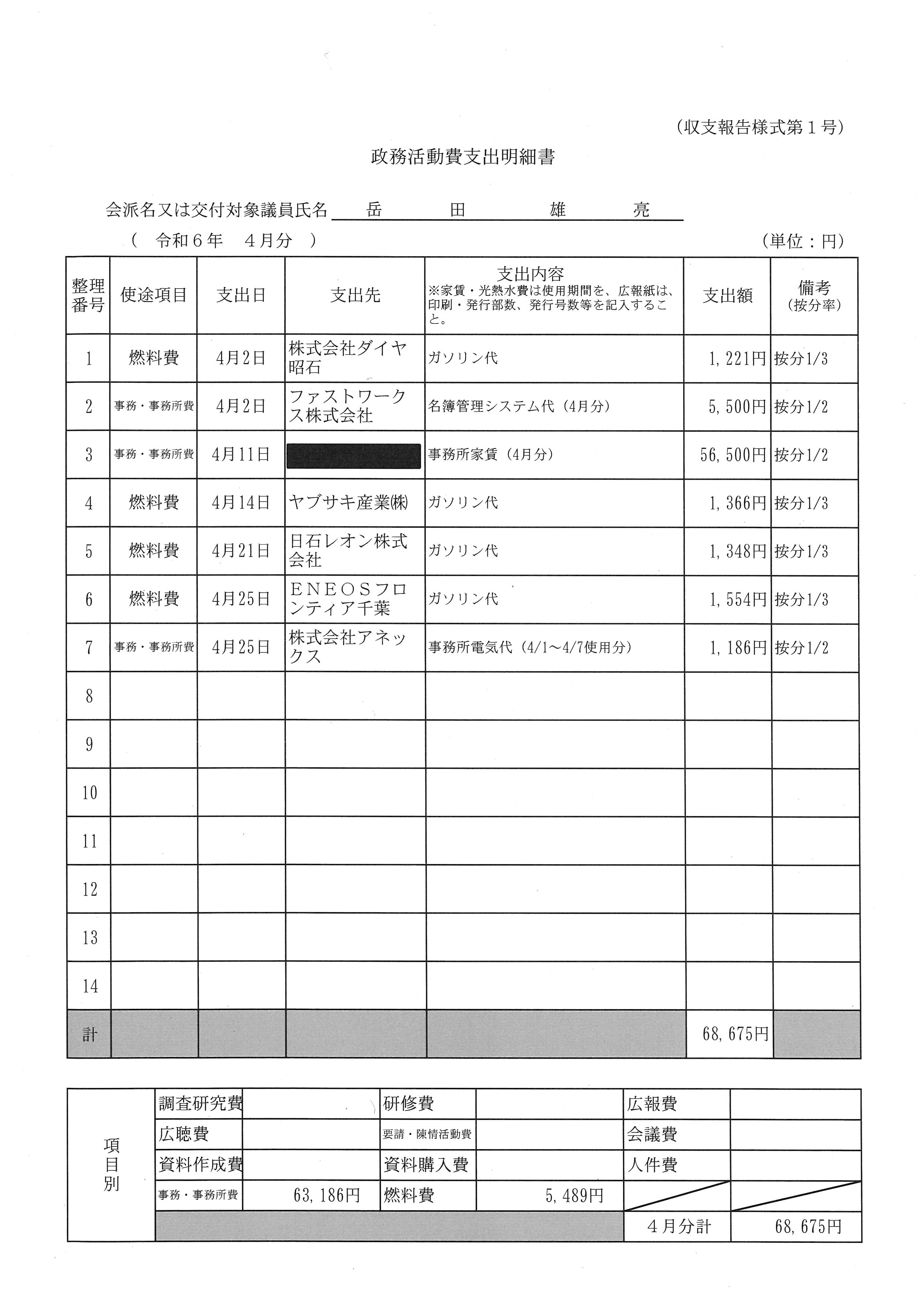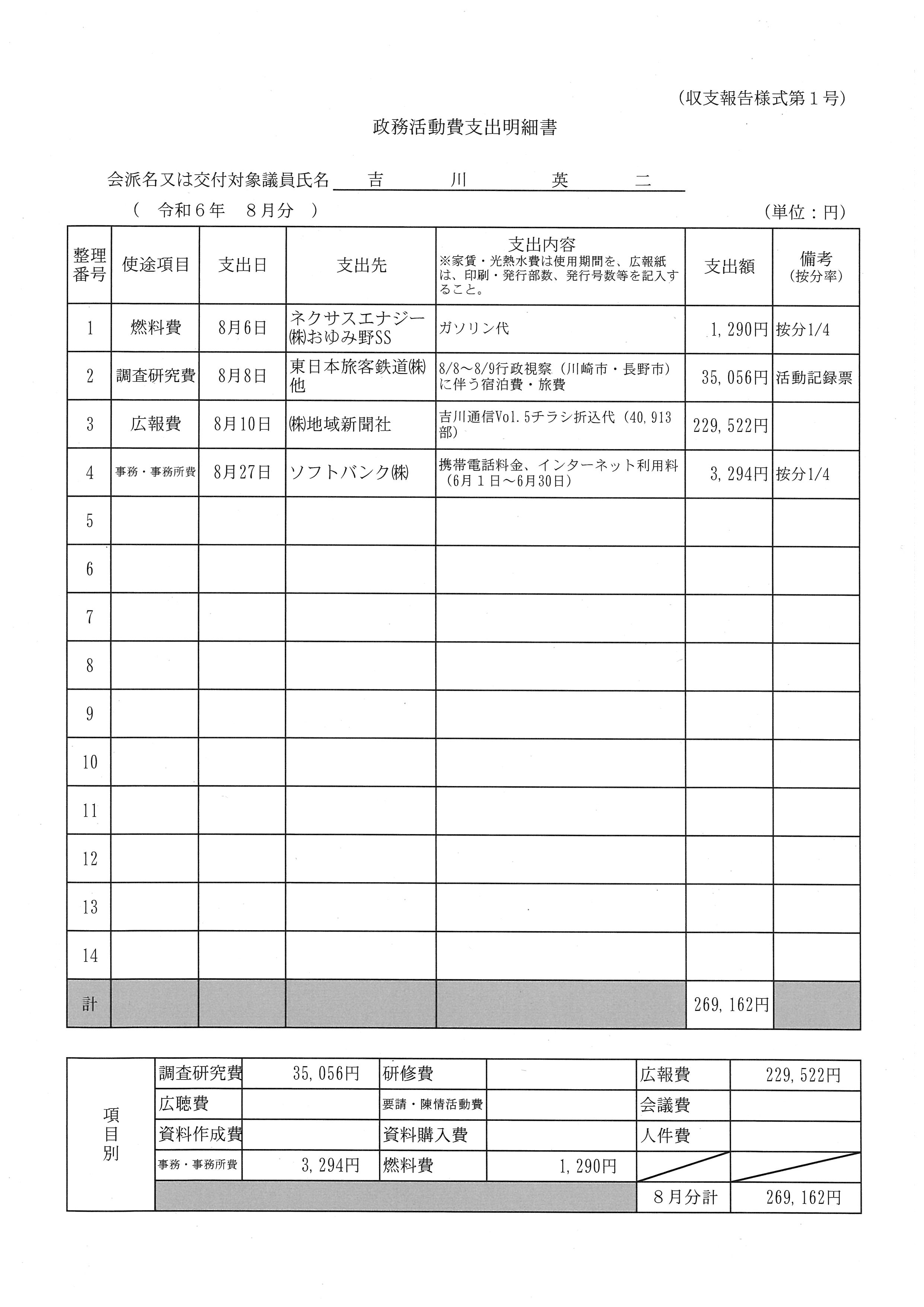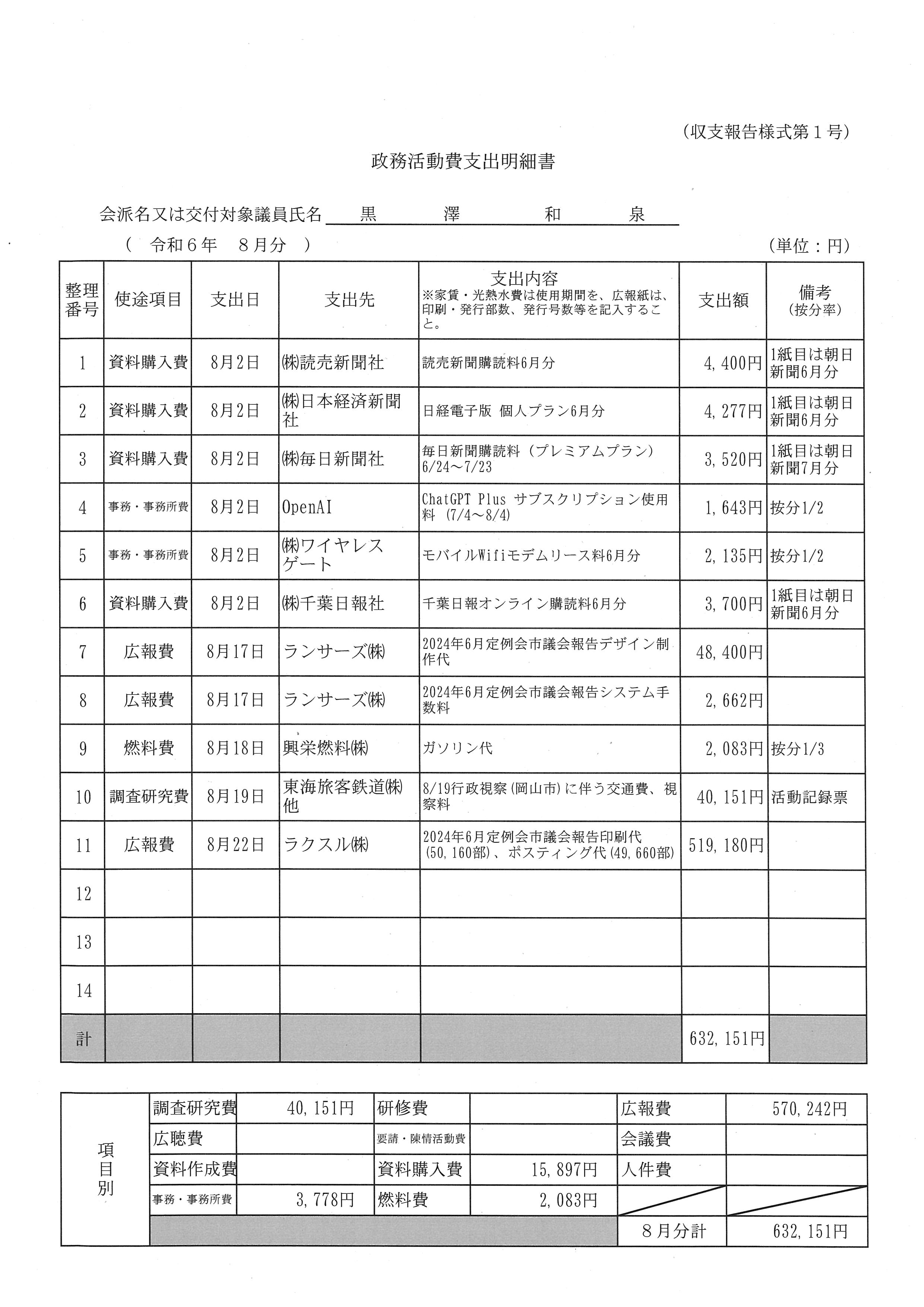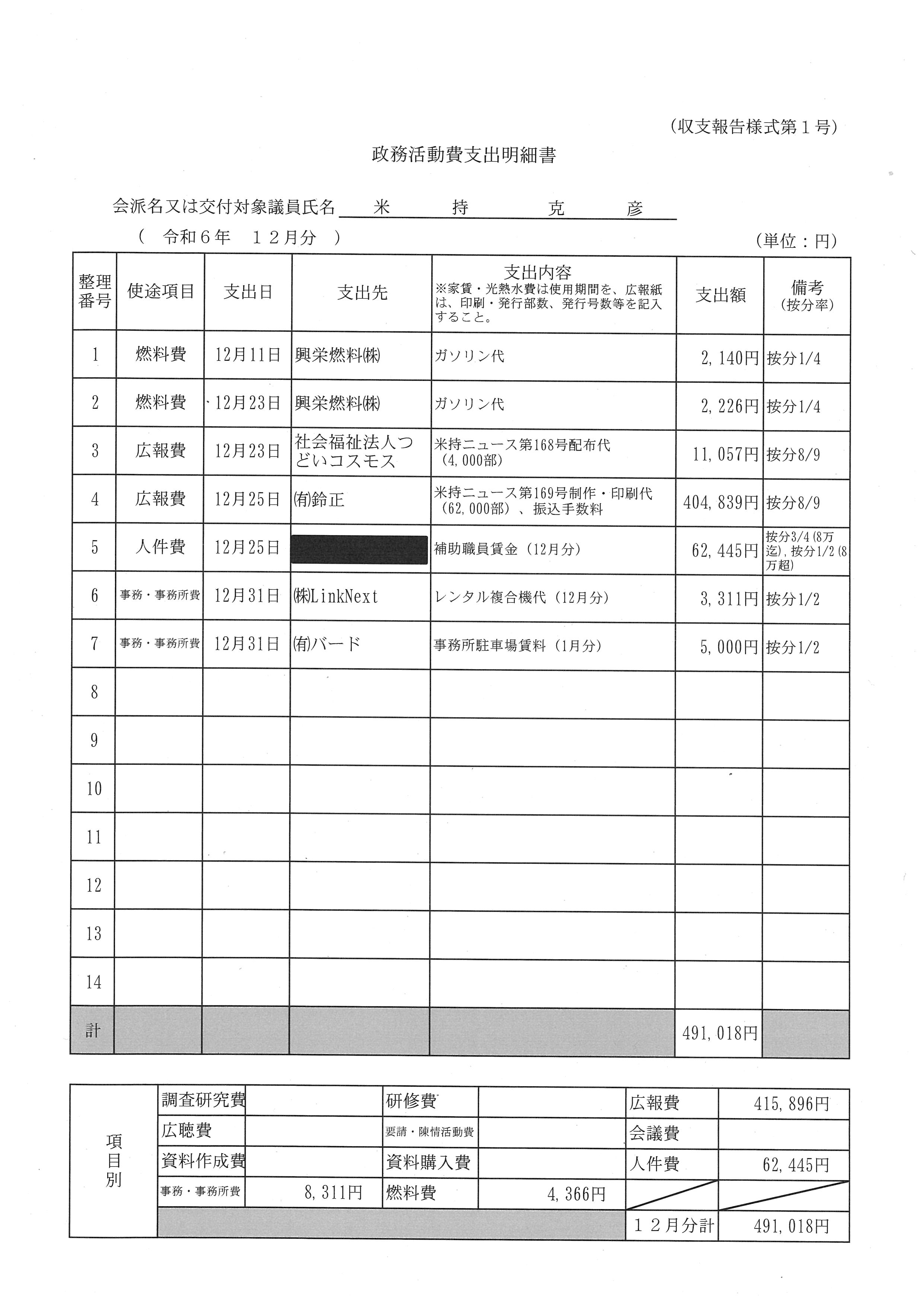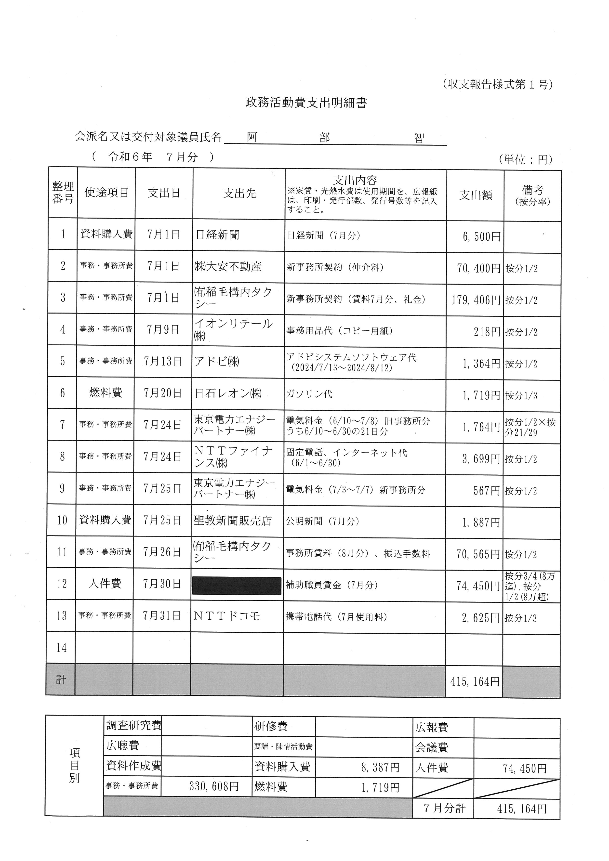 千葉市議会トップページ > 広報・情報公開 > 政務活動費 > 令和6年度交付分(政務活動費収支報告書)