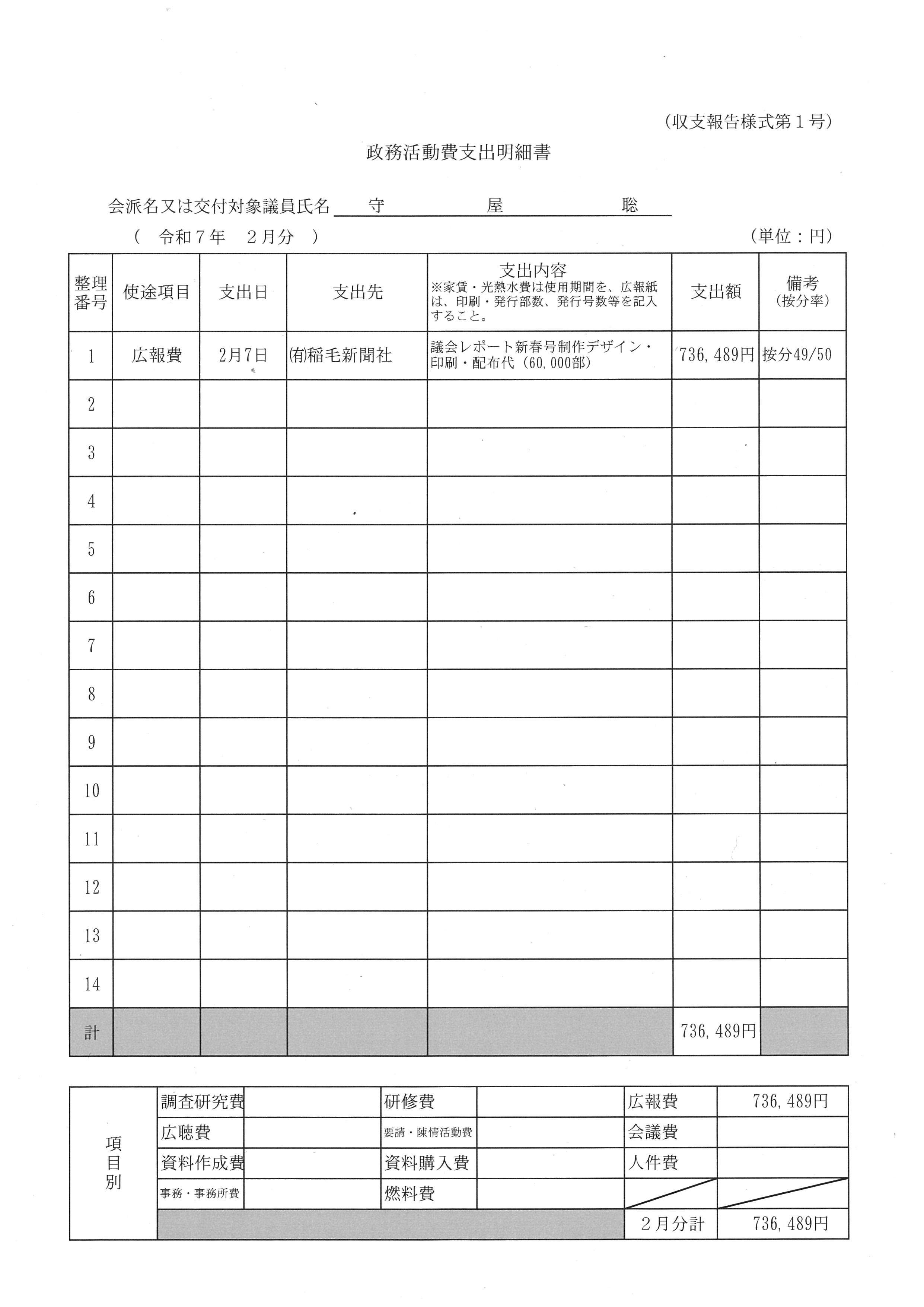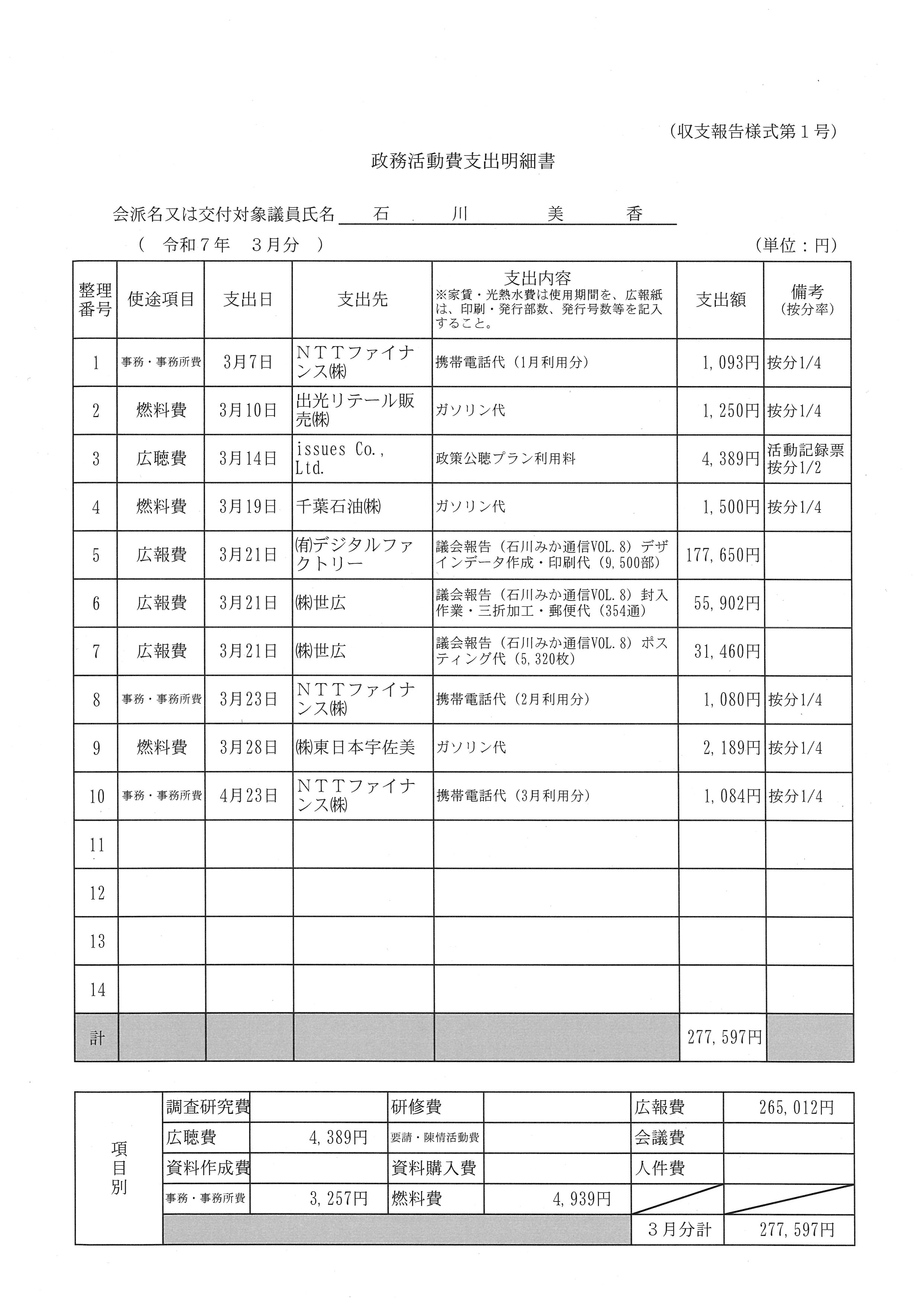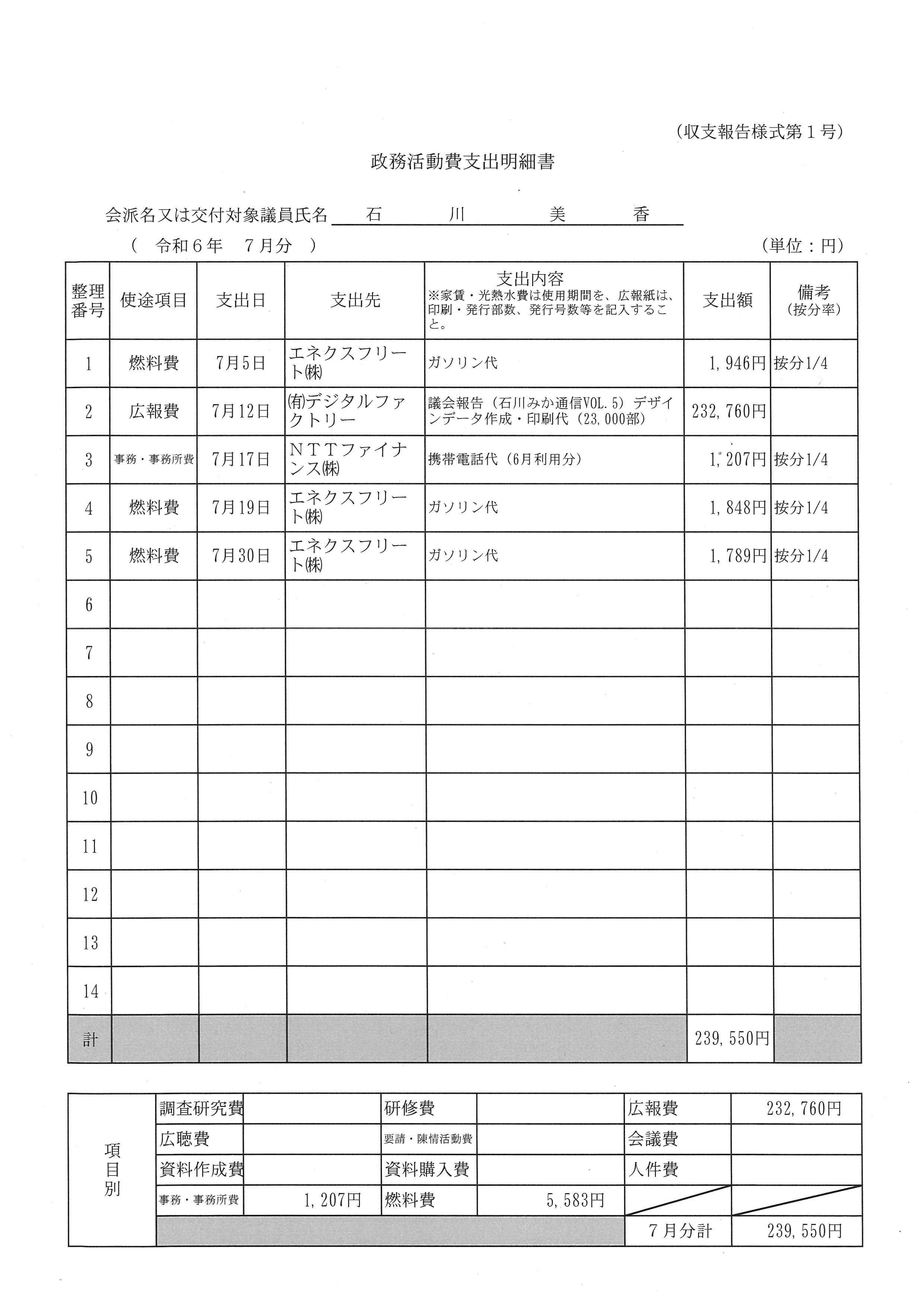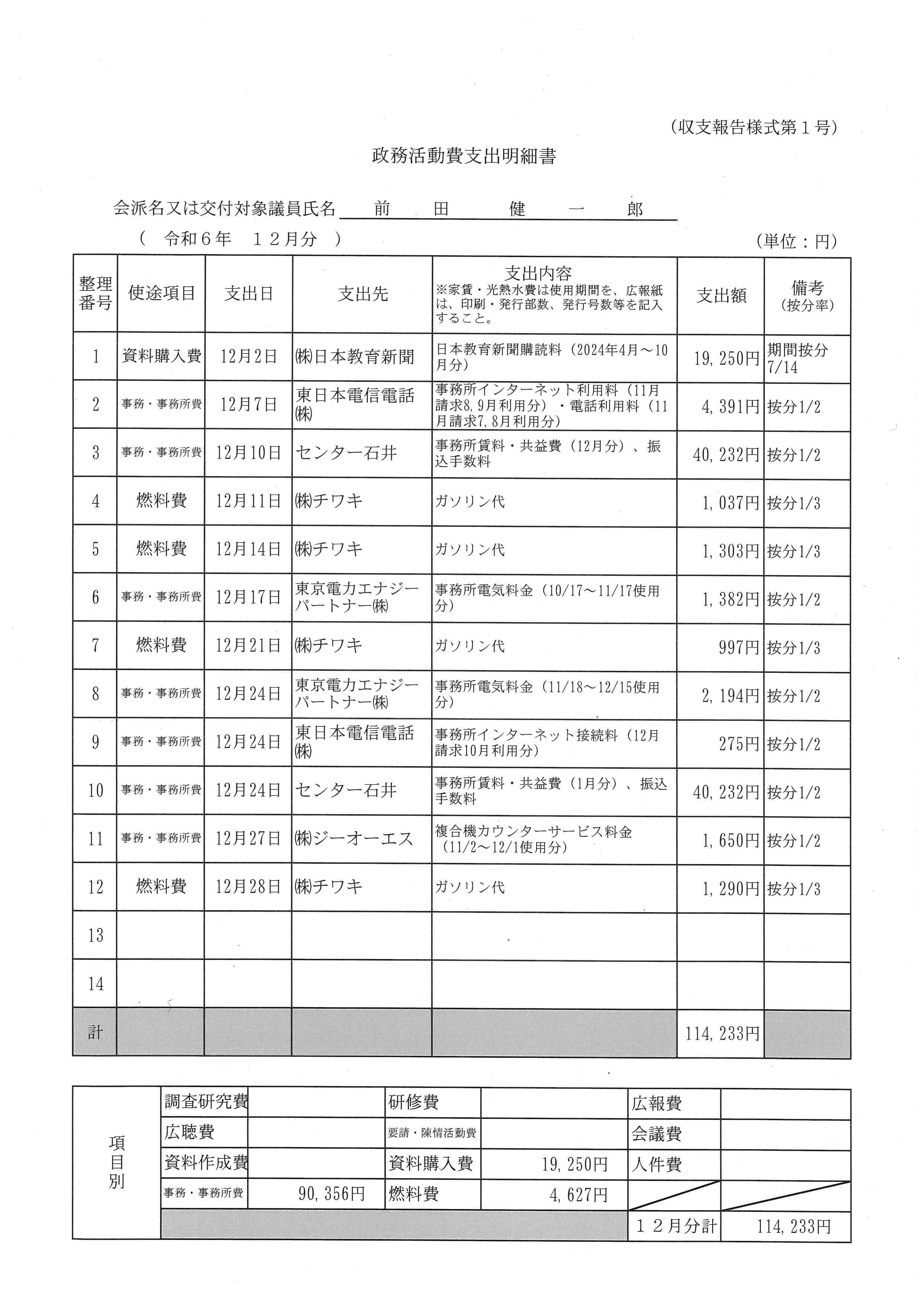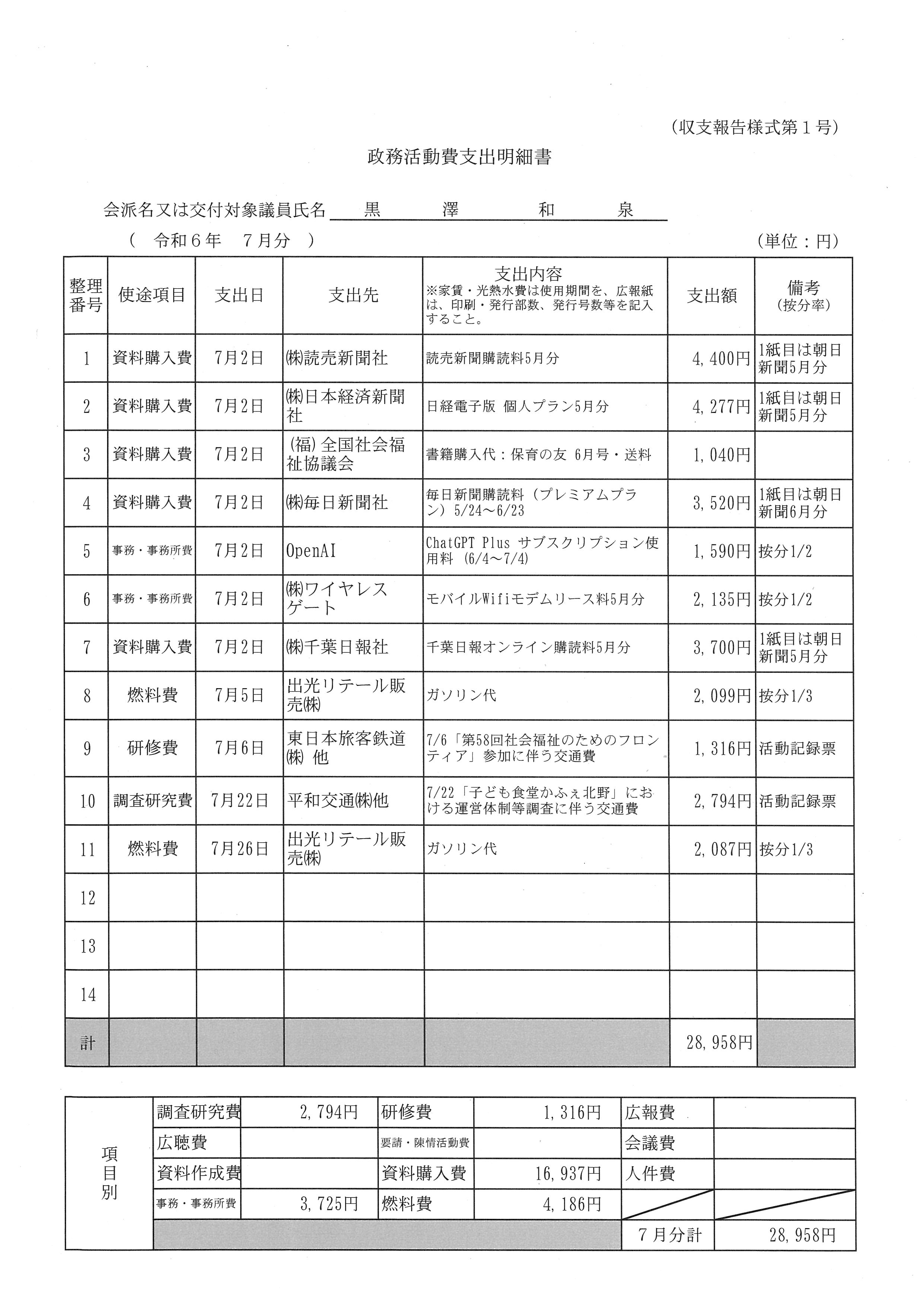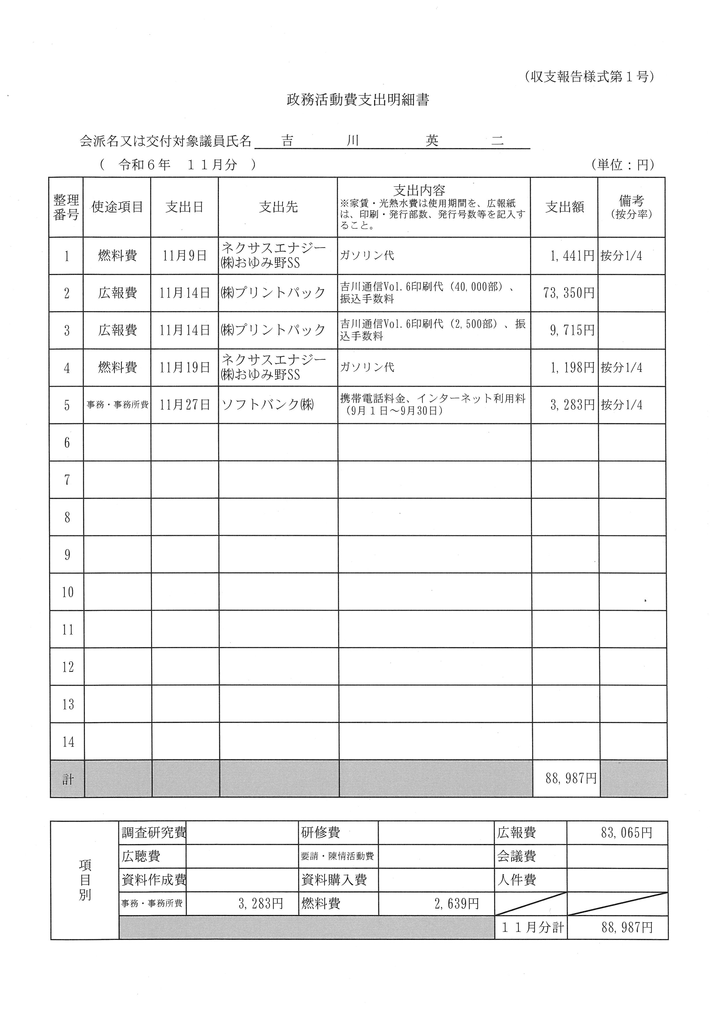 千葉市議会トップページ > 広報・情報公開 > 政務活動費 > 令和6年度交付分(政務活動費収支報告書)