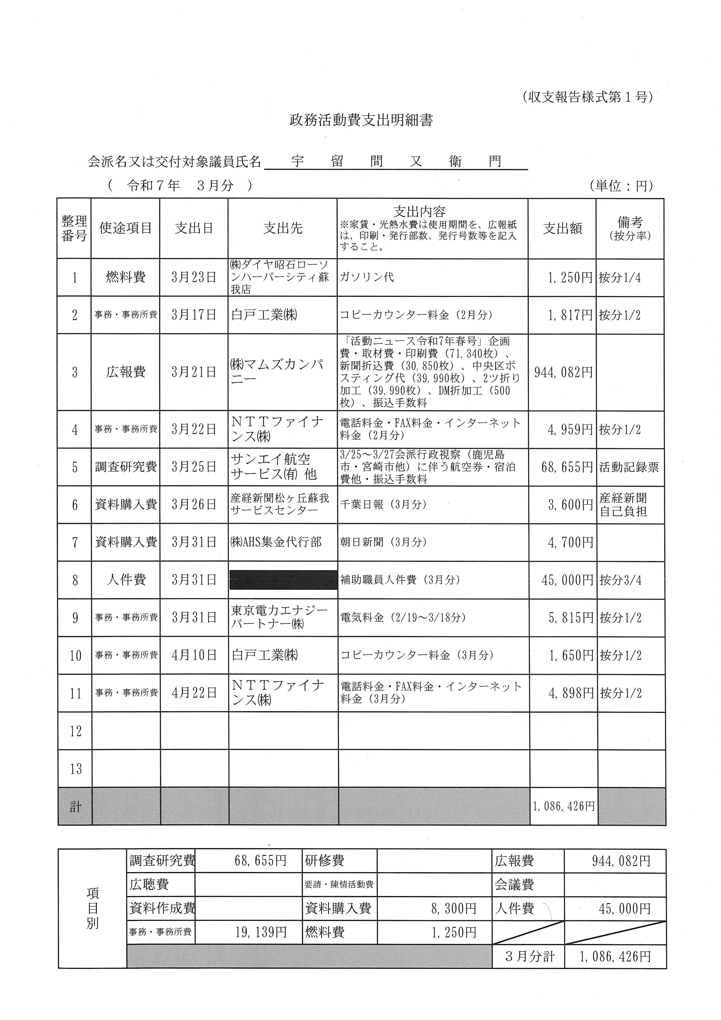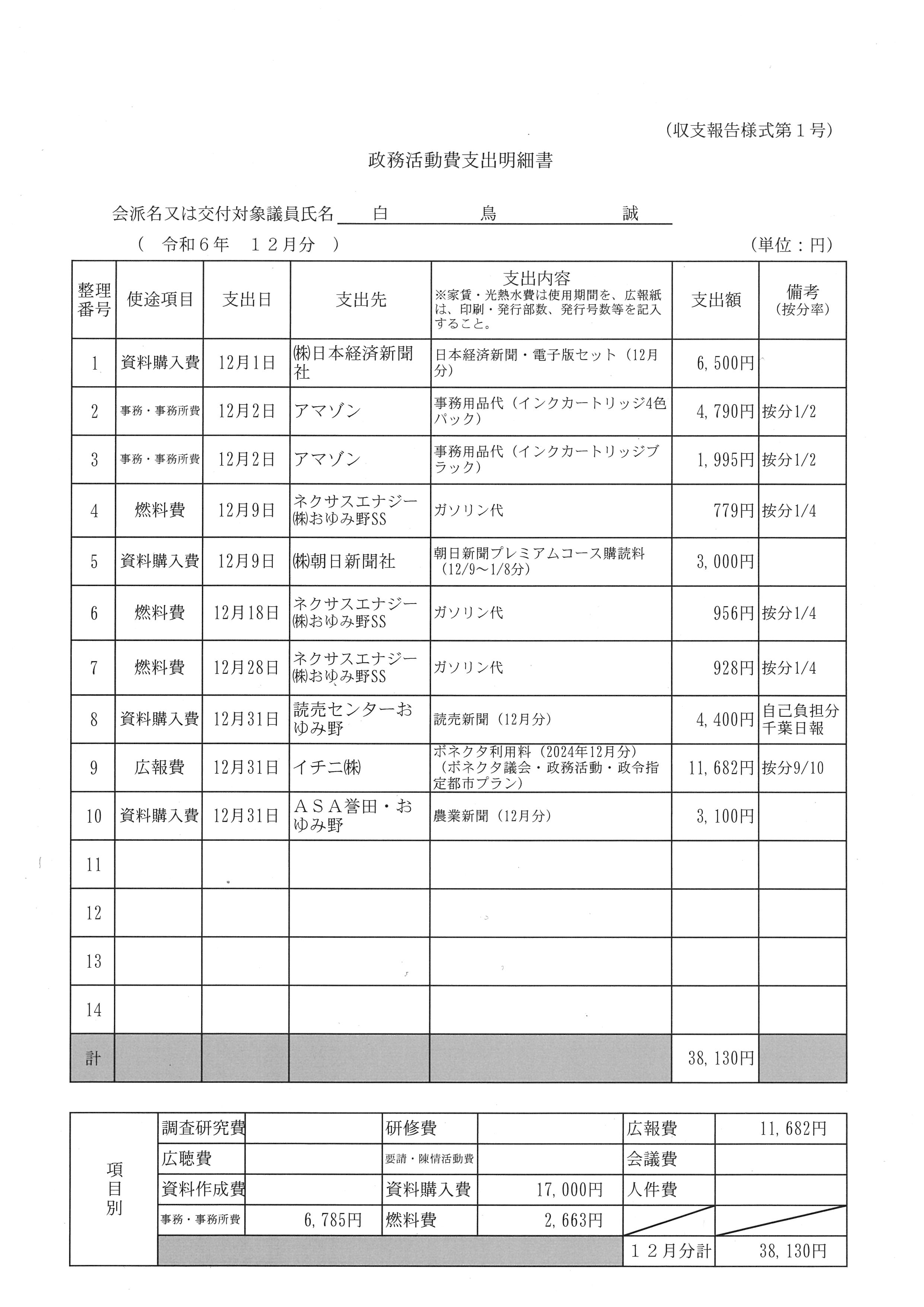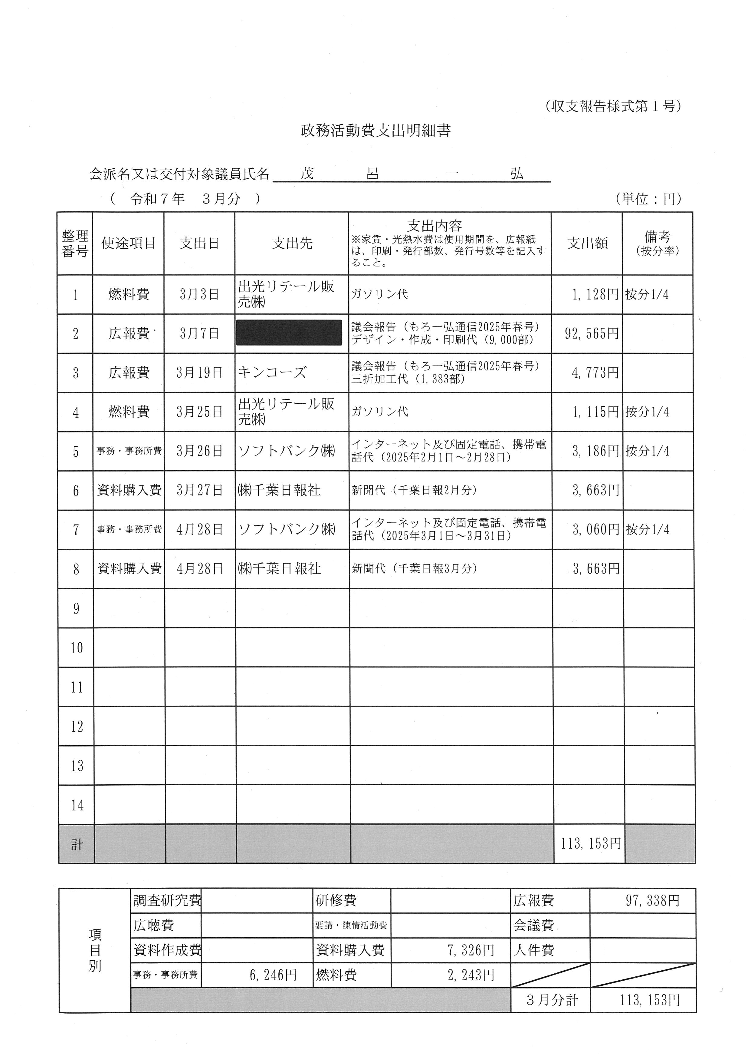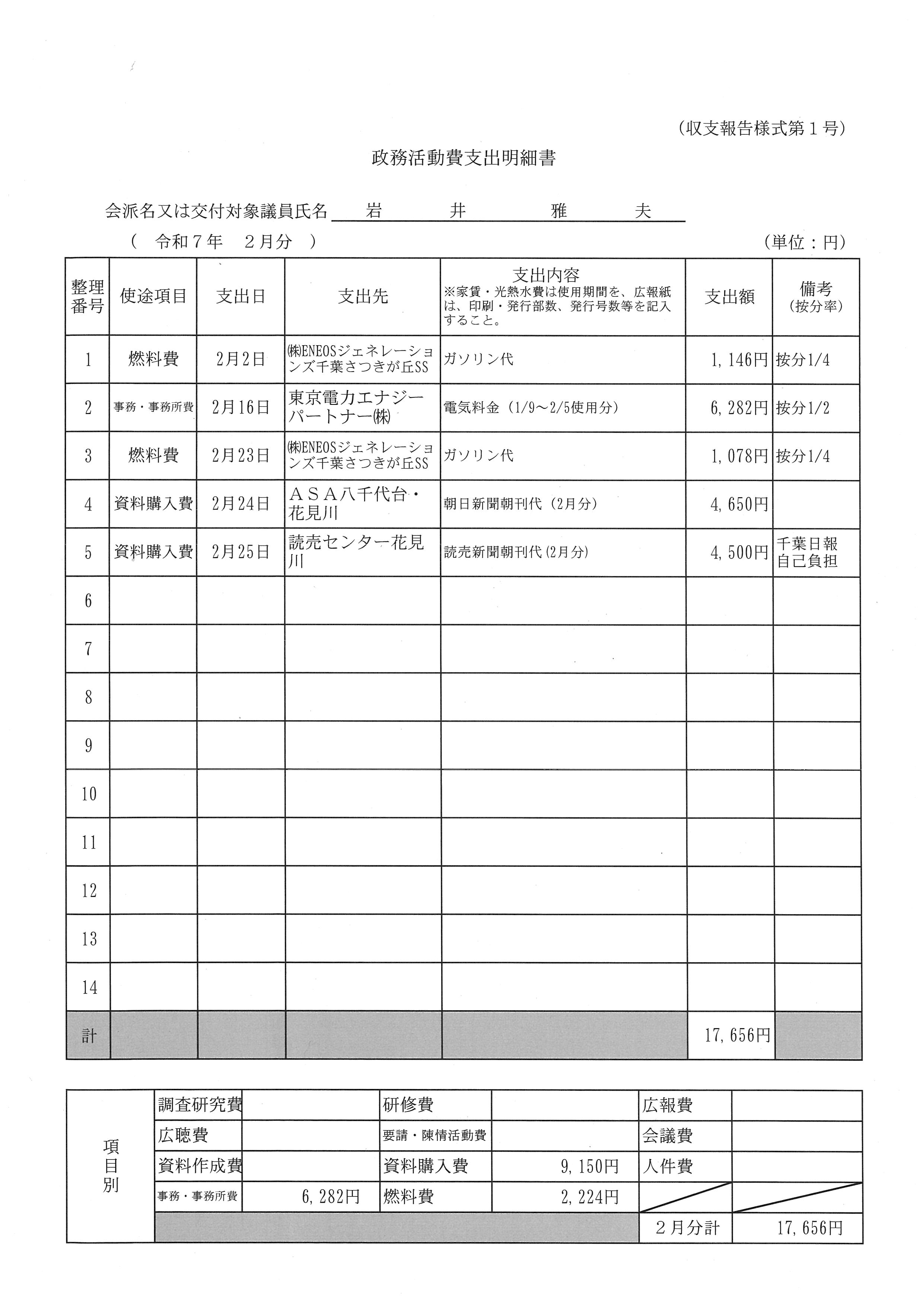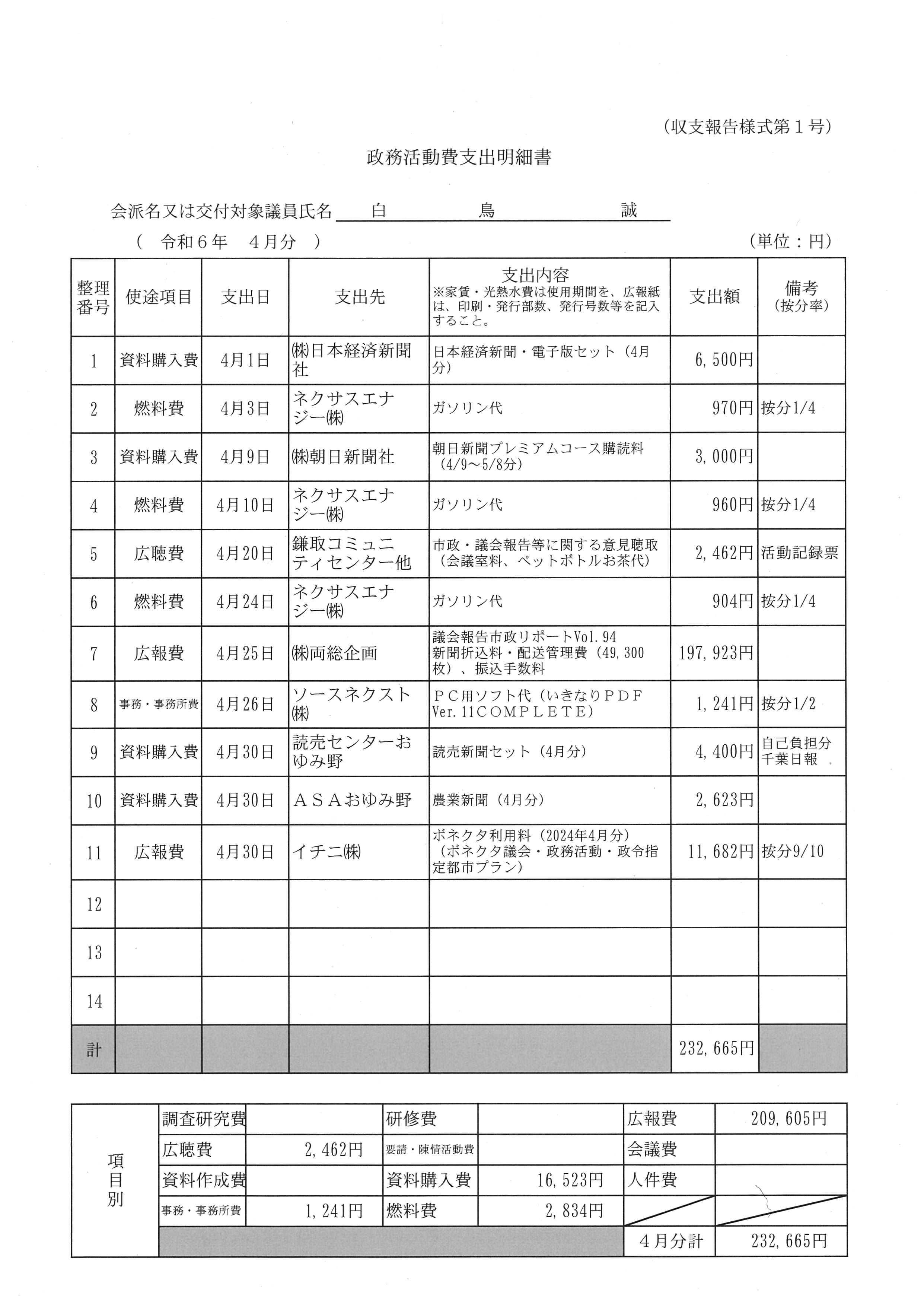 千葉市議会トップページ > 広報・情報公開 > 政務活動費 > 令和6年度交付分(政務活動費収支報告書)