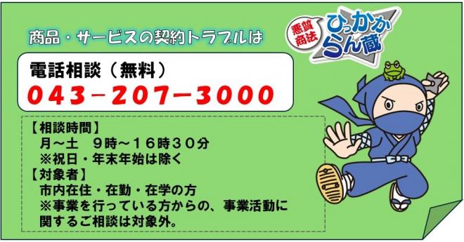 ※事務室の電話番号となります。相談をご希望の方は、消費生活相談専用電話「043-207-3000」におかけください。 FAX:043-207-3111 |