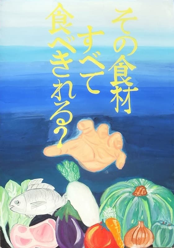 | 【審査員コメント】 グラデーションを用いた背景から伸びてくる片手で、食品ロスへの危機感を強く訴えかけてくる作品です。 アクリル絵の具を使用した大胆な色使いが効果的です。野菜や魚などの食材もわかりやすく表現されています。 |