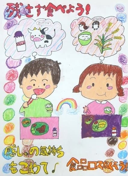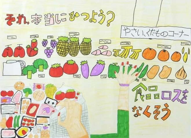 | 【審査員コメント】 野菜や食材に対しての愛情を感じる、温かい作品です。シカのキャラクターが買い物をしている様子で、難しいテーマを優しく訴えかけています。 |