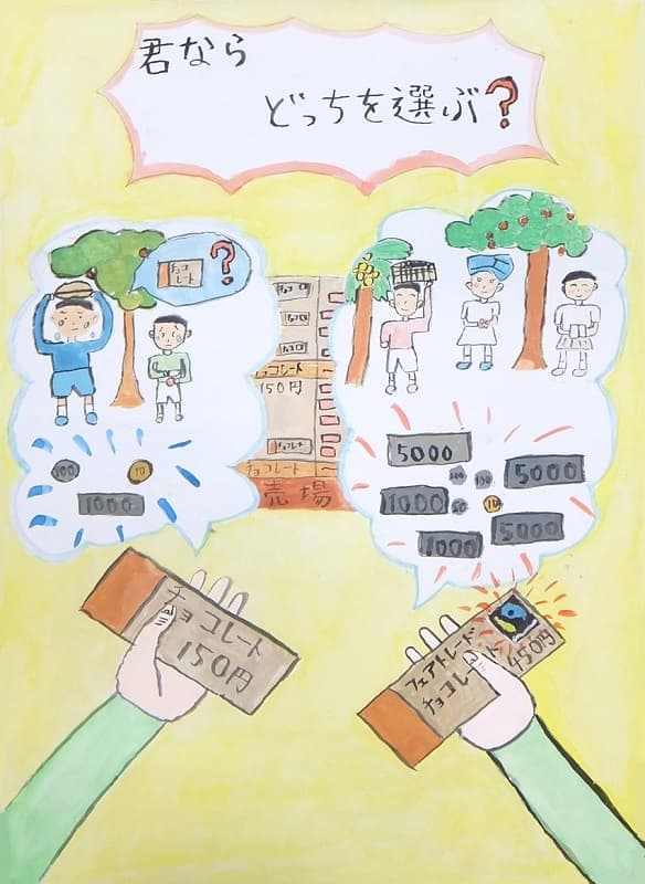 | 【審査員コメント】 フェアトレードの意義と問題点をよく理解した上で、見る人にテーマの大切さをどう伝えるか、よく考えられている作品です。値段が少し高くても、払ったお金が有効に使われていることがわかりやすく伝わります。 |