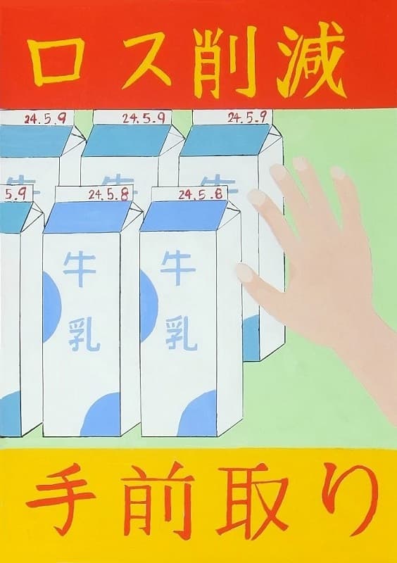 | 【審査員コメント】 標語部分の色使いが、見る人に伝わりやすく効果的です。牛乳パックの立体的な描き方や、賞味期限の日付など、きちんとした配慮も伝わってきます。 |