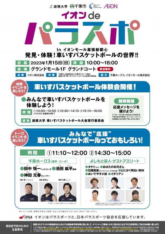 車いすバスケットボールの体験会や、千葉市を拠点に活動する車いすバスケットボールのチーム「千葉ホークス」の選手によるデモンストレーション等を行います。お笑い芸人も出演予定です。