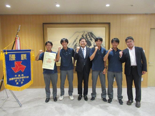 渋谷教育学園幕張高等学校の男子テニス部が令和6年度千葉県高等学校総合体育大会(男子団体)で優勝を果たし、「令和6年度全国高等学校総合体育大会」に、千葉県代表として出場することが決定しました。その報告に市長を表敬訪問しました。